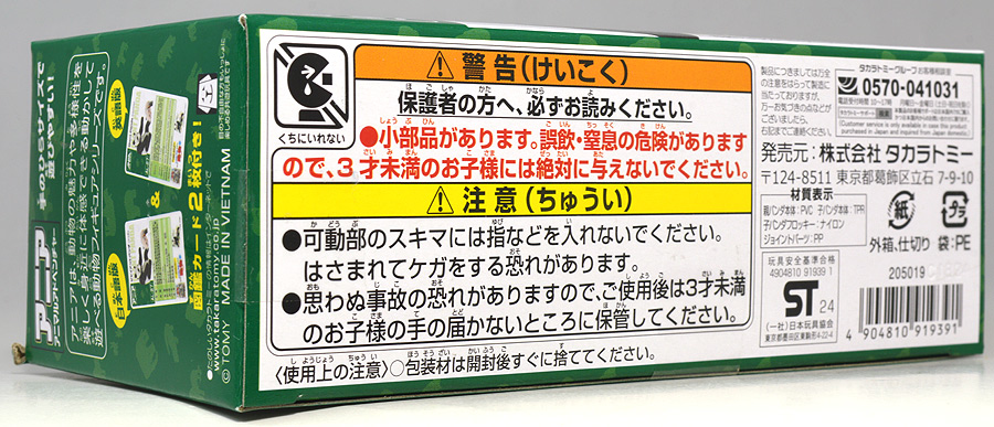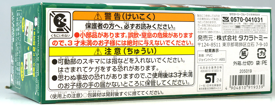 ■アニア AL-05 ジンベエザメ(水に浮くVer.) ![]() 2020年2月20日発売 / 1045円(税込) 古生物が注目されがちなALシリーズですが、現生の巨大生物もラインナップされている・・・ 今回はそのうちのジンベエザメを紹介するぞよ!! ![]() パケ裏は「小学館の図鑑NEO」とコラボしており実写で紹介されているぞよ。 ![]() 口が開く! 尾ビレが動く! ![]() くちにいれない! ![]() 毎度おなじみアニア図鑑カード。 日本語と英語二枚付属し、玩具と生き物を通じて言葉も学べる仕様となっている。 ![]() アニアに登場、全長14センチのビッグサイズ・ジンベエザメ! こちらはもともと「AL-05 ジンベエザメ」として2014年8月7日より販売されていましたが、 2020年から「水に浮くver」へとリニューアルされました。 ALサイズとしては初の水に浮くverで、 旧バージョンと比べるとやや小柄になっている。 ![]() 体長は5〜10メートル、最大では12メートル以上・・・一説によれば18メートルにも達すると言われるジンベエザメ! 現生では最大級の魚類ぞよね!! こんなに大きくてはさぞ狂暴なのではないかと思われるだろうが、ジンベエザメはプランクトンの類が大好物。 大きな口を開けて小魚もプランクトンもまとめて吸い込んでしまうぞよ! なんでもかんでも吸い込んで、口を閉じた後はエラから海水を吐き出し、 口内で濾過したもの全部を丸のみしてしまうのだ!! その為歯は殆ど退化しており、ごく小さな歯が上下合わせて約8000本並んでいるが、殆ど使っていないみたいぞよ。 という事でとっても穏やかなサメさんなのです。 ![]() 世界中の温帯から熱帯の沿岸および外洋に生息し、この日本近海には初夏から秋にかけて回遊すると言う。 背中側には白い斑点があり、これが陣兵衛羽織に似ている事からこの名がついたのだ。 こんなに巨大なのに大人しくて優しい心の持ち主とはなかなか見所のあるやつぞ。 ダイビングなどで出会っても、恐れる事はない。 接近してじっくり観察できるほどだ。 ![]() こちらのアニアではジンベエザメの特徴である斑点模様もしっかり再現されている。 水に浮くアニアはSBSと言う材質で出来ていて、なんだかしっとりした不思議な手触りなのです。 ![]() 尻尾には三日月形の尾ビレを備える。 後期白亜紀に生息したモササウルスもこのような三日月形の尾を備えていた。 クジラやモササウルス、サメってどこか似通った姿をしているぞよね? 環境によって生物がそっくりな姿に進化する事を収斂進化と呼び、自然の不思議の一つなのだ。 ![]() トップ。 全長14cmの大きめアニア。 ALシリーズの中でもボリュームがあります。 ![]() サメは交尾をする魚なので、オスの腹びれにはクラスパーと呼ばれる交接器が備わっているぞよ。 交接器のあるものがオス、無いものがメスと言う訳ぞよね。 このアニアには交接器の形が見られないので、恐らくメスのジンベエザメだろう! ジンベエザメはお腹の中で卵を孵してから出産する卵胎生の魚類で、 交尾・出産は数年に一回の頻度とも言われ繁殖力の低い動物だ。 しかし、過去にはジンベエザメのお腹から300尾以上の稚魚が見つかった事もあり、 これらは約60cmサイズの稚魚であったと言う・・・! このくらい大きければ外敵に食べられる心配も低くなりそうぞよね。 一方、おろかなにんげんどもの漁などに巻き込まれたり、船のスクリューで怪我をするジンベエザメも多く、 現在では数を減らしていると言うから人間と言うのは罪深い生き物ぞよよよよ・・・。 ![]() アニアはワンアクション付きの動物フィギュア! ジンベエザメは口が開閉する他、尾が二か所でスイングし、表情を付ける事が可能だ! ![]() こんなに巨大なジンベエザメですが、なんと水族館で飼育されているものもある! 現在は沖縄の美ら海水族館でジンタと名付けられた全長8メートルほどの個体が1995年より長期飼育されており、 これは今年2023年で28年目の世界最長飼育記録と言うから立派なことぞよ! その巨体を飼育するには様々な苦労がありそうだが、遊泳速度は時速4キロ程と然程早くないのに加え、 食べ物もオキアミや小エビなどで足りるので入手が容易なのも長期飼育の結果に繋がっていそうぞよね。 ジンベエザメは他にも海遊館をはじめ、様々な水族館で見物する事が出来、人々の人気者になっているのだ。 ![]() つぶらなおめめで発見したのは・・・ワカメだ! と言う事でこのパッケージにはワカメが付属します。 これも水に浮く素材ぞよーっ!! ![]() プランクトンが大好物のジンベエザメですが、自然界ではエネルギーの大半を植物と藻類から得ている事が判明している! 意図的に食べているのか、餌を吸い込む時に一緒に食べてしまうのか、それはよくわからないが・・・ もしかしたらジンベエザメは雑食の動物なのかもしれないぞよね。 なにせジンベエザメは1日に25メートルプール4杯分の海水を吸い込むというから、 目に付いた手頃な大きさのものはなんでもかんでも口に入れているのかもしれないぞよ。 ![]() アニア
