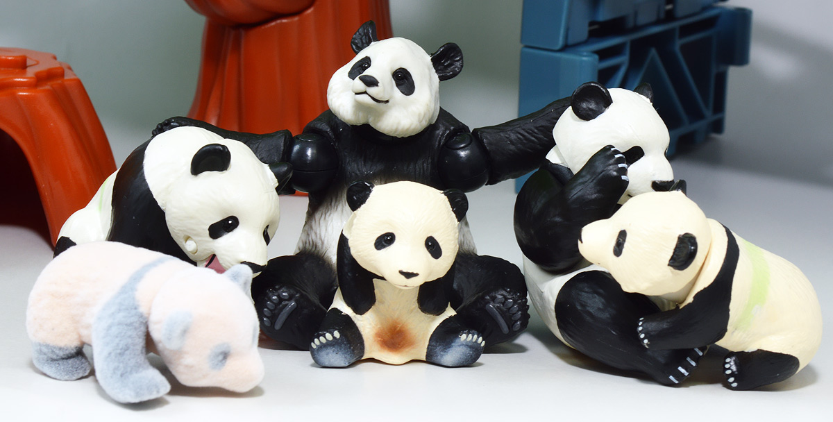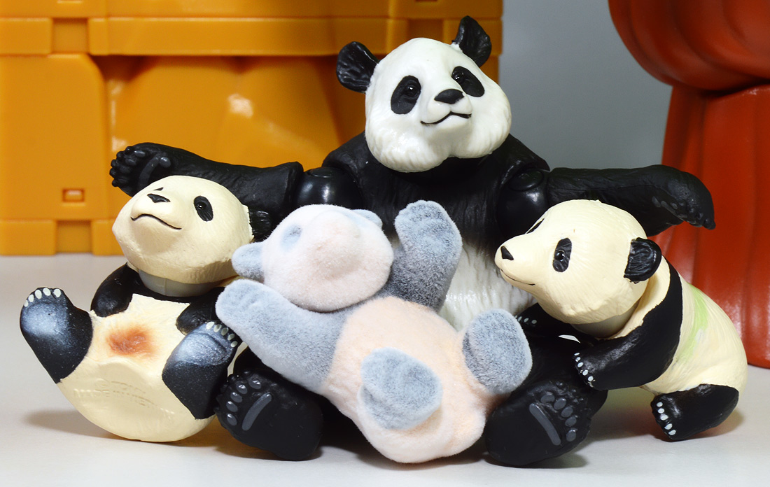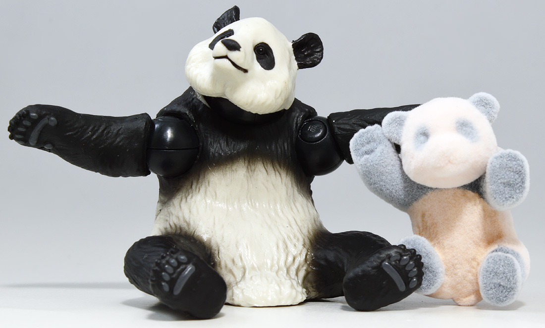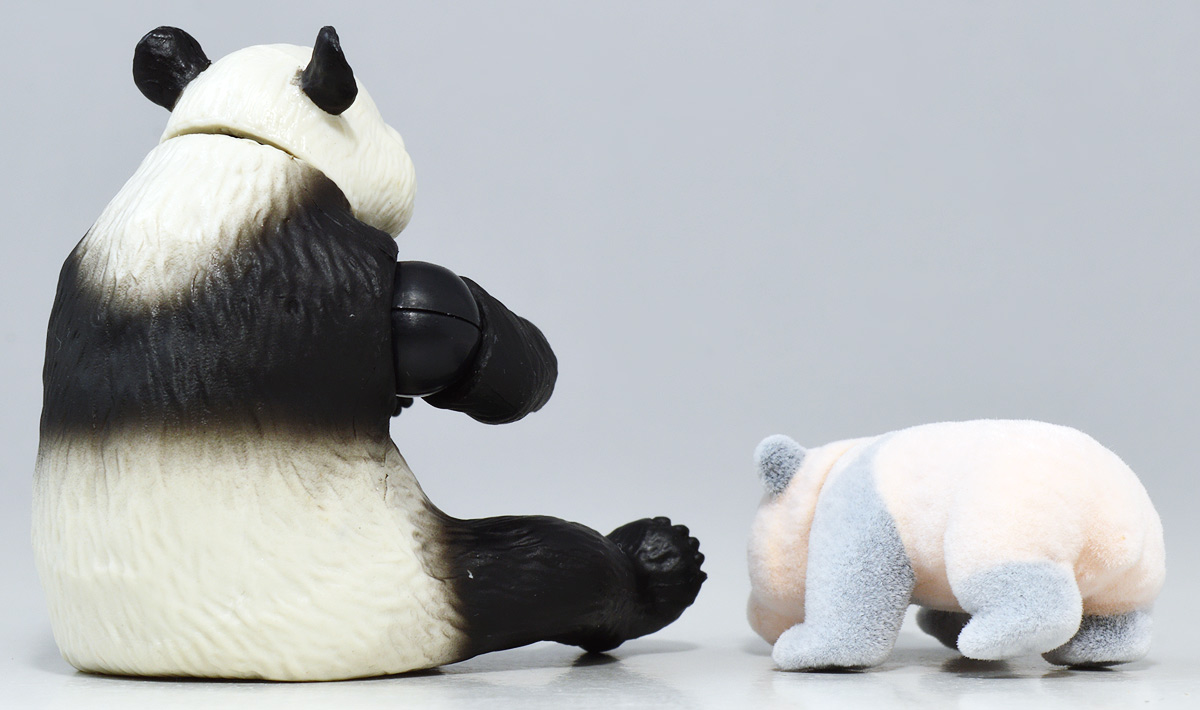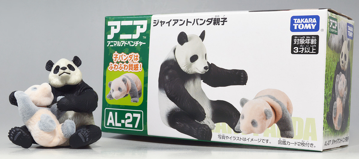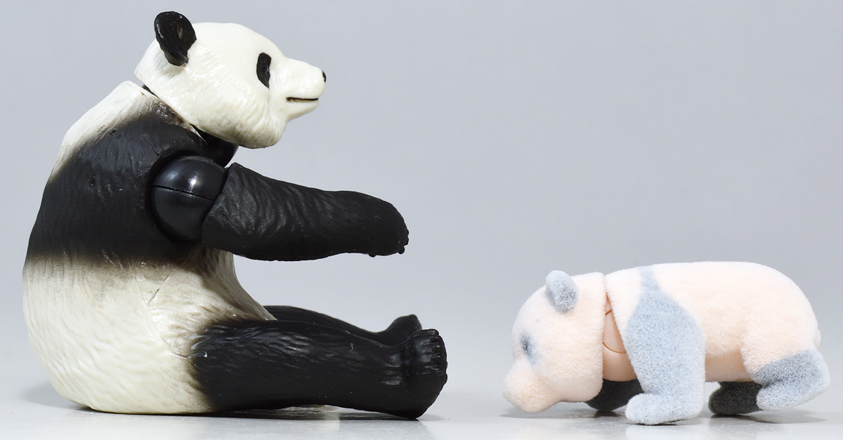 ■アニア AL-27 ジャイアントパンダ親子 ![]() 2024年5月23日発売 / 1045円(税込) こちらも新たな仕様で登場のパンダ親子! ALパケですが中身はAS相当の二個セットとなっている。 ![]() パンダはほんと大人気で、アニアでも数多くの造形が発売されている。 なかでも本商品はこれまでにない新仕様が見所だ。 ![]() 親パンダの首と手 子パンダの首が動く! 子パンダは ふわふわ質感! ![]() くちにいれない! ![]() 新たなパンダ図鑑カード。 親子絵柄が可愛いぞよ。 ![]() 新登場! 親パンダ / 子パンダ(ピンク) の二体セットだ!! ![]() ジャイアントパンダはローラシアテリアの食肉目クマ科に分類される哺乳類ぞよ! クマと言えばこの日本でも近年人里に出没し人間を食う事で恐れられているが、 実は果実食に偏ったものが多く、パンダなどは特に偏食で、 草食嗜好の上にも殆ど笹しか食わんと言うグルメぞよ! パンダの好物である竹や笹の葉は、まず見ての通り栄養価が少ない。 そのうえパンダの胃や腸はこれらの消化に特化した作りをしていないのは難儀なもんだ! こんなもので逞しい体が維持できる筈もなく、パンダは毎日大量の笹を食わねばならないぞよ。 その消費量は一日に10キロ以上、時には40キロ近く食うとも言われているのは、 なんでそんないらん苦労をしてるぞよ!? って感じだが、竹はその辺にいっぱい生えていて労せず食う事が出来ると言う事だろう。 グルメと言うか、実は味に無頓着なのでは・・・!? と言う気もするぞよ。 ![]() パンダは基本的に一匹で気ままに生活しており仲間に頓着する事がない。 メスは1月下旬〜5月頃になると発情期を迎えるが、受胎可能な期間はほんの数日。 この間にオスと出会わなければならないからパンダの婚活も大変ぞよ! 交尾が成功すると97日〜163日間の妊娠期間を経て通常一頭の子パンダを出産。 飼育下では時に双子パンダを生む事もあると言う。 ![]() こうして誕生した赤ちゃんパンダは僅か90グラム〜130グラムのほんの未熟な状態で生れてくる! 親パンダとのサイズ比は1:900と言う小ささで、 毛の生えていないピンクの新生児はネズミか何かのようだ! クマ科の赤ちゃんは基本的に小さく生まれてくるのだが、ジャイアントパンダは特に小さい。 なんでもクマ科赤ちゃんは妊娠満期の骨格が発達した状態で正常に生まれてくるが、 ジャイアントパンダは常に妊娠期間の七割ほどの未熟児として生まれてくると言うのだ。 なぜ未熟児の状態で生むのか・・・その理由は謎に包まれているが・・・ なにか自然の中で有利に働く場面があると言う事なのだろう・・・。 ![]() 今回収録されている子パンダはパッケージにもある通りピンクバージョンとなっている。 未熟児として生まれてくる赤ちゃんパンダは、生後数日で産毛が生え、 一週間もすると白黒の淡い模様が浮かび始めると言う。 この状態ではまだまだお母さんパンダに抱っこして貰わないとあっと言う間に体温を失い死んでしまうが、 それも一か月ほどすれば体毛が生えてもふもふになるのだ。 するとどうした事だ、子パンダの毛はピンク色になっている! これはお母さんパンダが子パンダをなめなめと舐める為に仄かにピンク色がつくものである! なんでも子パンダの体を清潔に保つためであったり、排泄を促す為の行動と言われているぞよ。 本商品の子パンダが仄かにピンクなのは、お母さんパンダに愛情を注がれた証である! 従って、同梱の親パンダはお母さんパンダと言う事になるだろう!! ![]() そして本商品の子パンダはアニアでは初の仕様として、フロッキー加工が施されたもふもふ仕様! これはフィギュア本体に接着剤を散布した後、静電気を帯電させる事でごく細かい毛を植毛する加工方法で、 静電気により毛が垂直に立つが為にもふもふ状態で接着できると言うものだ。 要するにシルバニアファミリー的なあの感触ぞよ!! 本商品ではフロッキー加工を施す事で、生まれたてのもふもふパンダを再現していると言うワケぞよね! こりゃぁ面白い事を考えるものだ! ![]() パンダは一般販売版、限定版合わせて数多くの造形が発売されているので、 またバリエーションが増えてしまったぞよ! 造形に関しては後述する。 ![]() アニアはワンアクション付きの動物フィギュア! 親パンダは首、腕の付け根が軸入りボールジョイント可動。 子パンダは首が軸入りボールジョイントではっきりと正面を向かせる事が出来る。 ![]() このように組み合わせる事で抱っこパンダポーズに早変わり! 子パンダはハイハイモードも兼ねた造形が楽しい。 ![]() なんとも愛情を感じる抱っこポーズよ・・・! よく見るとおめめがぱっちり大きく、ライティングでハイライトが入るのが可愛いですね。 ![]() 親パンダ並べて〜。 ←から「AS-03 ジャイアントパンダ(写真は上野動物園オリジナルモデル)」、 「アニア ジャイアントパンダ(座りポーズ)(キャンペーン品)」、本商品→となっている。 並べてみると・・・本商品の親パンダ、座りポーズとそっくりぞよね!