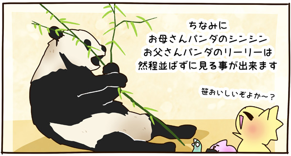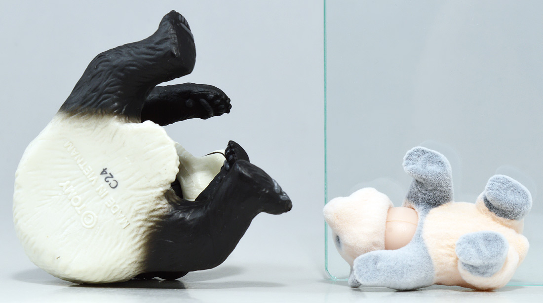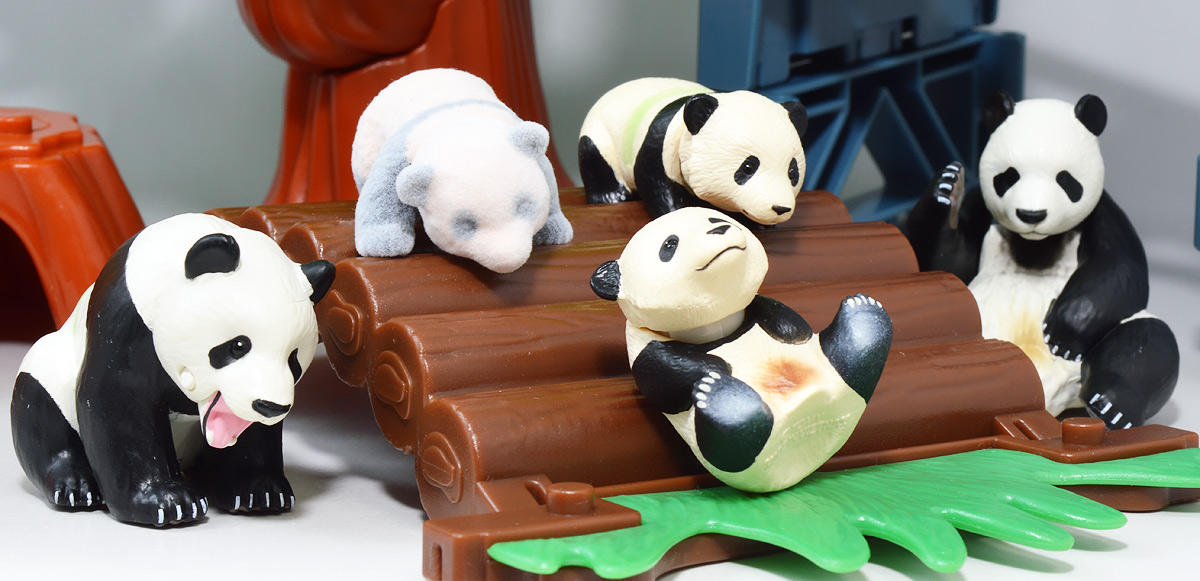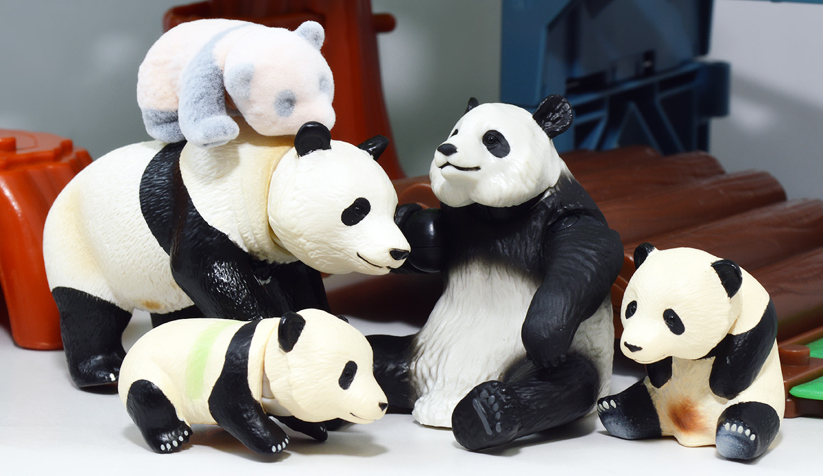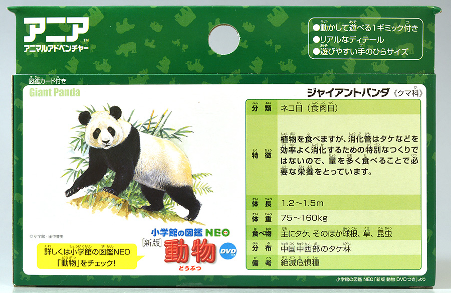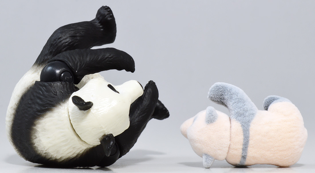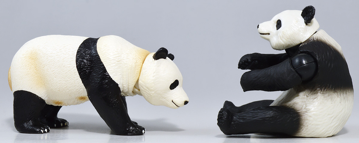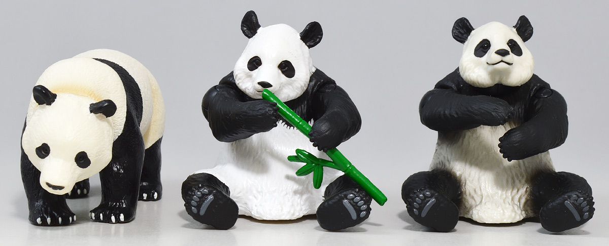 ■アニア AL-27 ジャイアントパンダ親子 ![]() 2024年5月23日発売 / 1045円(税込) こちらも新たな仕様で登場のパンダ親子! ALパケですが中身はAS相当の二個セットとなっている。 ![]() パンダはほんと大人気で、アニアでも数多くの造形が発売されている。 なかでも本商品はこれまでにない新仕様が見所だ。 ![]() 親パンダの首と手 子パンダの首が動く! 子パンダは ふわふわ質感! ![]() くちにいれない! ![]() 新たなパンダ図鑑カード。 親子絵柄が可愛いぞよ。 ![]() 新登場! 親パンダ / 子パンダ(ピンク) の二体セットだ!! ![]() ジャイアントパンダはローラシアテリアの食肉目クマ科に分類される哺乳類ぞよ! クマと言えばこの日本でも近年人里に出没し人間を食う事で恐れられているが、 実は果実食に偏ったものが多く、パンダなどは特に偏食で、 草食嗜好の上にも殆ど笹しか食わんと言うグルメぞよ! パンダの好物である竹や笹の葉は、まず見ての通り栄養価が少ない。 そのうえパンダの胃や腸はこれらの消化に特化した作りをしていないのは難儀なもんだ! こんなもので逞しい体が維持できる筈もなく、パンダは毎日大量の笹を食わねばならないぞよ。 その消費量は一日に10キロ以上、時には40キロ近く食うとも言われているのは、 なんでそんないらん苦労をしてるぞよ!? って感じだが、竹はその辺にいっぱい生えていて労せず食う事が出来ると言う事だろう。 グルメと言うか、実は味に無頓着なのでは・・・!? と言う気もするぞよ。 ![]() パンダは基本的に一匹で気ままに生活しており仲間に頓着する事がない。 メスは1月下旬〜5月頃になると発情期を迎えるが、受胎可能な期間はほんの数日。 この間にオスと出会わなければならないからパンダの婚活も大変ぞよ! 交尾が成功すると97日〜163日間の妊娠期間を経て通常一頭の子パンダを出産。 飼育下では時に双子パンダを生む事もあると言う。 ![]() こうして誕生した赤ちゃんパンダは僅か90グラム〜130グラムのほんの未熟な状態で生れてくる! 親パンダとのサイズ比は1:900と言う小ささで、 毛の生えていないピンクの新生児はネズミか何かのようだ! クマ科の赤ちゃんは基本的に小さく生まれてくるのだが、ジャイアントパンダは特に小さい。 なんでもクマ科赤ちゃんは妊娠満期の骨格が発達した状態で正常に生まれてくるが、 ジャイアントパンダは常に妊娠期間の七割ほどの未熟児として生まれてくると言うのだ。 なぜ未熟児の状態で生むのか・・・その理由は謎に包まれているが・・・ なにか自然の中で有利に働く場面があると言う事なのだろう・・・。 ![]() 今回収録されている子パンダはパッケージにもある通りピンクバージョンとなっている。 未熟児として生まれてくる赤ちゃんパンダは、生後数日で産毛が生え、 一週間もすると白黒の淡い模様が浮かび始めると言う。 この状態ではまだまだお母さんパンダに抱っこして貰わないとあっと言う間に体温を失い死んでしまうが、 それも一か月ほどすれば体毛が生えてもふもふになるのだ。 するとどうした事だ、子パンダの毛はピンク色になっている! これはお母さんパンダが子パンダをなめなめと舐める為に仄かにピンク色がつくものである! なんでも子パンダの体を清潔に保つためであったり、排泄を促す為の行動と言われているぞよ。 本商品の子パンダが仄かにピンクなのは、お母さんパンダに愛情を注がれた証である! 従って、同梱の親パンダはお母さんパンダと言う事になるだろう!! ![]() そして本商品の子パンダはアニアでは初の仕様として、フロッキー加工が施されたもふもふ仕様! これはフィギュア本体に接着剤を散布した後、静電気を帯電させる事でごく細かい毛を植毛する加工方法で、 静電気により毛が垂直に立つが為にもふもふ状態で接着できると言うものだ。 要するにシルバニアファミリー的なあの感触ぞよ!! 本商品ではフロッキー加工を施す事で、生まれたてのもふもふパンダを再現していると言うワケぞよね! こりゃぁ面白い事を考えるものだ! ![]() パンダは一般販売版、限定版合わせて数多くの造形が発売されているので、 またバリエーションが増えてしまったぞよ! 造形に関しては後述する。 ![]() アニアはワンアクション付きの動物フィギュア! 親パンダは首、腕の付け根が軸入りボールジョイント可動。 子パンダは首が軸入りボールジョイントではっきりと正面を向かせる事が出来る。 ![]() このように組み合わせる事で抱っこパンダポーズに早変わり! 子パンダはハイハイモードも兼ねた造形が楽しい。 ![]() なんとも愛情を感じる抱っこポーズよ・・・! よく見るとおめめがぱっちり大きく、ライティングでハイライトが入るのが可愛いですね。 ![]() 親パンダ並べて〜。 ←から「AS-03 ジャイアントパンダ(写真は上野動物園オリジナルモデル)」、 「アニア ジャイアントパンダ(座りポーズ)(キャンペーン品)」、本商品→となっている。 並べてみると・・・本商品の親パンダ、座りポーズとそっくりぞよね!