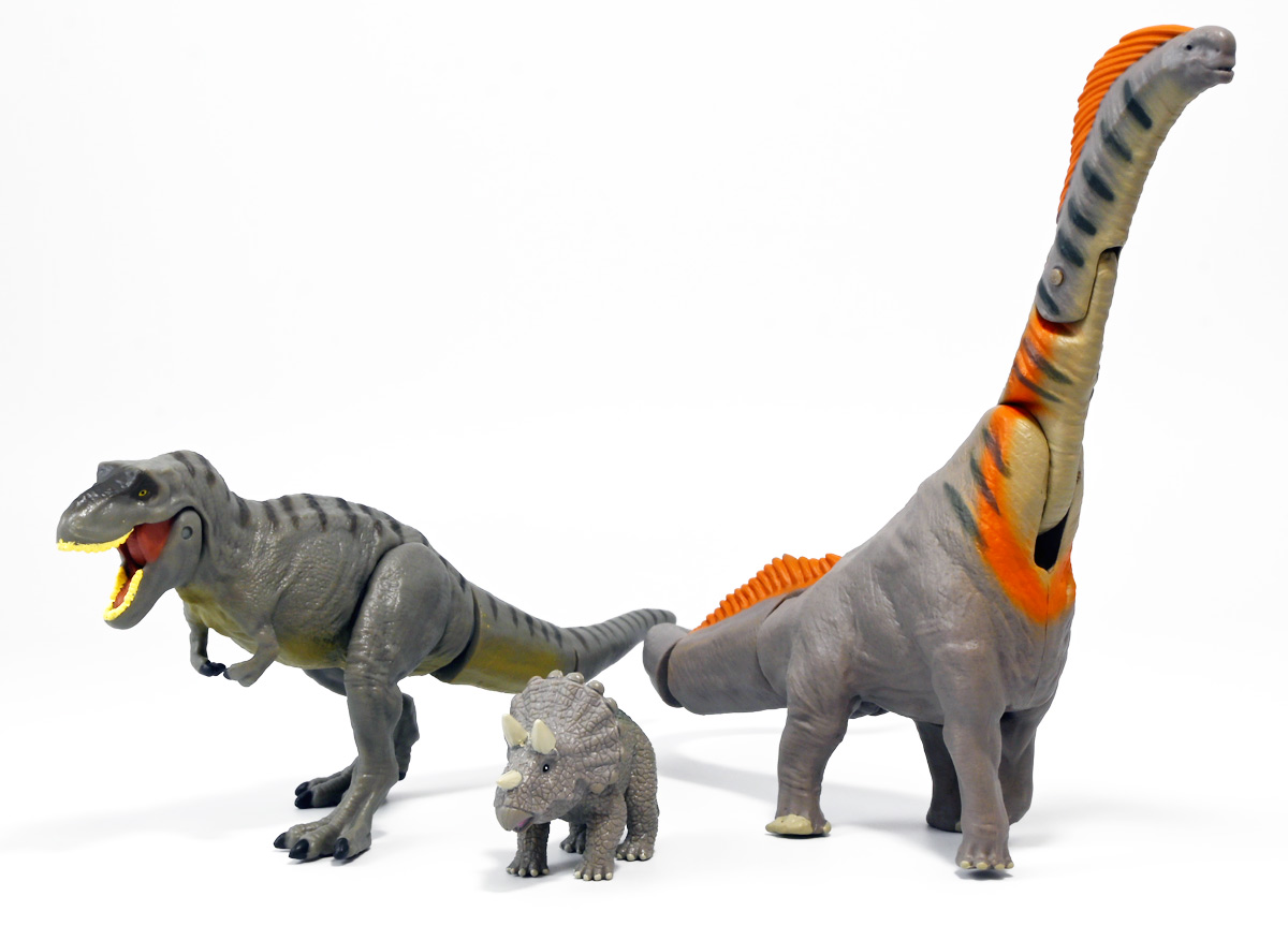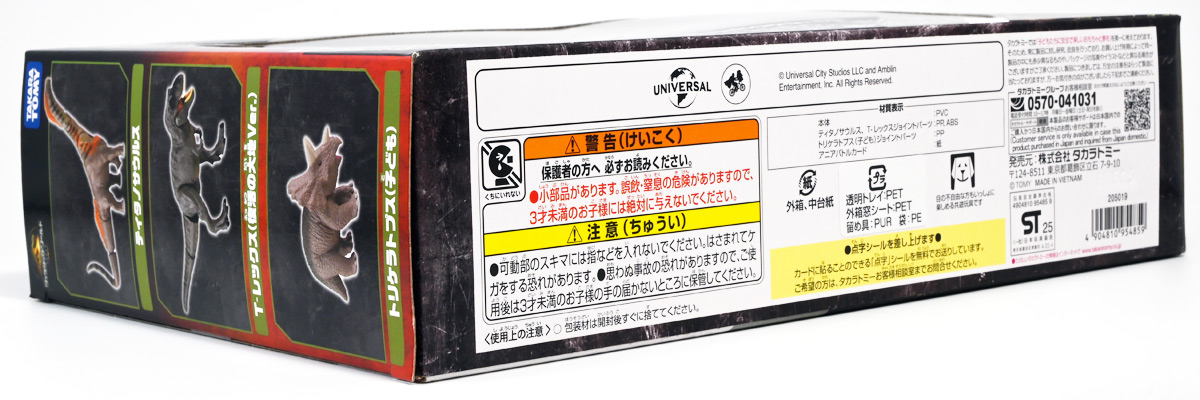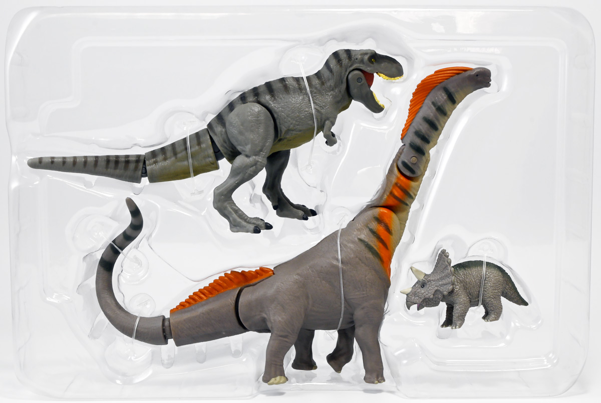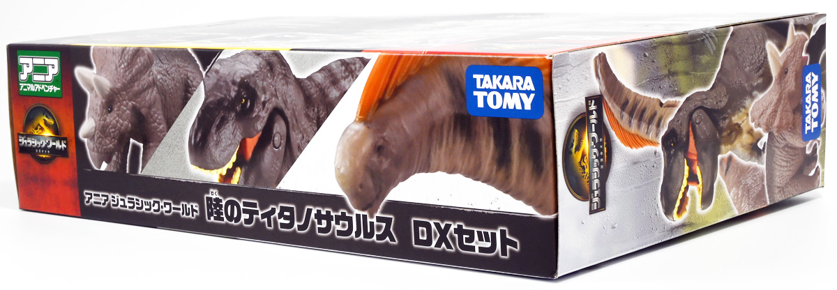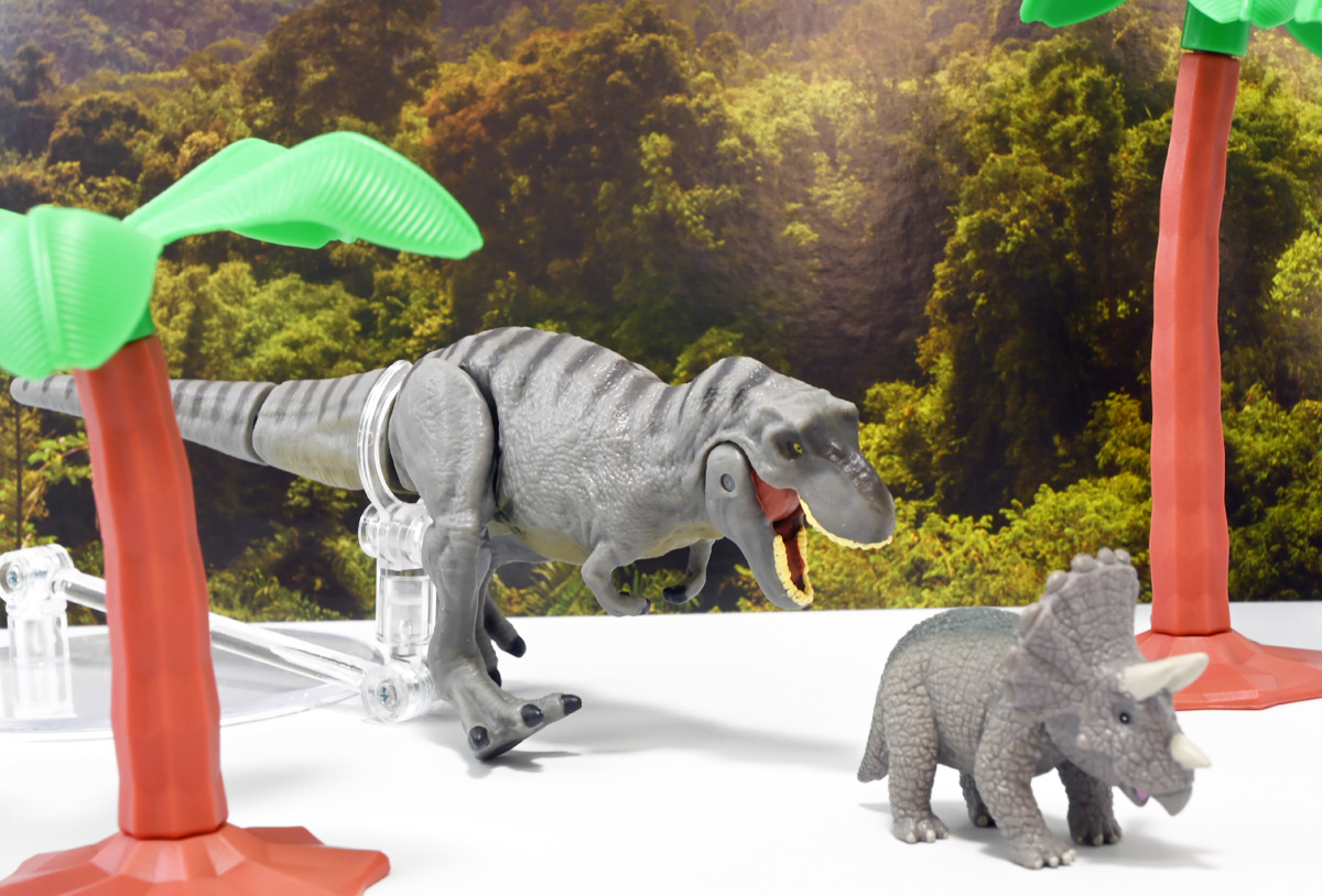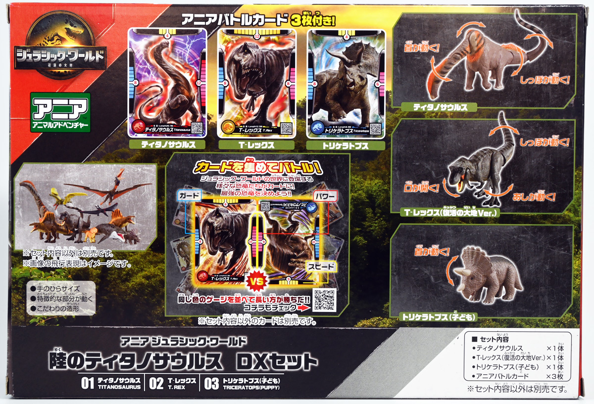 ■アニア ジュラシック・ワールド 陸のティタノサウルス DXセット ![]() 2025年7月26日発売 / 2970円(税込) 映画「復活の大地」物語中盤をモチーフとした第二のDXセット! 巨大恐竜がぴちぴちに詰まった豪華パッケージぞよ!! ![]() 大人気T-レックスが入っているので一番人気と思われるセットぞよね! しかし収録内容的には最も見所が無いパッケージでもある・・・。 タカトミ・・・なかなかの策士だ!! ![]() このパッケージには「T-レックス(復活の大地ver)」、「ティタノサウルス」、そして「トリケラトプス(子ども)」が入っているぞよ。 このうちT-レックスとティタノサウルスは単品パッケージも販売中。 そしてトリケラ子どもは初のジュラワ名義だが、原型の初出は古生物版のギフトセット。 つまり新規造形の版権ものでは無いと言う事ぞ。 ![]() パケ底。 やはりシールで訂正されている。 ![]() アニアバトルカードが三枚付属! 「T-レックス」、「ティタノサウルス」、そして「トリケラトプス」は成体イラストで封入される。 やはり雑誌「ダイノスターズ レッドティラノ号」に同名カードがふろくとなっており、 T-レックスとトリケラトプスはイラスト、背景が同じだがパラメーターが異なるぞよ。 ティタノサウルスは雑誌版と背景も異なる。 ![]() そして全てキラ仕様のレアカードだ! アニアバトルカードは他にも雑誌ふろくになっています。 ![]() それではぱかっと開封! ブリスターに三匹仲良く収まっているぞよ。 ティタノサウルスがとにかくデカいのでスペースいっぱいにパツパツだ! ![]() まずはこちら! 「T-レックス(復活の大地ver)」であるぞよ! 初代「ジュラシック・パーク」で登場し、「ジュラシック・ワールド」三部作を通して活躍したT-レックスのレクシィに変わって、 今回の映画で新たに登場した新個体のT-レックスこそ、この「エンバー」なのだ! これまでのレクシィよりもマッシブな体格となった新デザイン。 アニアでも新規造形されているぞよ! ![]() モササウルスのDNAサンプルをゲットしたチームメンバーはなんとかサン・ユベール島へと上陸する! 一方で、アクシデントで海に投げ出されたデルガド一家はチームとはぐれ別々に上陸する事に! なんでも島には村(?)があるらしく、そこを目指せば何れ合流できるだろうと言う事であるが・・・ こんな秘境に村なんかあるもんか? 島には温泉を流すパイプが張り巡らされており、これを使って地熱発電をしているらしい。 成程おろかなにんげんどもが住んでいた痕跡があるではないか! パイプを伝って村を目指すデルガド一家は、道中で可愛いドロレスちゃんを仲間に加え、励まし合いながら進んでゆく。 途中、長女の彼氏・ザビエルがその辺でおしっこをしていると、背後にヴェロキラプトルが現れて絶体絶命! 今回ラプトル出ないと思い込んでいたが、サン・ユベール島にも棲んでたぞよか! とわたくしは驚いたが、更なる驚きはその後にあった! なんと空からドラゴンが飛来してヴェロキラプトルを食ってしまったぞよ!! こりゃあなんの映画を見ているんだか判らんが、お陰で彼氏は窮地を脱し、冒険は続く。 川へ行きついたデルガド一家は向こう岸で死んでいるパラサウロロフスと小屋を発見。 ボートがあるので勇敢にも長女のテレサさんが取りにゆくと、 ひょっこり可愛い獣脚類が現れたが襟巻を展開するのはディロフォサウルスだ! 向こうではT-レックスが眠っているぞ!? ![]() なんでこんな奴らが外にいるんだろう・・・? と思ったらあちこちに電気柵があるがシステムは死んでいるようだ。 たぶん元々は電気柵があったから凶悪な恐竜も放し飼いに出来ていたのだろう・・・。 ははぁ〜ん。 ひょっとして、さっき出てきたドラゴン怪獣を倒す時に、この電気柵が活躍するぞよね!? ところがこの電気柵、意味深にしばしばフォーカスされるのに全く使われなくてなんなんだ? 家族がハラハラするのをしり目に、長女は小屋でゲットした瞬間膨らみ式のゴムボートを展開させる。 すると音に気づいてT-レックスのエンバーが目を覚まし、逃げ惑う一家を追いかけてきた! このままでは哀れパラサウロロフスと同じ運命ぞよーっ!! じゃぶじゃぶ追いかけてくるエンバーから、一家は必死の形相でゴムボートを漕ぎ川下りの逃走劇ぞ! 「こげこげこげこげっ!!」 これは原作小説にあるシチュエーションで、初代「ジュラパ」で技術的に撮る事が不可能だったためにボツとなっていたシークエンス。 それが最新技術で悲願の実現となったものである! 今回の映画、とにかく水の表現が多くてわくわくなんですね! 懸命な川下りも虚しく、哀れ一家はT-レックス・エンバーの攻撃を受けて水中に投げ出されてしまう! みんななんとか岩陰に隠れる事が出来たが、末娘のイザベラちゃんがひっくり返ったボートの裏に取り残されてしまった! ![]() あーっ! もう駄目ぞよーっ! エンバーの牙がボートに突き刺さる〜っ!! と思いきや! なんとインジェン社のボートは超技術で出来ていた! 