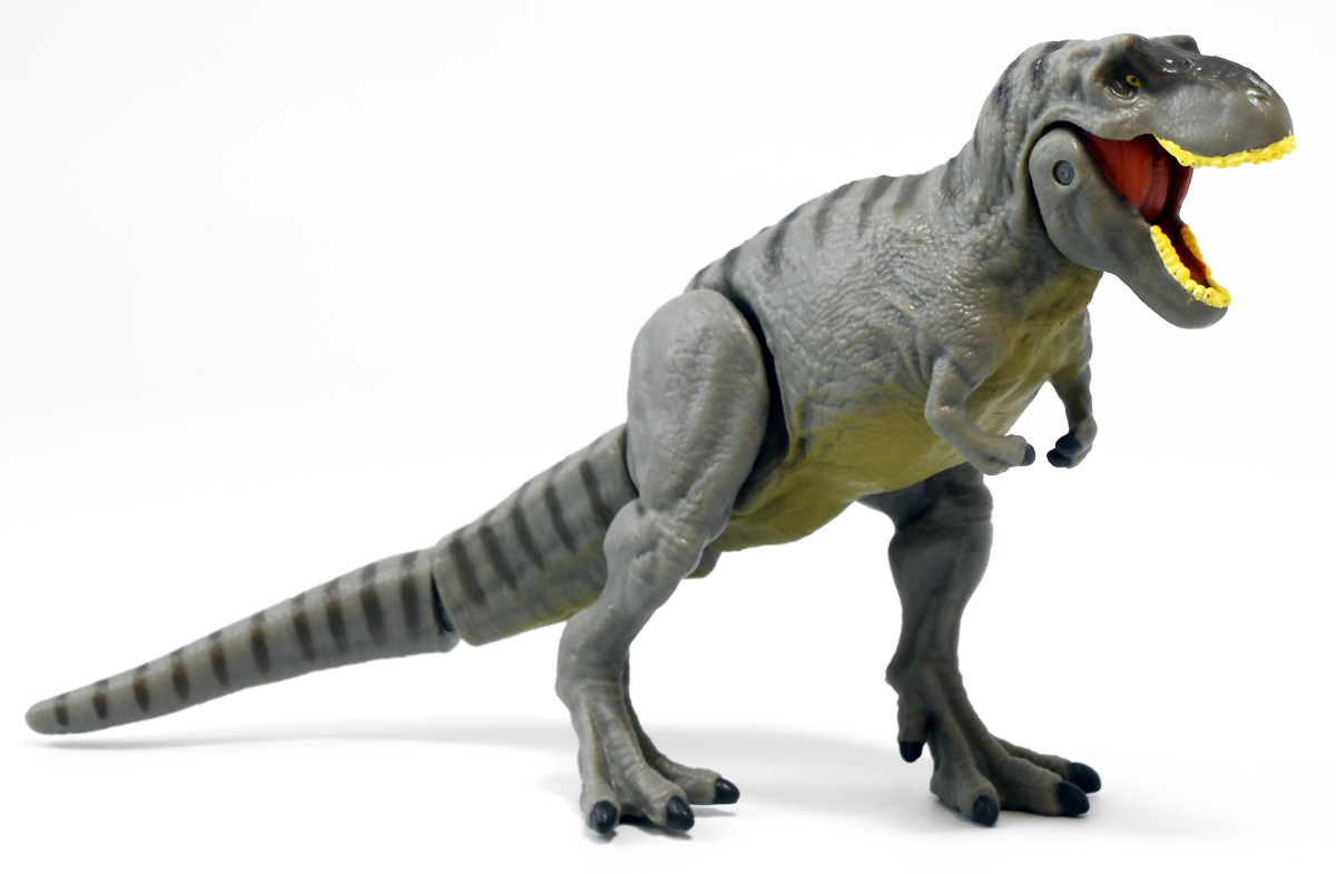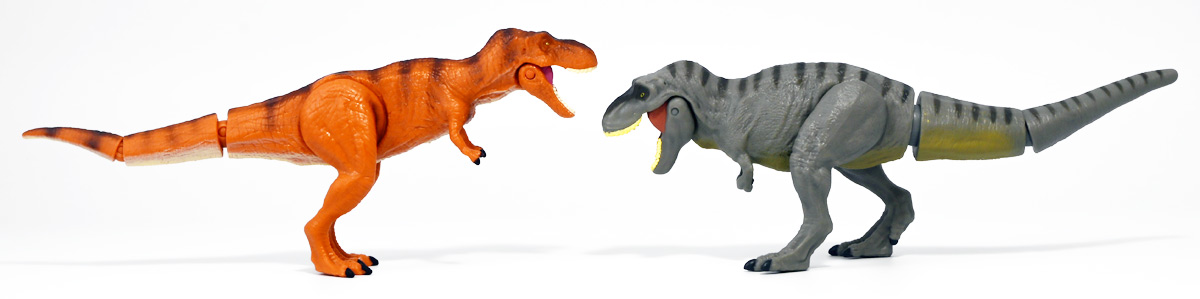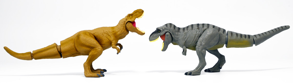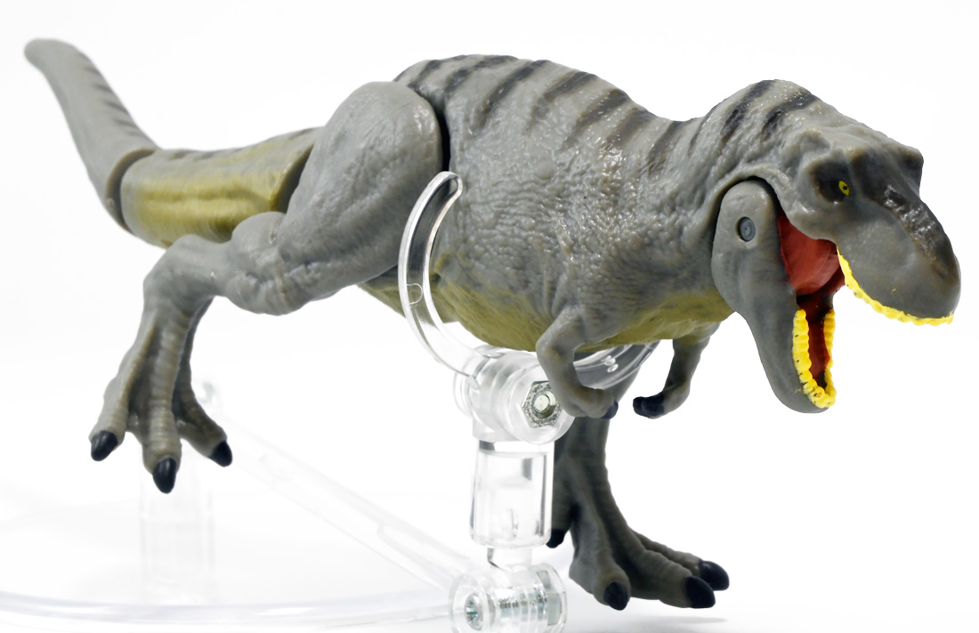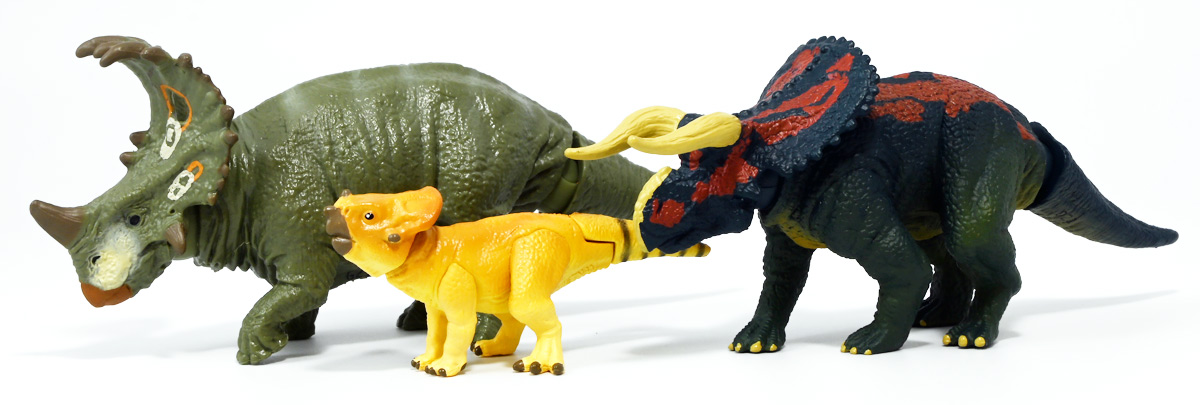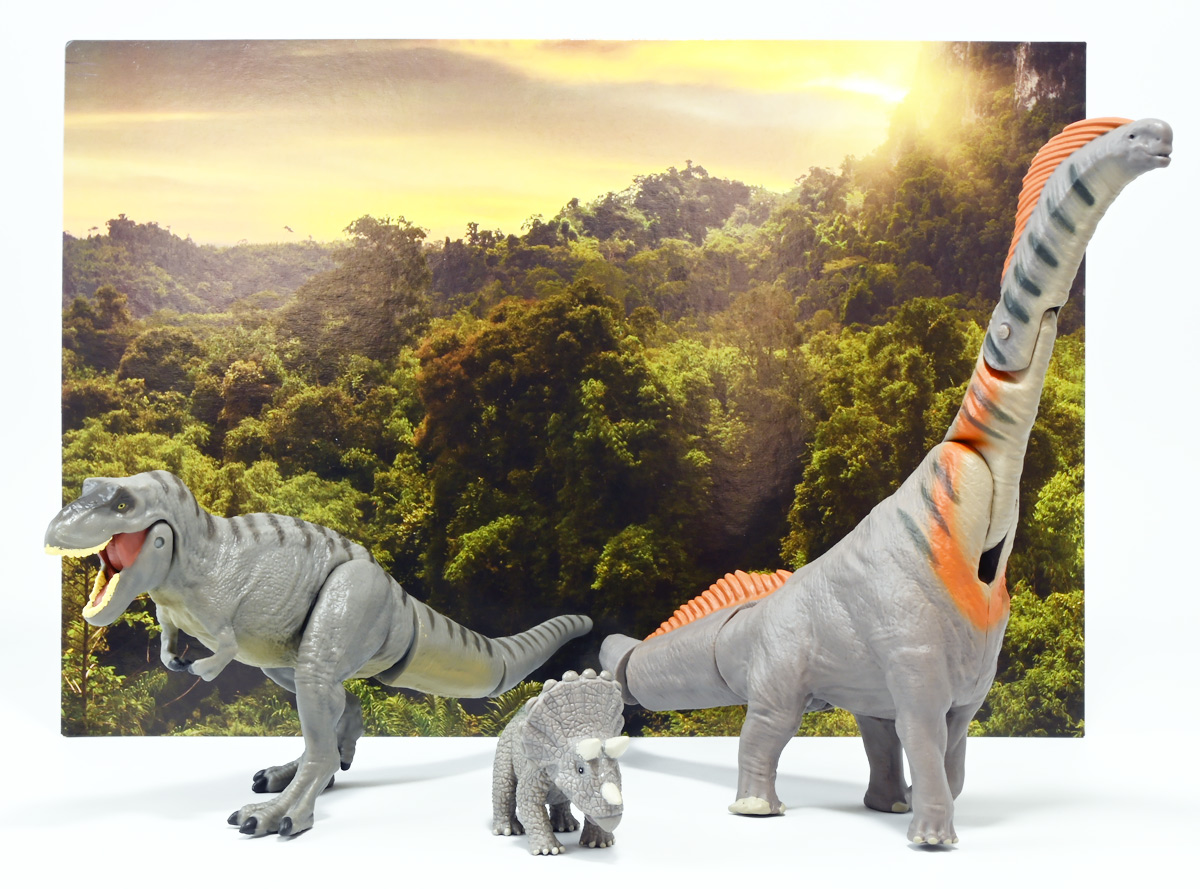 ■アニア ジュラシック・ワールド 陸のティタノサウルス DXセット ![]() 2025年7月26日発売 / 2970円(税込) 映画「復活の大地」物語中盤をモチーフとした第二のDXセット! 巨大恐竜がぴちぴちに詰まった豪華パッケージぞよ!! ![]() 大人気T-レックスが入っているので一番人気と思われるセットぞよね! しかし収録内容的には最も見所が無いパッケージでもある・・・。 タカトミ・・・なかなかの策士だ!! ![]() このパッケージには「T-レックス(復活の大地ver)」、「ティタノサウルス」、そして「トリケラトプス(子ども)」が入っているぞよ。 このうちT-レックスとティタノサウルスは単品パッケージも販売中。 そしてトリケラ子どもは初のジュラワ名義だが、原型の初出は古生物版のギフトセット。 つまり新規造形の版権ものでは無いと言う事ぞ。 ![]() パケ底。 やはりシールで訂正されている。 ![]() アニアバトルカードが三枚付属! 「T-レックス」、「ティタノサウルス」、そして「トリケラトプス」は成体イラストで封入される。 やはり雑誌「ダイノスターズ レッドティラノ号」に同名カードがふろくとなっており、 T-レックスとトリケラトプスはイラスト、背景が同じだがパラメーターが異なるぞよ。 ティタノサウルスは雑誌版と背景も異なる。 ![]() そして全てキラ仕様のレアカードだ! アニアバトルカードは他にも雑誌ふろくになっています。 ![]() それではぱかっと開封! ブリスターに三匹仲良く収まっているぞよ。 ティタノサウルスがとにかくデカいのでスペースいっぱいにパツパツだ! ![]() まずはこちら! 「T-レックス(復活の大地ver)」であるぞよ! 初代「ジュラシック・パーク」で登場し、「ジュラシック・ワールド」三部作を通して活躍したT-レックスのレクシィに変わって、 今回の映画で新たに登場した新個体のT-レックスこそ、この「エンバー」なのだ! これまでのレクシィよりもマッシブな体格となった新デザイン。 アニアでも新規造形されているぞよ! ![]() モササウルスのDNAサンプルをゲットしたチームメンバーはなんとかサン・ユベール島へと上陸する! 一方で、アクシデントで海に投げ出されたデルガド一家はチームとはぐれ別々に上陸する事に! なんでも島には村(?)があるらしく、そこを目指せば何れ合流できるだろうと言う事であるが・・・ こんな秘境に村なんかあるもんか? 島には温泉を流すパイプが張り巡らされており、これを使って地熱発電をしているらしい。 成程おろかなにんげんどもが住んでいた痕跡があるではないか! パイプを伝って村を目指すデルガド一家は、道中で可愛いドロレスちゃんを仲間に加え、励まし合いながら進んでゆく。 途中、長女の彼氏・ザビエルがその辺でおしっこをしていると、背後にヴェロキラプトルが現れて絶体絶命! 今回ラプトル出ないと思い込んでいたが、サン・ユベール島にも棲んでたぞよか! とわたくしは驚いたが、更なる驚きはその後にあった! なんと空からドラゴンが飛来してヴェロキラプトルを食ってしまったぞよ!! こりゃあなんの映画を見ているんだか判らんが、お陰で彼氏は窮地を脱し、冒険は続く。 川へ行きついたデルガド一家は向こう岸で死んでいるパラサウロロフスと小屋を発見。 ボートがあるので勇敢にも長女のテレサさんが取りにゆくと、 ひょっこり可愛い獣脚類が現れたが襟巻を展開するのはディロフォサウルスだ! 向こうではT-レックスが眠っているぞ!? ![]() なんでこんな奴らが外にいるんだろう・・・? と思ったらあちこちに電気柵があるがシステムは死んでいるようだ。 たぶん元々は電気柵があったから凶悪な恐竜も放し飼いに出来ていたのだろう・・・。 ははぁ〜ん。 ひょっとして、さっき出てきたドラゴン怪獣を倒す時に、この電気柵が活躍するぞよね!? ところがこの電気柵、意味深にしばしばフォーカスされるのに全く使われなくてなんなんだ? 家族がハラハラするのをしり目に、長女は小屋でゲットした瞬間膨らみ式のゴムボートを展開させる。 すると音に気づいてT-レックスのエンバーが目を覚まし、逃げ惑う一家を追いかけてきた! このままでは哀れパラサウロロフスと同じ運命ぞよーっ!! じゃぶじゃぶ追いかけてくるエンバーから、一家は必死の形相でゴムボートを漕ぎ川下りの逃走劇ぞ! 「こげこげこげこげっ!!」 これは原作小説にあるシチュエーションで、初代「ジュラパ」で技術的に撮る事が不可能だったためにボツとなっていたシークエンス。 それが最新技術で悲願の実現となったものである! 今回の映画、とにかく水の表現が多くてわくわくなんですね! 懸命な川下りも虚しく、哀れ一家はT-レックス・エンバーの攻撃を受けて水中に投げ出されてしまう! みんななんとか岩陰に隠れる事が出来たが、末娘のイザベラちゃんがひっくり返ったボートの裏に取り残されてしまった! ![]() あーっ! もう駄目ぞよーっ! エンバーの牙がボートに突き刺さる〜っ!! と思いきや! なんとインジェン社のボートは超技術で出来ていた! 