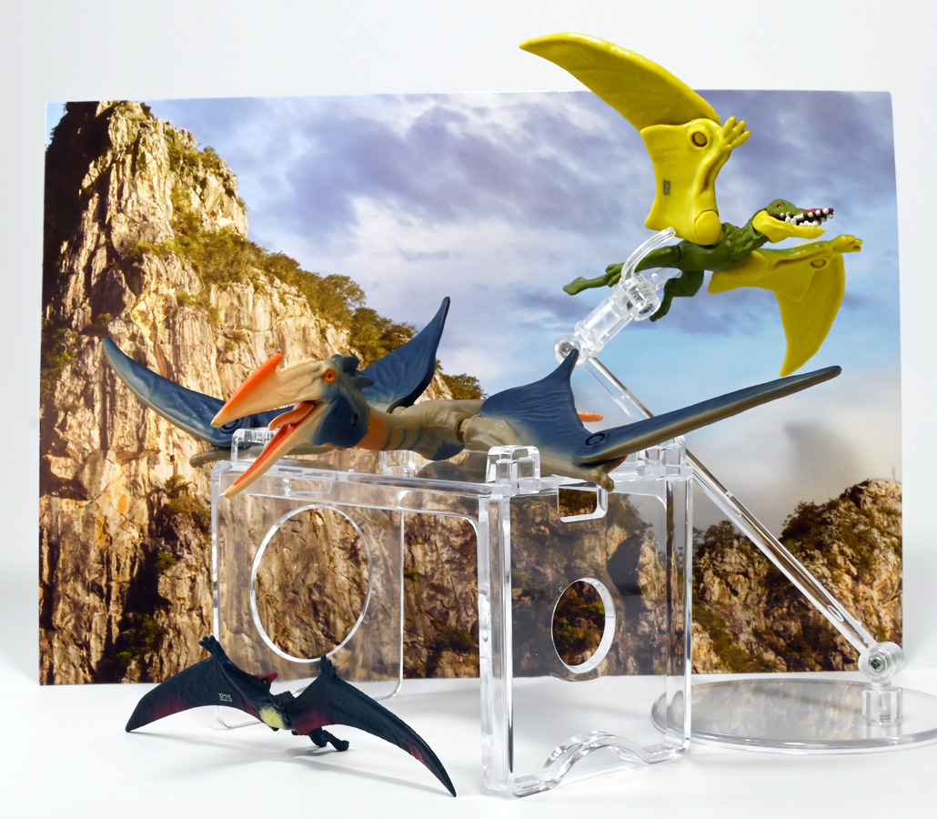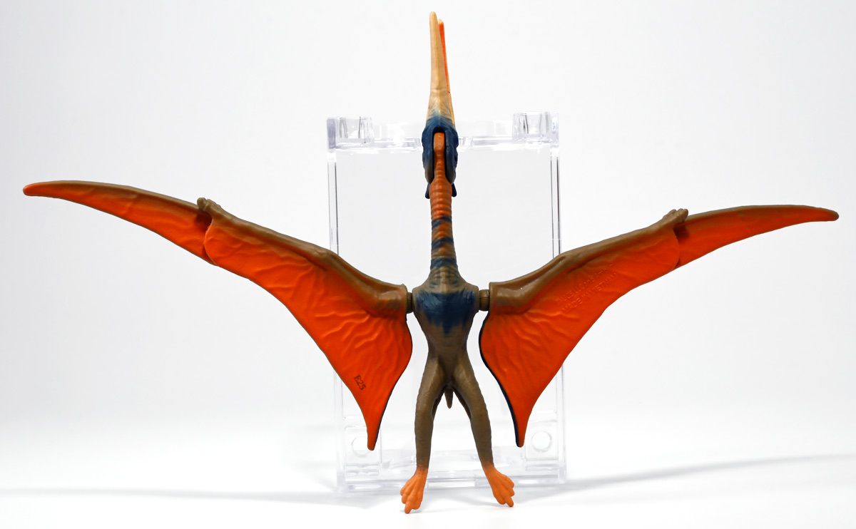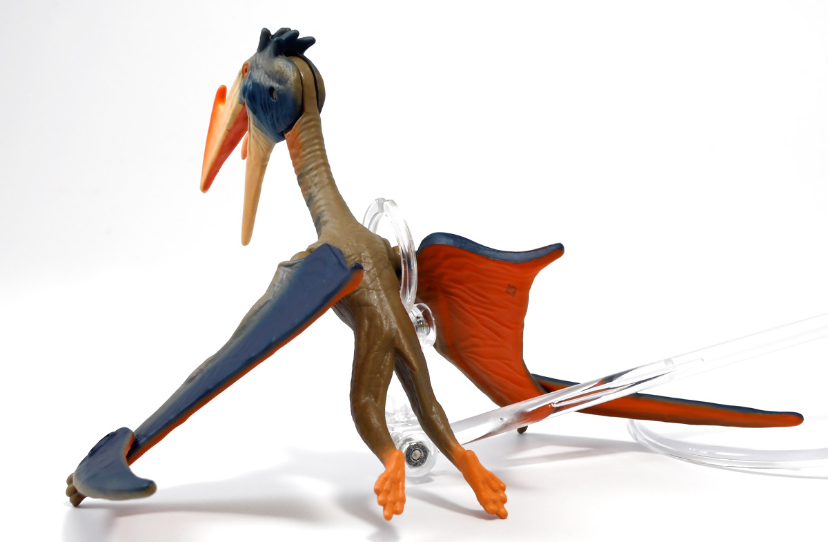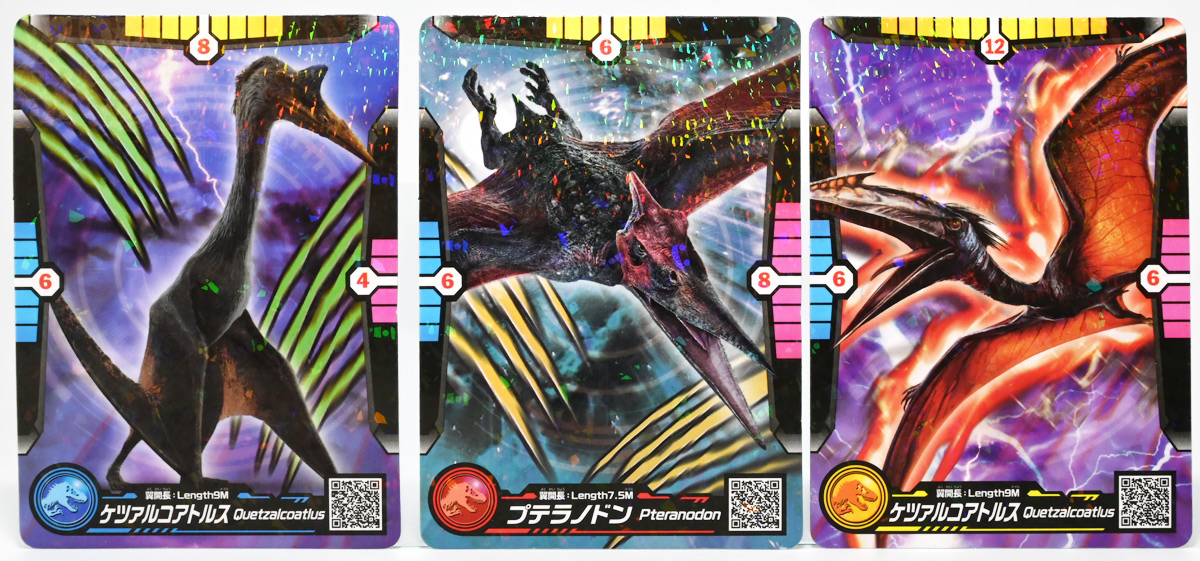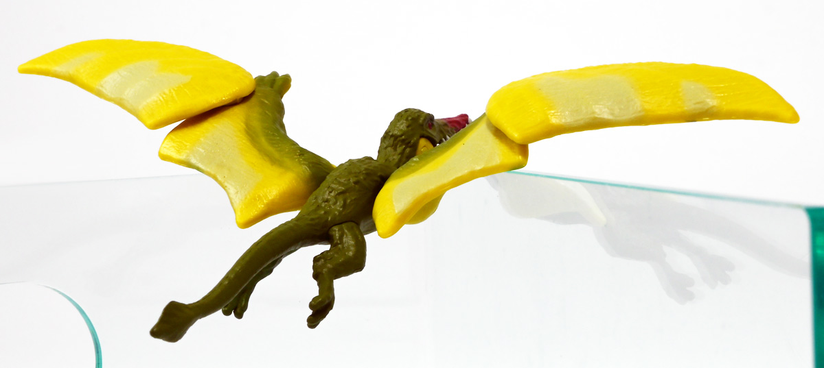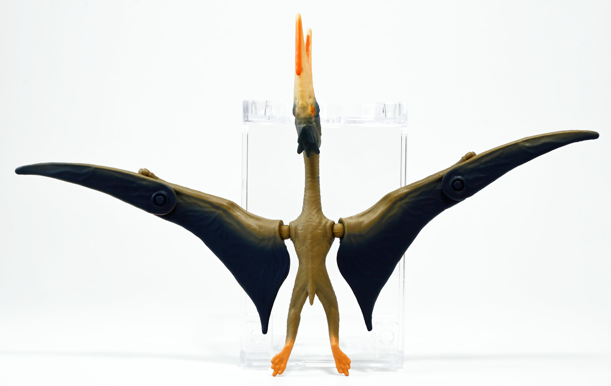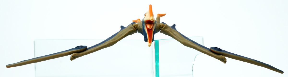■アニア ジュラシック・ワールド 空のケツァルコアトルス DXセット ![]() 2025年7月26日発売 / 2970円(税込) 劇中最後のミッションをモチーフとした第三のDXセットがこちら! ここでしか入手できない新規造形アニアが入った注目パッケージぞよ! ![]() ラインナップは「ケツァルコアトルス」、「ランフォリンクス」、「プテラノドン(子ども)」の三体。 このうちランフォリンクスはこのパッケージが初登場となる新規造形アニアだが、劇中に登場しない翼竜であるぞよ。 ![]() パケトップ。 ![]() ボトム。 シール訂正&点字シールのお知らせあり。 ![]() カードが三枚付属。 ランフォリンクスは劇中に登場せず、コンセプトアートが存在しない為、 「ケツァルコアトルス」が飛行形態と着陸形態で二枚入っています。 ![]() 飛行ケツァルは「ダイノスターズ」の綴じ込みふろくにもなっていたが、 本パッケージ封入のものはキラキラのレアバージョン。 ほか、ケツァルやモサは「てれびくん」や「幼稚園」ふろくのキラバージョンもあるぞよ。 ポップアップストアでティラノのキラカードを配ったりもしたみたい。 ![]() パカっと開封! これまたパッケージいっぱいに収まっている! でっかいぞよーっ!! ![]() まずはこちら! 後期白亜紀の末まで大空を支配していた巨大翼竜「ケツァルコアトルス」ぞよ! アステカの蛇神にして天空の支配者・ケツァルコアトルの名を冠されたこの翼竜は、 これまでに知られる中でも最大級の飛翔動物と考えられるが、発見された化石は断片的なものであり、 例によって初めはでっかく誇張して見積もられていたので年々小さくなってゆくのはご愛敬・・・。 最初は翼開長18メートルとか言われていたが、最近は12メートルとかもっと小さかったとかいろいろ言われている。 ま〜大きかった事は間違いないだろう! ![]() 第一、第二のミッションを成功させ、残る第三のDNAサンプルを入手する為、 ルーミス博士のアドバイスのもと、ミッションチームは巨大翼竜ケツァルコアトルスの巣を目指す! ゾーラ達が懸垂下降で絶壁の谷を下ってゆくと、そこには起源不明の古代寺院の遺跡がぽっかりと口を開けていた・・・。 どうやらケツァルはここを巣穴に使っているみたいぞよ! 運良く翼竜の卵を発見した一行はこれ幸いと注射器を差し込みDNAサンプルをゲット! ルーミス博士は博愛の恐竜おたくなので、胚を傷つけないように白身だけお裾分けしてもらったが・・・ こんな卵に針ブッ挿してどでかいアンプル一本分中身抜いて赤ちゃんが無事なもんかいね? と、そこへ怒りの親ケツァルコアトルスが襲来! ピンチに陥るゾーラ&ルーミス! ルクレールが懸命にサポートしてくれるが、これが仇となり彼は殉職! ルーミス博士も谷から落下するが、九死に一生を得た!! DNAサンプルも無事ぞよ!! や〜・・・多大な犠牲を払いびっくり展開もあったがなんとかミッションコンプリートぞよね〜・・・ って、そこに寺院に繋がる階段あったんかいっ! おい〜・・・じゃあ絶壁の谷を命がけで下ったのはなんだったんだぞよ〜・・・。 ![]() さて、劇中ではケツァルコアトルスの卵からサンプルを入手する。 古生物の卵化石と言うのはそれだけだと誰が産んだなんの卵なのかはよくわからない。 近くに親と思われる化石が残っている場合だけはっきりとなんの卵かと言う事が言えるぞよ。 また、生まれる直前の胚が化石として残っている事もごく稀にあり、こういう場合もそれがどんな動物の卵であったか判断できる。 近年ではCTスキャンで化石の中身を見る事も出来るので、色々研究が進んでいるぞよ。 さて、ケツァルコアトルスの様な翼竜もやはり卵を産んでいた。 ・・・が、それは鳥のように硬い殻に覆われていたのではなく、 ぷにぷにと柔らかい卵だったと考えられている。 べこっとへこんだ状態の化石が見つかっているぞよよ。 そして翼竜たちはその軟らかい卵を湿度の高い土中に産み付け、 お世話はしなかったと考えられる。 イメージとしてはウミガメみたいな感じぞよね。 つまり、鳥の様な巣を作り、硬い殻の卵を産む劇中のケツァルコアトルスは古生物学的には正確でないと言える。 ![]() シリーズにケツァルコアトルスは二度登場しているぞよ。 「新たなる支配者」で登場したバイオシン社のサンクチュアリに保護されている個体と、 今回登場のサン・ユベール島で製造されたインジェン社製の個体では復元デザインが異なっている。 本商品はインジェン社製のデザインぞよね。 ![]() 2作で最も異なる点は頭部造形で、 わたくし的にはバイオシンバージョンの方がイメージに近いが、 そもそもケツァルコアトルスの頭骨はどの種も完全なものが見つかっていない。 従って今日で知られている一般的な復元イメージは、 ケツァルコアトルス・ラーソニの断片的な化石を繋ぎ合わせて復元したものであるぞよ。 と言う事でこんなペリカンみたいなケツァルコアトルスがいても必ずしも間違いとは言い切れない・・・の