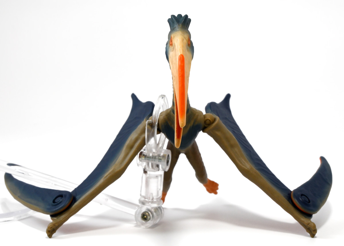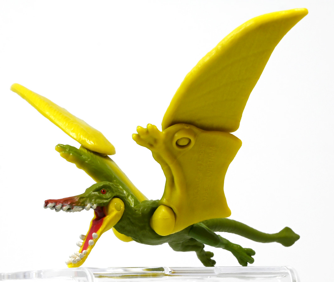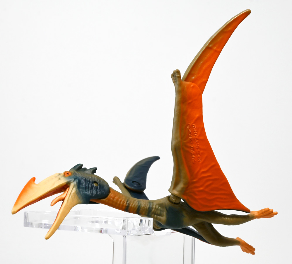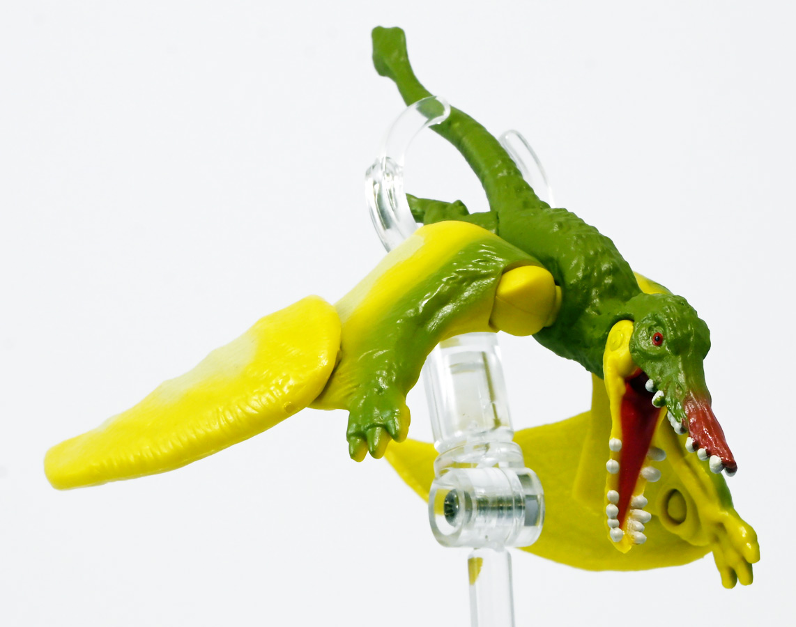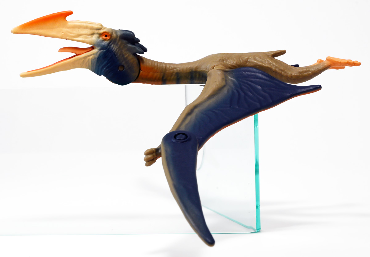 ■アニア ジュラシック・ワールド 空のケツァルコアトルス DXセット ![]() 2025年7月26日発売 / 2970円(税込) 劇中最後のミッションをモチーフとした第三のDXセットがこちら! ここでしか入手できない新規造形アニアが入った注目パッケージぞよ! ![]() ラインナップは「ケツァルコアトルス」、「ランフォリンクス」、「プテラノドン(子ども)」の三体。 このうちランフォリンクスはこのパッケージが初登場となる新規造形アニアだが、劇中に登場しない翼竜であるぞよ。 ![]() パケトップ。 ![]() ボトム。 シール訂正&点字シールのお知らせあり。 ![]() カードが三枚付属。 ランフォリンクスは劇中に登場せず、コンセプトアートが存在しない為、 「ケツァルコアトルス」が飛行形態と着陸形態で二枚入っています。 ![]() 飛行ケツァルは「ダイノスターズ」の綴じ込みふろくにもなっていたが、 本パッケージ封入のものはキラキラのレアバージョン。 ほか、ケツァルやモサは「てれびくん」や「幼稚園」ふろくのキラバージョンもあるぞよ。 ポップアップストアでティラノのキラカードを配ったりもしたみたい。 ![]() パカっと開封! これまたパッケージいっぱいに収まっている! でっかいぞよーっ!! ![]() まずはこちら! 後期白亜紀の末まで大空を支配していた巨大翼竜「ケツァルコアトルス」ぞよ! アステカの蛇神にして天空の支配者・ケツァルコアトルの名を冠されたこの翼竜は、 これまでに知られる中でも最大級の飛翔動物と考えられるが、発見された化石は断片的なものであり、 例によって初めはでっかく誇張して見積もられていたので年々小さくなってゆくのはご愛敬・・・。 最初は翼開長18メートルとか言われていたが、最近は12メートルとかもっと小さかったとかいろいろ言われている。 ま〜大きかった事は間違いないだろう! ![]() 第一、第二のミッションを成功させ、残る第三のDNAサンプルを入手する為、 ルーミス博士のアドバイスのもと、ミッションチームは巨大翼竜ケツァルコアトルスの巣を目指す! ゾーラ達が懸垂下降で絶壁の谷を下ってゆくと、そこには起源不明の古代寺院の遺跡がぽっかりと口を開けていた・・・。 どうやらケツァルはここを巣穴に使っているみたいぞよ! 運良く翼竜の卵を発見した一行はこれ幸いと注射器を差し込みDNAサンプルをゲット! ルーミス博士は博愛の恐竜おたくなので、胚を傷つけないように白身だけお裾分けしてもらったが・・・ こんな卵に針ブッ挿してどでかいアンプル一本分中身抜いて赤ちゃんが無事なもんかいね? と、そこへ怒りの親ケツァルコアトルスが襲来! ピンチに陥るゾーラ&ルーミス! ルクレールが懸命にサポートしてくれるが、これが仇となり彼は殉職! ルーミス博士も谷から落下するが、九死に一生を得た!! DNAサンプルも無事ぞよ!! や〜・・・多大な犠牲を払いびっくり展開もあったがなんとかミッションコンプリートぞよね〜・・・ って、そこに寺院に繋がる階段あったんかいっ! おい〜・・・じゃあ絶壁の谷を命がけで下ったのはなんだったんだぞよ〜・・・。 ![]() さて、劇中ではケツァルコアトルスの卵からサンプルを入手する。 古生物の卵化石と言うのはそれだけだと誰が産んだなんの卵なのかはよくわからない。 近くに親と思われる化石が残っている場合だけはっきりとなんの卵かと言う事が言えるぞよ。 また、生まれる直前の胚が化石として残っている事もごく稀にあり、こういう場合もそれがどんな動物の卵であったか判断できる。 近年ではCTスキャンで化石の中身を見る事も出来るので、色々研究が進んでいるぞよ。 さて、ケツァルコアトルスの様な翼竜もやはり卵を産んでいた。 ・・・が、それは鳥のように硬い殻に覆われていたのではなく、 ぷにぷにと柔らかい卵だったと考えられている。 べこっとへこんだ状態の化石が見つかっているぞよよ。 そして翼竜たちはその軟らかい卵を湿度の高い土中に産み付け、 お世話はしなかったと考えられる。 イメージとしてはウミガメみたいな感じぞよね。 つまり、鳥の様な巣を作り、硬い殻の卵を産む劇中のケツァルコアトルスは古生物学的には正確でないと言える。 ![]() シリーズにケツァルコアトルスは二度登場しているぞよ。 「新たなる支配者」で登場したバイオシン社のサンクチュアリに保護されている個体と、 今回登場のサン・ユベール島で製造されたインジェン社製の個体では復元デザインが異なっている。 本商品はインジェン社製のデザインぞよね。 ![]() 2作で最も異なる点は頭部造形で、 わたくし的にはバイオシンバージョンの方がイメージに近いが、 そもそもケツァルコアトルスの頭骨はどの種も完全なものが見つかっていない。 従って今日で知られている一般的な復元イメージは、 ケツァルコアトルス・ラーソニの断片的な化石を繋ぎ合わせて復元したものであるぞよ。 と言う事でこんなペリカンみたいなケツァルコアトルスがいても必ずしも間違いとは言い切れない・・・の