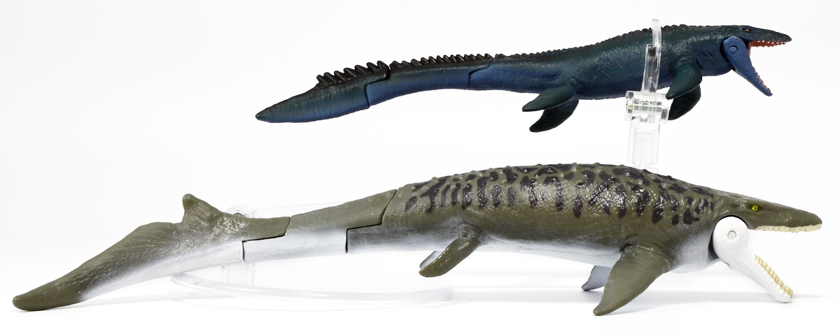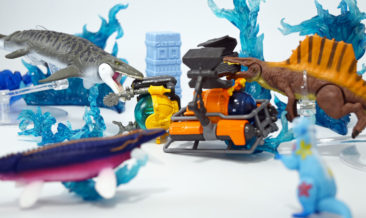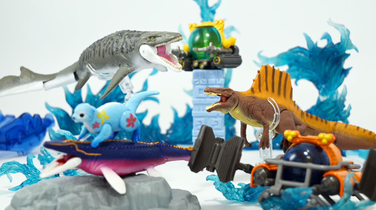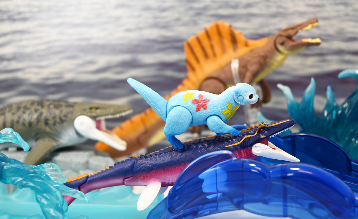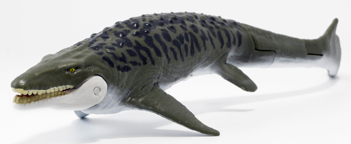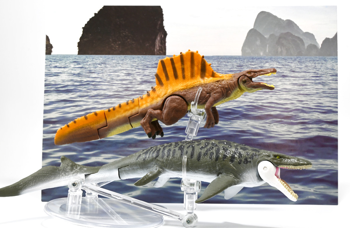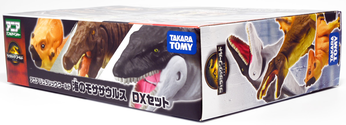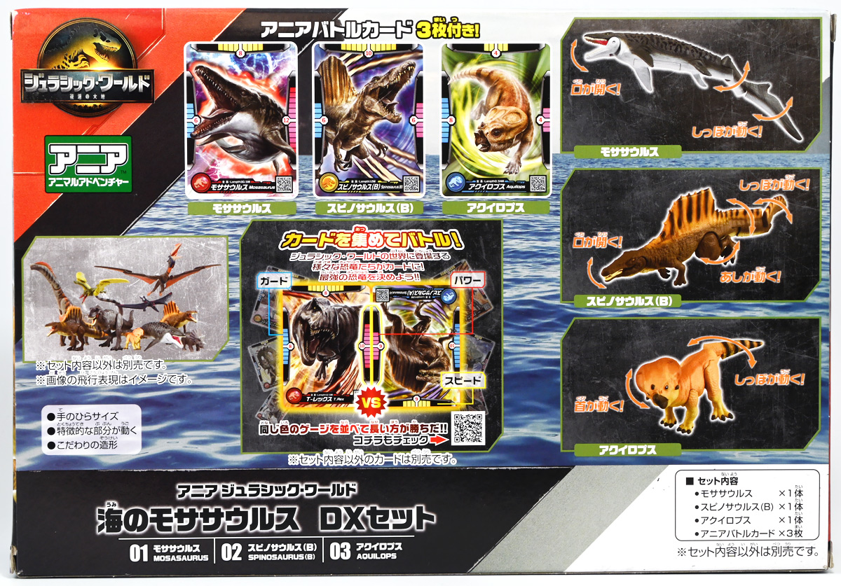 ■アニア ジュラシック・ワールド 海のモササウルス DXセット ![]() 2025年7月26日発売 / 2970円(税込) 2025年、ジュラシックワールド再始動! 国内では8月8日より公開となった最新作「ジュラシック・ワールド/復活の大地」に合わせて、 映画に登場する新恐竜達が続々アニア化! なんとわたくし・・・今回は既に映画を鑑賞済みなので本レビューもネタバレ紹介してゆくぞよ!! まだ映画見てない人はテキストを薄眼で遠くから見るぞよよ!! ![]() ジュラワアニアの新作は6月28日に単品パッケージ「T-レックス(復活の大地Ver.)」、 「モササウルス」、「スピノサウルス(A)」、「ティタノサウルス」、「ケツァルコアトルス」が登場。 プレイセット「ジュラシック・ワールド 決めろ!ダイノアタック」と 「プラレール ジュラシック・ワールド 恐竜輸送列車」も発売されたぞよ。 同時発売で各「DXセット」も発売予定でしたが延期となり、 7月26日に無事リリース。 7月にはトミカの「ツアービークル」も登場しており熱い月となったぞよ! ![]() 購入特典のプロモカードパックもまだまだ配っている。 こちらは「アンキロサウルス」レビューで紹介したのでそちらを参照のことぞ。 ![]() 本パッケージには「モササウルス」、「スピノサウルス(B)」、「アクイロプス」のアニアとバトルカードが封入。 このうちスピノサウルスBカラーとアクイロプスは本パッケージでしか入手出来ない為、 見所の多いセットパッケージとなっているぞよ! ![]() 単品パケと内容が重複しているので、どれ買えば良いんだよ!?と混乱しがちだが、 とりあえずDXセットを全部買っとけば造形はコンプできると言うワケ。 ![]() パケ底の材質表示がシールで訂正されている。 恐らく発売延期になった理由はここで、パッケージが間違っていた為に修正する必要があったのだろう。 また、「点字シールを差し上げます」と書いてあり、タカトミにお問い合わせすると対応してくれるようだ。 バトルカードに点字シールを貼って目の見えない人でも遊べるようにする取り組みのようです。 目の見えない人は映画を聴いても画面にどんな恐竜が登場しているのか判らない。 けれどアニアを触ればシルエットやディテールを感じられるし、 点字シールを貼ればカードの内容も読めるようになる。 なんとも親切であるぞよ〜! ![]() ぱかっと開封! 巨大なモササウルスと新復元のスピノサウルス、可愛いアクイロプスが入っているぞよ! ![]() バトルカードは3枚付属。 「ダイノスターズ レッドティラノ号」にも同絵柄・同背景のカードが綴じ込みふろくになっていたが、 こちらはパラメーターがアップしている。 ![]() そして綴じ込みふろくと異なり、本パッケージ付属のカードは全てカット済みのキラバージョン! このパケでしか手に入らないレアカードなのだ!! ![]() それでは中身を見ていこう! まずはこちら、新規造形・新デザインの「モササウルス」ぞよ!! めちゃくちゃでっけ〜アニアです。 ![]() 「新たなる支配者(2022)」で起こった事件から5年・・・ 現生動物と共存の道を辿るかに思えた恐竜達は地球環境に適応できず、 そのほとんどが死滅。 生き残りは自然公園で管理されるか、太古の環境に似た赤道直下の熱帯地域で見られるのみとなっていた。 秘密工作員であるゾーラ・ベネットは 遺伝子製薬会社パーカー・ジェニックス社のマーティン・クレブスに雇われ、 古生物学者のヘンリー・ルーミス博士、 そしてゾーラの旧友でありエセックス号の船長、ダンカン・キンケイドらを仲間に加えると、 フランス領ギアナにある秘密の研究島・・・サン・ユベール島へと乗り込む! かつてジュラシックパーク建設を夢見たジョン・ハモンドとベンジャミン・ロックウッドが設立したインジェン社が倒産した後、 パーカー・ジェニックス社はその資産の多くを買い取っており、彼らはルーミス博士の助言を受けた研究の末、 恐竜達のDNAを用いて現在人類を脅かしている心臓病を治療する夢の新薬「パレオダイオキシン」を製造できると確信していた! なぜ心臓病に恐竜の遺伝子が必要になるのか・・・? それは恐竜はでっけー動物なので心臓もでっかく、その遺伝子を組み込めば人類の心臓も強壮になるに違いないからだ! しかし、このミッションを成功させるためには、陸・海・空の三つの恐竜からDNAサンプルを回収せねばならない! すなわち、陸のティタノサウルス(疑問名)! 海のモササウルス(海棲爬虫類)!! 空のケツァルコアトルス(翼竜)!!!であるぞよ! 見事にまともな恐竜が一匹もいないが、ともかく一行を乗せたエセックス号は最初のターゲットとしてモササウルスを選んだ! なぜならモササウルスにはインジェン社の撃ち込んだ発信機タグが健在であり、 居場所の特定が容易だったからだ! ゆくぞ、最初のミッション・・・!! エセックス号突撃ぞよっ!! ![]() 海の恐竜・モササウルス現る・・・っ! と言って早速ズッコケなのは、 白亜紀の海を支配したモササウルス類はトカゲやヘビのよう