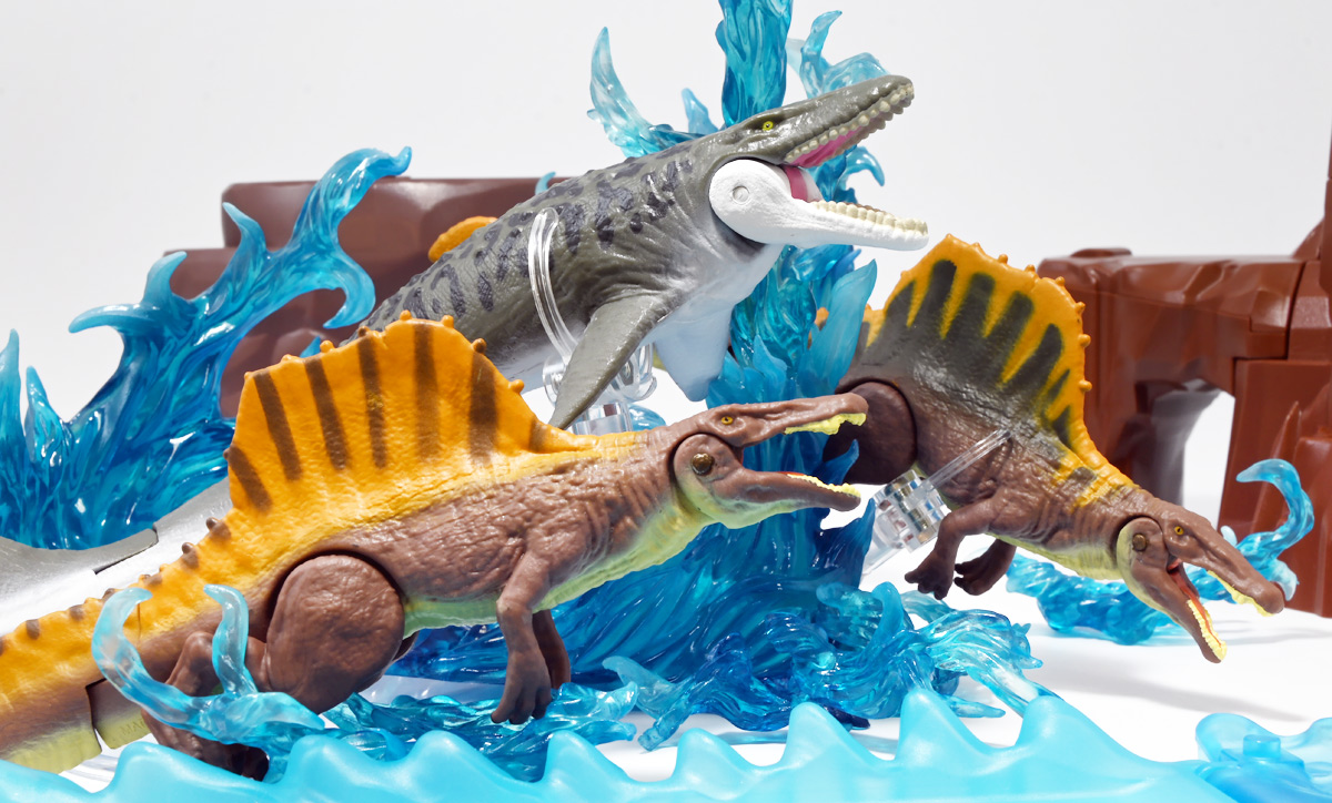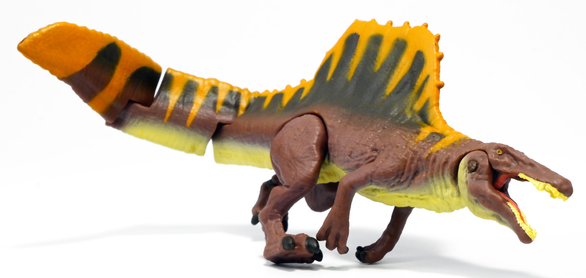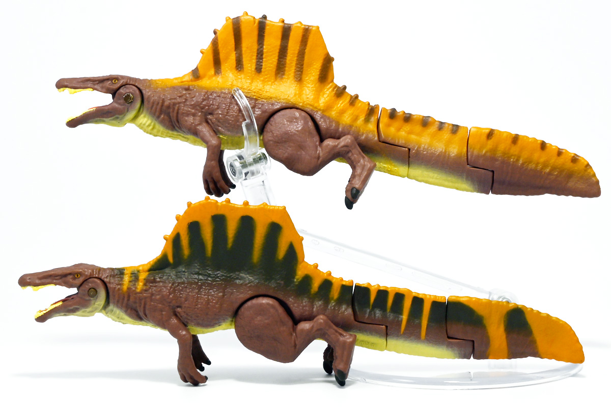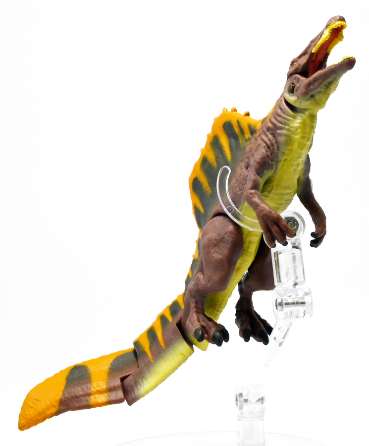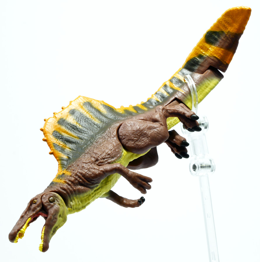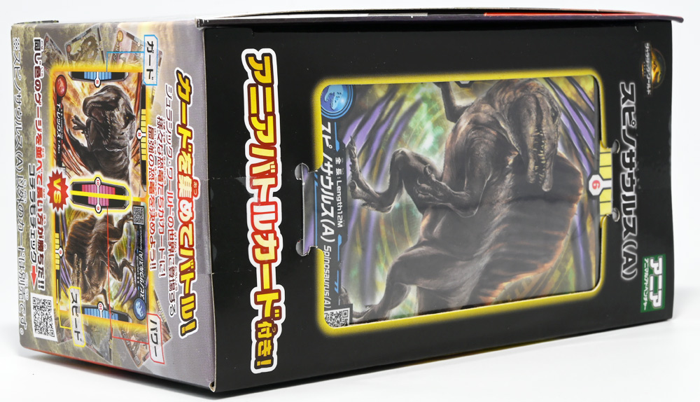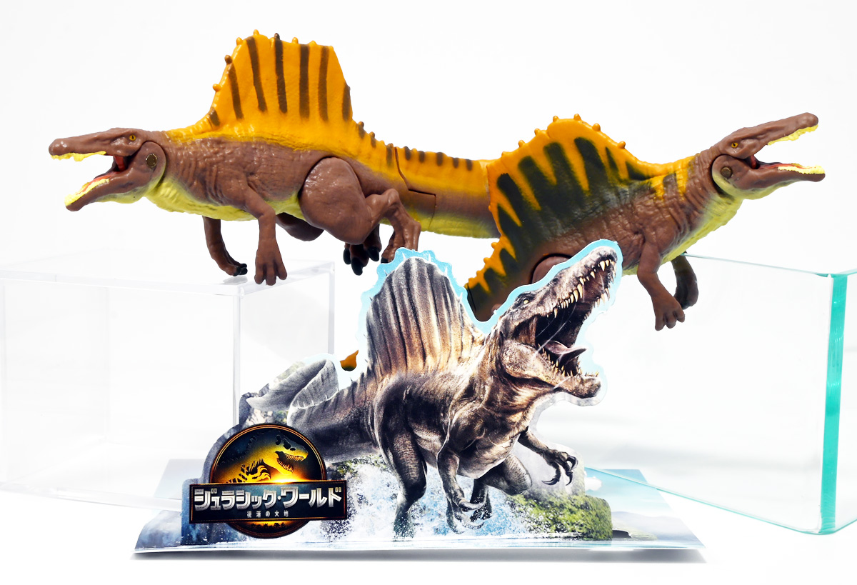 ■アニア ジュラシック・ワールド スピノサウルス(A) ![]() 2025年6月28日発売 / 1320円(税込) 2025年8月8日に国内で公開となった映画「ジュラシック・ワールド」最新作「復活の大地」より、 新デザインの「スピノサウルス」がアニアシリーズに堂々参戦ぞよ!! ![]() 「復活の大地」公開に合わせて本商品と同時発売で、 「T-レックス(復活の大地Ver.)」、「モササウルス」、「ティタノサウルス」、「ケツァルコアトルス」 の単品パッケージも登場していますが、これらは全て後続の「DXセット」に収録されています。 スピノサウルスは「海のモササウルス DXセット」にも収録されているけど、セット版は「Bカラー」となっており、 本商品の「Aカラー」とは彩色が異なるバリエーションぞよ。 つまり、全てのアニアを集めたいおろかなにんげんどもは、本商品と「DXセット」を買えば良いと言う事だ! ![]() 最新パッケージのジュラワアニアには「アニアバトルカード」が付属。 パッケージの窓から覗く事が出来るぞよ。 ![]() 口が開く! 尻尾が動く! あしが動く! ![]() おまけのバトルカード。 「スピノサウルス(A)」のキラバージョンが確定で入っています。 「DXセット」と単品パケでは封入カードが異なるので、 カードも全部コンプしたい人は全てのパッケージを重複して買わねばならんぞよ。 ![]() 玩具に入っているカードはキラキラ仕様なのです。 ほか、雑誌ふろくなどでは同じ絵柄だけどノーマル仕様でパラメーターが異なるものもある。 今回もまたまたプロモパック貰えちゃったぞよ! バトルゲームには枚数が必要なのでいっぱいプロモを貰ってデッキを増やしてねと言う事だろう。 ![]() それではパカっと開封! こちらの原型は既に「DXセット」のレビューで紹介済みだが・・・ 前述の通り背ビレの色が異なるカラーバリエーション。 「スピノサウルス」の「Aカラー」となっているぞよ! ![]() 後期白亜紀の北アフリカに生息していたとされるスピノサウルスは、 1912年にエジプトで発見され、1915年にドイツの古生物学者エルンスト・シュトローマーによって記載されたが、 第二次世界大戦で元の化石が破壊された為に長らく謎の巨大獣脚類であったぞよ。 その後、21世紀初頭に新たに化石が発掘され、近縁種も見つかり様々な事が判ってきた。 現在では「スピノサウルス・エジプティアクス」は全長14メートルと推定され、 陸生肉食動物で最大級の巨大獣脚類であり、 半水生の魚食性であったと考えられているぞよ。 ![]() スピノサウルスと言えば映画「ジュラシック・パーク3(2001)」の主役恐竜として二足歩行の怪獣然としたデザインで登場していたが、 「復活の大地」では水棲の新デザインで24年ぶりの映画再登場となった! これは最新研究に基づいた新復元・・・と言う訳では厳密には無く、 劇中ではサン・ユベール島の研究施設でスピノサウルスを元に作られた人造怪獣であり、 ゲノム編集によって本物のスピノサウルスよりも遊泳能力を向上させ、 完全水生となってモササウルスと共生関係を結ぶに至っているぞよ。 ![]() 勿論、元のスピノサウルスに則って特徴的な背中の帆は健在。 近年ではスピノサウルスの尾はイモリのような形だった事が判っており、 これは水中で推進力を得るのに便利だったとされている。 このような新たな学説も当然取り入れられているぞよ。 一方でこの新ジュラワスピノは首がずんぐりして短いぞよ。 スピノサウルスの首は長くS字を描く姿で復元される事が多いので、ここは最も目につく違和感である。 スピノサウルスはバンダイのプラモ「プラノサウルス」で古生物版と「ジュラシック・ワールド」版、 二つが発売されており、これは骨格形態を含むが、 二つは一部パーツを共有しながらも、首は新規造形されており、 ジュラワ版はやはり骨が短くなっているみたいぞよ。 恐らく水生適応能力が付与された結果骨格の形状が変わっていると言う事なのだろう。 ![]() 尤も、スピノサウルスの骨格は全ての骨が揃っているわけでは無く、 特に上半身、腕や頭から後ろ辺りで見つかっていない部位が多いので、 古生物学的に見てもその全貌はまだまだ謎に包まれているのだ。 ![]() トップ。 という事で最新学説には近づいたがやっぱり微妙に古生物的なイメージと異なるスピノぞよ。 この「復活の大地」には怪獣も出て来るが、 恐竜と呼ばれる者達も遺伝子改造を受けた人造恐竜でやはり怪獣然としたものばかりであった。 ![]() ボトム。 手と足には水かきもついています。 ![]() アニアはワンアクション付きの動物フィギュア! ジュラワスピノは口が開閉、足の付け根、尾が二か所でスイング可能! 大きくシルエットを変える事が出来るぞよ! ![]() 陸上モードで自立も可能だが、本商品は首と尾が水平になっており、 明らかに水中モードに基づく造形である。 こんな風に足を倒して遊泳ポーズが良く似合うぞよ!! ![]() 尾の横スイング構造もこういった左右に振るタイプの水生生物だと良く似合うぞ