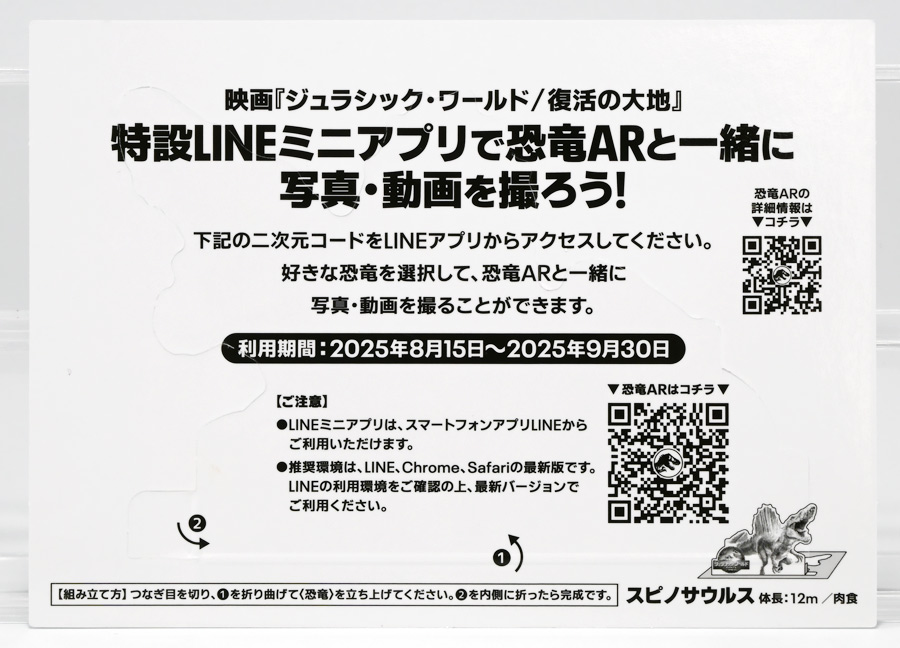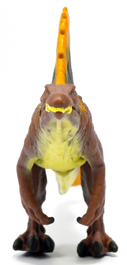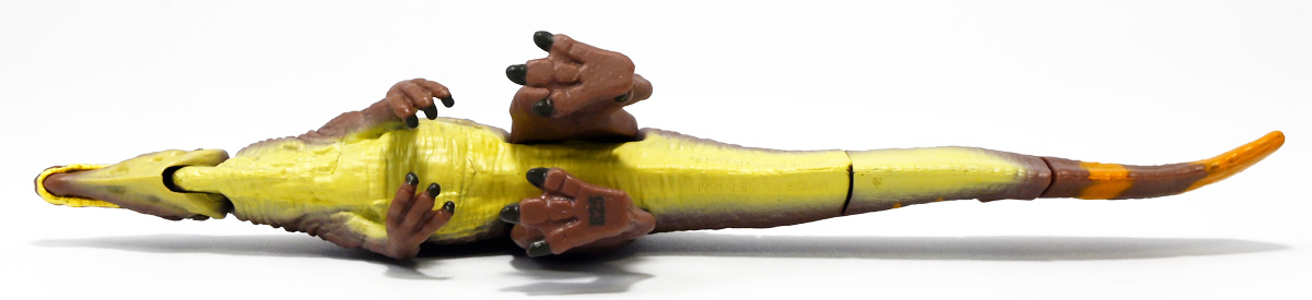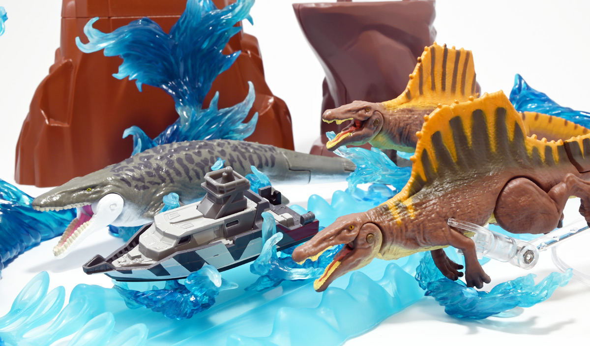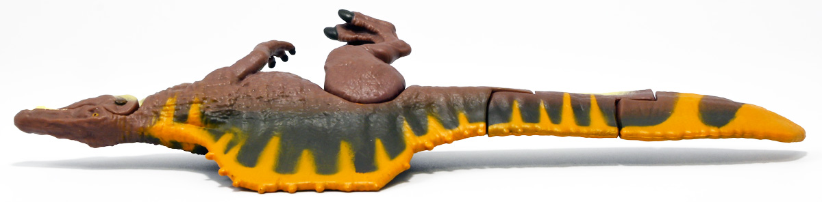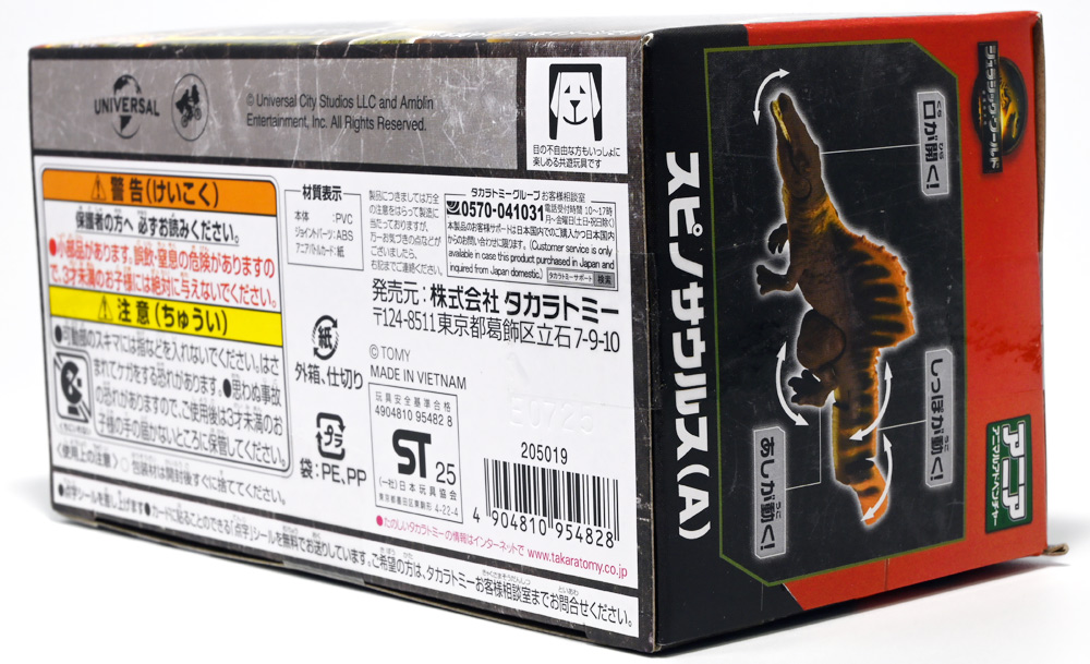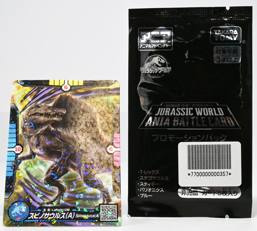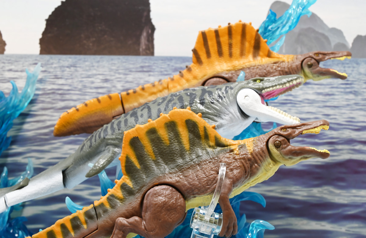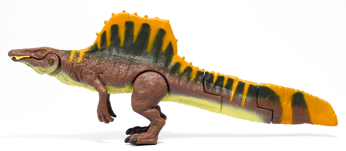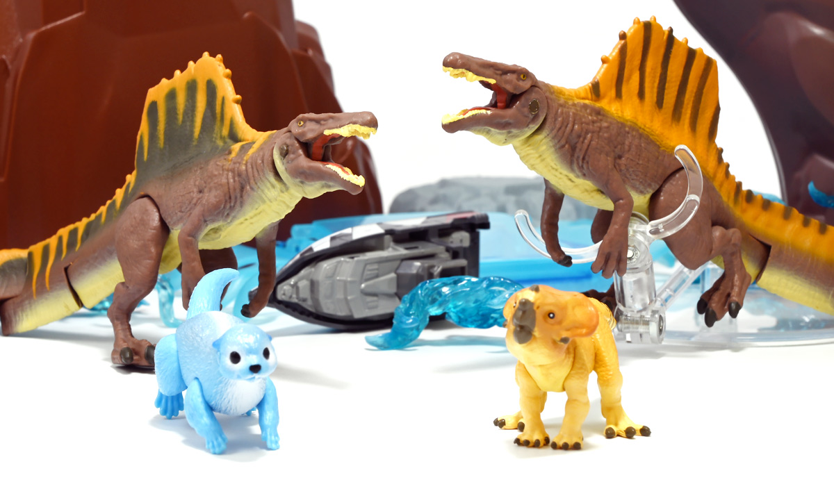 ■アニア ジュラシック・ワールド スピノサウルス(A) ![]() 2025年6月28日発売 / 1320円(税込) 2025年8月8日に国内で公開となった映画「ジュラシック・ワールド」最新作「復活の大地」より、 新デザインの「スピノサウルス」がアニアシリーズに堂々参戦ぞよ!! ![]() 「復活の大地」公開に合わせて本商品と同時発売で、 「T-レックス(復活の大地Ver.)」、「モササウルス」、「ティタノサウルス」、「ケツァルコアトルス」 の単品パッケージも登場していますが、これらは全て後続の「DXセット」に収録されています。 スピノサウルスは「海のモササウルス DXセット」にも収録されているけど、セット版は「Bカラー」となっており、 本商品の「Aカラー」とは彩色が異なるバリエーションぞよ。 つまり、全てのアニアを集めたいおろかなにんげんどもは、本商品と「DXセット」を買えば良いと言う事だ! ![]() 最新パッケージのジュラワアニアには「アニアバトルカード」が付属。 パッケージの窓から覗く事が出来るぞよ。 ![]() 口が開く! 尻尾が動く! あしが動く! ![]() おまけのバトルカード。 「スピノサウルス(A)」のキラバージョンが確定で入っています。 「DXセット」と単品パケでは封入カードが異なるので、 カードも全部コンプしたい人は全てのパッケージを重複して買わねばならんぞよ。 ![]() 玩具に入っているカードはキラキラ仕様なのです。 ほか、雑誌ふろくなどでは同じ絵柄だけどノーマル仕様でパラメーターが異なるものもある。 今回もまたまたプロモパック貰えちゃったぞよ! バトルゲームには枚数が必要なのでいっぱいプロモを貰ってデッキを増やしてねと言う事だろう。 ![]() それではパカっと開封! こちらの原型は既に「DXセット」のレビューで紹介済みだが・・・ 前述の通り背ビレの色が異なるカラーバリエーション。 「スピノサウルス」の「Aカラー」となっているぞよ! ![]() 後期白亜紀の北アフリカに生息していたとされるスピノサウルスは、 1912年にエジプトで発見され、1915年にドイツの古生物学者エルンスト・シュトローマーによって記載されたが、 第二次世界大戦で元の化石が破壊された為に長らく謎の巨大獣脚類であったぞよ。 その後、21世紀初頭に新たに化石が発掘され、近縁種も見つかり様々な事が判ってきた。 現在では「スピノサウルス・エジプティアクス」は全長14メートルと推定され、 陸生肉食動物で最大級の巨大獣脚類であり、 半水生の魚食性であったと考えられているぞよ。 ![]() スピノサウルスと言えば映画「ジュラシック・パーク3(2001)」の主役恐竜として二足歩行の怪獣然としたデザインで登場していたが、 「復活の大地」では水棲の新デザインで24年ぶりの映画再登場となった! これは最新研究に基づいた新復元・・・と言う訳では厳密には無く、 劇中ではサン・ユベール島の研究施設でスピノサウルスを元に作られた人造怪獣であり、 ゲノム編集によって本物のスピノサウルスよりも遊泳能力を向上させ、 完全水生となってモササウルスと共生関係を結ぶに至っているぞよ。 ![]() 勿論、元のスピノサウルスに則って特徴的な背中の帆は健在。 近年ではスピノサウルスの尾はイモリのような形だった事が判っており、 これは水中で推進力を得るのに便利だったとされている。 このような新たな学説も当然取り入れられているぞよ。 一方でこの新ジュラワスピノは首がずんぐりして短いぞよ。 スピノサウルスの首は長くS字を描く姿で復元される事が多いので、ここは最も目につく違和感である。 スピノサウルスはバンダイのプラモ「プラノサウルス」で古生物版と「ジュラシック・ワールド」版、 二つが発売されており、これは骨格形態を含むが、 二つは一部パーツを共有しながらも、首は新規造形されており、 ジュラワ版はやはり骨が短くなっているみたいぞよ。 恐らく水生適応能力が付与された結果骨格の形状が変わっていると言う事なのだろう。 ![]() 尤も、スピノサウルスの骨格は全ての骨が揃っているわけでは無く、 特に上半身、腕や頭から後ろ辺りで見つかっていない部位が多いので、 古生物学的に見てもその全貌はまだまだ謎に包まれているのだ。 ![]() トップ。 という事で最新学説には近づいたがやっぱり微妙に古生物的なイメージと異なるスピノぞよ。 この「復活の大地」には怪獣も出て来るが、 恐竜と呼ばれる者達も遺伝子改造を受けた人造恐竜でやはり怪獣然としたものばかりであった。 ![]() ボトム。 手と足には水かきもついています。 ![]() アニアはワンアクション付きの動物フィギュア! ジュラワスピノは口が開閉、足の付け根、尾が二か所でスイング可能! 大きくシルエットを変える事が出来るぞよ! ![]() 陸上モードで自立も可能だが、本商品は首と尾が水平になっており、 明らかに水中モードに基づく造形である。 こんな風に足を倒して遊泳ポーズが良く似合うぞよ!! ![]() 尾の横スイング構造もこういった左右に振るタイプの水生生物だと良く似合うぞ
