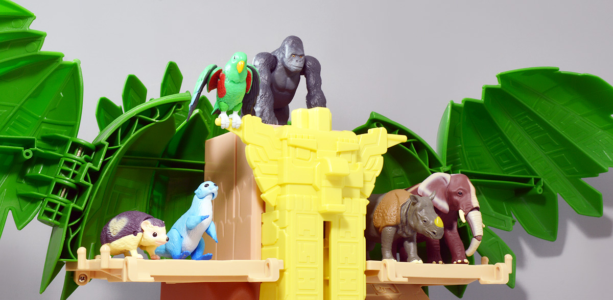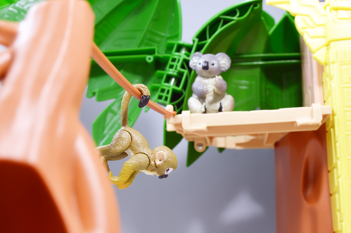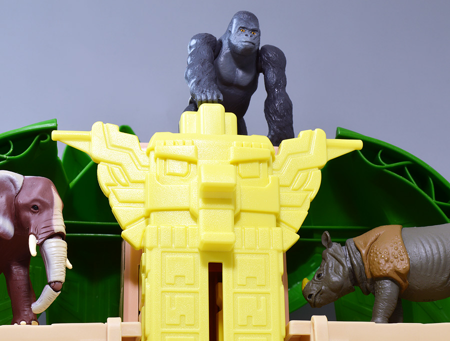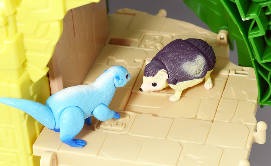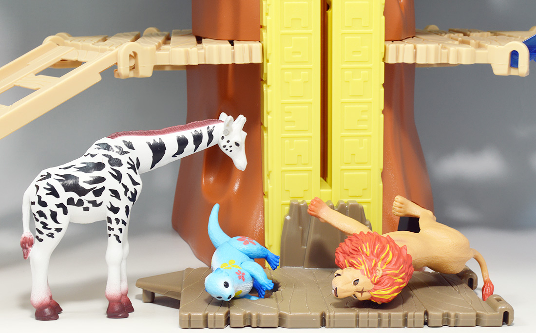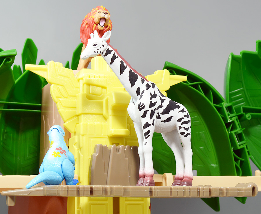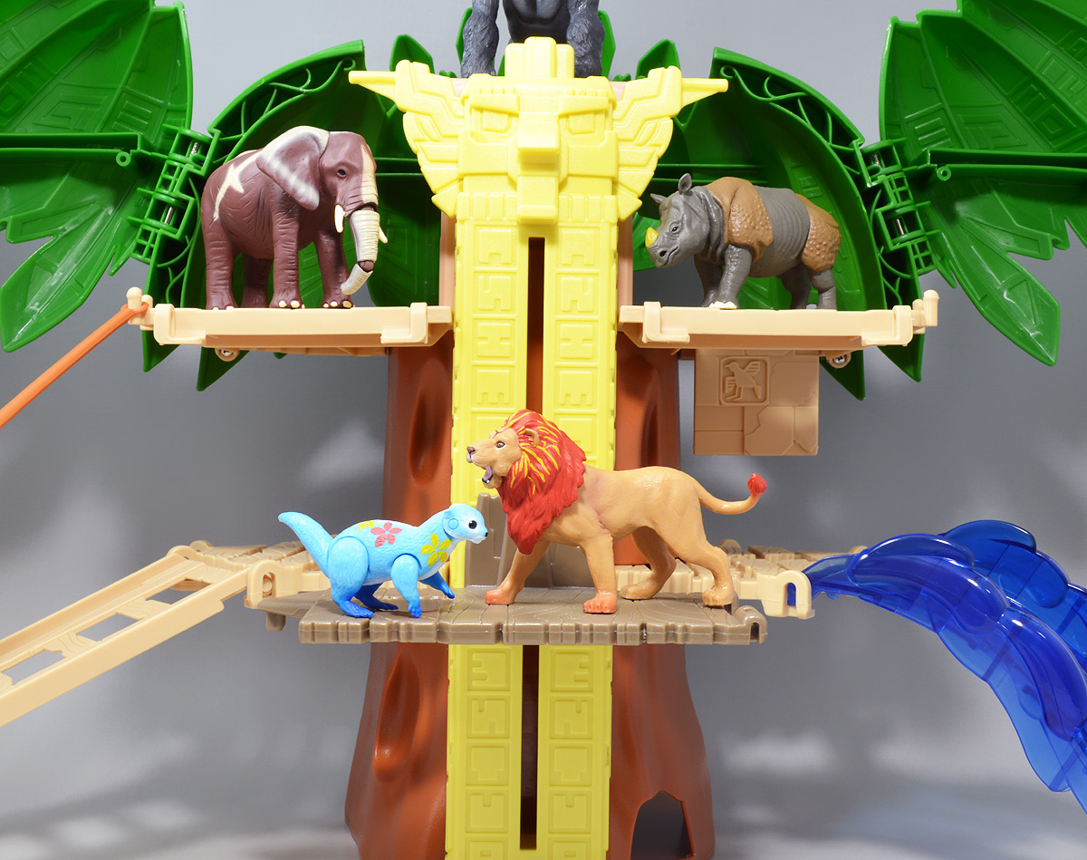 ■冒険大陸 アニアキングダム ジャイアントアクションツリー ![]() 2023年4月22日発売 / 6380円(税込) 実物アニアが登場する楽しいストップモーションアニメ 「冒険大陸 アニアキングダム」より、劇中に登場するジャイアントアクションツリーが 特大プレイセットとして登場ッ!! ![]() 惜しまれながらも完結を迎えたアニアキングダム・・・ 最早すべてが懐かしい・・・などと思い出になりつつあったこの2024年春・・・ッ!! 突如として第2期シリーズ「伝説のガーディアン編」の制作が発表・・・されたばかりか、 なんと夏には公開、玩具もいっぱい出ると言うではないか・・・! ってもうすぐじゃないかーっ!! インターネットでは既に新作アニメ版アニア6種の予約が開始されており、期待が高まるぞよ・・・!! ![]() まだまだ終わらないアニアキングダム・・・! こちらは第一期劇中にも登場したジャイアントアクションツリーのプレイセットぞよ。 10の遊びが搭載されたツリーに、ここでしか手に入らない限定アニアも入っており、 開封してすぐに遊べる仕様だ。 ![]() 結構早い段階で発売された動物サイドのプレイセットなのでパケは初期メンバーぞよ。 ![]() しかけいっぱい アニアたちの すみかだよ!! ![]() 内容一式。 説明書などは特になくパッケージが解説を兼ねている仕様だ。 ![]() 中身はビニールにくるまれているだけでほぼ完成品。 付属物を本体に装着すればすぐに遊べるぞよ。 ![]() 組み立てやシール貼りがなく開けてすぐ遊べるのはありがたい・・・ッ!! この辺はよりちびっ子向けのアニアシリーズならではの気配りでしょうか。 ポケモンプレイセットだとかなりシール大変ですからね・・・! ![]() それでは付属のアニアから見ていこう! こちらの「シルバ(ゴリラ)スペシャルVer.」は、このパッケージでのみ手に入る特別なアニアとなっているぞよ。 ![]() ゴリラの森に棲むゴリラ達のボス・シルバは、シルバーバックを背負った逞しい兄貴分。 かつてはカワウソ村の仲間として動物達にお節介を焼いて暮らしていたが、 ともすれば強引で身勝手になりがちな一面を疎まれ、裏切りを感じたシルバは村を去ってしまったぞよ。 ルッタ達が力を借りる為にゴリラの森へ出向いた時も、 初めはその過去を理由に協力を拒んだが、 ルッタ達の勇気に心を打たれ、最終的には村の動物達とも和解。 以後は頼もしい仲間として恐竜軍団との戦いでも大活躍したのだ!! ![]() 「誰かの為に必死になるお前に、オヤジさんと同じ・・・熱いものを感じたからな・・・!」 シルバはルッタのお父さんとも知り合いで、仲間になった際にはこの様な言葉でルッタの勇気を認めてくれた。 ひょっとしたらシルバのお節介焼きはルッタ父に憧れてのものだったのかもしれないぞよね! ![]() 造形は通常ラインの「AS-09 ゴリラ」の流用で、アニメ仕様となったカラバリぞよ。 オスのゴリラは13歳ごろになると、背中の体毛が銀色を帯びてくる。 黒いゴリラの群れの中でこの銀色が一際目立つ事で、オスの魅力をアピールする、 この体毛の事を「シルバーバック」というのだ! シルバはゴリラの森でもリーダーを任されるほどのイケメンなので、シルバーバックがより強調された彩色となっているぞよ。 ![]() ほか、腕にも模様が浮かんでおり、アニメ版として豪華な仕上がりとなっている。 ![]() 劇中でシルバは2種の造形が使い分けられており、 通常ラインにおける「通常版」、「ワイルドver」造形のどちらもアニメ劇中に登場している。 ワイルドverは主にドラミングなどのアクションシーンに用いられ、 その他多くのシーンではこちらの通常造形の方が主に使われている印象なので、 シルバといったらこっちの「スペシャルver」を思い浮かべるかもしれないぞよね! ![]() 大きなプレイセットも出してもらえ、アニア造形2種ともアニメに登場するとは、 シルバはアニキンの中でも優遇キャラなのです。 ![]() アニアはワンアクション付きの動物フィギュア! シルバは腕の付け根が軸アリボールジョイント可動、足が軸ロールとなっており、 このように立ち上がりポーズや・・・、 ![]() アクションポーズもつける事が可能!! この最小可動を使ってどのように活き活きとした画作りをするか。 これもストップモーションアニメ・アニアキングダムの面白味に繋がっているのだ! ![]() 「AS-36ゴリラ(ワイルドVer.)」を元にした単品版「シルバ」と並べて〜。 こちらは動きのついたドラミングポーズで、前述の通り2種とも劇中に登場しているぞよ。 ![]() こちらの通常ゴリラの造形は2023年の抽選式優待 「もうじゅっしゅうねん!! アニア10th記念猛獣セット」でもカラバリ収録されていたぞよね! こちらは明るいグレーの成型色で一般ゴリラといった趣です。 シルバーバックがないのでシルバの子分という想定で並べても楽しい。 ![]() 続いて本体となるジャイアントアクションツリーを見ていこう・・・! こちらはアニメに登場するゴリラの森に聳える巨木で、劇中ではフル塗