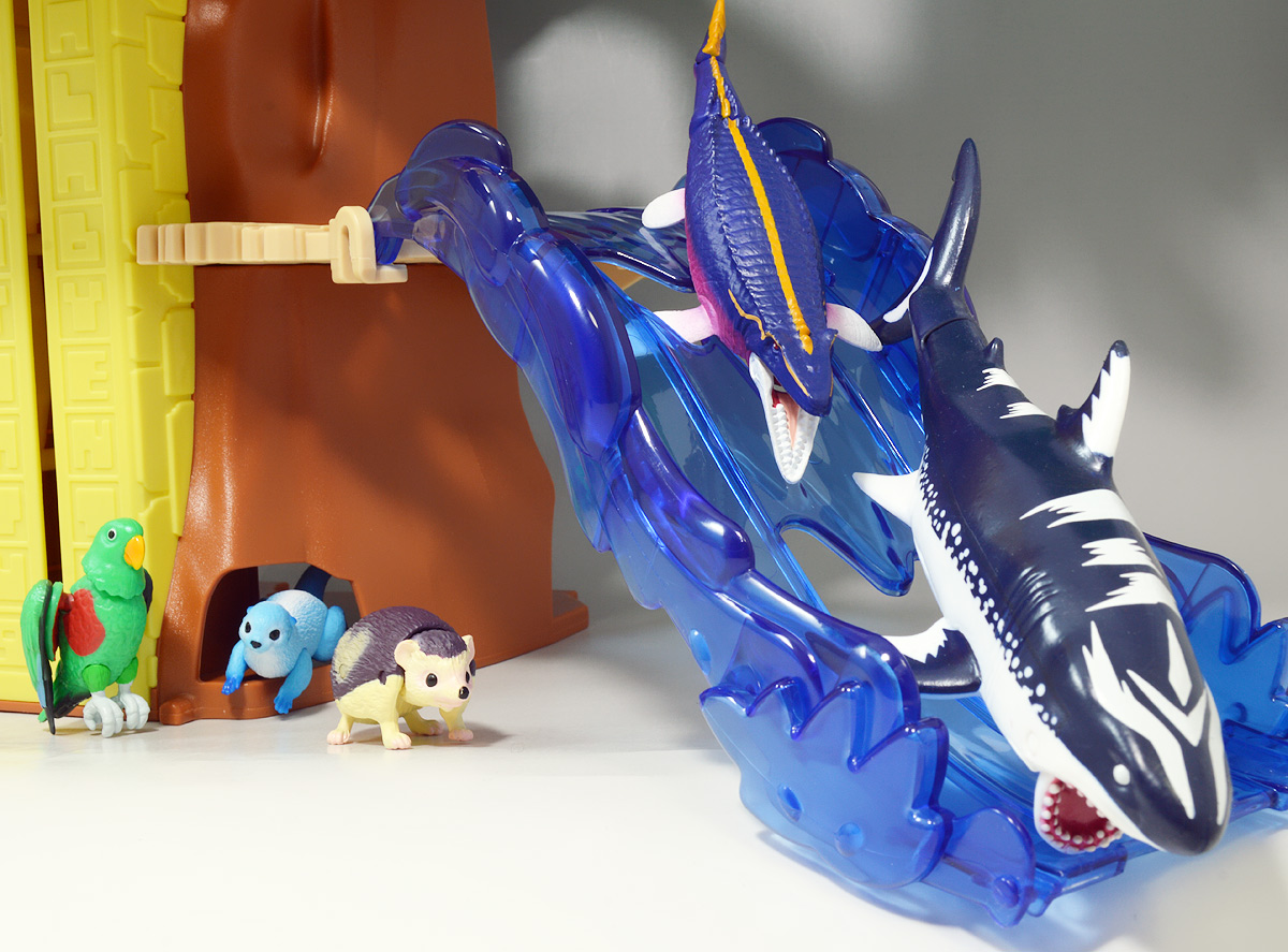 ■冒険大陸 アニアキングダム モーサ(モササウルス) ![]() 2023年9月14日発売 / 1045円(税込) 本物のアニア玩具が活躍するアニメ「アニアキングダム」より、恐竜軍団の新たなる刺客 モササウルスのモーサを徹底紹介するぞよっ!! ![]() みんな大好き・海の帝王モササウルス。 映画「ジュラシック・ワールド」における活躍により、首長竜の人気ポジションを奪い取っていった事でもお馴染みぞよね! 近年恐竜&古生物玩具と言ったら必ずラインナップされる人気者ぞよ! ![]() ヌーッハッハッハ! じまんの歯で かみつくぞ! ![]() 場面カットはVSアミンさん。 ストーリーも放送中のモーサ&ブラッキオ登場編になっていますね。 ![]() くちにいれない。 ![]() キャラクターカードが日本語と英語で二枚付属。 ヒレ&かみつき攻撃を得意とするモーサは、限界突破の攻撃数値6! こんな奴が恐竜軍団に加わっては、いよいよカワウソ村の水辺は支配されたも同然ぞよーっ!! ![]() モササウルスのモーサ。 青いボディに紫のグラデ、オレンジの差し色が美しいぞよ。 ![]() 恐竜族と動物族、最初の全面戦争では温存されていたモーサ&ブラッキオ。 いよいよカワウソ村への徹底攻撃が始まると言う局面で、ダーク・フレイムは遂にこの強力な二体を呼び出したっ!! 以前からちらちらと画面に映ってはいたが、第22話 「驚異!新たなる敵!」より本格登場し、 ルッタ達を脅かす脅威となったのだっ!! ![]() モササウルスと言えば、「恐竜科学博2023」に未記載種の新種モササウルスがやって来ていた事が記憶に新しいぞよね! 会場にいたモササウルスのウォーカーは11メートルほどの個体だったが、 最大種ではもっと巨大なものも存在したかもしれない・・・ 白亜紀後期の海に実在した、脅威の巨大怪獣ぞよーっ!! ![]() 「ふっふ・・・お前達動物どもの住処を根こそぎ奪ってやる・・・我ら恐竜による、一斉攻撃だっ!!」 モーサはこの様に侵略を宣言したが・・・ おろかなにんげんどもの皆さんもご存知の通り、 モササウルスは恐竜の二大分類である鳥盤類・竜盤類のどちらにも含まれない、別の生き物ぞよっ!! アニメや映画だと恐竜扱いされる事も多いけど、現生のトカゲやヘビに近縁な海生爬虫類なのです。 この事は番組のおまけコーナー「アニキンTV」でも解説されていましたね。 ![]() そんなワケでしばしば曖昧な分類でざっくり恐竜として扱われる事も多いモササウルス。 しかしこのようなアニメを入口に、古生物などへの興味を持つと言う事は人生を豊かにするうえでとても大事ぞよ! 少しでも気になり始めたちびっ子諸君はぜひ、近所の化石博物館や、 シーズンごとに開催される展示会に足を運んでみよう! 来年の春休みにはお台場で「オダイバ恐竜博覧会2024」が開催される予定なので、 わたくしも絶対行くつもりぞよっ! ![]() トップ。 アニアキングダムアニアは彩色が凝っているのも見所です。 モーサは鮮やかな体色にオレンジのラインがカッコいいぞよね! ![]() なかなか見た事の無い様な珍しいカラーリングとなっていて、これだけで嬉しい。 ![]() アニアはワンギミック付きの動物フィギュア! こちらのモササウルス・モーサは口が開閉する他、尾が二か所でスイングし表情を付ける事が可能。 ![]() これによって水中を泳ぐポーズを自在に取らせる事ができるのだーっ!! ![]() エンディングの新規カットで画面奥から泳いでくるシーンはもうお馴染みですね。 何気に口の中が複数色で塗られており細かい所まで豪華ぞよ。 ![]() アニアではモササウルスが複数発売されているぞよ。 こちらはジュラシックワールド版のモササウルスです。 並べるとモーサの方が小さいぞよね!? 実はこのモーサ、アニア通常ライン「AL-07 モササウルス(水に浮くVer.)」のカラバリ・・・ではなく、 ギフトセット「AA-04 激突!最強恐竜バトルセット」に収録されている、 一回り小さいタイプのモササウルス原型が使われているのだ! 「AL-07」は「ジュラワ」版よりももっとマッシブで大きいので、迫力を出すならそっちを使った方が良い様な気もするが、 謎のチョイスぞよ。 ![]() 「吾輩の自慢の歯で噛みちぎってくれようかーっ!!」 第22話で恐竜軍団に合流したモーサ、自信過剰な海の荒くれ者で、 同じく水中戦を得意とするスピンを追いかけまわしながらの登場! 水中から飛び出して尾をくねらせるシーンは、玩具のコマ撮りとは思えない程とても迫力があったぞよね!? さしものスピノサウルスも海に完全適応したモササウルスには敵わなかったのか、 スピンは壁に投げ飛ばされて伸びてしまったぞよ。 ![]() 続く第23話 「海の王者モーサあらわる!」ではカワウソ村の水辺に単独で襲来! 平和な動物達の暮らしが一変、阿鼻叫喚の地獄絵図に!! 逃げ遅れたペンギン親子が食べられちゃう・・・と思ったその時!? ![]() カワウソ村の仲間達が到着! しかし水辺の戦いに不慣れなサイラスは瞬殺、ぶち切れアミンさんが鋭い蹴りを浴びせるも やはり敵わず万事休すか・・・と思われた時、勇