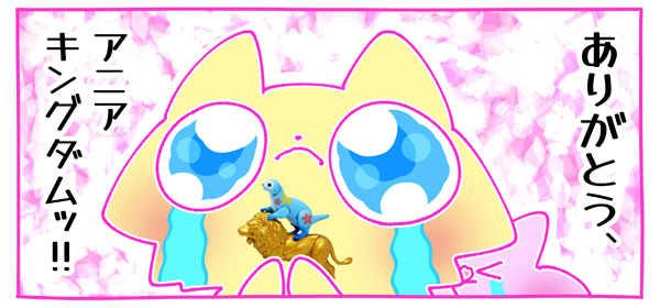 ■冒険大陸 アニアキングダム アニアのたまご ![]() 2023年12月27日発売 / ひとつ550円(税込) 2023年12月24日放送の第39話「大すき!アニアキングダム!」をもって、大団円の最終回を迎えたアニアキングダム・・・ッ! 現在(2024年1月)はテレビでセレクション放送が続く本シリーズの最終商品として登場したのがこの「アニアのたまご」ぞよ! ![]() 恐竜軍団の子ども時代フィギュア全6種がランダム封入された手掴みブラインドカプセル販売だ! たまご型カプセルにラベルが巻いてあり、たまごは玩具売り場で選んで購入する事ができるぞよ。 ![]() トップに穴が開いていて一見選べそうですが、中身は白い袋に包まれているので判別は出来ません。 ぐぬぬぬぬ・・・。 ![]() ぱかっと開封。 ![]() 中に入っているミニブック。 ひとつ550円、ボックスは12個入り6600円と公式ページにあるのだが・・・なんとタカトミモールでは単品購入しか出来なかった・・・ッ! 今回わたくしはストレートコンプ狙いで6玉購入したぞよ。 ボックス12個入りと言う事は箱に2セット封入、もしモールスタッフが気を利かせて同じ箱から規則的に抜いて発送してくれたなら容易にコンプ可能な筈だ! そしてまた、仮にダブってもこの理屈だと2個以上はダブらないだろう・・・頼んだぞ、タカトミモール・・・ッ ストレートコンプたのむぞよーっ!! ![]() じゃん! ・・・まぁそうですよね・・・すべての客が6個ずつ頼む訳ではないのでズレますわな。 お、おい〜・・・しかも一番欲しかったフレイムとブラッキオを逃してしまったぞよ〜っ! どうせモールでは4割引きなんだからもっといっぱい買えば良かったのだーっ! しかし2個以上ダブらなかったのは狙い通りと言えるだろう。 おろかなにんげぇん・・・! お店に行くたびにアニアの卵を摘んで、毎回同じキャラを引き当てている者、いるぞよね? お主は恐らく無意識に同じ列の同じ場所から卵を引いているのだ! アニアのたまごを集める時は、箱に3×4で並んだ卵を手前から横に二列6個を抜くか、 毎回べつべつの位置の卵を引けばコンプできるはずぞよ! 勿論ボックスがまぜまぜされていたらこの技は使えないから注意するのだぞ!! ![]() それでは気を取り直して中身を見ていきましょう・・・! まずはトリケラトプスのトリーの子ども時代フィギュアぞよ! お〜・・・! これはかなり子どもっぽいトリケラトプスだぞ! ![]() アニアキングダムは本物のアニア玩具を撮影に使ったストップモーションコマドリアニメ。 こちらの子供人形も劇中に登場しており、子トリーは第24話「ゴリラの森の大決戦」の回想より登場。 まだ幼く素直だったフレイムとは仲良しコンビだったのです。 ![]() 実質550円ガチャだけど、タカトミモールや玩具売り場で買えるので割引が利くのはでかい・・・! しかし次弾があれば次はモールでボックス版も売って欲しいぞよよよよ・・・。 ![]() 続いてこちらは子供時代のゴッツ! まだ皮骨の発達が未熟な幼アンキロサウルスぞよ! ![]() フレイム、トリーらの子供時代は回想でちらほら登場していましたが、 残りの子供恐竜らは10月29日放送の第31話「プテイラは恐竜パパ!」にて総登場! 恐竜軍団の誕生から子供時代の関係が明らかになったぞよ。 10月末アニメ登場の玩具の発売が本編終了後のクリスマス後って事でかなりじらされましたね〜。 ![]() 氷河戦士、アニアのたまごは番組後期アイテムで、タカトミモールでは既に在庫切れ・・・ セレクション放送が続いているとはいえ、特に予約で終了してしまったアニアのたまごは再出荷があるかわからない。 この辺のグッズは後々レアになるかもしれないぞよ。 ![]() 子供を育てるのが大好きなプテイラは、取り残された恐竜の卵を保護する事にも熱心だった。 ある日見つけた2つの卵を巣に持ち帰り、君達はこれから兄弟だと優しく声をかけ温め始める・・・ そこから生れたのがティラノサウルスのフレイムと、トリケラトプスのトリーだった! 後に信念の違いから戦う事となった二体も、子供の頃は正に兄弟の関係だったのです。 ![]() ゴッツはそんな二匹に続く三匹目に生まれてきた赤ちゃん恐竜。 フレイムとトリーの弟分ぞよね! それからもプテイラは後に恐竜軍団となる卵を続々拾ってきたぞよ。 ![]() ごくミニサイズのフィギュアだが結構ディテールがしっかりしており、彩色も綺麗。 劇中に使われたアニメ人形そのままの赤ちゃん恐竜が手に入る画期的なアイテムなのだ。 ![]() おしり。 ![]() たまごから産まれた赤ちゃん恐竜とは言えそこはアニア・・・! 本家さながらの可動域を備え、トリーの場合は首がボールジョイント可動する他、尻尾も上下にスイングできるぞよ。 ![]() こんな風に首を傾げる事も可能だ。 ![]() 本来ゴミになってしまうカプセルにも、卵風のモールドが彫られており、 まさにアニアの卵としてフィギュアと一緒に遊べるアイテムになっている! と言う事でこのカプセルも捨てずにとっておきましょう! ![]() ゴッツの可動ポイントは首