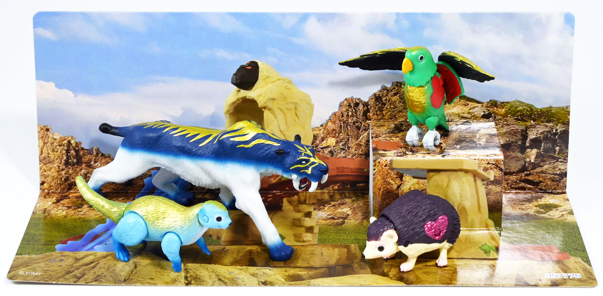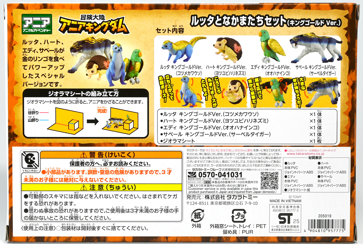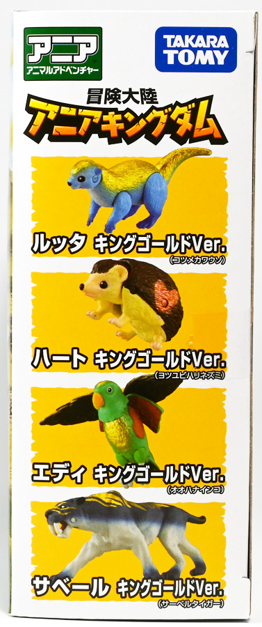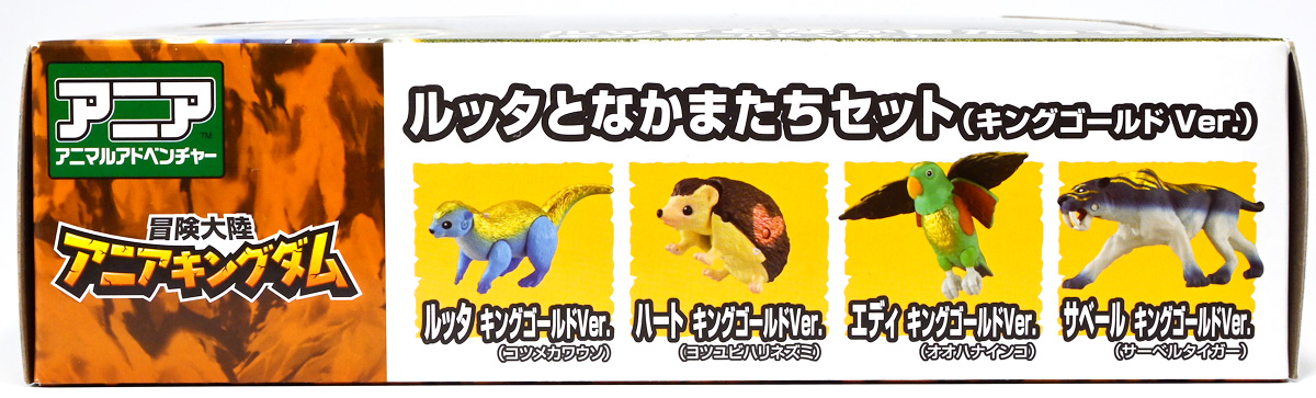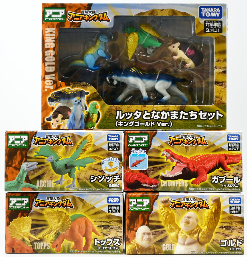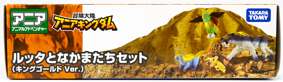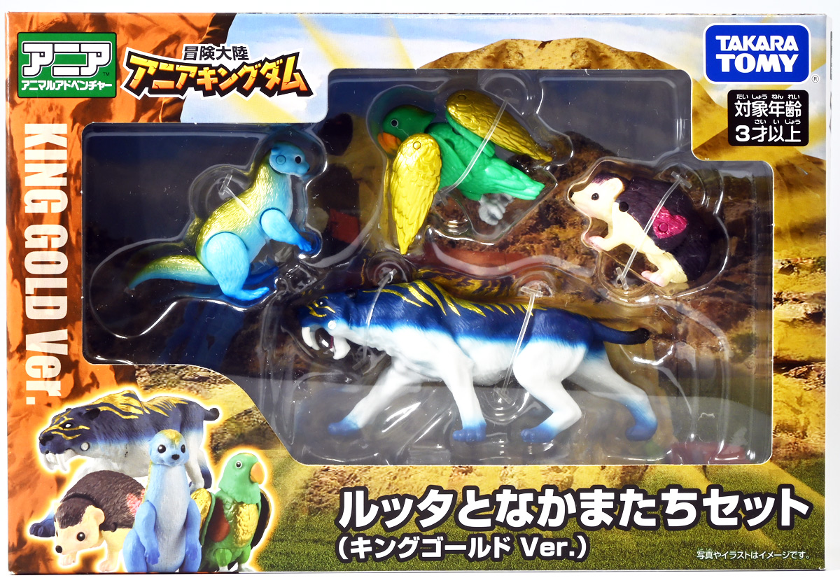 ■冒険大陸 アニアキングダム ルッタとなかまたちセット(キングゴールドVer.) ![]() 2025年10月2日発売 / 2200円(税込) ほんもの玩具がストップモーションで動きまくる大人気アニメ「アニアキングダム」! 第二期「伝説のガーディアン編」に続き、 この2025年9月27日より第三期新シリーズ「キングゴールドマウンテン編」が配信開始! 合わせて劇中登場のアニア達がそのまま玩具として発売しているぞよ! ![]() 玩具も一挙新登場! しているが、わたくしは送料合わせで半分ずつに分けてポチったぞよ。 ![]() この「ルッタとなかまたちセット」は新シリーズに合わせたギフトセットの一つ。 なかよしトリオの新カラバリがまるっと手に入るぞよ。 ![]() もう終わりかと思えば突如再開。 「アニアキングダム」は急に新シリーズが始まるから気を抜けないのだ・・・! ![]() ![]() 今回のシーズンでは動物達をパワーアップする謎の果物 「金のリンゴ」を得る為にルッタ達がキングゴールドマウンテンに挑み、 奮闘すると言う内容となっているぞよ。 ![]() ルッタ、ハート、エディ、そしてサベールの「キングゴールドver」に加えて ジオラマシートも封入されている。 ![]() パカっと開封! ブリスターに収まっています。 ![]() まずは我らがルッタの新カラバリ・・・! 「ルッタ キングゴールドver.(コツメカワウソ)」 なんと金のリンゴを食べてゴールデンにパワーアップしているぞよ!! ![]() トップ。 背中側が金ピカに! ちびっ子は金ピカが好きぞよからな〜。 ![]() ボトム。 基本仕様は通常ルッタと変わらず。 彩色が一色増えているので豪華ぞよ。 このカラーはルッタの「アニアキングダムを守れるように強くなりたい!」と言う意志の表れぞよ。 ![]() 続いてエディの新カラー、 「エディ キングゴールドver.(オオハナインコ)」 こちらも胸と羽が金ピカになりました。 ![]() 劇中ではこのパワーアップを齎す金のリンゴを求めてルッタ達が奮闘する訳だけど、 最終話の変身に先駆けて、ルッタ達がどんなパワーアップを果たすのか、 その想像図、妄想として第2話でこれらのフィギュアが登場しているぞよ。 ![]() エディ曰く「賢さをパワーアップ」しているとの事。 原型は過去のなかよしトリオと共通なのでギミックもそのまま受け継いでいるぞよ。 ![]() そして 「ハート キングゴールドver.(ヨツユビハリネズミ)」 紅一点のハートだけ他と仕様がやや異なる。 ![]() キングゴールドverと題しながらパワーアップは側面のハートマークがメタリックピンクになった点。 ハートによれば「かわいさをパワーアップ」しているらしいぞよ。 ![]() ボトム。 全て「G25」の印字がある為2025年製と見分ける事が出来るぞよ。 ![]() カワウソ村のなかよしトリオが金のリンゴを食べてパワーアップ! キングゴールドverで三度登場ぞよ!! ![]() 劇中に出てくるフィギュアがそっくりそのまま玩具になった! 人形劇の人形をそのまま売っちゃえば良いじゃんとはシンプルかつ合理的なアイディア。 2023年の開始からシーズンを重ねて3年目・・・! 始まった頃はまさかこんなに続くとは思わなかったぞよね!? ![]() そしてアニメが終わったら絶対コツメカワウソ、ヨツユビハリネズミ、オオハナインコの動物カラーが出ると思っていたが、 アニメカラバリが増えて普通のカラーがまだ出ていないのも意外な展開!! 可愛いから良いけどね! ![]() 仲良しトリオおしり。 ![]() アニアはワンギミック付きの動物フィギュア! これら三体は過去のバリエーションとギミックを共通しており、 ルッタは頭、四肢、尾が簡易可動。 エディは頭のロールに加えて翼が展開可能。 ハートはくるんと丸まるギミックを搭載しているぞよ。 ![]() ポーズを付けて並べれば「本物」の写真が撮れちゃうぞよ!! キミのお部屋が「アニアキングダム」に早変わりだ!! ![]() そして本パッケージにはもう一つ、 「サベール キングゴールドver(サーベルタイガー)」も封入されています。 ![]() 元は太古の時代から復活した氷河戦士の一人として 現アニアキングダムの支配を目論んだサベールも、すっかり絆されてカワウソ村の仲間になったぞよ。 「キングゴールドマウンテン編」では一話からこのパワーアップ状態で登場。 「きんきら金のキーン!」とご機嫌にバナナの皮の山の裏から現れた。 ![]() 何を隠そう、カワウソ村にパワーアップの金のリンゴを齎した者こそ、 金ピカになったスピンとサベールなのだ! その秘めたる力を見せつけるように、 サベールは強化されたジャンプ力(と運の悪さ・・・)をみんなに披露してみせた! これを見てフレイムは「強みと弱みを同時に伸ばす禁断の果実」であると分析しているぞよ。 ![]() サベールとスピンのパワーアップを見て、ルッタ達は金のリンゴが欲しくて欲しくてたまらなくなる! しかし残っているリンゴはたった一つ・・・。 レースでルッタがゲットするも、空腹で倒れているラベンダに譲ってしまうぞよ。 そう、バナナの皮の山は全てラベンダ一人で築いたものだったのだ! ラ