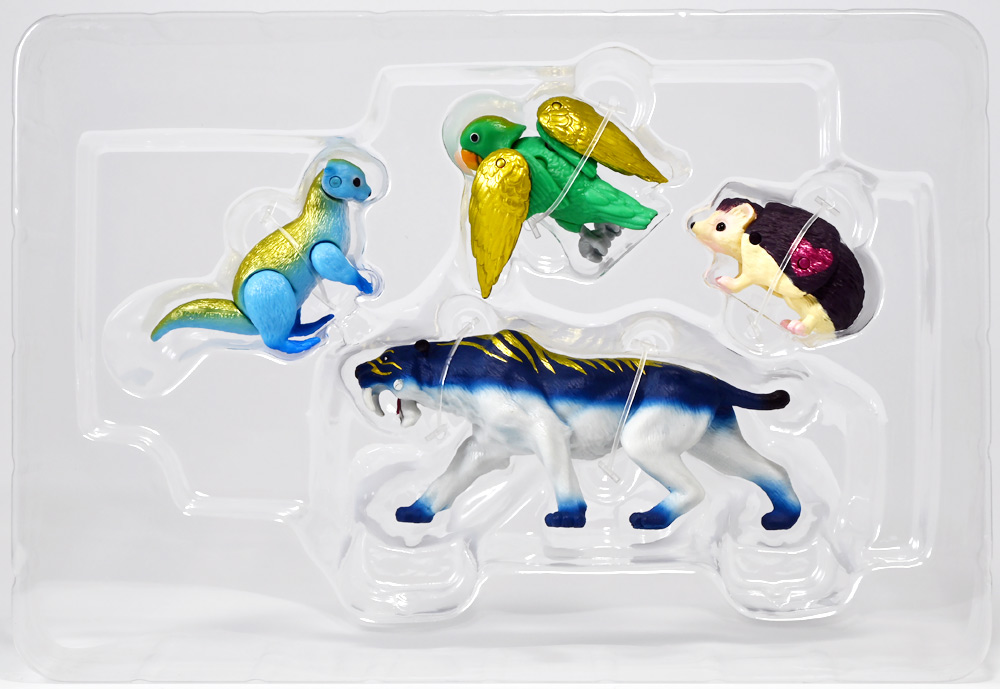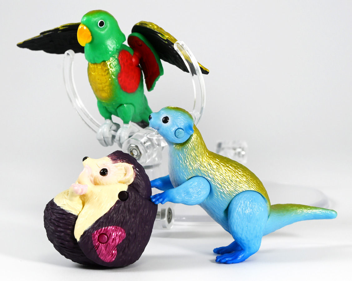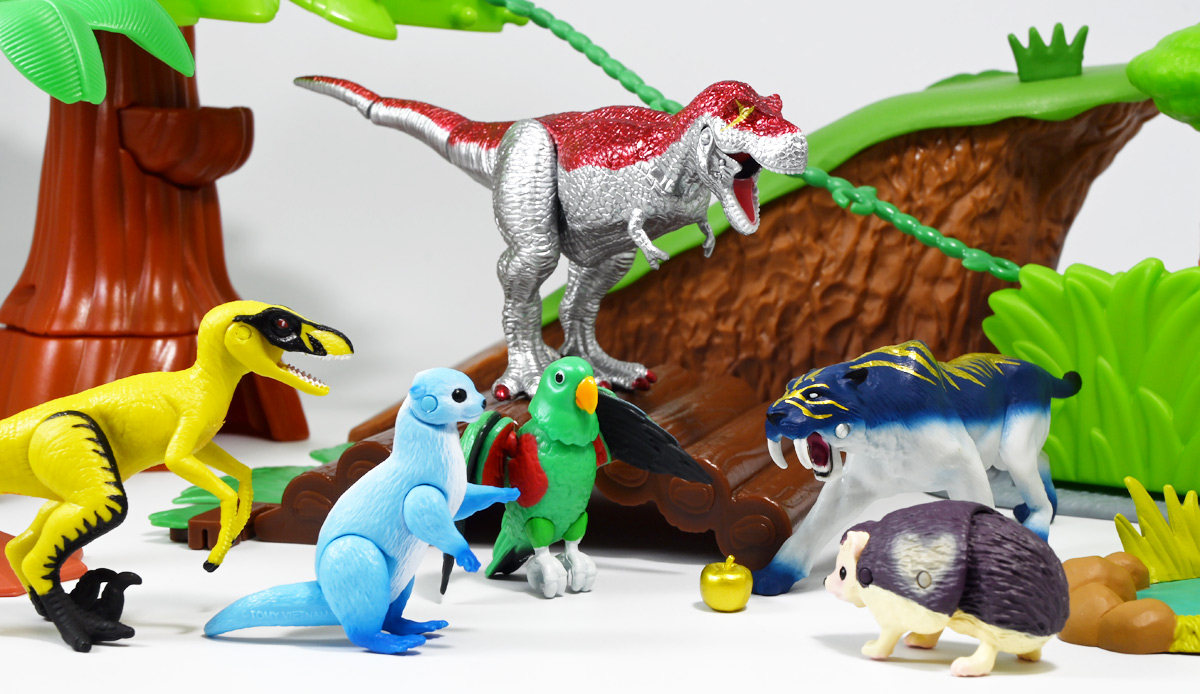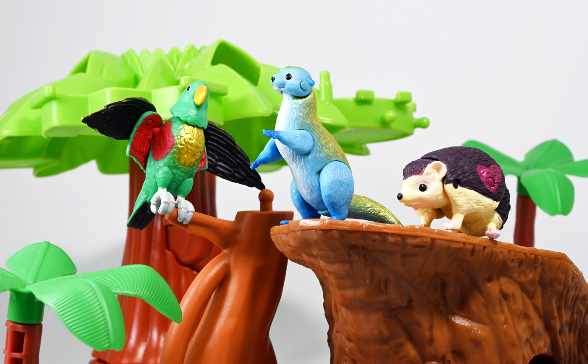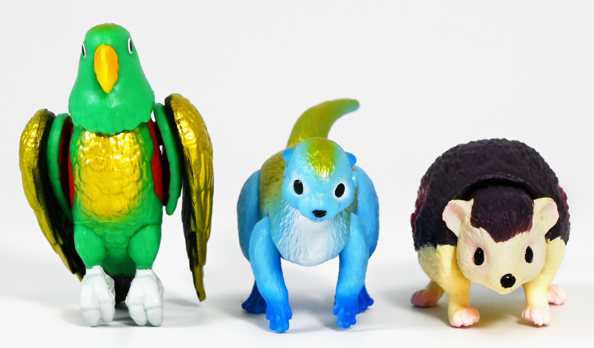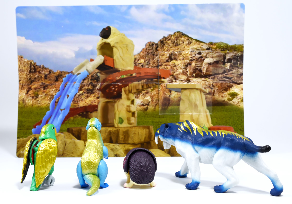 ■冒険大陸 アニアキングダム ルッタとなかまたちセット(キングゴールドVer.) ![]() 2025年10月2日発売 / 2200円(税込) ほんもの玩具がストップモーションで動きまくる大人気アニメ「アニアキングダム」! 第二期「伝説のガーディアン編」に続き、 この2025年9月27日より第三期新シリーズ「キングゴールドマウンテン編」が配信開始! 合わせて劇中登場のアニア達がそのまま玩具として発売しているぞよ! ![]() 玩具も一挙新登場! しているが、わたくしは送料合わせで半分ずつに分けてポチったぞよ。 ![]() この「ルッタとなかまたちセット」は新シリーズに合わせたギフトセットの一つ。 なかよしトリオの新カラバリがまるっと手に入るぞよ。 ![]() もう終わりかと思えば突如再開。 「アニアキングダム」は急に新シリーズが始まるから気を抜けないのだ・・・! ![]() ![]() 今回のシーズンでは動物達をパワーアップする謎の果物 「金のリンゴ」を得る為にルッタ達がキングゴールドマウンテンに挑み、 奮闘すると言う内容となっているぞよ。 ![]() ルッタ、ハート、エディ、そしてサベールの「キングゴールドver」に加えて ジオラマシートも封入されている。 ![]() パカっと開封! ブリスターに収まっています。 ![]() まずは我らがルッタの新カラバリ・・・! 「ルッタ キングゴールドver.(コツメカワウソ)」 なんと金のリンゴを食べてゴールデンにパワーアップしているぞよ!! ![]() トップ。 背中側が金ピカに! ちびっ子は金ピカが好きぞよからな〜。 ![]() ボトム。 基本仕様は通常ルッタと変わらず。 彩色が一色増えているので豪華ぞよ。 このカラーはルッタの「アニアキングダムを守れるように強くなりたい!」と言う意志の表れぞよ。 ![]() 続いてエディの新カラー、 「エディ キングゴールドver.(オオハナインコ)」 こちらも胸と羽が金ピカになりました。 ![]() 劇中ではこのパワーアップを齎す金のリンゴを求めてルッタ達が奮闘する訳だけど、 最終話の変身に先駆けて、ルッタ達がどんなパワーアップを果たすのか、 その想像図、妄想として第2話でこれらのフィギュアが登場しているぞよ。 ![]() エディ曰く「賢さをパワーアップ」しているとの事。 原型は過去のなかよしトリオと共通なのでギミックもそのまま受け継いでいるぞよ。 ![]() そして 「ハート キングゴールドver.(ヨツユビハリネズミ)」 紅一点のハートだけ他と仕様がやや異なる。 ![]() キングゴールドverと題しながらパワーアップは側面のハートマークがメタリックピンクになった点。 ハートによれば「かわいさをパワーアップ」しているらしいぞよ。 ![]() ボトム。 全て「G25」の印字がある為2025年製と見分ける事が出来るぞよ。 ![]() カワウソ村のなかよしトリオが金のリンゴを食べてパワーアップ! キングゴールドverで三度登場ぞよ!! ![]() 劇中に出てくるフィギュアがそっくりそのまま玩具になった! 人形劇の人形をそのまま売っちゃえば良いじゃんとはシンプルかつ合理的なアイディア。 2023年の開始からシーズンを重ねて3年目・・・! 始まった頃はまさかこんなに続くとは思わなかったぞよね!? ![]() そしてアニメが終わったら絶対コツメカワウソ、ヨツユビハリネズミ、オオハナインコの動物カラーが出ると思っていたが、 アニメカラバリが増えて普通のカラーがまだ出ていないのも意外な展開!! 可愛いから良いけどね! ![]() 仲良しトリオおしり。 ![]() アニアはワンギミック付きの動物フィギュア! これら三体は過去のバリエーションとギミックを共通しており、 ルッタは頭、四肢、尾が簡易可動。 エディは頭のロールに加えて翼が展開可能。 ハートはくるんと丸まるギミックを搭載しているぞよ。 ![]() ポーズを付けて並べれば「本物」の写真が撮れちゃうぞよ!! キミのお部屋が「アニアキングダム」に早変わりだ!! ![]() そして本パッケージにはもう一つ、 「サベール キングゴールドver(サーベルタイガー)」も封入されています。 ![]() 元は太古の時代から復活した氷河戦士の一人として 現アニアキングダムの支配を目論んだサベールも、すっかり絆されてカワウソ村の仲間になったぞよ。 「キングゴールドマウンテン編」では一話からこのパワーアップ状態で登場。 「きんきら金のキーン!」とご機嫌にバナナの皮の山の裏から現れた。 ![]() 何を隠そう、カワウソ村にパワーアップの金のリンゴを齎した者こそ、 金ピカになったスピンとサベールなのだ! その秘めたる力を見せつけるように、 サベールは強化されたジャンプ力(と運の悪さ・・・)をみんなに披露してみせた! これを見てフレイムは「強みと弱みを同時に伸ばす禁断の果実」であると分析しているぞよ。 ![]() サベールとスピンのパワーアップを見て、ルッタ達は金のリンゴが欲しくて欲しくてたまらなくなる! しかし残っているリンゴはたった一つ・・・。 レースでルッタがゲットするも、空腹で倒れているラベンダに譲ってしまうぞよ。 そう、バナナの皮の山は全てラベンダ一人で築いたものだったのだ! ラ
