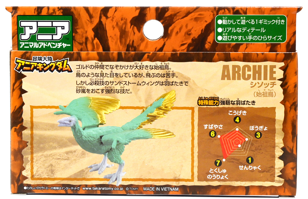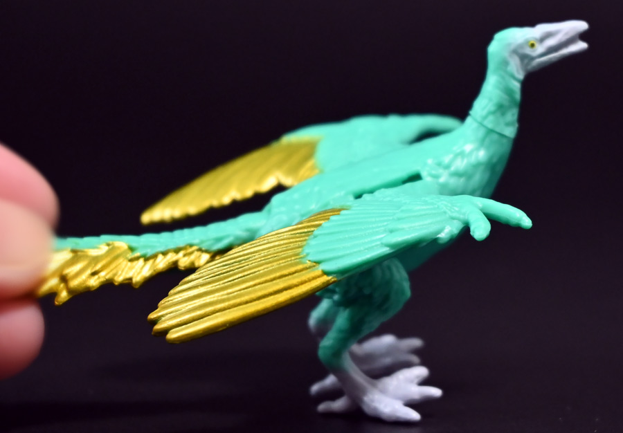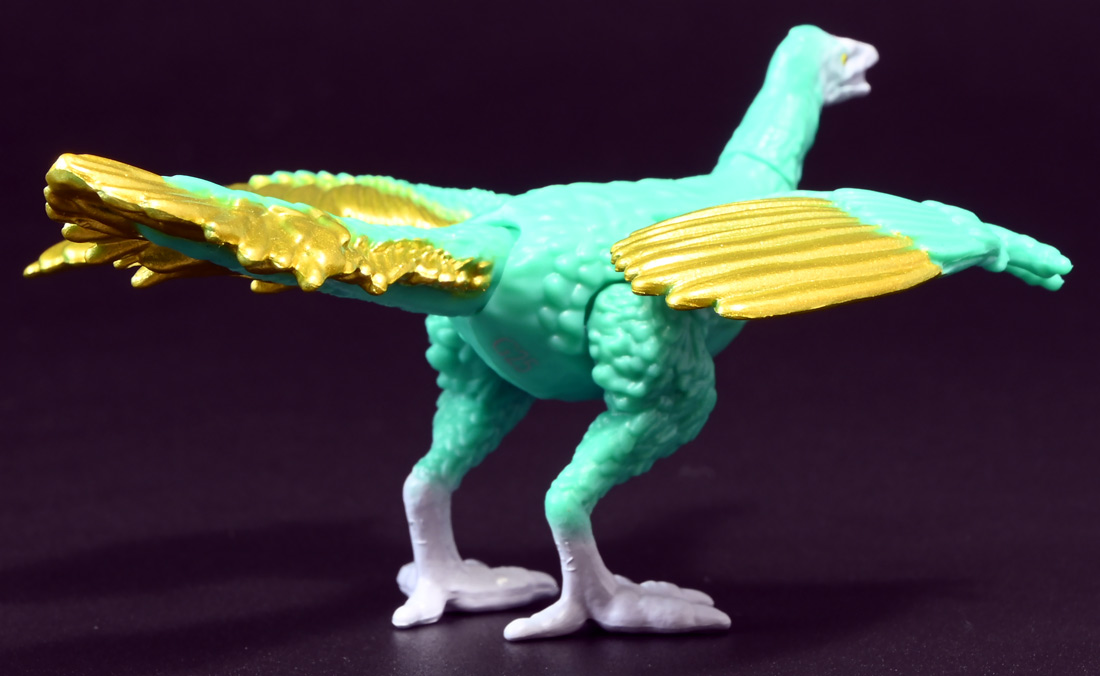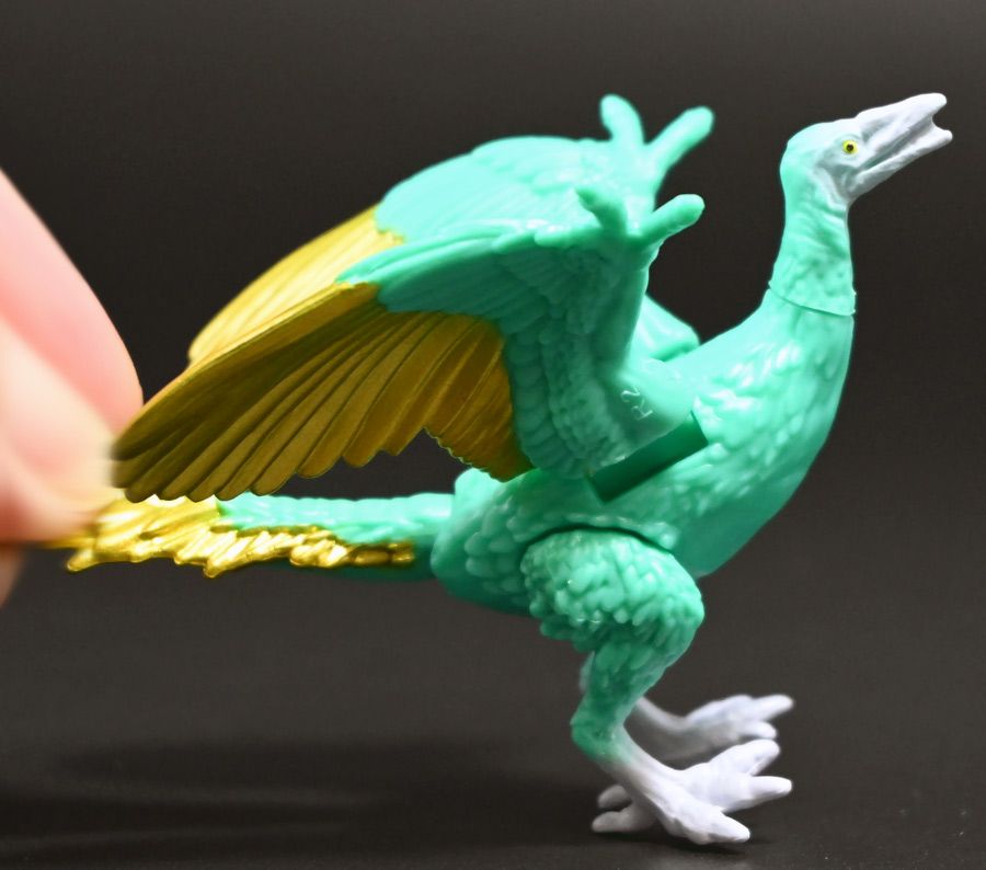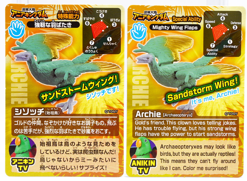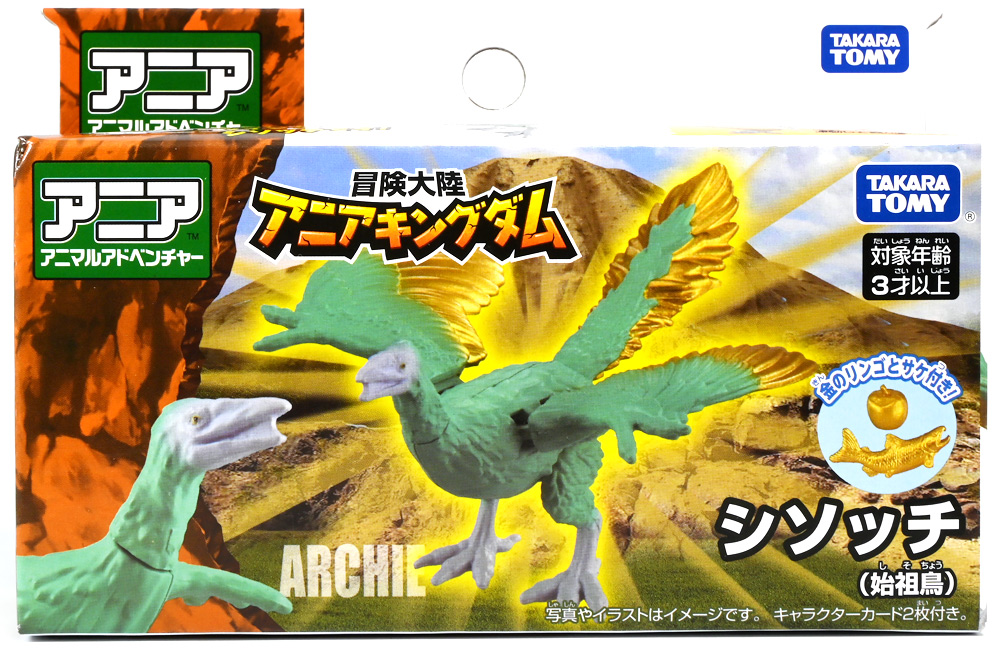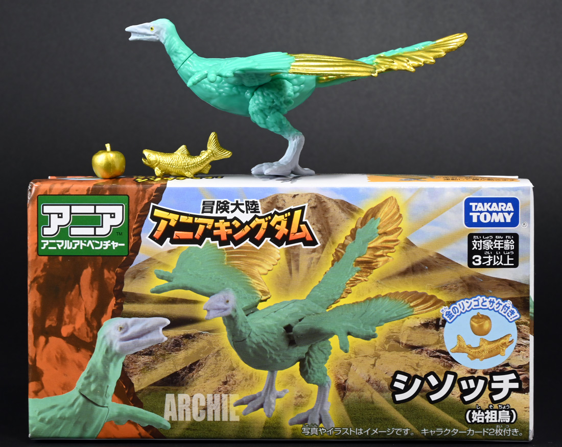 ■冒険大陸 アニアキングダム シソッチ(始祖鳥) ![]() 2025年10月2日発売 / 1045円(税込) キングゴールドトリオの一角、技のシソッチが本物アニアで登場! このパッケージにはアニメの重要アイテム、「金のリンゴ」が付属するので見逃せないパケとなっているぞよ! ![]() 始祖鳥初のカラバリはこりゃまた派手派手なヤツとなった! なかなか黒い始祖鳥が出ないぞよな〜。 ![]() サンドストームウィング! シソッチです! ![]() くちにいれない! ![]() 付属のキャラクターカードは日本語と英語で二枚付属。 玩具を通じて言葉も学べる仕様となっている! やはりとくしゅのうりょくが限界突破の数値7となっているぞよ! ![]() 足が繊細なので保護材で包まれて入っています。 慎重に開封するぞよよ! 金のリンゴと金のサケは小さいパーツなので紛失注意ぞよ! ![]() キングゴールドトリオのリーダー・ゴルドがキングゴールドマウンテンを侵す者への刺客として、 ガブールと共に放ったのがこのシソッチであるぞよ! 二つ名は「技のシソッチ」だが、せっかくの練習も身につかず、 うっかり者のシソッチは毎回口上を忘れて なぞかけを始めるので、ガブールはがっかりしてしまうのだった! ![]() エメラルドグリーンの羽毛に金の差し色が光るシソッチ! これも恐らく金のリンゴの力でパワーアップした始祖鳥だと考えられるぞよね! うっかり者かと思いきやかなりの実力で、 必殺技のサウンドストームウィングによってラプルの視界を奪い有利を取るという戦いも見せた! 流石は技のシソッチぞよ! ![]() 一応繊細な足は保護されて封入されているのだが、 付け根がやや軟らかいので、開封時はふにゃっと曲がっていてバランスが悪くなっている可能性がある。 自立しない場合はドライヤーなどで簡単に矯正してやると良いだろう! ちびっ子は火傷しないようにお父さんお母さんに手伝って貰うぞよよ! ![]() さて・・・本パケのキャラクターカードにも記載があり、 第6話の「アニキンTV」でも解説されていたが・・・、 「始祖鳥は鳥のような見た目だが、実は爬虫類の仲間。鳥じゃないから飛べなかった」 という解説。 確かに始祖鳥を一口に説明するのは難しいかもしれないが、こりゃちょっと誤りなんじゃないかとわたくしは感じましたぞよ。 まず、おろかなにんげんどももご存知の通り、 恐竜が進化したものが現生で数多見られる鳥類であるぞよ。 現代の分類によれば、鳥は竜盤類獣脚類恐竜の一種であり、 グラデーションを成して少しずつ進化してきた恐竜と鳥をはっきり区別する事は難しい。 鳥が恐竜であると言う事はつまり、最も進化した爬虫類であると言う事を示している。 鳥は爬虫類の仲間なのだ! 始祖鳥は鳥と恐竜の関連性が初めて指摘された種であり、様々な共通点が見られる。 そして飛べなかったかと言うと、これがよく判らない。 恐らく滑空を利用したと考えられるが、羽ばたいて自由に飛べたとは考えにくい・・・という塩梅ぞよ。 空を自由に飛んで利用する動物には、昆虫やコウモリなどの哺乳類もいる。 飛べる事と、鳥である事、爬虫類である事は、直接関係しない。 鳥が爬虫類の仲間って事は、エディも広義の爬虫類ってことぞよ。 以上の事から「アニアキングダム」の説明はやや正確とは言い難い訳ぞよ。 ![]() わたくしは以前から感じていたが、「アニアキングダム」の恐竜解説はかなり古い学説を含んでおり、 現代では間違いと言われる事も多い。 また、福井県立恐竜博物館の監修がついているもの以外の「アニア」玩具に関しても同様である。 特に始祖鳥は、通常ラインで本来は黒かったとされているものがキジをモチーフとした彩色で登場しており、 なぜこう言った独自の解釈を採用するのかやや疑問が残るぞよ。 動物のアニメや玩具はちびっ子に多大な影響を与えるからして、 正確である事に越したことはない・・・! 例えば映画や玩具では翼竜もモササウルスも恐竜として扱われているが、 これは間口を広げる役割があるから良いとされている。 この事にいちいち突っ込んで、知識をひけらかすのは無粋であるぞよ。 しかし、商品を世に送り出す側はこれに甘んじ、学びを捨ててはならんとわたくしは考えます。 今回の始祖鳥の解説も、ニュアンスは判らないでもないが、もう少し相応しい説明があったと思えるぞよね! ま〜わたくしも別にこの事をちびっ子にいちいち説いて回ろうとは思わん。 しかしわざわざインターネットの僻地にやってきて 長いレビューを読んでいるおろかなにんげんどもには共感が得られると考え、 ここでは無粋にも突っ込ませていただいたぞよ! ![]() 確かに小学校で「鳥は爬虫類の一種ですよ!」と先生に異議を申せば、 「鳥は鳥類で、爬虫類ではありません!」と叱られる事でしょう。 ホントの事と、世間で知られている常識には乖離があるのだ。 とりわけ動物の分類って難しいぞよよ〜! ![]() この対向する趾も最新の学説からすると主流では無い復元ぞよ。 たぶんこの復元