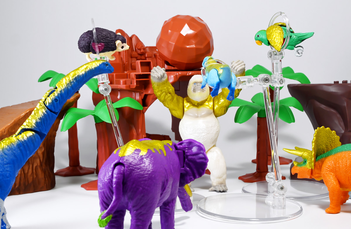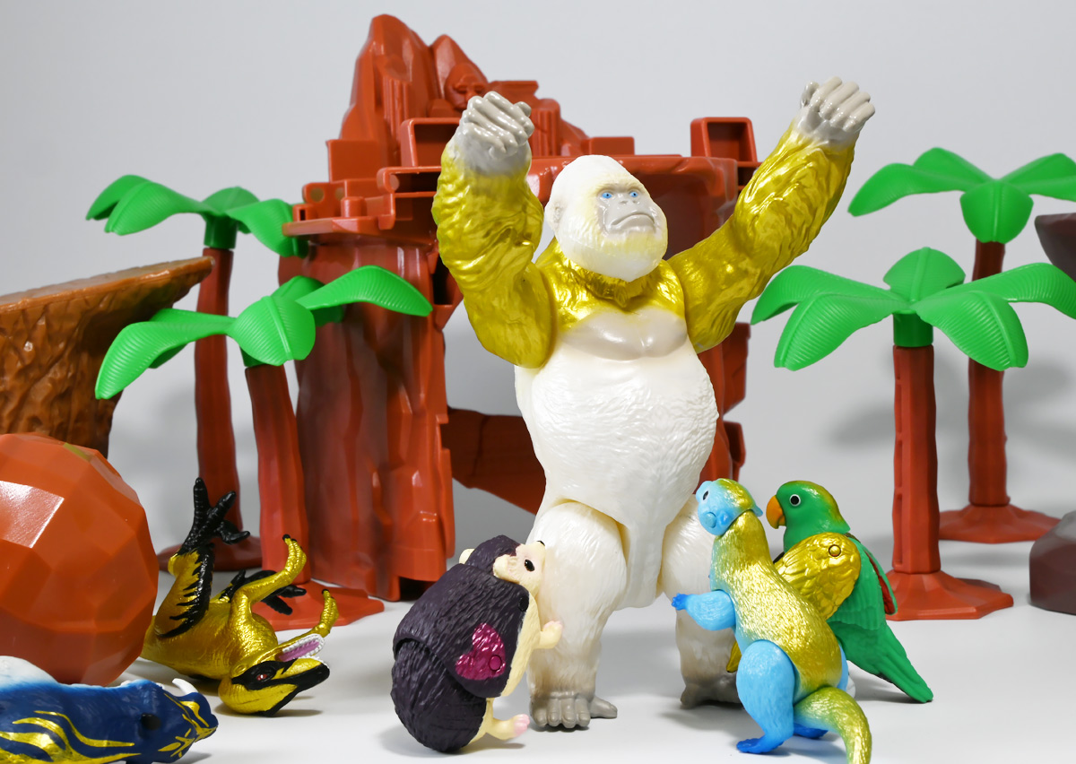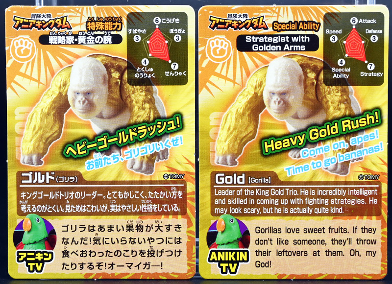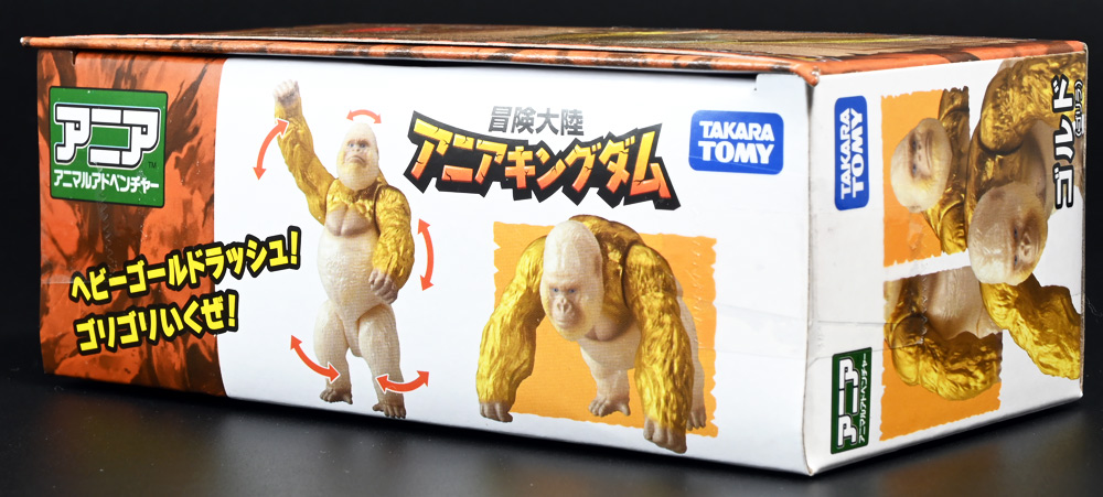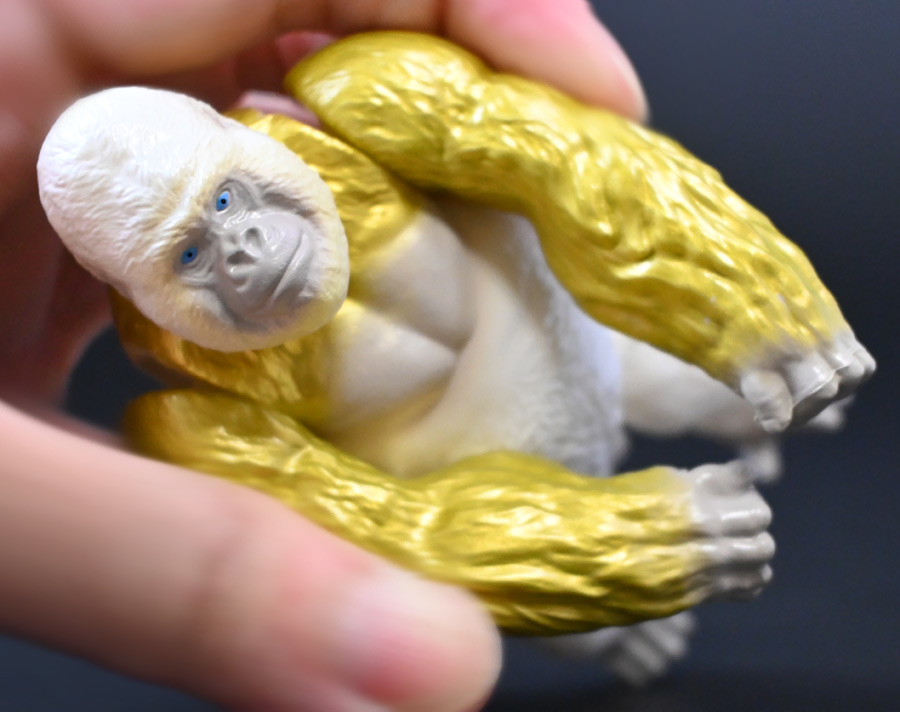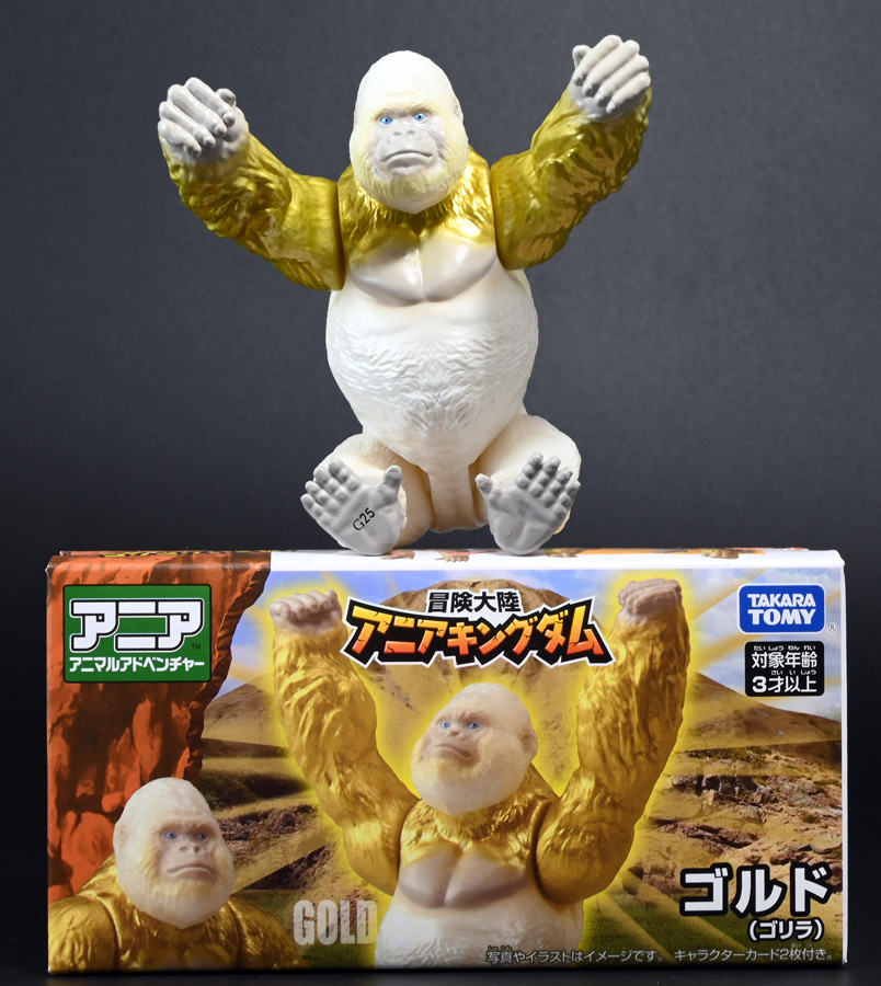 ■冒険大陸 アニアキングダム ゴルド(ゴリラ) ![]() 2025年10月18日発売 / 1045円(税込) キングゴールドトリオのリーダー・ゴルドが本物のアニアで登場! 過去プレイセットに付属した「ホワイトキングゴリラ」のリメイク的キャラクターぞよ! ![]() ALゴリラの新たなカラバリぞよね! パケはずっしり重く期待感が高まるぞよ!! ![]() ヘビーゴールドラッシュ! ゴリゴリいくぜ! ![]() くちにいれない! ![]() キャラクターカードが日本語と英語で二枚付属。 金のリンゴでパワーアップしたと思われる能力値はせんりゃくが限界突破の7となっているぞよ! ![]() パカっと開封! アニメ第3期「キングゴールドマウンテン編」で新登場したゴルドが、 劇中そのままのアニア玩具で登場ぞよ! ![]() 食べると金ピカにパワーアップ出来る金のリンゴを求めて、 その在り処「キングゴールドマウンテン」の頂上を目指すルッタ一行。 そんなルッタ達を金のリンゴを狙う不届きものと睨み、 道中妨害を企てる新たな敵! その名もキングゴールドトリオのリーダーこそが、このゴルドであるぞよ! ![]() ![]() ゴルドはどうやらキングゴールドマウンテンを守護する存在みたいぞよね! 食べると長所と短所を同時に伸ばす禁断の果実である金のリンゴが悪戯に収穫されないよう、 仲間と共に守っているぞよ! 得意のドラミングでガブールとシソッチに的確な指示を出し、 ルッタ達を翻弄する戦略家なのだ! ![]() ホワイトの毛並みが黄金に輝き実にゴージャスな見た目・・・! 頭だけでなく腕っぷしも強く、山の頂から大岩を落としてくる攻撃も厄介だ! これぞ必殺技・ヘビーゴールドラッシュぞよ! ![]() アニアはワンアクション付きの動物フィギュア! ALゴリラを元にした本商品は頭、腕、脚が可動部となっており・・・、 ![]() この可動域を活かしてナックルウォークポーズにも変形できます! シルエットが大きく変わるので楽しいぞよね! ![]() 頭部はボールジョイントなのでこんな風にちゃんと前を向く事が出来る。 これは良く出来たギミックですぞよ! ![]() 意外と優しいお顔をしているんです。 ![]() 更に腕が軟質素材になっており、くにくに曲げて遊ぶ事も出来る。 劇中では曲げた状態でポーズをとっているが、 製品は中に骨が入ってないので手を放すと元に戻ってしまうぞよ。 ![]() 本商品は「AL-29 ゴリラ(2024年5月)」の原型を使用したアニメ版彩色。 黒から光沢感のあるパールホワイトのなっただけでなく、 金の差し色や各部のグラデーション彩色も増えてがらっと印象が変わりました。 ![]() アニアキングダム第3期「キングゴールドマウンテン編」は、 玩具、アニメ共に旧プレイセットの「アニア 変形!ビッグフォールマウンテン(2019年10月)」をモチーフとしている。 このビッグフォールマウンテンには山頂の遺跡を守る「ホワイトキングゴリラ」がおまけとして封入されたが、 ゴルドは正にこのホワイトキングをモチーフとしたリメイクキャラと考えて良いだろう! ご覧の通りパール調のホワイトに青い目と面影があるぞよね! ただしASゴリラの原型を使用したホワイトキングはニシゴリラ、 ALゴリラを元にしたゴルドはヒガシゴリラなので種のモチーフは別種であるぞよ。 ![]() なんとかキングゴールドマウンテンの山頂に辿り着いたルッタ達! しかし、待ち受けていたキングゴールドトリオの連携攻撃は手ごわかった! ブレイズとラプルが奮闘するも、ガブール&シソッチは的確な攻撃で翻弄してくる! どうやらゴルドのドラミングが戦略を伝えているみたいだ・・・これは強敵ぞよ!! ![]() 丸太のイカダに乗って急流下りで脱出ぞよ!! これらのアニメエピソードはプレイセットの各ギミックにフォーカスした展開が採用されており、 ごっこ遊びが捗るぞよ!! ![]() パケからはみ出す程のサイズ感! この大きさ&格好良いアニメ彩色がほんの割引数百円で手に入るとはお得ですぞよ! キングゴールドトリオを集めて劇中の戦いを再現しよう!! ![]() 「アニア」シリーズは「ぞよちゃんねる」でも度々取り上げているのでこちらもよろしくぞよ! :このリンクを踏んで何かポチるとわたくしにささやかな報酬が入りサイトの運営費となるのでよろしくぞ! ・「アニア 冒険大陸 アニアキングダム ゴルド (ゴリラ)」 ・「冒険大陸 アニアキングダム ビッグアニア ゴルド (ゴリラ)」 ▲TOP |
