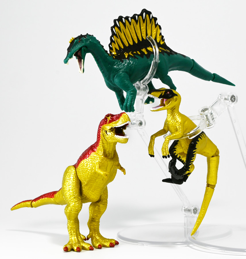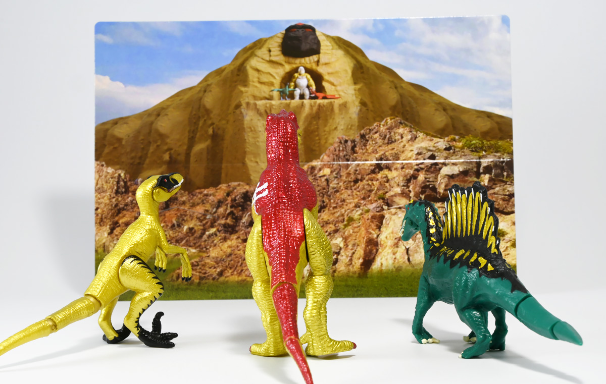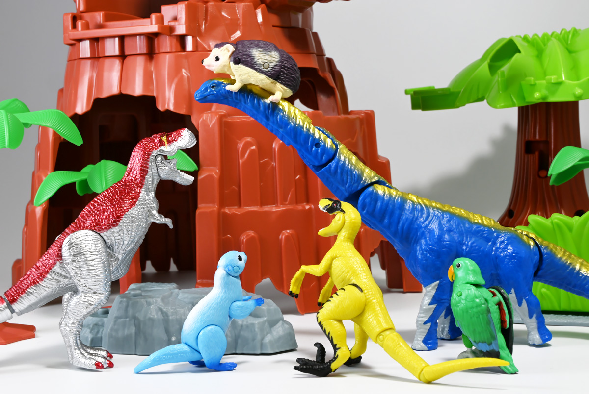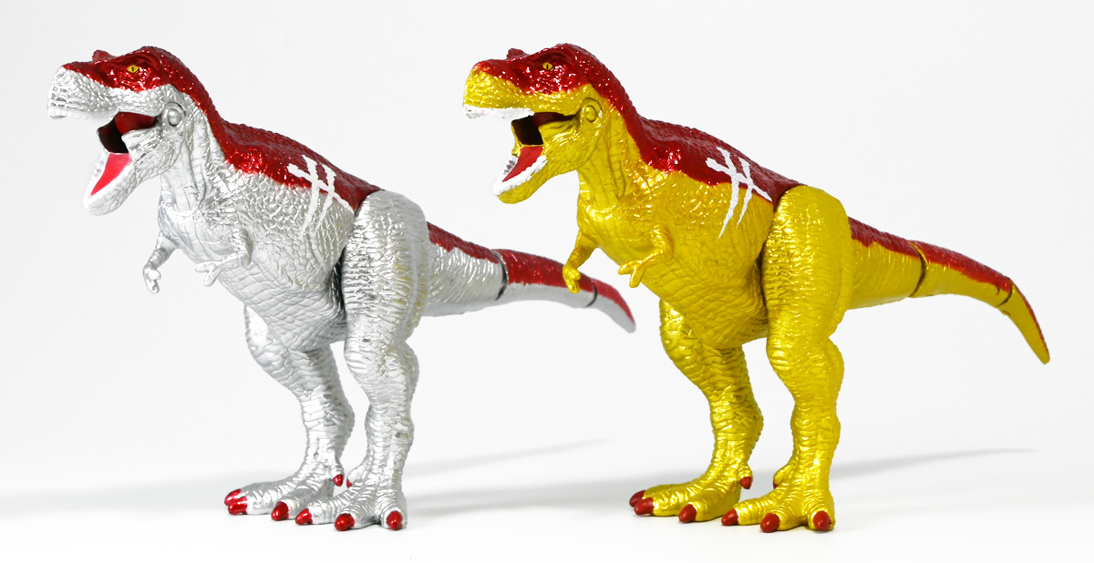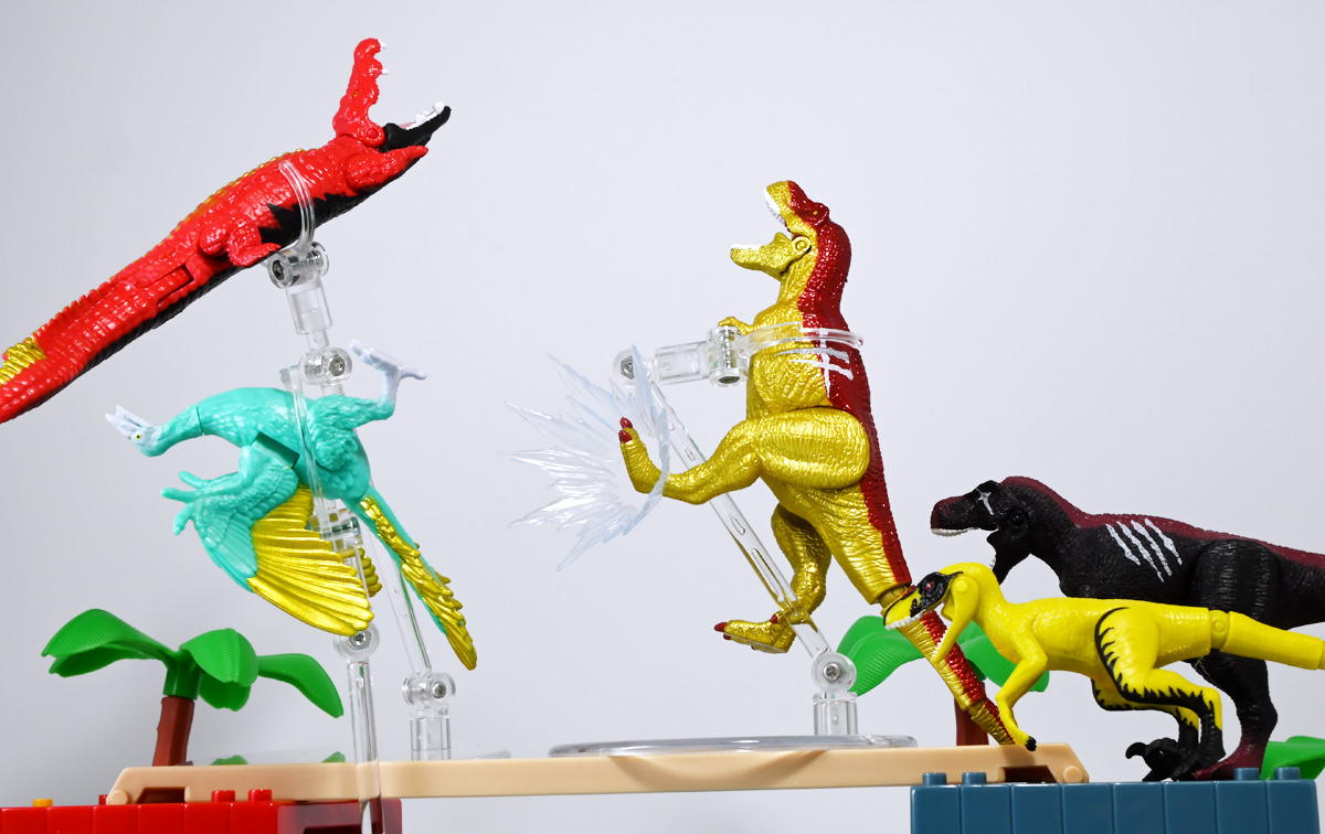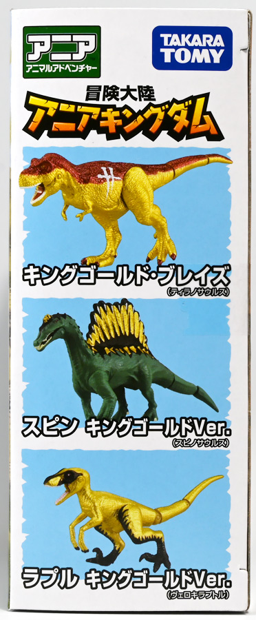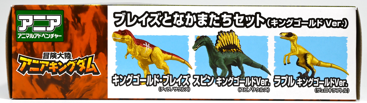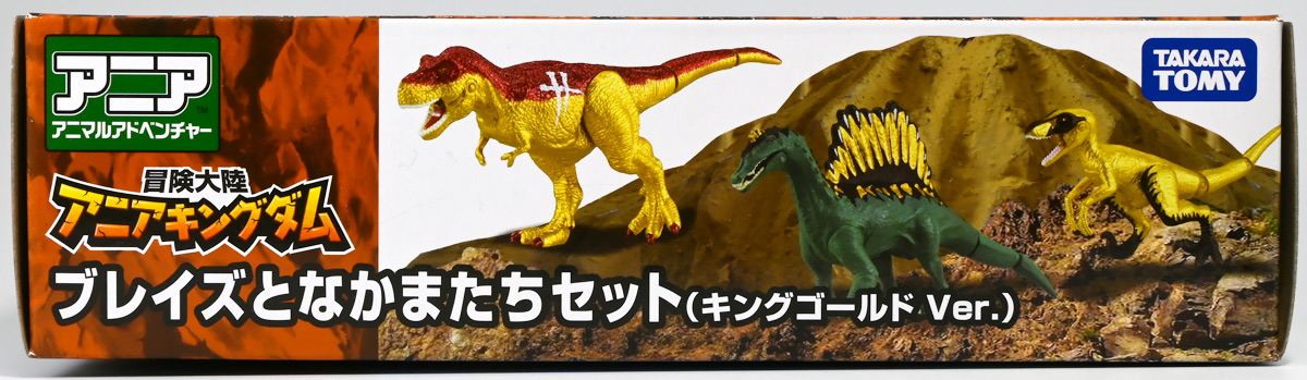■冒険大陸 アニアキングダム ブレイズとなかまたちセット(キングゴールドVer.) ![]() 2025年10月2日発売 / 2200円(税込) ほんものアニアが登場するストップモーションアニメ「アニアキングダム」、 Youtube配信の第三期「キングゴールドマウンテン編」より、 豪華恐竜セット「ブレイズとなかまたちセット」を紹介ぞよ! ![]() アニアキングダムは短期放送なので玩具も一挙に発売されるぞよ。 わたくしは送料合わせで分割してポチったのでこれら三つは後から着弾したのだ。 ![]() パッケージはブリスター窓付きの豪華仕様。 こちらは金ピカ恐竜のセットなので人気も高そうだ! ![]() 内容は、 ![]() こんな感じぞよ。 ![]() サイドのストーリーはルッタセットと共通となっている。 ![]() ブリスターにみっちり入っています。 第一期の「ボルケーノの恐竜セット(メタルレッドVer.)」は 本パッケージと同格で2750円だったのに対し、こちらは2200円とお得な価格設定。 アニア通常ラインには本セットと全く同じティラノ、スピノ、ラプトルの入った 「AA-03 最強恐竜対決セット」が登場しており、やはり2200円となっている。 このセットは「AA-03」のアニキンカラバリと考えて良いだろう! ![]() それでは中身を見ていこう! まずは「キングゴールド・ブレイズ(ティラノサウルス)」ぞよ! ![]() 第二期「伝説のガーディアン編」より登場した、ダーク・フレイムの弟「アイアン・ブレイズ」が、 金のリンゴを食べてパワーアップした形態がこの「キングゴールド・ブレイズ」ぞよ! なぜかこいつだけ「キングゴールドver」でなく名前が変更されており 特殊な仕様であるぞよ。 当番回は第6話「最強サイコー!ティラノブラザーズ!」となる。 ![]() 丸太船から落水したハートを捜索する為、再びキングゴールドマウンテンへ足を踏み入れるルッタ達。 今度は頼もしい仲間、恐竜族最強のダーク・フレイムも助っ人に来てくれたぞよ! しかし、そこへまたしても立ちはだかるガブール&シソッチ・・・! ぐらぐら橋の試練を引き受けてくれたのは、フレイム&ブレイズのティラノ兄弟だ! 「オレ様だけで十分だ!」 兄に頼るのが癪なブレイズはこう言って飛び出してゆくが、 ティラノの巨体にグラグラ攻撃は極めて不利ッ! 猪突猛進に突っ込んでゆくブレイズをたしなめるフレイム! 「待て!我らは何のために来た・・・!?」 「はっ!・・・ハートを救い出す為・・・ッ」 ![]() 「・・・判ったぜ兄貴ッ!!」 そう、ハートを助ける為に、今こそ兄弟の力を合わせる時! 「我の上を走れ、弟よ!」 ティラノ兄弟のコンビネーション炸裂! 不安定な足場を逃れ、フレイムの背を駆けるブレイズ! 橋向こうの敵目掛けて大きくジャンプ! 二人の合体技を見て、ラプルも気づいた! フレイムへの献上用に大事にとっておいた金のリンゴだが・・・出し惜しみしている場合ではないっ! ラプルが投げた金のリンゴを空中でキャッチしたブレイズは、 これを食べてゴールデンにパワーアップ!! 「ティラノカタパルト!フットストップッ!!」 三人の絆が新たな必殺技を生み出した! パワーアップしたブレイズの攻撃に、ガブール&シソッチは一撃で倒されるのだった!! ![]() 続いて「スピン キングゴールドver.(スピノサウルス)」ぞよ! こちらは1話から登場するスピンのパワーアップ形態。 もともとスピンとサベールが金のリンゴを食べてきんきらキンになった事が切っ掛けで、 この「キングゴールドマウンテン編」の冒険が始まったのだ! ![]() ハート救出の為の登頂においては、ルッタとエディを乗せた丸太橋をモーサと共に引っ張りサポート。 そこへ山頂から降り注ぐ大岩を「ここは任せろ!」と頼もしく弾き飛ばし、 ルッタ達の道を切り開いたぞよ! ![]() ブレイズの相棒と言えばスピノサウルスのスピーキーだが、今回は出番なし。 こちらのスピンに出番を譲る形となったぞよ。 ![]() そして最後は「ラプル キングゴールドver.(ヴェロキラプトル)」! このラプルも毎回ラインナップされている人気キャラぞよね! 今回もルッタ達の旅に同行する主要メンバーとして登場している。 ![]() 毎回金のリンゴを拾ってはフレイム様への献上用に持ち歩くも、 ゆく先々で困難に見舞われ、結局誰かに食べられてしまうぞよ! そんなラプルも最終決戦でキングゴールドverにパワーアップしてサベールと共に駆けつけた! 「待たせたな!金ピカヒーローは!」 「遅れて登場するでござーるっ!」 ・・・が、超巨大岩に弾き飛ばされて一瞬でノックダウンしてしまうと言うズコーな展開であった! ![]() って事でこのセットもシリーズ序盤と最終盤の内容を汲んだパッケージとなっているぞよ! 金ピカ×恐竜って事でちびっ子垂涎の内容ぞよね・・・! ![]() 原型としてはいつものヤツですが、アニメキャラカラバリってだけでもう一個買ってやるか! という気になるのがニクイぞよよよよ・・・。 タカトミはわたくしにあと何個この三体を買わせるつもりなんだぞよーっ!! ![]() 金ピカと言えば、ブレイズとラプルには金のラメ成型色