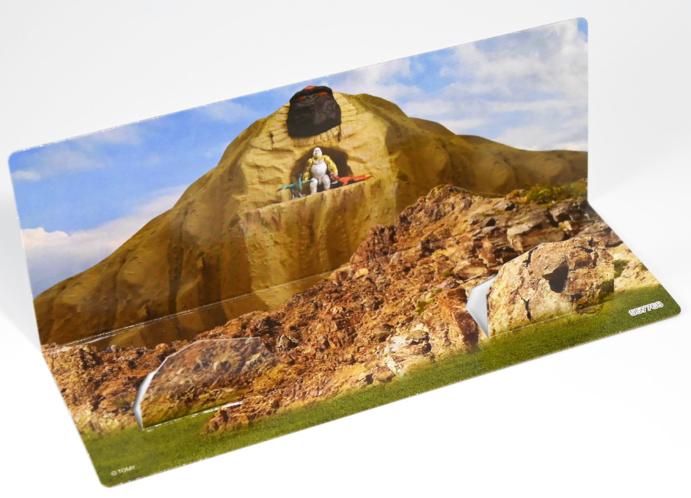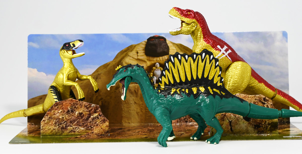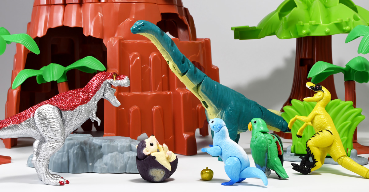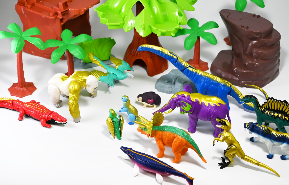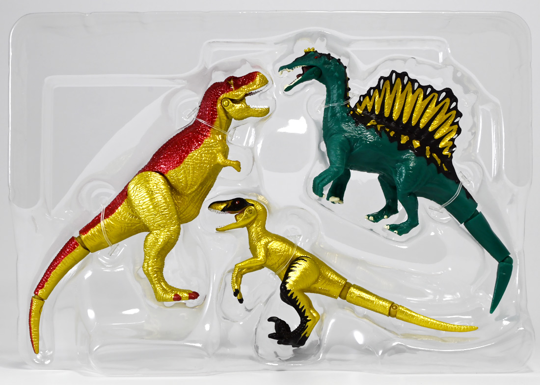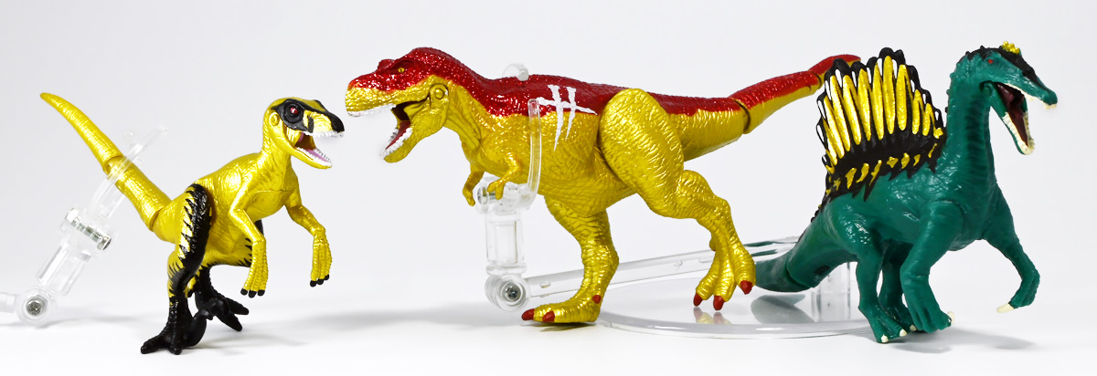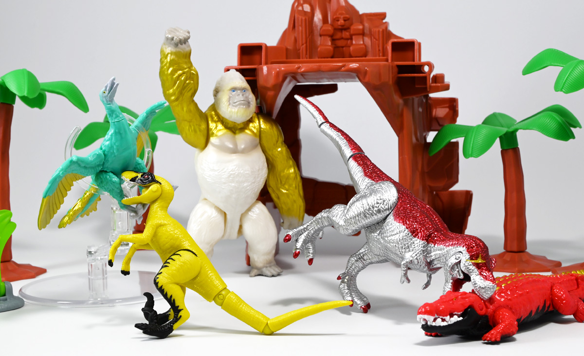 ■冒険大陸 アニアキングダム ブレイズとなかまたちセット(キングゴールドVer.) ![]() 2025年10月2日発売 / 2200円(税込) ほんものアニアが登場するストップモーションアニメ「アニアキングダム」、 Youtube配信の第三期「キングゴールドマウンテン編」より、 豪華恐竜セット「ブレイズとなかまたちセット」を紹介ぞよ! ![]() アニアキングダムは短期放送なので玩具も一挙に発売されるぞよ。 わたくしは送料合わせで分割してポチったのでこれら三つは後から着弾したのだ。 ![]() パッケージはブリスター窓付きの豪華仕様。 こちらは金ピカ恐竜のセットなので人気も高そうだ! ![]() 内容は、 ![]() こんな感じぞよ。 ![]() サイドのストーリーはルッタセットと共通となっている。 ![]() ブリスターにみっちり入っています。 第一期の「ボルケーノの恐竜セット(メタルレッドVer.)」は 本パッケージと同格で2750円だったのに対し、こちらは2200円とお得な価格設定。 アニア通常ラインには本セットと全く同じティラノ、スピノ、ラプトルの入った 「AA-03 最強恐竜対決セット」が登場しており、やはり2200円となっている。 このセットは「AA-03」のアニキンカラバリと考えて良いだろう! ![]() それでは中身を見ていこう! まずは「キングゴールド・ブレイズ(ティラノサウルス)」ぞよ! ![]() 第二期「伝説のガーディアン編」より登場した、ダーク・フレイムの弟「アイアン・ブレイズ」が、 金のリンゴを食べてパワーアップした形態がこの「キングゴールド・ブレイズ」ぞよ! なぜかこいつだけ「キングゴールドver」でなく名前が変更されており 特殊な仕様であるぞよ。 当番回は第6話「最強サイコー!ティラノブラザーズ!」となる。 ![]() 丸太船から落水したハートを捜索する為、再びキングゴールドマウンテンへ足を踏み入れるルッタ達。 今度は頼もしい仲間、恐竜族最強のダーク・フレイムも助っ人に来てくれたぞよ! しかし、そこへまたしても立ちはだかるガブール&シソッチ・・・! ぐらぐら橋の試練を引き受けてくれたのは、フレイム&ブレイズのティラノ兄弟だ! 「オレ様だけで十分だ!」 兄に頼るのが癪なブレイズはこう言って飛び出してゆくが、 ティラノの巨体にグラグラ攻撃は極めて不利ッ! 猪突猛進に突っ込んでゆくブレイズをたしなめるフレイム! 「待て!我らは何のために来た・・・!?」 「はっ!・・・ハートを救い出す為・・・ッ」 ![]() 「・・・判ったぜ兄貴ッ!!」 そう、ハートを助ける為に、今こそ兄弟の力を合わせる時! 「我の上を走れ、弟よ!」 ティラノ兄弟のコンビネーション炸裂! 不安定な足場を逃れ、フレイムの背を駆けるブレイズ! 橋向こうの敵目掛けて大きくジャンプ! 二人の合体技を見て、ラプルも気づいた! フレイムへの献上用に大事にとっておいた金のリンゴだが・・・出し惜しみしている場合ではないっ! ラプルが投げた金のリンゴを空中でキャッチしたブレイズは、 これを食べてゴールデンにパワーアップ!! 「ティラノカタパルト!フットストップッ!!」 三人の絆が新たな必殺技を生み出した! パワーアップしたブレイズの攻撃に、ガブール&シソッチは一撃で倒されるのだった!! ![]() 続いて「スピン キングゴールドver.(スピノサウルス)」ぞよ! こちらは1話から登場するスピンのパワーアップ形態。 もともとスピンとサベールが金のリンゴを食べてきんきらキンになった事が切っ掛けで、 この「キングゴールドマウンテン編」の冒険が始まったのだ! ![]() ハート救出の為の登頂においては、ルッタとエディを乗せた丸太橋をモーサと共に引っ張りサポート。 そこへ山頂から降り注ぐ大岩を「ここは任せろ!」と頼もしく弾き飛ばし、 ルッタ達の道を切り開いたぞよ! ![]() ブレイズの相棒と言えばスピノサウルスのスピーキーだが、今回は出番なし。 こちらのスピンに出番を譲る形となったぞよ。 ![]() そして最後は「ラプル キングゴールドver.(ヴェロキラプトル)」! このラプルも毎回ラインナップされている人気キャラぞよね! 今回もルッタ達の旅に同行する主要メンバーとして登場している。 ![]() 毎回金のリンゴを拾ってはフレイム様への献上用に持ち歩くも、 ゆく先々で困難に見舞われ、結局誰かに食べられてしまうぞよ! そんなラプルも最終決戦でキングゴールドverにパワーアップしてサベールと共に駆けつけた! 「待たせたな!金ピカヒーローは!」 「遅れて登場するでござーるっ!」 ・・・が、超巨大岩に弾き飛ばされて一瞬でノックダウンしてしまうと言うズコーな展開であった! ![]() って事でこのセットもシリーズ序盤と最終盤の内容を汲んだパッケージとなっているぞよ! 金ピカ×恐竜って事でちびっ子垂涎の内容ぞよね・・・! ![]() 原型としてはいつものヤツですが、アニメキャラカラバリってだけでもう一個買ってやるか! という気になるのがニクイぞよよよよ・・・。 タカトミはわたくしにあと何個この三体を買わせるつもりなんだぞよーっ!! ![]() 金ピカと言えば、ブレイズとラプルには金のラメ成型色