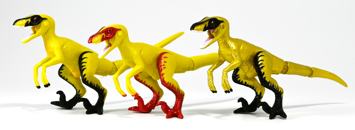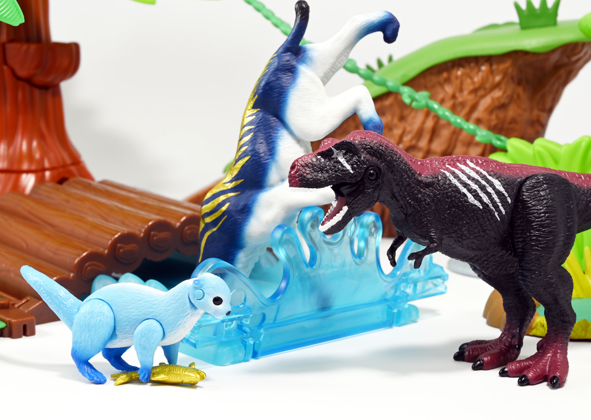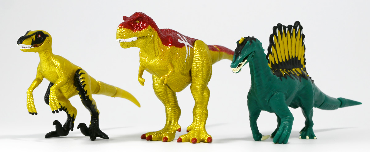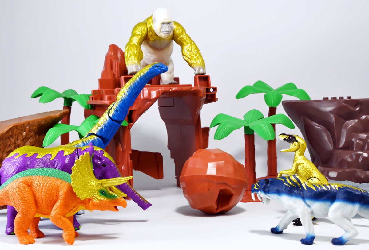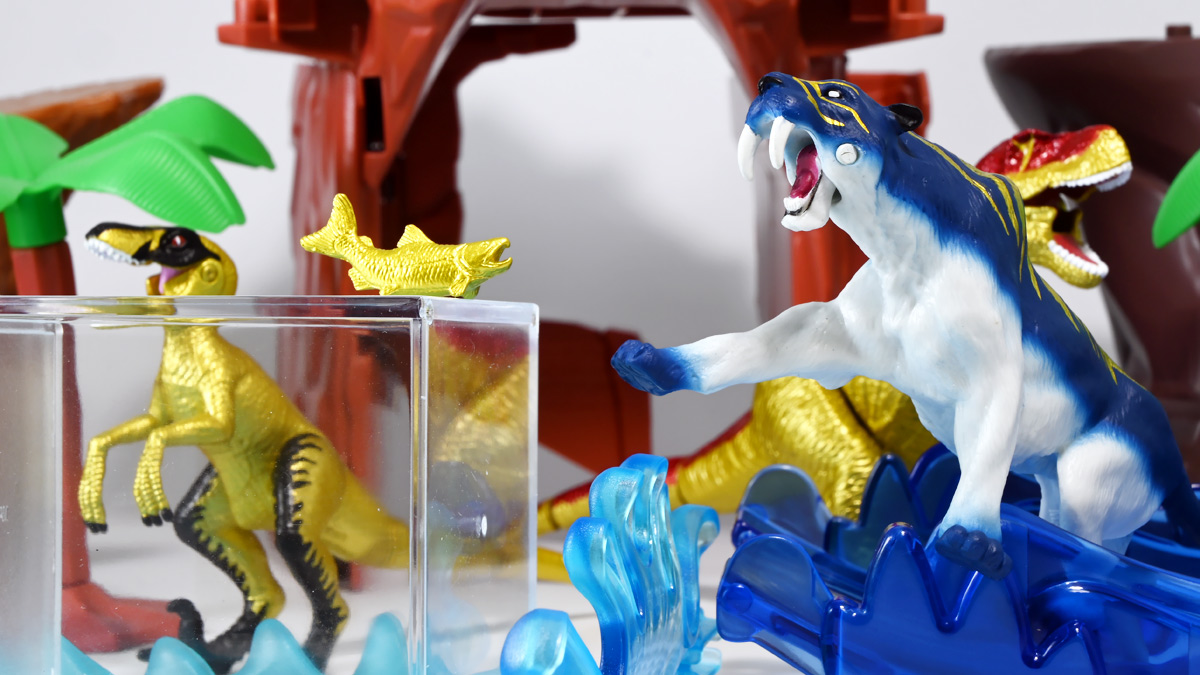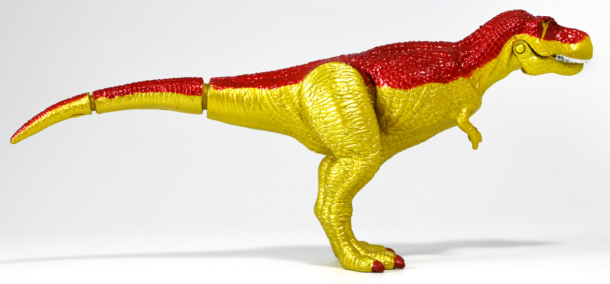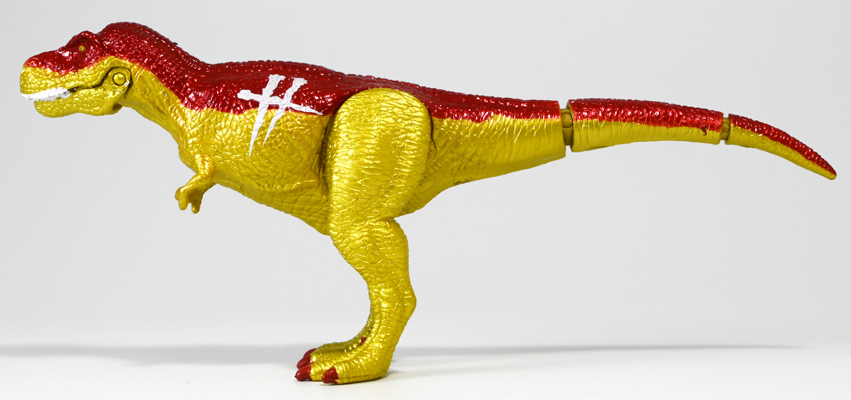 ■冒険大陸 アニアキングダム ブレイズとなかまたちセット(キングゴールドVer.) ![]() 2025年10月2日発売 / 2200円(税込) ほんものアニアが登場するストップモーションアニメ「アニアキングダム」、 Youtube配信の第三期「キングゴールドマウンテン編」より、 豪華恐竜セット「ブレイズとなかまたちセット」を紹介ぞよ! ![]() アニアキングダムは短期放送なので玩具も一挙に発売されるぞよ。 わたくしは送料合わせで分割してポチったのでこれら三つは後から着弾したのだ。 ![]() パッケージはブリスター窓付きの豪華仕様。 こちらは金ピカ恐竜のセットなので人気も高そうだ! ![]() 内容は、 ![]() こんな感じぞよ。 ![]() サイドのストーリーはルッタセットと共通となっている。 ![]() ブリスターにみっちり入っています。 第一期の「ボルケーノの恐竜セット(メタルレッドVer.)」は 本パッケージと同格で2750円だったのに対し、こちらは2200円とお得な価格設定。 アニア通常ラインには本セットと全く同じティラノ、スピノ、ラプトルの入った 「AA-03 最強恐竜対決セット」が登場しており、やはり2200円となっている。 このセットは「AA-03」のアニキンカラバリと考えて良いだろう! ![]() それでは中身を見ていこう! まずは「キングゴールド・ブレイズ(ティラノサウルス)」ぞよ! ![]() 第二期「伝説のガーディアン編」より登場した、ダーク・フレイムの弟「アイアン・ブレイズ」が、 金のリンゴを食べてパワーアップした形態がこの「キングゴールド・ブレイズ」ぞよ! なぜかこいつだけ「キングゴールドver」でなく名前が変更されており 特殊な仕様であるぞよ。 当番回は第6話「最強サイコー!ティラノブラザーズ!」となる。 ![]() 丸太船から落水したハートを捜索する為、再びキングゴールドマウンテンへ足を踏み入れるルッタ達。 今度は頼もしい仲間、恐竜族最強のダーク・フレイムも助っ人に来てくれたぞよ! しかし、そこへまたしても立ちはだかるガブール&シソッチ・・・! ぐらぐら橋の試練を引き受けてくれたのは、フレイム&ブレイズのティラノ兄弟だ! 「オレ様だけで十分だ!」 兄に頼るのが癪なブレイズはこう言って飛び出してゆくが、 ティラノの巨体にグラグラ攻撃は極めて不利ッ! 猪突猛進に突っ込んでゆくブレイズをたしなめるフレイム! 「待て!我らは何のために来た・・・!?」 「はっ!・・・ハートを救い出す為・・・ッ」 ![]() 「・・・判ったぜ兄貴ッ!!」 そう、ハートを助ける為に、今こそ兄弟の力を合わせる時! 「我の上を走れ、弟よ!」 ティラノ兄弟のコンビネーション炸裂! 不安定な足場を逃れ、フレイムの背を駆けるブレイズ! 橋向こうの敵目掛けて大きくジャンプ! 二人の合体技を見て、ラプルも気づいた! フレイムへの献上用に大事にとっておいた金のリンゴだが・・・出し惜しみしている場合ではないっ! ラプルが投げた金のリンゴを空中でキャッチしたブレイズは、 これを食べてゴールデンにパワーアップ!! 「ティラノカタパルト!フットストップッ!!」 三人の絆が新たな必殺技を生み出した! パワーアップしたブレイズの攻撃に、ガブール&シソッチは一撃で倒されるのだった!! ![]() 続いて「スピン キングゴールドver.(スピノサウルス)」ぞよ! こちらは1話から登場するスピンのパワーアップ形態。 もともとスピンとサベールが金のリンゴを食べてきんきらキンになった事が切っ掛けで、 この「キングゴールドマウンテン編」の冒険が始まったのだ! ![]() ハート救出の為の登頂においては、ルッタとエディを乗せた丸太橋をモーサと共に引っ張りサポート。 そこへ山頂から降り注ぐ大岩を「ここは任せろ!」と頼もしく弾き飛ばし、 ルッタ達の道を切り開いたぞよ! ![]() ブレイズの相棒と言えばスピノサウルスのスピーキーだが、今回は出番なし。 こちらのスピンに出番を譲る形となったぞよ。 ![]() そして最後は「ラプル キングゴールドver.(ヴェロキラプトル)」! このラプルも毎回ラインナップされている人気キャラぞよね! 今回もルッタ達の旅に同行する主要メンバーとして登場している。 ![]() 毎回金のリンゴを拾ってはフレイム様への献上用に持ち歩くも、 ゆく先々で困難に見舞われ、結局誰かに食べられてしまうぞよ! そんなラプルも最終決戦でキングゴールドverにパワーアップしてサベールと共に駆けつけた! 「待たせたな!金ピカヒーローは!」 「遅れて登場するでござーるっ!」 ・・・が、超巨大岩に弾き飛ばされて一瞬でノックダウンしてしまうと言うズコーな展開であった! ![]() って事でこのセットもシリーズ序盤と最終盤の内容を汲んだパッケージとなっているぞよ! 金ピカ×恐竜って事でちびっ子垂涎の内容ぞよね・・・! ![]() 原型としてはいつものヤツですが、アニメキャラカラバリってだけでもう一個買ってやるか! という気になるのがニクイぞよよよよ・・・。 タカトミはわたくしにあと何個この三体を買わせるつもりなんだぞよーっ!! ![]() 金ピカと言えば、ブレイズとラプルには金のラメ成型色