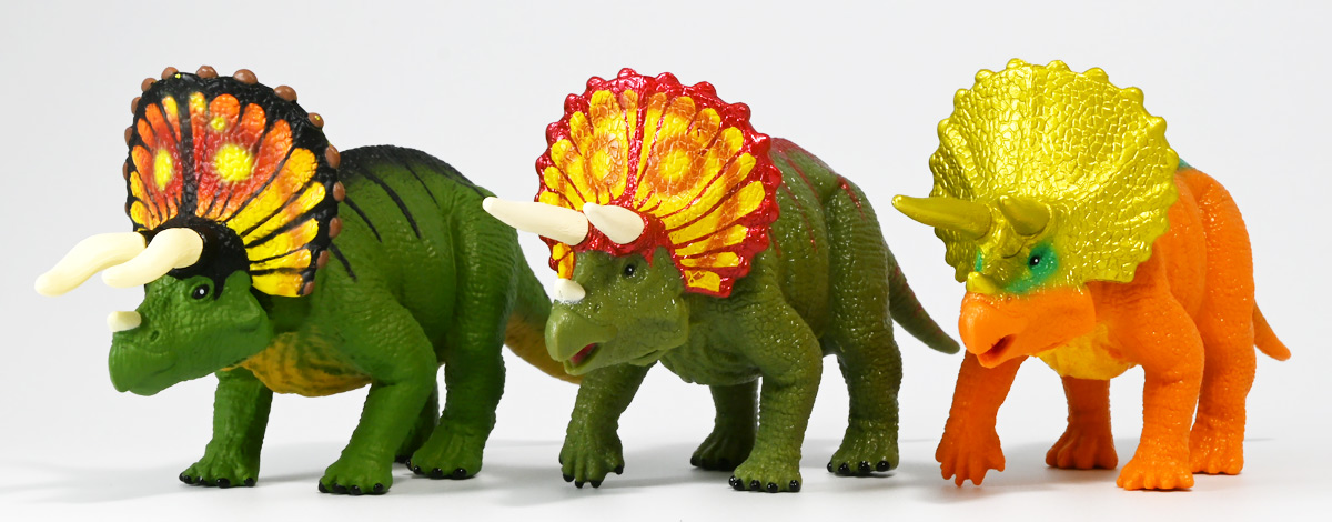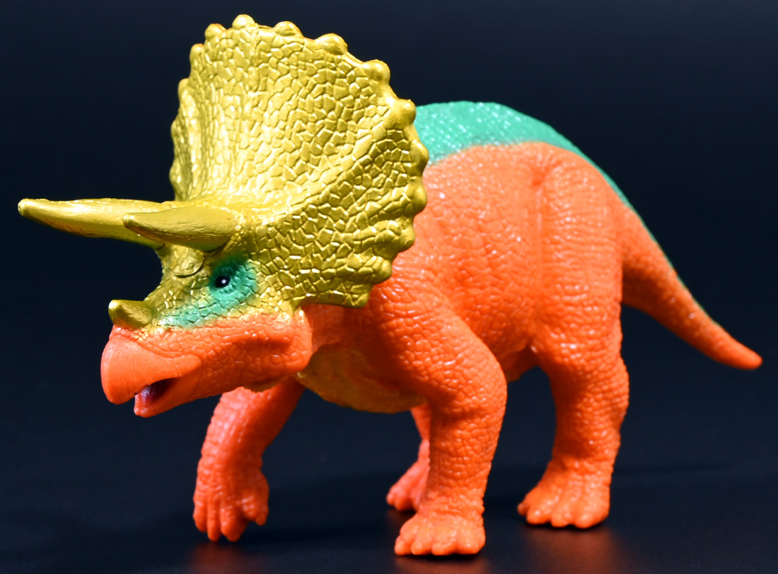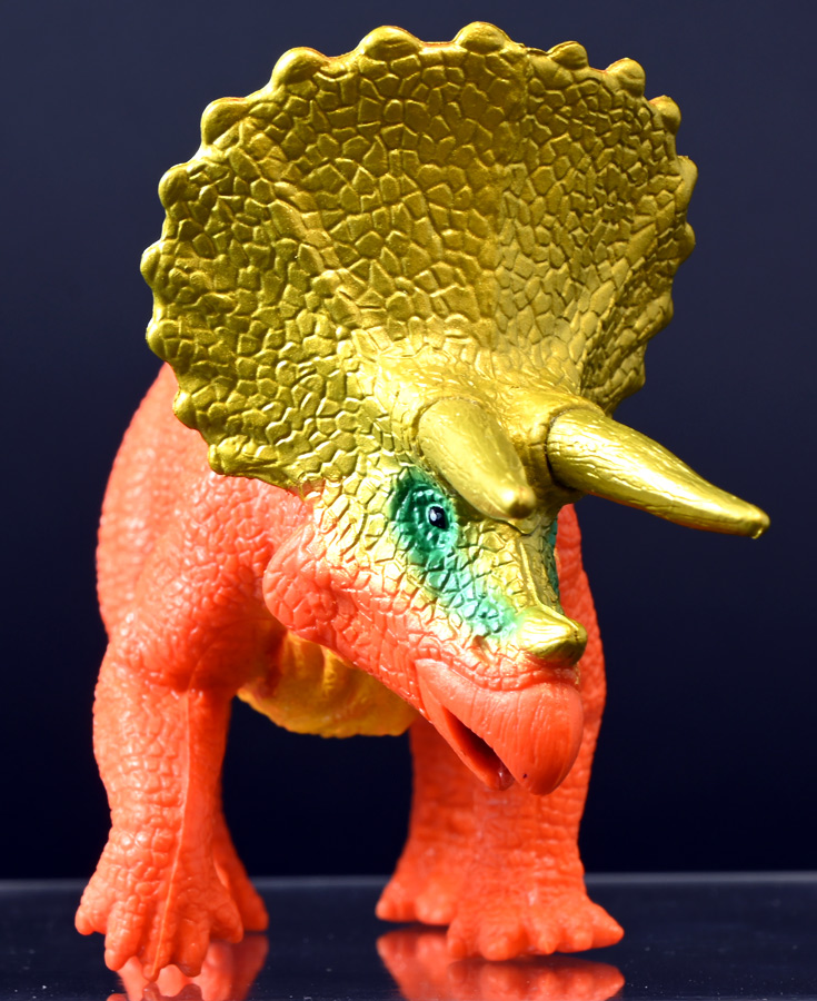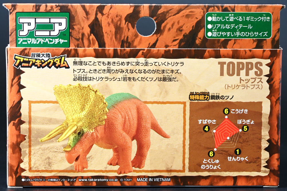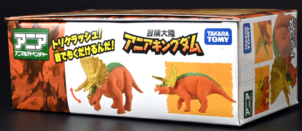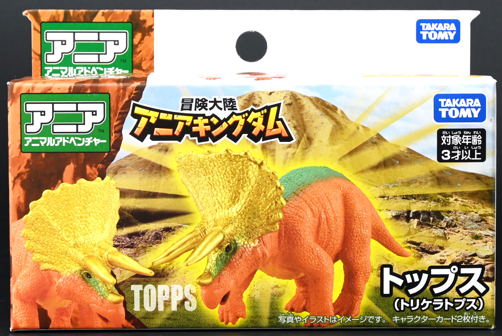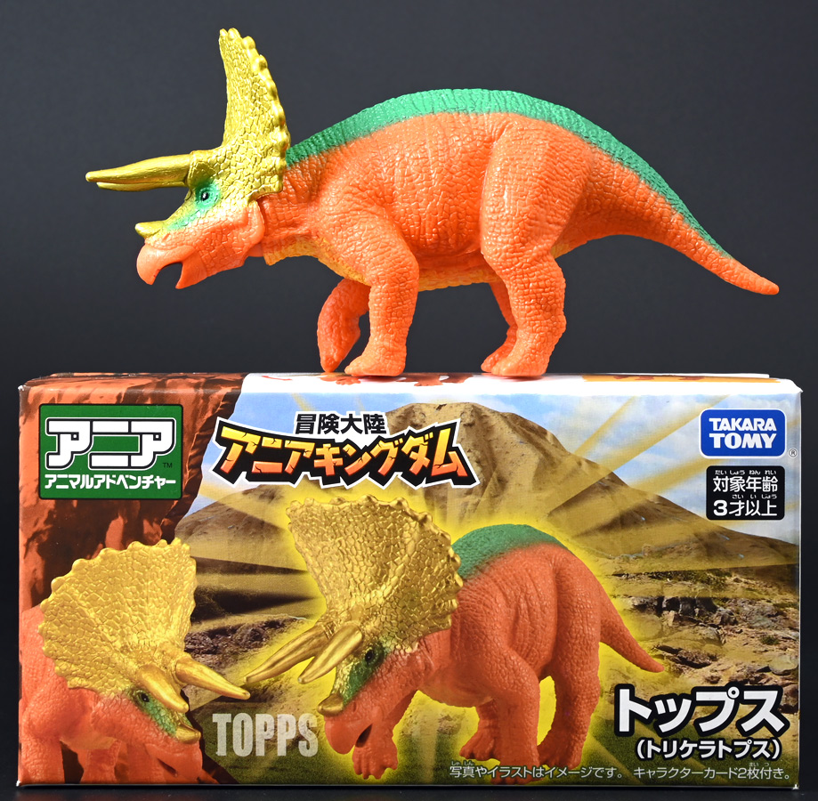 ■冒険大陸 アニアキングダム トップス(トリケラトプス) ![]() 2025年10月2日発売 / 1045円(税込) 「アニアキングダム」第三期、「キングゴールドマウンテン編」に登場する新たなトリケラトプス、 トップスが本物アニアになって玩具売り場に出現ぞよ! ![]() みんな大好きトリケラトプス。 タカトミはわたくしにあと何匹トリケラアニアを買わせるつもりなんだぞよーっ!! ![]() トリケラッシュ! 岩でもくだけるんだ! ![]() くちにいれない!! ![]() 味方アニアのストーリーは専用撮り下ろしビジュアルが使用されているぞよ。 背景にはプレイセットも使われている。 ![]() キャラクターカードが日本語と英語で二枚付属。 トップスはこうげきととくしゅが限界突破の6! 更にぼうぎょとすばやさもなかなかの高さぞよね! ![]() 「キングゴールドマウンテン編」に新たに登場したトリケラトプスのトップス! シリーズでは第一期よりトリケラトプスのトリーが登場していたが、 こちらは原型の異なる新キャラぞよ。 ![]() ラベンダ、アルーゼの協力で敵の妨害をかいくぐりつつ、 なんとかキングゴールドマウンテン山頂に辿り着いたルッタ達一行。 しかしそこにはリーダーのゴルド率いるキングゴールドトリオが待ち受けていた! ゴルドの戦略に苦戦を強いられるルッタ達・・・そこへ駆けつけたのは動物族最強のレオニーだった! レオニーの助太刀で辛くも撤退する事の出来たルッタ達は、 丸太船に乗ってキングゴールドマウンテンを脱出! このシークエンスはプレイセット「キングゴールドマウンテン」の 「トロッコ」、「S字コース」、「たきコース」をモチーフにしたものぞよね! ![]() 順調に川を下ってゆく丸太船だったが、ガブール&シソッチの追跡は続く! ところで丸太船には同乗者がいた。 お昼寝中のトリケラトプス・トップスぞよ! 訛りの強いトップスと英語かぶれのエディはプチ衝突しつつも、 船はのっぴきならない事態に陥ってしまう。 なんと眼前の川面から大岩が突き出しているではないか! このままでは衝突、沈没してしまうぞよーっ!! そこでトップス自慢の角が炸裂! 大岩を頭突きで見事に砕き、船の進路を切り開いた!! ![]() 眼前に迫りくる新たな大岩・・・ 流石にこれは砕けまいとハートは大慌て! 「ぷっす!無理だと思う気持ち、オラの角でぶっつぶーすっ!」 トップスはしかし、果敢に頭突き攻撃を繰り出すも・・・、 さしもの三本角もこれには敵わず、船上に倒れ伏してしまった! 背後からはガブールが迫りつつある・・・危うし仲良しチーム! しかし希望は残されていた! 無理な事にも決して諦めないトップスに共感したエディは、シソッチの落としていった金のリンゴをトップスに食べさせる! すると光に包まれたトップスはゴールデンにパワーアップ! 調子に乗って連続攻撃を繰り出し、岩に弾き飛ばされるズコーな展開もありつつ、 エディと連携した必殺のトリケラッシュでガブールを撃退し、 遂に船の進路を切り開く事に成功したのだった! ![]() という事でこの姿はトップスが金のリンゴで変身したパワーアップ形態を再現したもの。 金のリンゴパワーを帯びたアニアの特徴として、体の一部がゴールドのメタリック彩色になっているぞよ。 ![]() 「キングゴールドマウンテン編」には新たに三体のルッタの仲間達が登場。 ラベンダはルッタと、アルーゼはハートと、そしてトップスはエディと絆を結び、 困難を乗り越えてゆくという展開が繰り広げられたぞよ! ![]() この丸太船のシークエンスはシリーズでも屈指のわくわくする画ぞよね! 辛くも追跡を脱した一行だったが、大波にすくわれハートは落水! 行方不明となったハートを探す為、一行は再びキングゴールドマウンテン登頂を決意するのだった!! ![]() アニアはワンアクション付きの動物フィギュア! トップスは首が軸入りボールジョイントで可動するぞよ! ![]() 必殺のトリケラッシュを再現ぞよ!! ![]() 横にもロールするので首を傾げるような表情も可能。 意外と遊べる可動ぞよ。 ![]() トップスは劇中で「AL-02 トリケラトプス」カラーとして登場し、 金のリンゴを食べて左のカラーにパワーアップ変身するぞよ! 右に並べたのは原型を同じくする「FPDMアニア トリケラトプス・ホリドゥス(Dark Brown byGCG)(2022年7月)」だ。 ![]() 「アニアキングダム」においてはトリケラトプスのトリーが第一期より登場していた。 アニアでは「アニアキングダム トリー(トリケラトプス)(2023年6月)」としてラインナップされている。 アニキンアニアは基本的に通常ラインの原型を流用したカラバリ仕様で展開されているが、 なぜかこのトリーだけは「AL」の流用でない新規造形の新たなトリケラトプスだったぞよ。 つまり、ルッタ・ハート・エディの仲良しトリオらと同格だったのだ。 不思議な仕様ぞよね・・・。 ![]() そんなトリーは「AL」原型を使用した別バージョンも登場している。 写真真ん中は「アニアキングダム ボルケーノの恐竜セット(メタルレッドVer.)(2023年5月)」に収録