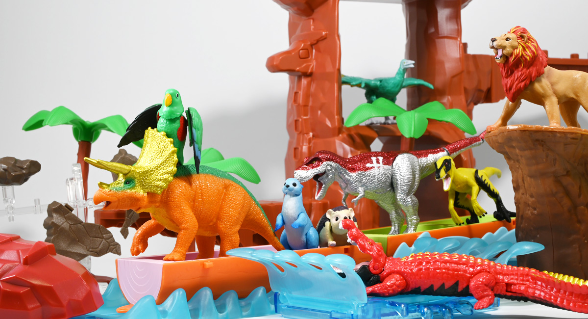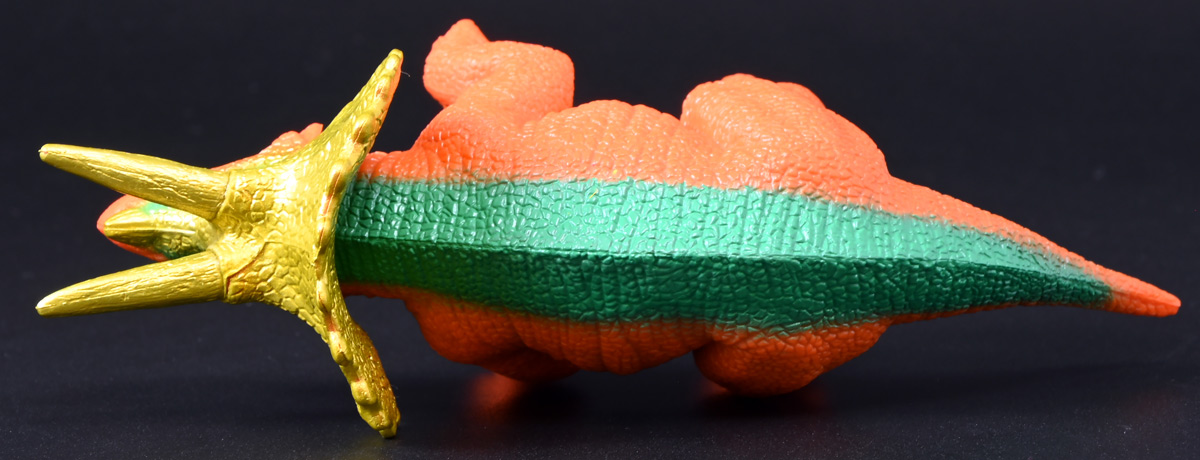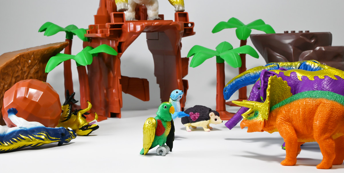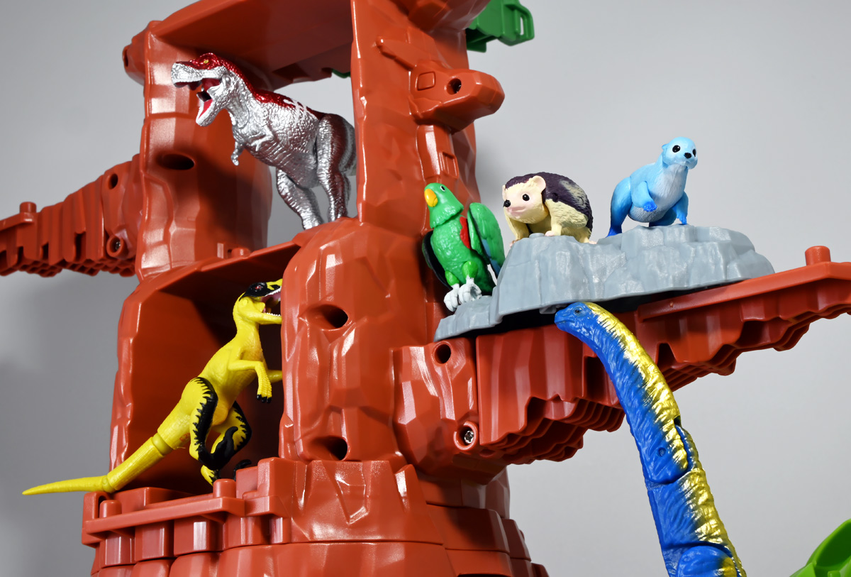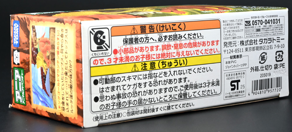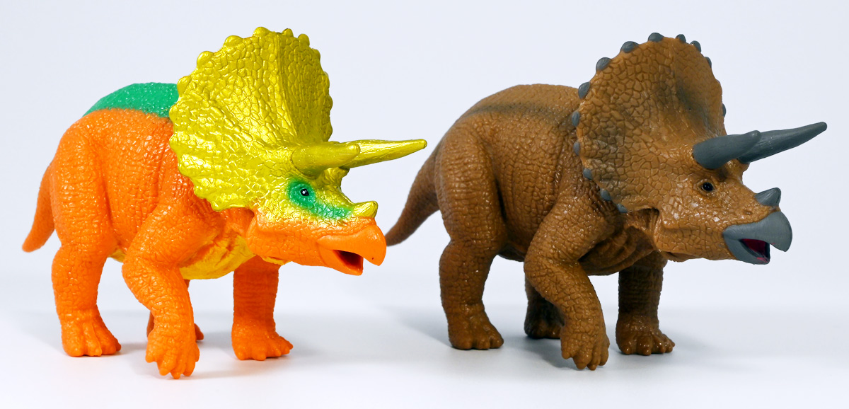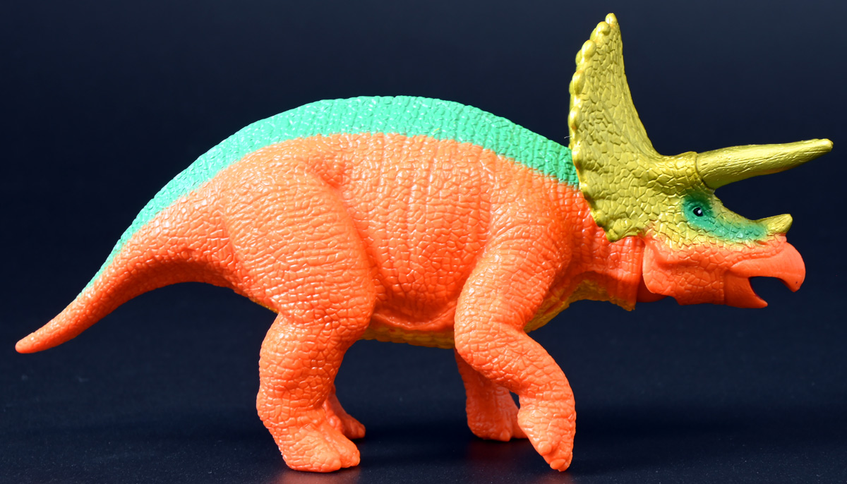 ■冒険大陸 アニアキングダム トップス(トリケラトプス) ![]() 2025年10月2日発売 / 1045円(税込) 「アニアキングダム」第三期、「キングゴールドマウンテン編」に登場する新たなトリケラトプス、 トップスが本物アニアになって玩具売り場に出現ぞよ! ![]() みんな大好きトリケラトプス。 タカトミはわたくしにあと何匹トリケラアニアを買わせるつもりなんだぞよーっ!! ![]() トリケラッシュ! 岩でもくだけるんだ! ![]() くちにいれない!! ![]() 味方アニアのストーリーは専用撮り下ろしビジュアルが使用されているぞよ。 背景にはプレイセットも使われている。 ![]() キャラクターカードが日本語と英語で二枚付属。 トップスはこうげきととくしゅが限界突破の6! 更にぼうぎょとすばやさもなかなかの高さぞよね! ![]() 「キングゴールドマウンテン編」に新たに登場したトリケラトプスのトップス! シリーズでは第一期よりトリケラトプスのトリーが登場していたが、 こちらは原型の異なる新キャラぞよ。 ![]() ラベンダ、アルーゼの協力で敵の妨害をかいくぐりつつ、 なんとかキングゴールドマウンテン山頂に辿り着いたルッタ達一行。 しかしそこにはリーダーのゴルド率いるキングゴールドトリオが待ち受けていた! ゴルドの戦略に苦戦を強いられるルッタ達・・・そこへ駆けつけたのは動物族最強のレオニーだった! レオニーの助太刀で辛くも撤退する事の出来たルッタ達は、 丸太船に乗ってキングゴールドマウンテンを脱出! このシークエンスはプレイセット「キングゴールドマウンテン」の 「トロッコ」、「S字コース」、「たきコース」をモチーフにしたものぞよね! ![]() 順調に川を下ってゆく丸太船だったが、ガブール&シソッチの追跡は続く! ところで丸太船には同乗者がいた。 お昼寝中のトリケラトプス・トップスぞよ! 訛りの強いトップスと英語かぶれのエディはプチ衝突しつつも、 船はのっぴきならない事態に陥ってしまう。 なんと眼前の川面から大岩が突き出しているではないか! このままでは衝突、沈没してしまうぞよーっ!! そこでトップス自慢の角が炸裂! 大岩を頭突きで見事に砕き、船の進路を切り開いた!! ![]() 眼前に迫りくる新たな大岩・・・ 流石にこれは砕けまいとハートは大慌て! 「ぷっす!無理だと思う気持ち、オラの角でぶっつぶーすっ!」 トップスはしかし、果敢に頭突き攻撃を繰り出すも・・・、 さしもの三本角もこれには敵わず、船上に倒れ伏してしまった! 背後からはガブールが迫りつつある・・・危うし仲良しチーム! しかし希望は残されていた! 無理な事にも決して諦めないトップスに共感したエディは、シソッチの落としていった金のリンゴをトップスに食べさせる! すると光に包まれたトップスはゴールデンにパワーアップ! 調子に乗って連続攻撃を繰り出し、岩に弾き飛ばされるズコーな展開もありつつ、 エディと連携した必殺のトリケラッシュでガブールを撃退し、 遂に船の進路を切り開く事に成功したのだった! ![]() という事でこの姿はトップスが金のリンゴで変身したパワーアップ形態を再現したもの。 金のリンゴパワーを帯びたアニアの特徴として、体の一部がゴールドのメタリック彩色になっているぞよ。 ![]() 「キングゴールドマウンテン編」には新たに三体のルッタの仲間達が登場。 ラベンダはルッタと、アルーゼはハートと、そしてトップスはエディと絆を結び、 困難を乗り越えてゆくという展開が繰り広げられたぞよ! ![]() この丸太船のシークエンスはシリーズでも屈指のわくわくする画ぞよね! 辛くも追跡を脱した一行だったが、大波にすくわれハートは落水! 行方不明となったハートを探す為、一行は再びキングゴールドマウンテン登頂を決意するのだった!! ![]() アニアはワンアクション付きの動物フィギュア! トップスは首が軸入りボールジョイントで可動するぞよ! ![]() 必殺のトリケラッシュを再現ぞよ!! ![]() 横にもロールするので首を傾げるような表情も可能。 意外と遊べる可動ぞよ。 ![]() トップスは劇中で「AL-02 トリケラトプス」カラーとして登場し、 金のリンゴを食べて左のカラーにパワーアップ変身するぞよ! 右に並べたのは原型を同じくする「FPDMアニア トリケラトプス・ホリドゥス(Dark Brown byGCG)(2022年7月)」だ。 ![]() 「アニアキングダム」においてはトリケラトプスのトリーが第一期より登場していた。 アニアでは「アニアキングダム トリー(トリケラトプス)(2023年6月)」としてラインナップされている。 アニキンアニアは基本的に通常ラインの原型を流用したカラバリ仕様で展開されているが、 なぜかこのトリーだけは「AL」の流用でない新規造形の新たなトリケラトプスだったぞよ。 つまり、ルッタ・ハート・エディの仲良しトリオらと同格だったのだ。 不思議な仕様ぞよね・・・。 ![]() そんなトリーは「AL」原型を使用した別バージョンも登場している。 写真真ん中は「アニアキングダム ボルケーノの恐竜セット(メタルレッドVer.)(2023年5月)」に収録