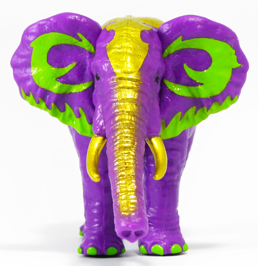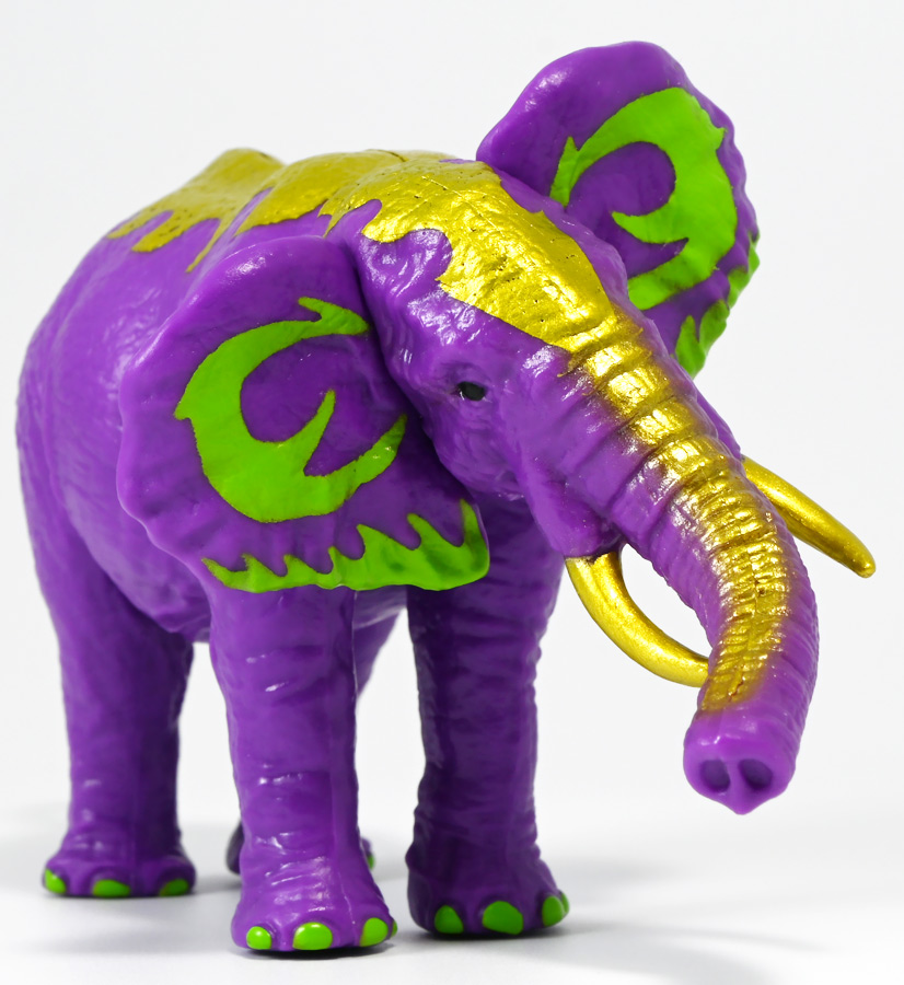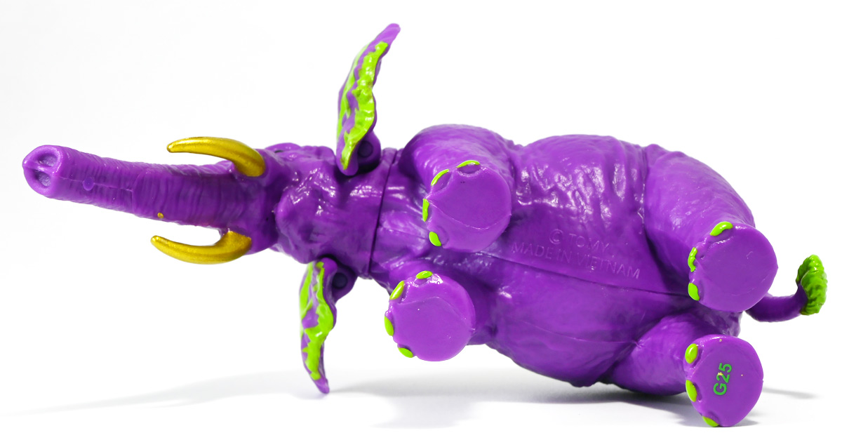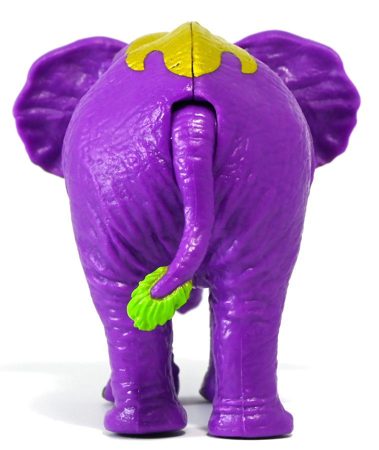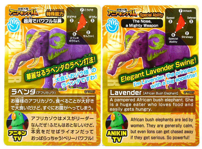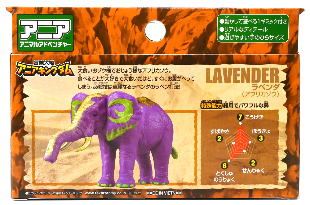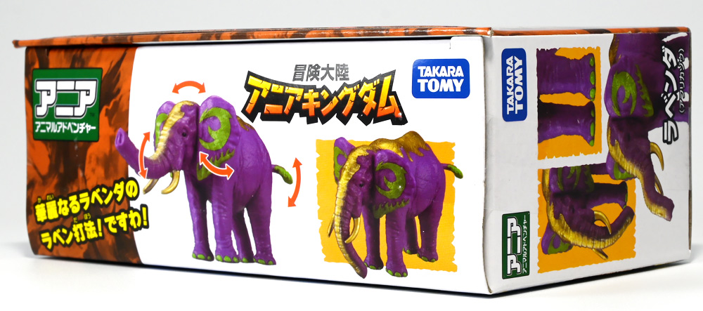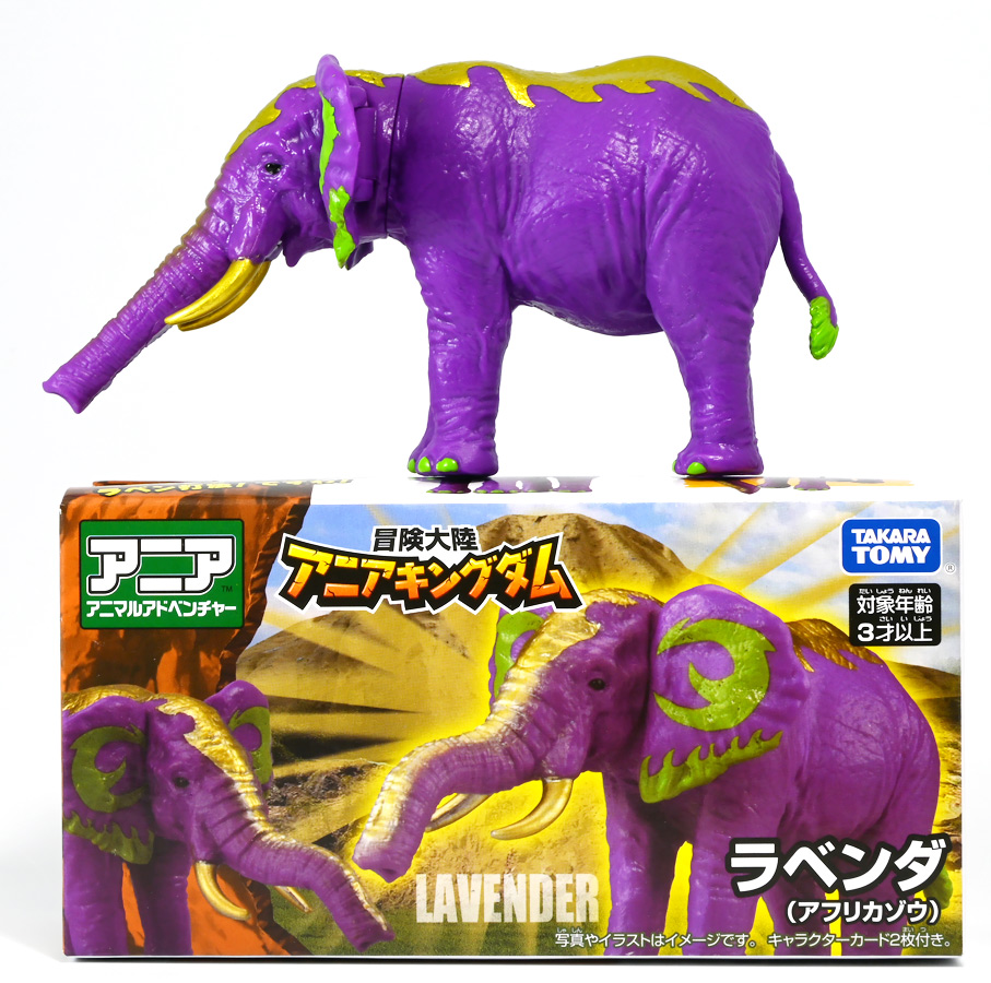 ■冒険大陸 アニアキングダム ラベンダ(アフリカゾウ) ![]() 2025年10月2日発売 / 1045円(税込) アニアキングダム第3期「キングゴールドマウンテン編」より登場するルッタ達の新しいお友達、 アフリカゾウのラベンダが本物アニアになって発売ぞよ! ![]() という事で、いつも通り劇中登場のコマドリ撮影人形とそっくり同じものが フィギュアとして玩具売り場に並んでいるのだ! ![]() 華麗なるラベンダの ラベン打法!ですわ! ![]() くちにいれない! ![]() 味方側のパケにはそれぞれ個別のストーリーが記載されているぞよ。 ![]() おまけのキャラクターカードが日本語と英語で二枚付属。 金のリンゴでパワーアップしたラベンダはこうげき7の限界突破! とくしゅも6となっており、頼もしい味方であるぞよ。 ![]() 金のリンゴでパワーアップを遂げたアフリカゾウのラベンダ! その名の通りラベンダーカラーに金の模様が浮かぶゴージャスな食いしん坊お嬢様ぞよ! ![]() 今日も平和なカワウソ村に、スピン&サベールが持ち込んだ金のリンゴ・・・ 食べると金色になってパワーアップできると言うからルッタ達は興味津々! 残り一個のリンゴを誰が食べるか競っていると、 お腹が減って倒れているアフリカゾウのラベンダと遭遇! カワウソ村に散乱するバナナの皮はこのラベンダが食ったものらしいぞよ・・・ な、な、なんと大食漢なのだーっ!! 困っている動物を見ると放っておけないルッタは、思わず金のリンゴをラベンダにあげてしまうぞよ。 するとどうした事だろう! これを食ってたちまちラベンダは黄金の光に包まれ、ラベンダーカラーにパワーアップ! 金のリンゴのパワーは本物だったのだ!! ![]() 「わたくしはラベンダ!大食いおゾウ様のラベンダでございまーすっ!」 という事でこのカラーリングはラベンダが金のリンゴを食べて変身したパワーアップ形態というワケぞよね! 変身シーンはさながら魔法少女の変身バンクかのくるくるキラキラで面白い。 「おじょう様」ならぬ「おゾウ様」な名乗りも可愛いぞよね! ![]() ALアフリカゾウの原型を元にラベンダーカラーの新彩色。 背中と牙が金色に変わっており、食欲もパワーアップ! 金のリンゴをもっともっと食べたいと言うラベンダの欲求に、 サベールとスピンは「キングゴールドマウンテン」には金のリンゴが沢山なっていたと教えてくれる。 かくしてルッタ達はラベンダと共に、キングゴールドマウンテンの山頂を目指して出発するのだった! ![]() しかし、道中には様々な妨害が待ち受けていた・・・! 金のリンゴを守るキングゴールドトリオが攻撃を仕掛けてきたのだ! ルッタ達はラベンダを初めとする新たな仲間と共に、この困難を乗り越えてゆくが・・・!? どうなる、「キングゴールドマウンテン編」!! ![]() トップ。 金ピカ彩色が格好可愛いぞよね! ![]() ボトム。 紫を基調に緑の差し色がアクセントとなっているぞよ。 ![]() アニアはワンアクション付きの動物フィギュア! ラベンダは首・耳・尻尾が可動する他、 最大の特徴である鼻がベンダブル仕様となっており、 ぐにぐにと自在に曲げる事が出来るぞよ! ![]() このベンダブル仕様によってこれまでにない柔軟な可動を実現。 要は軟質素材の中に針金の骨が入っており、ポーズをつけたまま固定できると言う仕組みぞよね。 一見すると繊細そうだが、ま〜そんなに神経質にならずとも良いだろう! ![]() 上下は勿論、こんな風に左右に振ったり、柔軟で活き活きとしたポージングが可能となっている! ![]() 意外とこのベンダブル仕様はアニアでは珍しいのだ! 恐竜の尻尾とか竜脚類の首とかベンダブルになっても良さそうですけどね。 ![]() ラベンダは「AL-26 アフリカゾウ(2024年5月)」の原型を元にしたアニメ版彩色。 劇中でも右のALアフリカゾウとして登場し、ルッタに金のリンゴを貰って左のカラーに変身しているぞよ。 という事でギミック等もAL-26を踏襲している。 ![]() ルッタ達が出会ったのははらぺこおゾウ様のラベンダ! 一個しか残っていない金のリンゴだけど、見過ごせないルッタは気前よく分けてしまうぞよ。 ![]() 金のリンゴを食べたラベンダはゴールデンにパワーアップ! ルッタ達の仲間に加わると、共にキングゴールドマウンテン山頂を目指して旅立つ事に! ![]() そこへキングゴールドトリオのガブール&シソッチコンビが強襲! 「あっちこっち、シソッチーっ!」 「ガブールスーパー・バッティング!」 連携技で木の実攻撃を繰り出して来た! 大慌てのルッタ達だったが、パワーアップしたラベンダ必殺の「ラベン打法」で撃ち返し撃退! しかし運動してお腹が減ってしまったラベンダは、 ガブール&シソッチの残した木の実でランチ休憩。 一時パーティーを離脱する事となるぞよ。 「キングゴールドマウンテン編」はこうして毎回新たな仲間が登場し、 キングゴールドトリオの妨害を一つ一つ潜り抜けてゆく、というフォーマットで進んでゆくのだ! ![]() そんなラベンダ、実は「キングゴールドマウンテン編」配信前に、 
