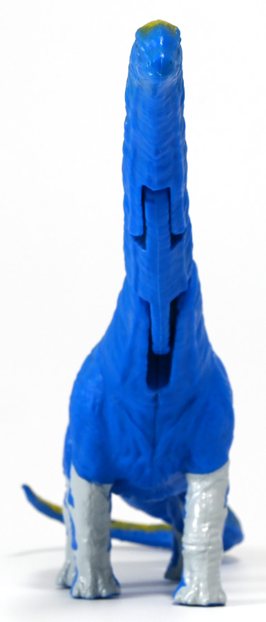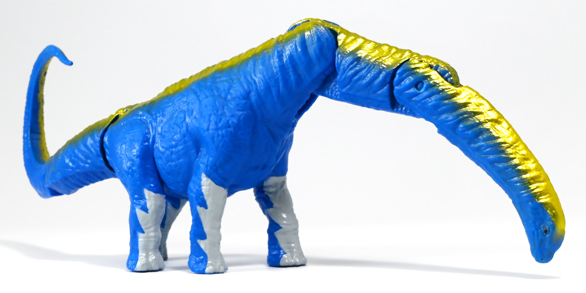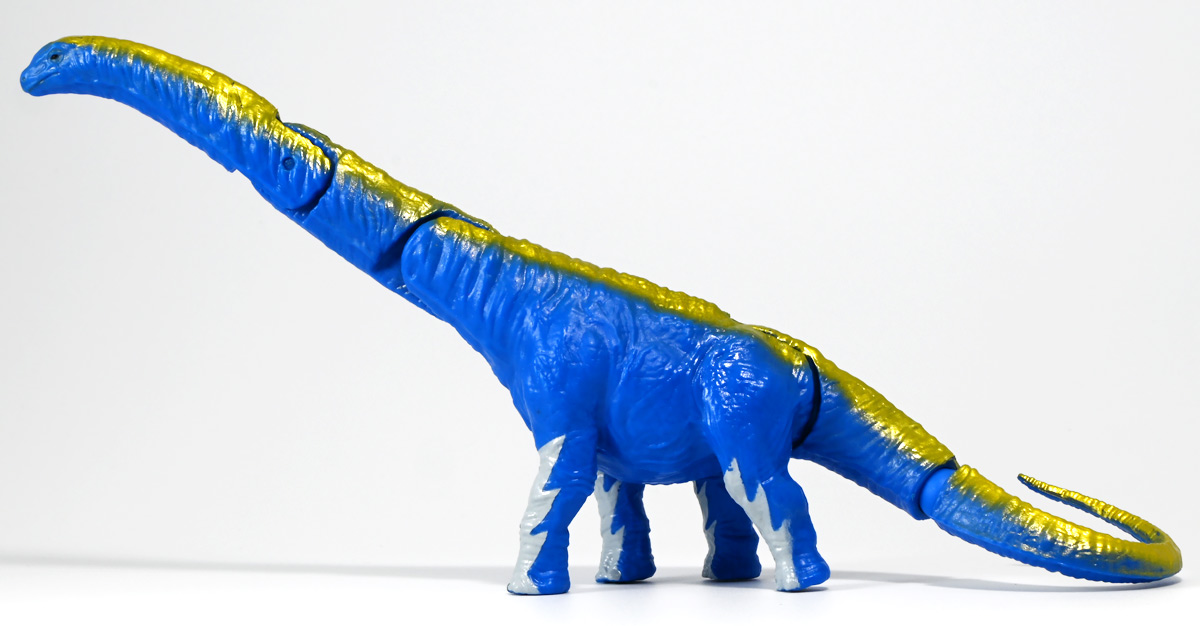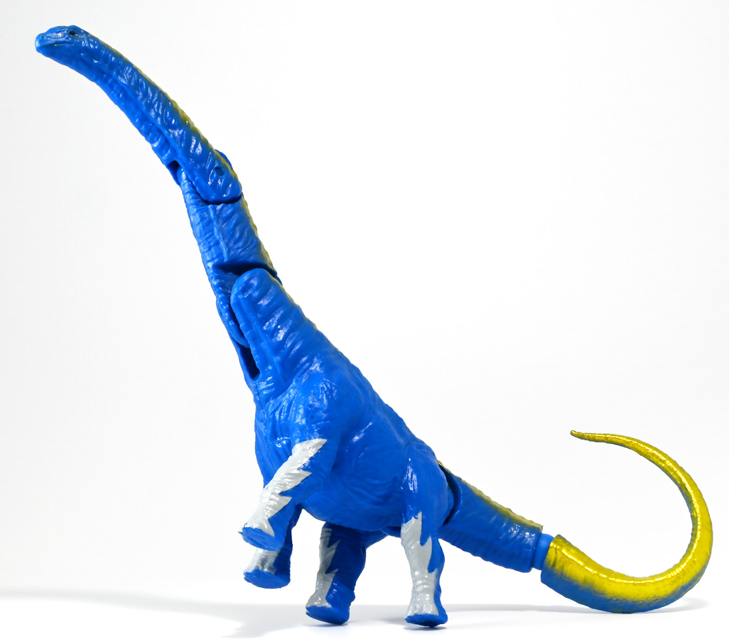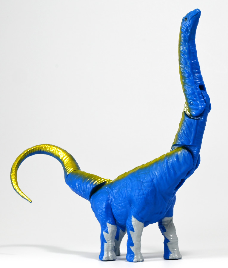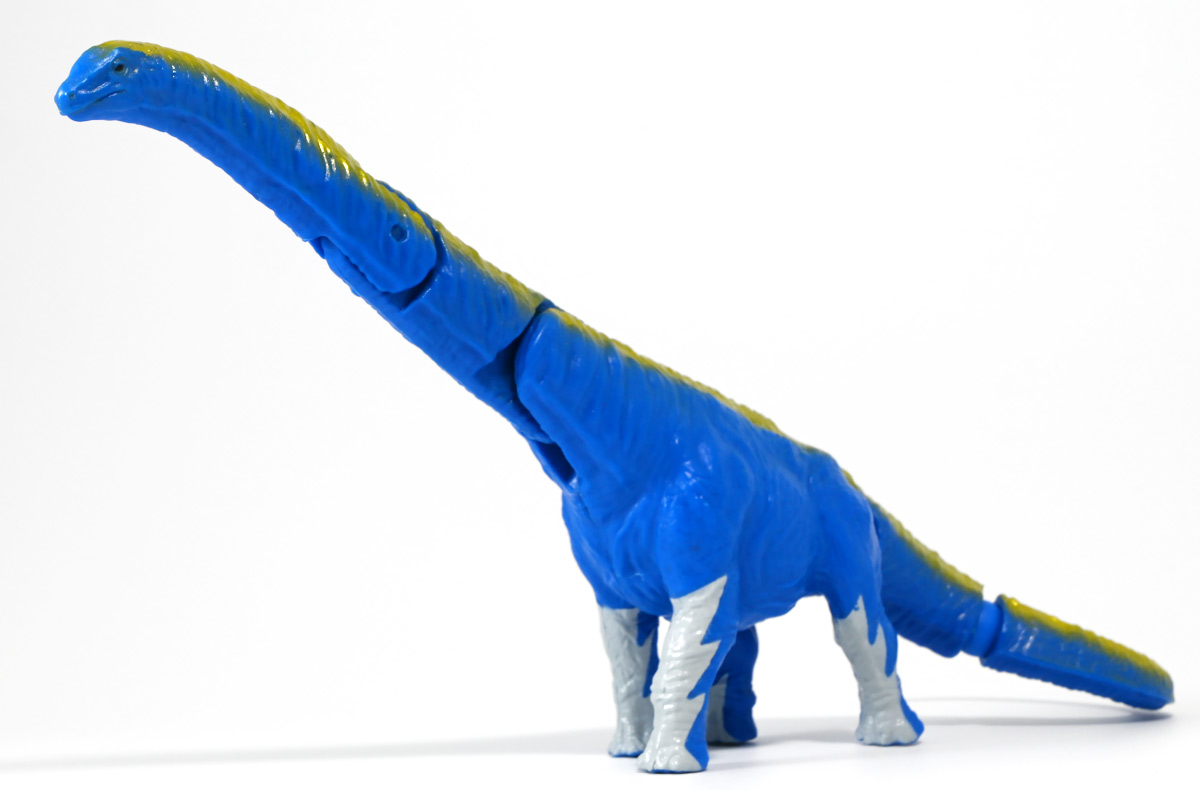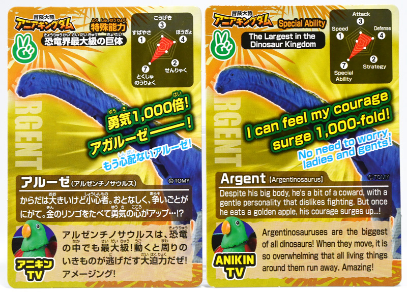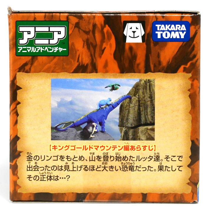 ■冒険大陸 アニアキングダム アルーゼ(アルゼンチノサウルス) ![]() 2025年10月2日発売 / 1045円(税込) アニア史上最大級のサイズ感を誇るアルゼンチノサウルスが、 「アニアキングダム」のネームドキャラになって登場ぞよ! ![]() パケはいつものALサイズ相当ですが・・・、 ![]() ご覧の通り分厚いんです! これでお値段据え置きはお得ぞよね!? ![]() 勇気1000倍! アガルーゼー! ![]() ルッタの新たな仲間達のパッケージには専用ストーリーが記載。 使われているジオラマ背景は劇中と異なり、 玩具スタッフが撮影した(?)ものが使用されているぞよ。 よく見るとアルーゼの模様も製品とちょこっと違うように見えるので、試作品のようだ。 ![]() キャラクターカードが日本語と英語で二枚付属。 とくしゅのうりょくが限界突破の7となっているぞよ! ![]() 史上最大級の竜脚類、アルゼンチノサウルスがアニアキングダムに生息していた・・・!? 「キングゴールドマウンテン編」で初登場したアルーゼが、 劇中そのままのアニアフィギュアで玩具売り場に登場ぞよ! ![]() ご覧の通り青に金の差し色が光るアニメ版彩色。 この姿は緑のアルゼンチノサウルスだったアルーゼが金のリンゴでパワーアップした変身形態ぞよ。 ![]() 金のリンゴが実ると言うキングゴールドマウンテンの山頂を目指して旅を続けるルッタ達。 一行が崖の麓までやってくると、そこに山と見紛う程の巨体を聳えていたのは、 アルゼンチノサウルスのアルーゼ! そのあまりの巨大さに、ブレイズは「なんだか強そうなやつだな!」と期待するも・・・ アルーゼは気弱で心の優しい竜脚類だったぞよ! ![]() 「僕には戦う勇気がないアル〜ゼ〜」と弱気なアルーゼを、 いつもの調子で語気も荒く怒鳴りつけようとするブレイズ。 小さな体にも対等にそれをたしなめるハートの勇気にアルーゼは尊敬の眼差しを向けるぞよ! しかし、そんなアルーゼにも冒険に活かせる長所があった! みんなを岩に乗せたまま長い首で持ち上げてくれたら、この崖も一度に登り切る事が出来るではないか・・・! 劇中では高くそびえる「崖」だが、 遠景ではプレイセット「キングゴールドマウンテン」の「エレベーター」部分に当たるエリアである事が描かれている。 つまりアルーゼの当番エピソードは、プレイセットのギミックを汲んだストーリーと言う訳ぞよね! ![]() しかし、力一歩及ばずのアルーゼではみんなの体重を持ち上げる事が出来なかった! そこでラプルがフレイムへの献上用に持っていた金のリンゴをパクリ! アルーゼは金色にパワーアップし、力も1000倍! みんなを崖の上に押し上げる事に成功したぞよ!! なんとかキングゴールドマウンテンへ足を踏み入れる事が出来た一行は、 次に「ぐらぐら橋」エリアへ。 ここでもガブール&シソッチの妨害にあうも、 アルーゼとハートの合体技、「ローリングハートちゃんアタック!」が炸裂!! 二匹を一撃で吹っ飛ばした! 小さなハートから大きな勇気を貰ったアルーゼは、ちょっぴり自信がついたのでした。 ![]() トップ。 超ロングなアルゼンチノサウルスは23.5センチ級。 金のリンゴの影響で背中が金色になりました。 思えば二期の「伝説のガーディアン編」にも金ピカ彩色の恐竜「ベナージャ」が登場していたが、 彼女も金のリンゴを食べてパワーアップしていたのかもしれないぞよね・・・。 ![]() ボトム。 ネームドキャラになってもそのビッグサイズは健在ぞよ! 尻尾が曲がっているので、本当は更に全長が長い事になるぞよね! ![]() アニアはワンアクション付きの動物フィギュア! アルーゼは首が二か所と尾が一か所スイング、更に尻尾の先は軸入りボールジョイント可動となっているぞよ! ![]() 劇中でもこのスイング可動を存分に活かしたストーリーが展開されていた。 「キングゴールドマウンテン」の「エレベーター」と「ぐらぐら橋」ギミックを汲んだ内容で、 プレイセットと組み合わせたごっこ遊びも捗るぞよ! ![]() 大きな体に優しい心を目一杯詰め込んだ、 ルッタ達の新たな仲間ぞよ!! ![]() 本商品は「AL-24 アルゼンチノサウルス(2024年3月)」の原型を使用したアニメ版彩色。 劇中でもアルーゼは右の緑の通常カラーアルゼンチノサウルスとして登場し、 金のリンゴを食べて左のゴールドバージョンにパワーアップしているぞよ! って事で以前に買った通常カラーのアルゼンチノサウルスもごっこ遊びで活躍できるのが嬉しい内容なのです! ![]() キングゴールドマウンテン山頂を目指すルッタ達が出会ったのは、 超巨大竜脚類のアルゼンチノサウルス! さぞ強力なパワーを秘めた重量級ファイターと思いきや・・・ その心は臆病で争いごとが苦手な小心者だったぞよ! ![]() しかし、小さな体でも恐竜に負けない強い心を持ったハートの振る舞いに感激し、 勇気を貰ったアルーゼは、ルッタ達の新しい友達として冒険に協力してくれたのだ! ![]() 長い首を活かしてみんなを崖の上まで運んでくれたアルーゼ! ・・・ちなみに本物のアルゼンチノ