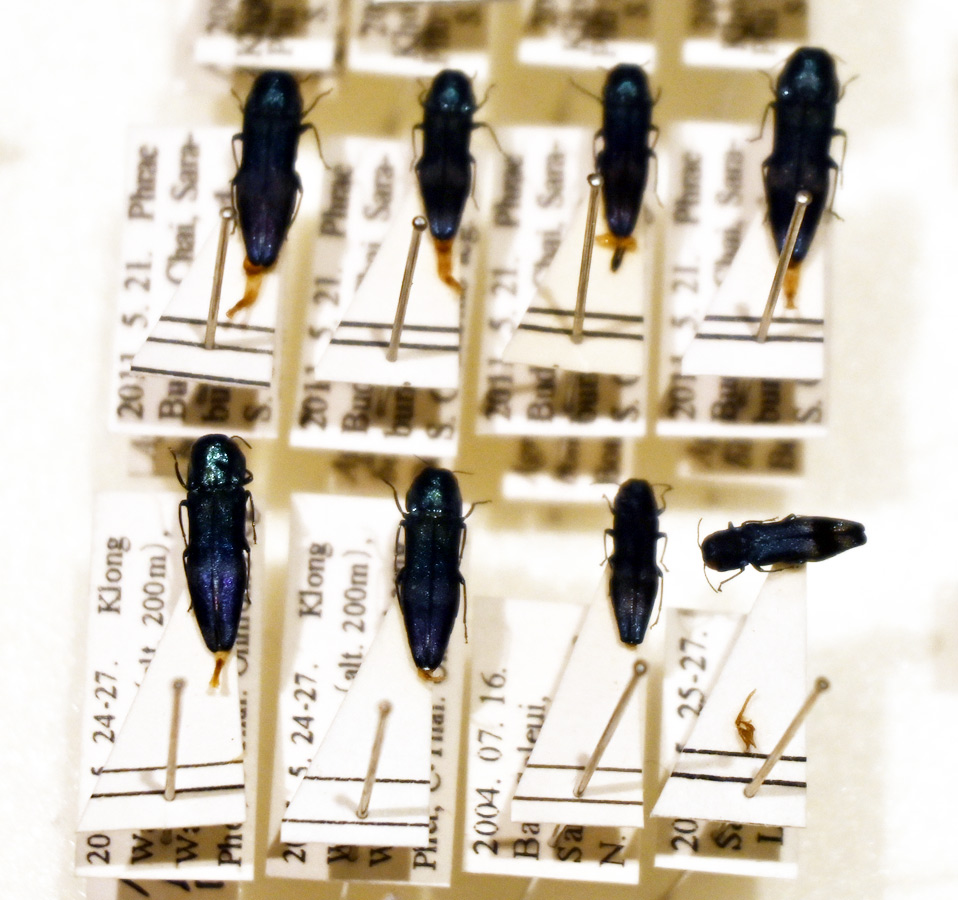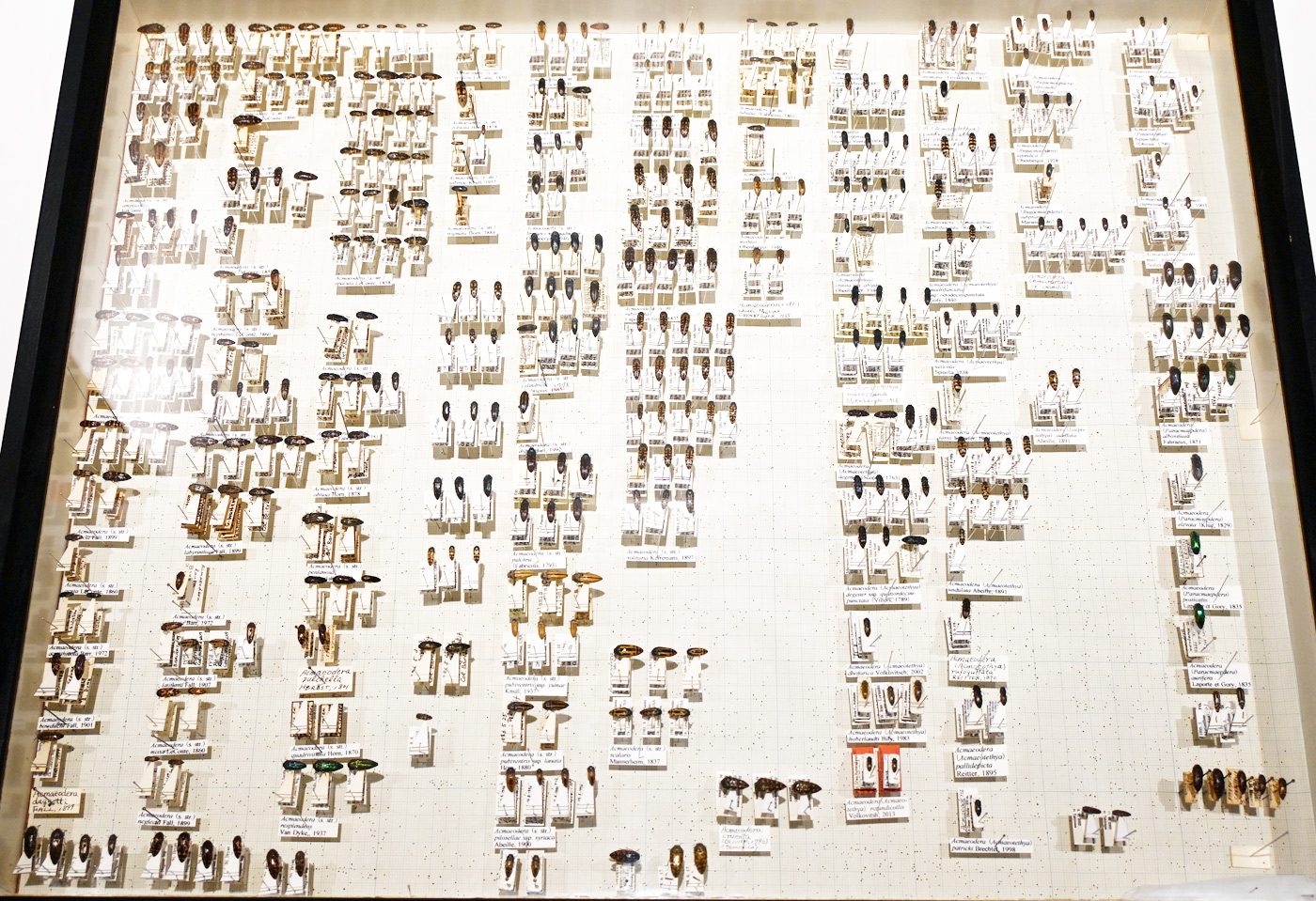 平置きされている標本箱の中にはこんな小さなタマムシ類がびっしりと詰められている。