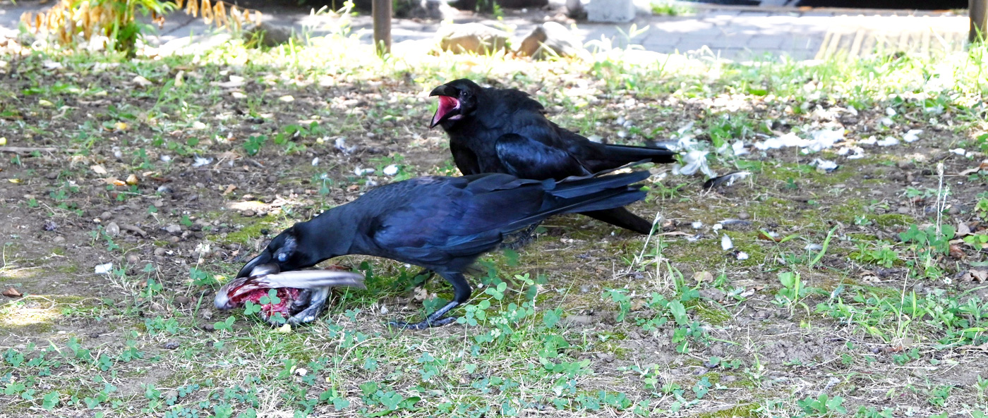 お、向こうでカラスたちが仲良くご飯を食べているぞよ。