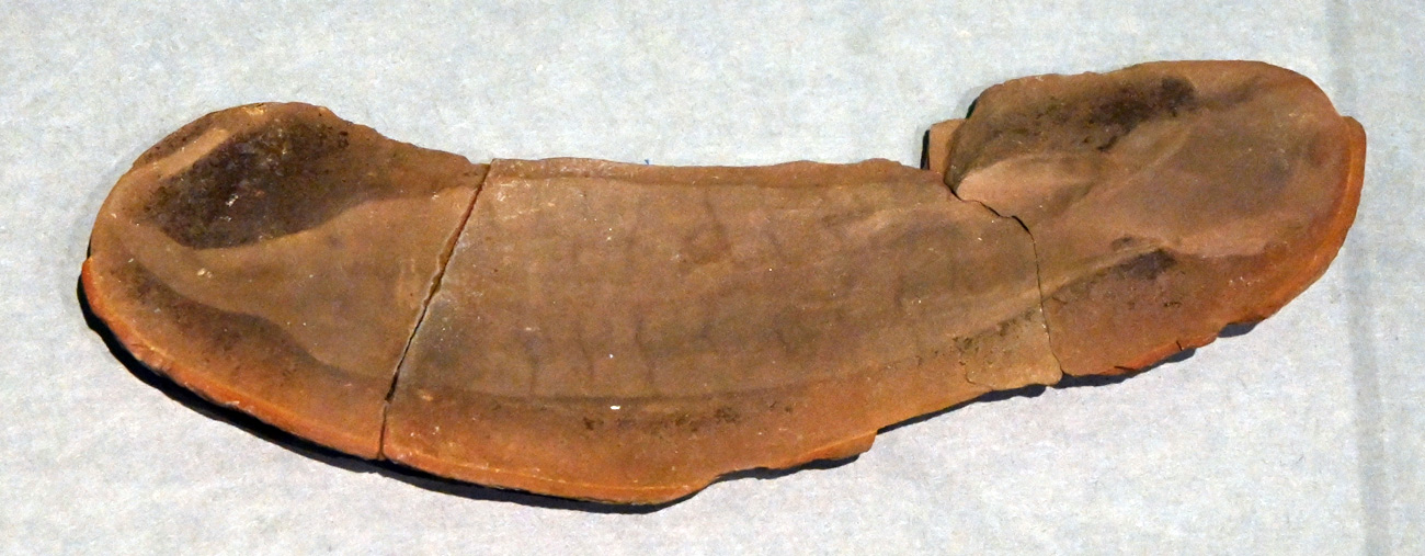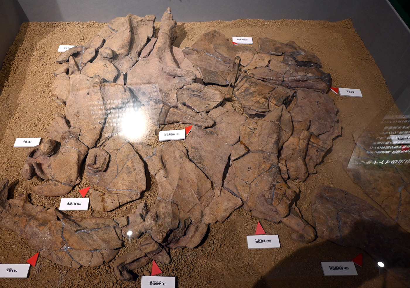 頭骨と胸甲がばらばらのぺったんこで化石に保存されている。