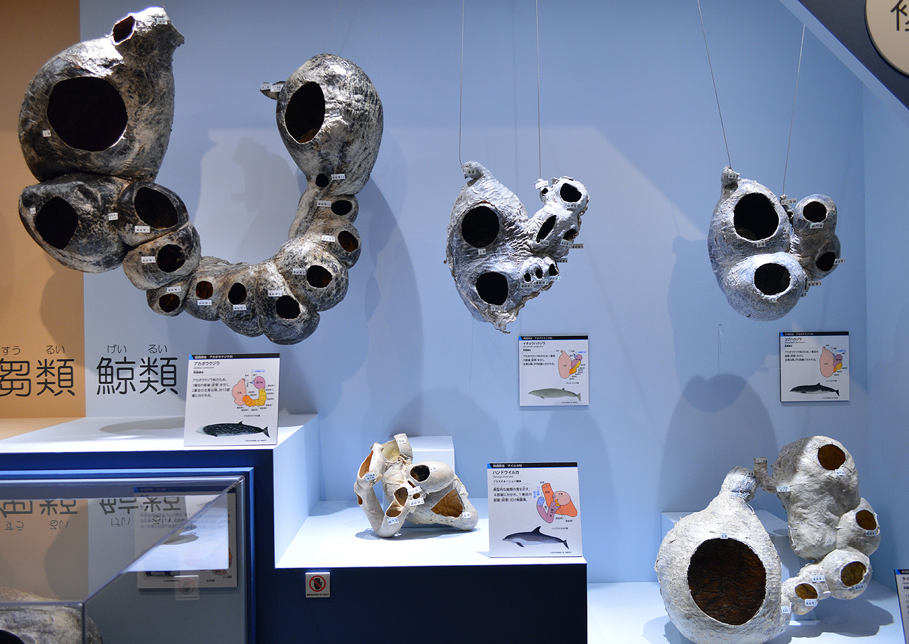 ここに飾られている哺乳類のスジイルカ、魚類のアオザメはそっくりな姿をしているが・・・、