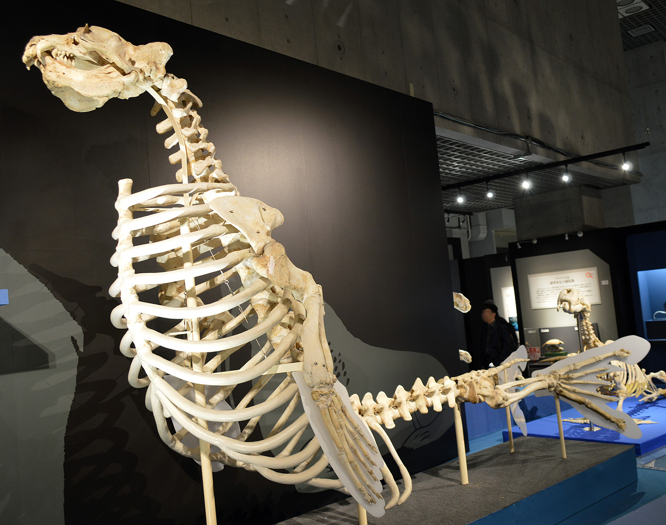 子供が親の尾やお尻を咥えて行列を成す「キャラバン」行動を取り、この全身骨格はその様子を再現したもの。