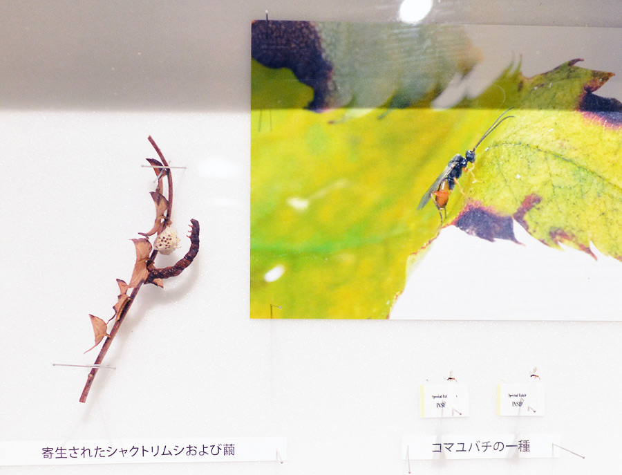 寄生バチである「エゾオナガバチ」の実物標本。