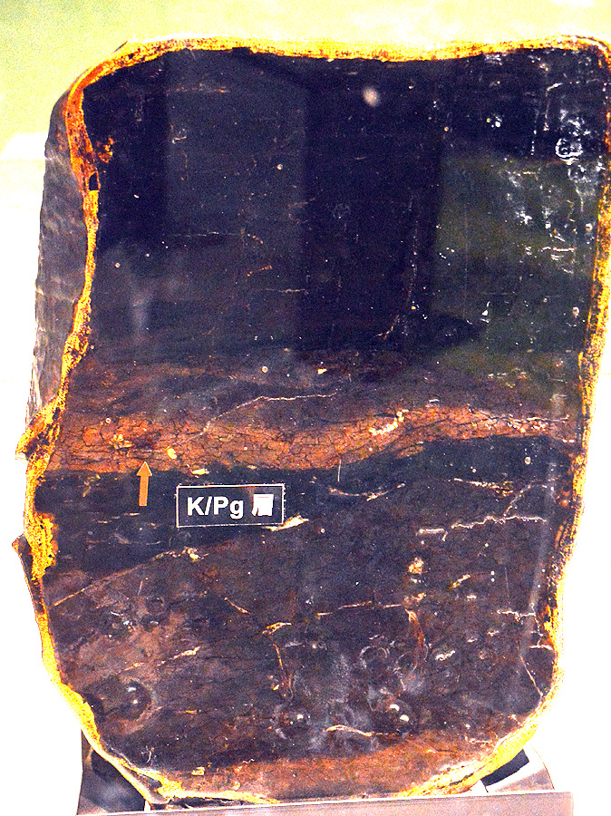 この矢印の部分が、白亜紀末に地球に巨大隕石が衝突し、地球全土に降り注いだ粉塵が降り積もった証拠ぞよ。