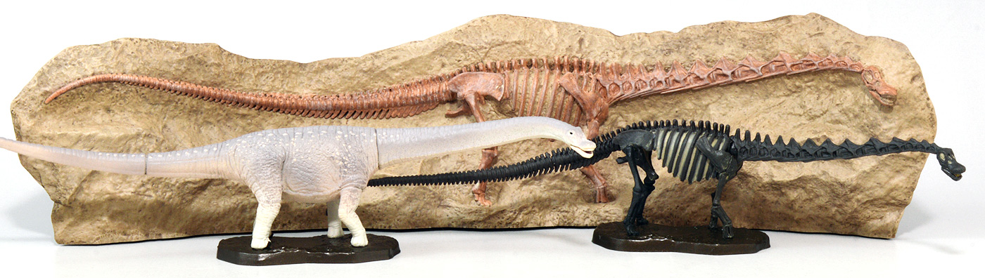 ラインナップは吉良かずや氏の手による「パタゴティタン(骨格モデル)」が通常カラーの黒と、化石彩色仕上げの2パターン、