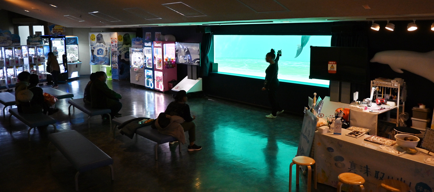 この休憩スペースは右手が「真珠取り出し体験」のワークショップ、左手が水族館ぬいをゲットできるクレーンコーナーとなっている。