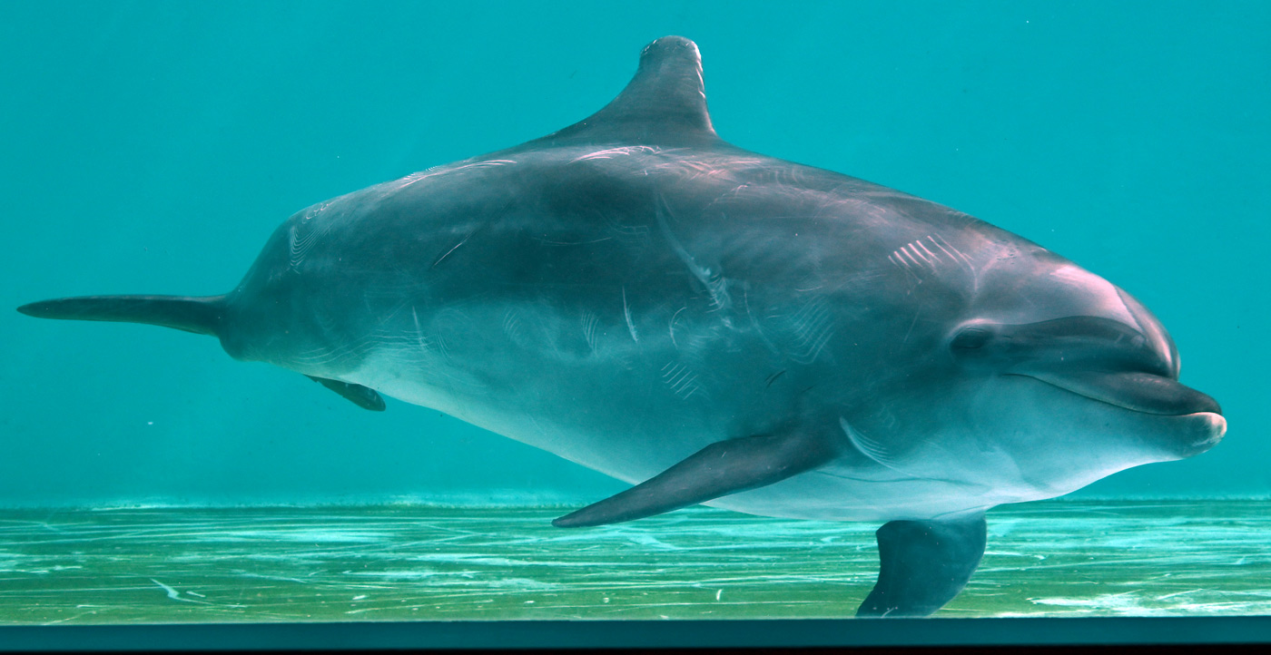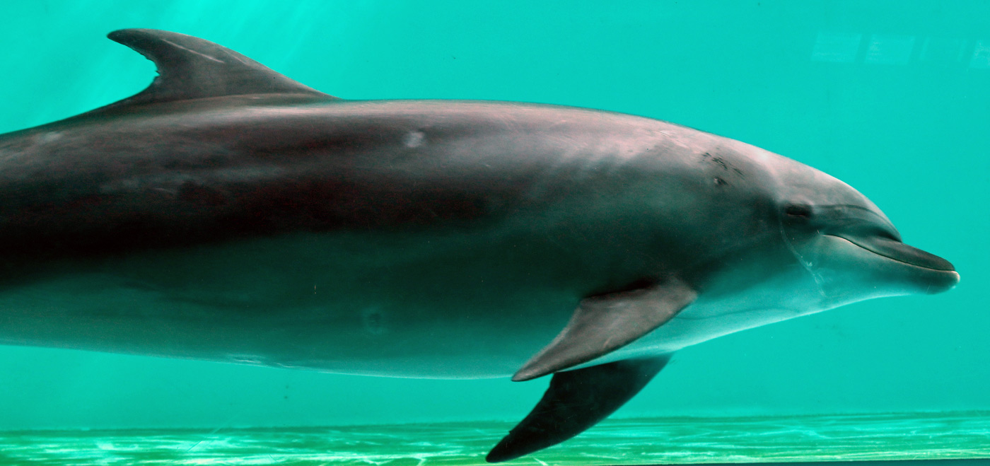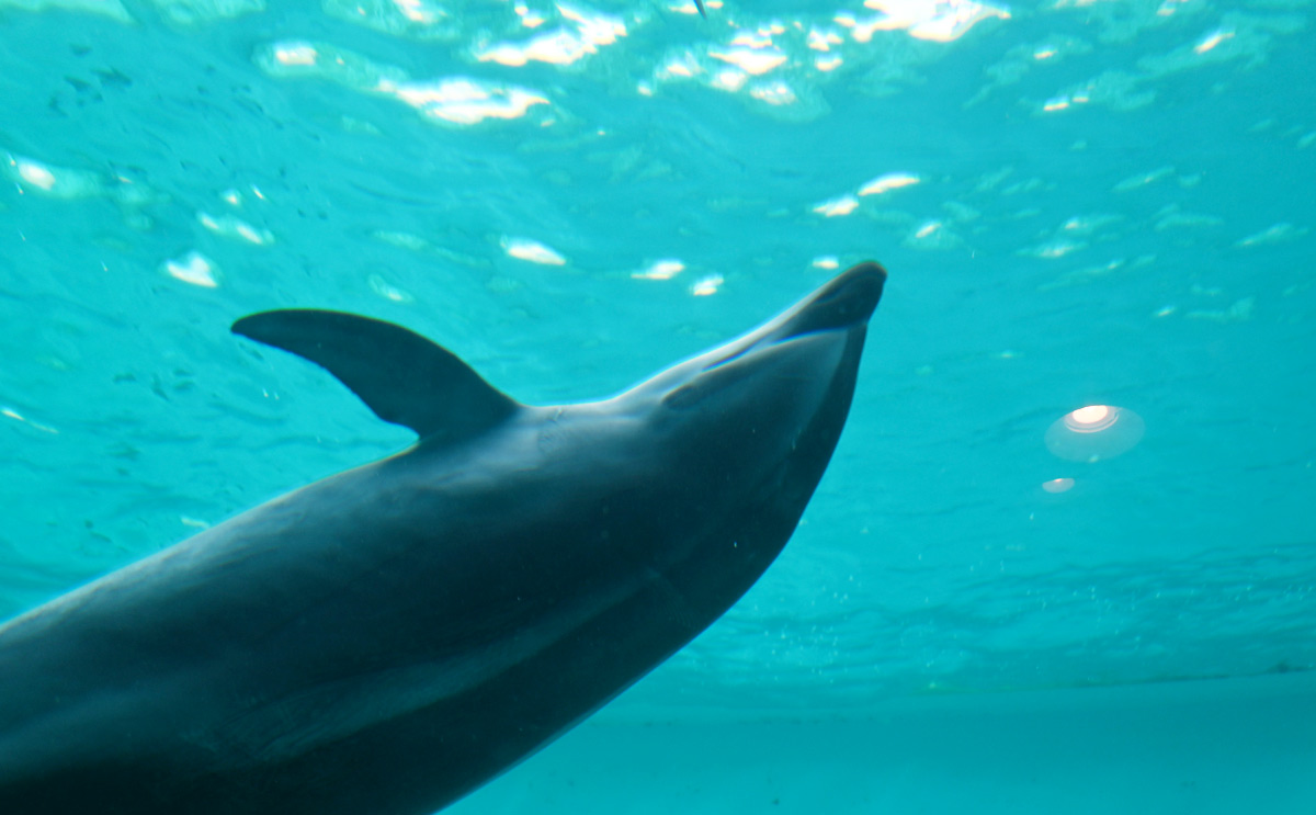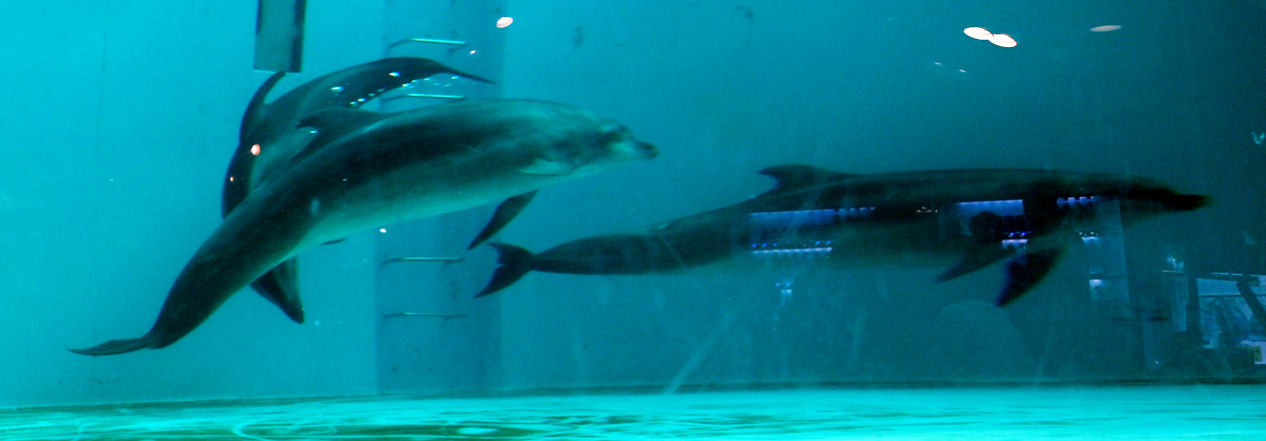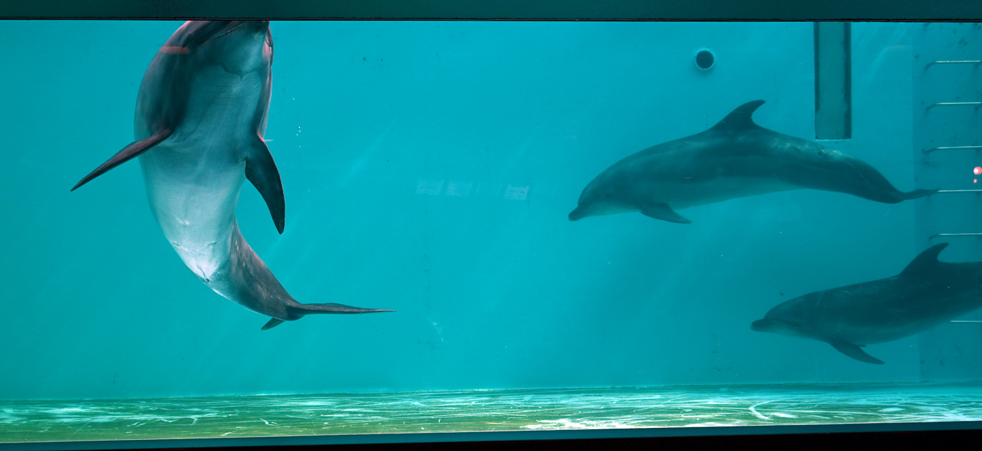 プールの正面からも水中のイルカが見物できたが、こちらはまさに泳ぐイルカの全身がはっきりと見える!