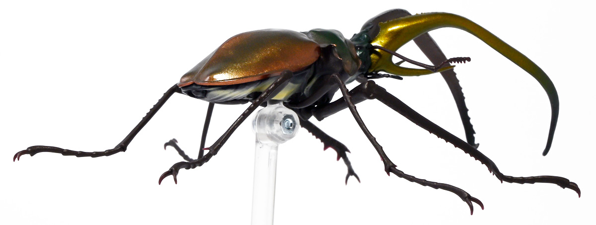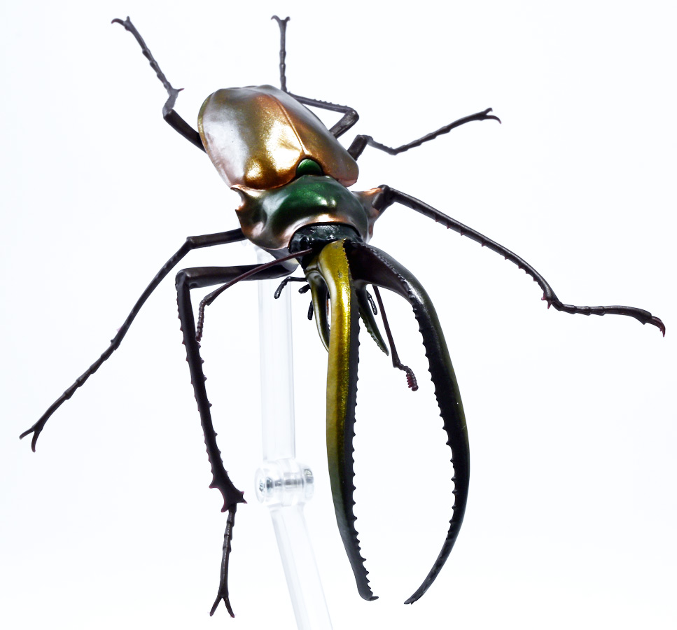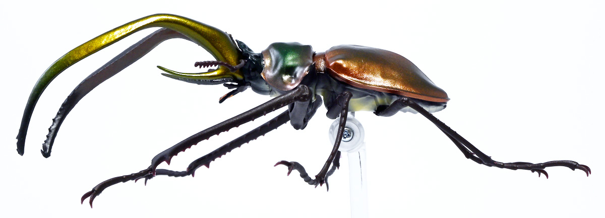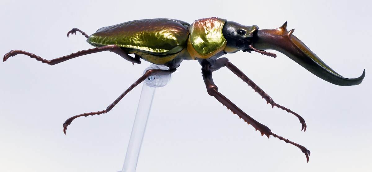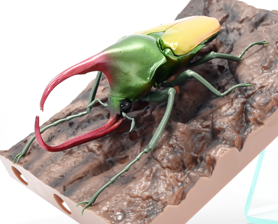 ■バンダイ いきもの大図鑑 くわがた10 樹皮台座(小)セット フェイスタメルシワバネクワガタ(メタリックグリーン) ![]() バンダイより、2025年4月3〜20日までガシャポンオンラインで受注の後、 6月下旬に発送された一回650円のオンラインガチャ。 「くわがた10」のオンライン版ぞよね! 中身はいつも通りカプセル入りでなくこんな袋入りで届きます。 ![]() 筐体版500円に対しオンライン版は一回650円となっているが、 おまけとして新規造形の「樹皮台座(小)」セットがついてくるぞよ。 中身の昆虫造形は筐体版と同じだが、 オオクワ蛹のみオンライン版は「羽化直前カラー」となり仕様に違いがある。 ![]() それでは開封! こちらはフェイスタメルシワバネクワガタのメタリックグリーンカラーだ! 名前もややこしければ見た目も奇怪なモンスタークワガタぞよーっ!! ![]() フェイスタメルシワバネクワガタはペルー、ベネズエラ、コロンビア、エクアドル、ボリビアなどの アンデス山脈高地の熱帯雨林に生息する南米産シワバネクワガタ属の正真正銘のクワガタムシ! 全長は最大で8センチになり、南米のクワガタではチリクワガタに次ぐ大型種となっているぞよ! チリクワガタは大顎が極端に長く全長も伸びているが、 本種は体長5センチクラスで体だけ言えばチリクワガタよりも大きくなる。 ![]() その名の通り前翅の表面に皺が入り、 全身にもふもふの毛が生えているのでシルエットも相まって 宇宙生物の如き実に奇天烈な姿の奇虫であるぞよ。 わたくしはこういう奇虫の玩具が大好きなので今回では一番のアタリって感じぞよね! ![]() 南米大陸のシワバネクワガタ属は28種知られているが、シノニムが紛れていてホントのところはよく判らん。 これとチリクワガタ属、そしてオーストラリア大陸のムナコブクワガタ属、 南アフリカのマルガタクワガタ属は近縁で、 昔大地がゴンドワナ大陸として地続きだった頃に共通の起源を持つと考えられているぞよ。 フェイスタメルシワバネクワガタはシワバネクワガタ属の代表格であり、 緑色の金属光沢を帯びるものと、紫色に光るものとが知られている。 ![]() 本商品はそんなフェイスタメルの緑色っぽい個体をモチーフとしているというワケ。 原型は株式会社JMCの手による実物標本のCTスキャンから起こされており、 彩色はこちらも三浦二郎氏の設計だ。 ![]() いつもは脚が無彩色で味気ないのだが、本商品はなんとメタリック成型色になっている! ま〜リアルかと言うとまた違うがなかなか面白い仕様ではないか〜! また、前述の通り本種は特に大顎から胸部にかけてもふもふの毛を纏うが、 造形ではオミットされているぞよ。 こりゃしょうがない部分ぞよね。 ![]() お腹側は毛の表現が再現されている! しかも彩色もかな〜り凝っていて豪華な仕上がり。 500円でこれはお買い得ですぞよ! フェイスタメルは国内にもちょこっと入ってきており生体の流通があるようだが、 やはり成虫の期間はごく短く、飼育方法も確立されていない為累代は困難。 かなり高級みたいぞよ。 しかし現地では結構普通に見られるらしい。 ![]() このフェイスタメルシワバネクワガタもやはり複眼が眼縁突起で区切られていて目が四つあるように見える。 もうここまで分離しちゃってると円らなおめめに見えてキュートぞよ。 ![]() 1年前に出たチリクワガタと並べて〜。 ご覧の通りこの2種、およそクワガタに見えない奇妙な特徴が良く似通っている! 先にも申した通り、シワバネクワガタ属もチリクワガタ属もゴンドワナ大陸起源の共通祖先をもつとされ、 中でも二つは系統樹に並べた時に隣り合う姉妹群と考えられているぞよ。 ![]() そして、ガシャポンオンラインだけの特典。 +150円で立派な樹皮台座(小)がおまけに付いてくる!! こりゃどう考えてもオンライン版の方がお得だが、必ず送料660円がかかるのは玉に瑕。 ま〜電車賃と思えば安いもんだ! ![]() 今回初登場の樹皮台座小、従来の止まり木台座の発展形と言った感じで、 裏面には連結ジョイントが格納され、径は汎用台座と共通であるなど拡張性も高い。 ![]() 連結ジョイントで左右上下に拡張可能! 集めれば集める程楽しい台座となっているぞよ。 ![]() 虫固定用のピンも3mmピンと4mmピンが付属し、 使わないときは左右の窪みに格納可能と至れり尽くせりな仕様となっている。 ![]() さっそくフェイスタメルを飾ってみよう! お〜っ! なんと雰囲気のあるビジュアルだろう! まるで博物館の展示模型のようではないか〜っ!! ![]() いきもの大図鑑は標本再現を越え、情景と共に飾る時代へ・・・っ! これが650円ってこのご時世に太っ腹すぎるぞよ・・・。 やっぱり版権料が無いのがデカいのか!? ![]() フェイスタメルシワバネクワガタは実物8センチに対し全長約12センチの拡大サイズで立体化。 可動箇所は12箇所となっており、歪曲した大顎も勿論開閉可能ぞよ! ![]() 勿論他の昆虫達も虫ピンで合体できますよ。 更に汎用台座をベースにする事で立たせた状態で安定し