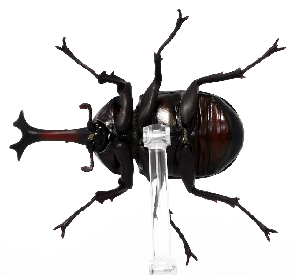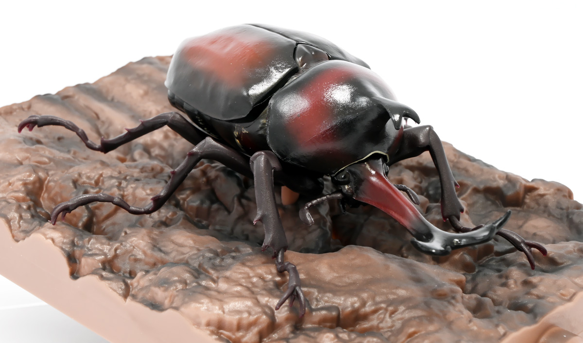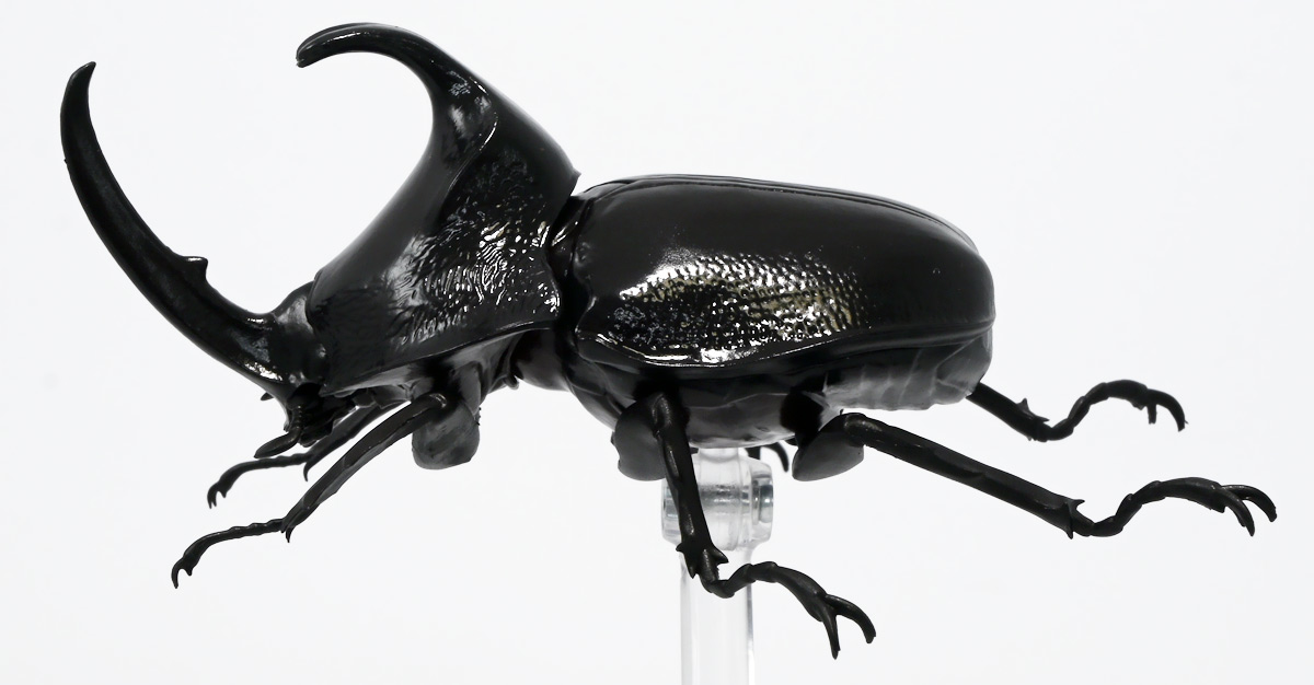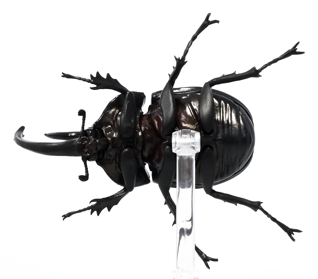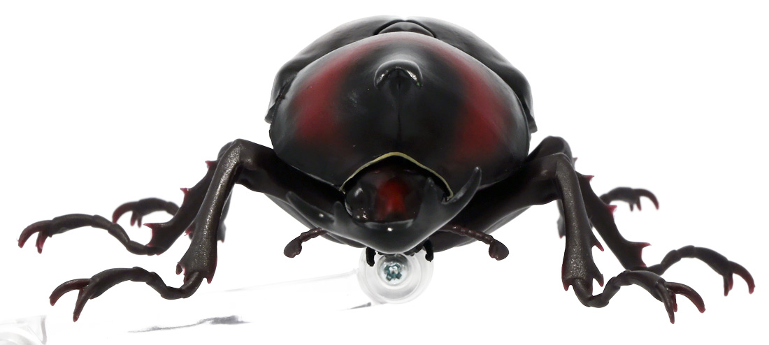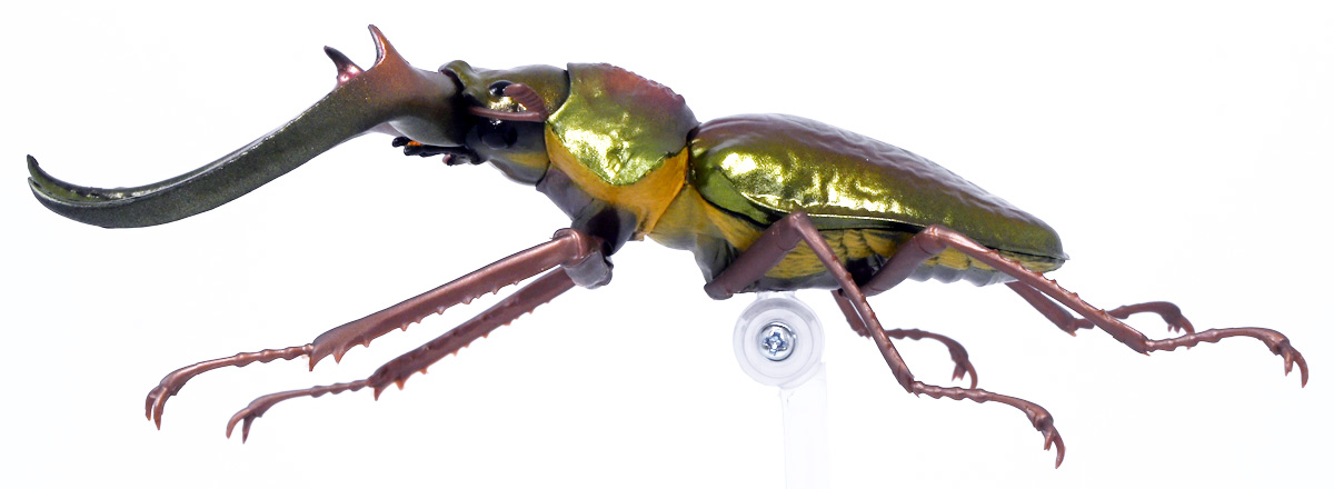 ■バンダイ いきもの大図鑑 かぶとむし09 パンカブト(ロング/ショート) ![]() バンダイより、2025年8月第4週登場の一回500円ガチャ、 この弾でわたくしが最も欲する狙い枠は無論の事、奇虫「カブトハナムグリ」であるぞよ! なにせ当選率15%枠はアソートに3個しか入っていないので狙うとかなり引きにくい。 一回500円ではお財布へのダメージも苦しいが・・・さて何が出た!! ![]() 「パンカブト(ロング)」・・・ッ!! 当選率20%、即ち筐体に4つ入っているハズレ枠ぞよーっ!! 同率では「ヘラクレス・オキシデンタリス」も4つ入っているが、 あちらは彩色が極めて凝っており、また体格も立派で格好良くハズレ感がないが、 こっちは彩色も目立たず黒一色の名実ともにハズレ枠となっております。 とほほぞよーっ!! ![]() 気を取り直してみてゆこう! 南米で広く見られるパンカブトは1属1種しか知られていない珍しいカブトムシであるぞよ。 つまりこれもまた奇虫と言って良い種で、ハズレ枠と言ってもわたくし好みのなかなか通な選出! 特に玩具にラインナップされる事は珍しく、 CTスキャン原型の標本再現と考えれば全く損した気分に実はならないのだ! 食傷気味のヘラクレスより余程価値があると言えるだろう!! ![]() 学名からエネマパン、あるいはパンサイカブトなどとも呼ばれるパンカブト、 サイカブトとつくようにパンカブトも広くはサイカブト族に分類されるが、 サイカブトはサイカブト属なのでパンカブト属のパンカブトとはよく似た同じグループの親戚と言ったところ。 パンカブト最大の特徴はご覧の通り立派な頭角と胸角で、すっと伸びるものと二股が現れるものとがいる。 本商品は頭角の先が二股になっているぞよね! パンカブトやサイカブトの面白いのは、なんとメスも小さな頭角を持っている事ぞよ。 ご存知カブトムシはオスは立派な角を持ち、メスでは持たないのが普通なので、これはとても珍しい特徴だ。 ![]() またパンカブトの特徴には足が貧弱で短い事も上げられる。 どうやら樹上性でなく地面で活動するカブトムシのようだが何せ珍しい虫なのでほんとのトコはよく判らんぞよ。 飼育下ではフセツがポロっと取れてしまう事もしばしばあるみたい。 本商品は恐らく前脚は専用造形で繊細さが再現されているが、 中・後脚は普通のカブトムシの流用でちょっと逞しすぎるように見える。 サイカブト族では過去に「かぶとむし06 オオツノメンガタカブト(2024年4月)」も登場している。 これは脚も繊細な専用造形が使われており、本商品に使いまわせなかったんか?とも思うが、 パンカブトの方が本体サイズが大きく、同弾ヤマトカブト級なので通常カブトの足を流用しなくてはならなかったのだろう。 ![]() パンカブトは頭の際やお尻、腹側などに結構毛が生えているのだが、 本商品では特にディテール・彩色表現されておらずつるんとしているぞよ。 ここがちょっとコストカット枠感あって寂しい感じ。 ![]() トップ。 胸や前翅は彩色されていないが、ざらざらつぶつぶのディテールが入っていて光沢で魅せる造形。 ![]() お腹側はほんのり茶色く彩色されており、全くの無塗装と言う訳ではないぞよ。 本弾も勿論お腹にはジョイント穴が開いており、汎用スタンドで展示する事が出来る。 ![]() オンライン限定の樹皮台座にも乗せる事が出来るぞよ! ま〜パンカブトは木登りは不得手のようですが、全く登らないと言う事もあるまい! ![]() パンカブトは実物だと9センチくらいと言われているが、本商品は全長10.5センチあって夢の超特大サイズ。 こちらも可動箇所は10ポイントとなり、簡易可動で表情付けが可能ぞよ。 ![]() こい・・・カブトハナムグリ・・・ッ!! って事で泣きのもう一回・・・ッ! ぐえ〜っ!! 色が黒い・・・こりゃハズレか・・・と思いきや、ロングパンカブトと袋の色が違う。 これは・・・!? ![]() なんと「パンカブト(ショート)」ではないか〜! パンカブトコンプしちゃったぞよーっ!! こちらは当選率15%でアソートに3つしか入っていないが、 ロングが4つ入っているので筐体の中身は合計7個がパンカブト・・・。 20個アソートだから回すと大体パンカブトかヘラクレスが出てくるのだ! ![]() ロングバージョンは頭角が二股、胸角がすっと弧を描いて伸びていたが、 こちらのショートバージョンは頭角がアーチ状、胸角が二股になっていて個体差を表現している。 頭角が短いのでこっちのショートは全長9センチとなっているが、脚や体はロングと共通パーツで出来ているぞよ。 ![]() 本弾共通の使用として、頭角、胸角は株式会社JMCの手によるCTスキャンから原型が起こされている。 今更なんだけど〜・・・多分実物標本をCTスキャンしてもそのままフィギュア原型には使えないだろう。 恐らくそれを元にデザイナーがCG原型を一から起こしていると思われるぞよ。 つまり正確なのはシルエットや各部の比率であると考えられる。 ま〜何れにしても実物標本の再現玩具である事には違いあるまい! 彩色