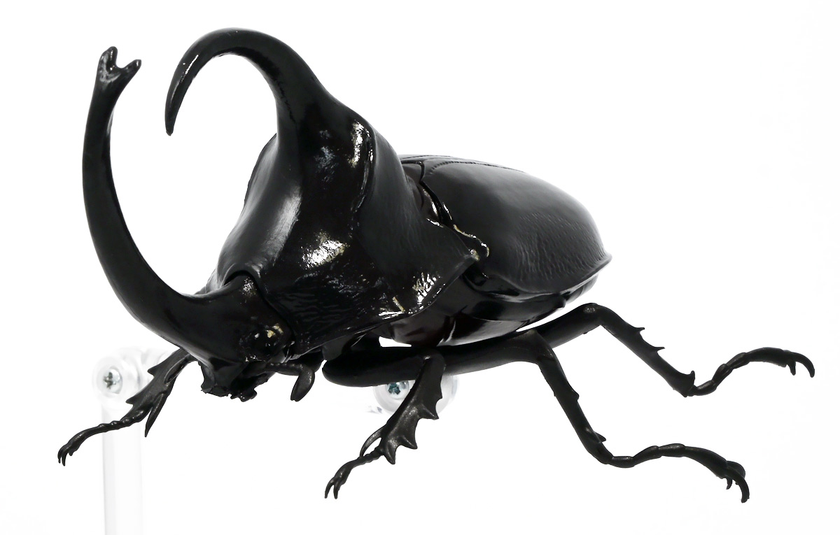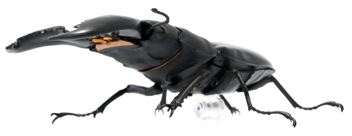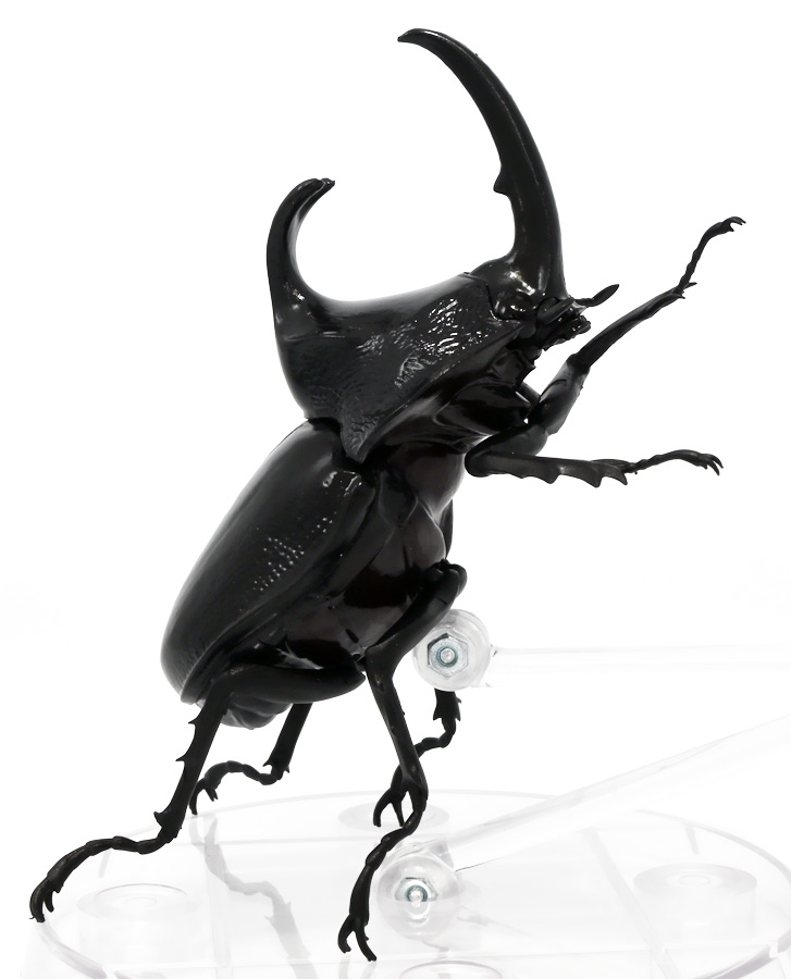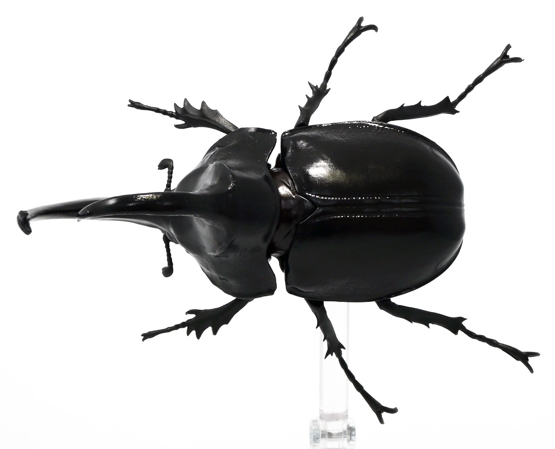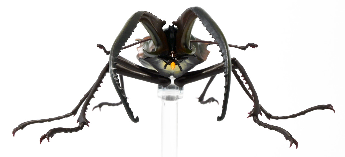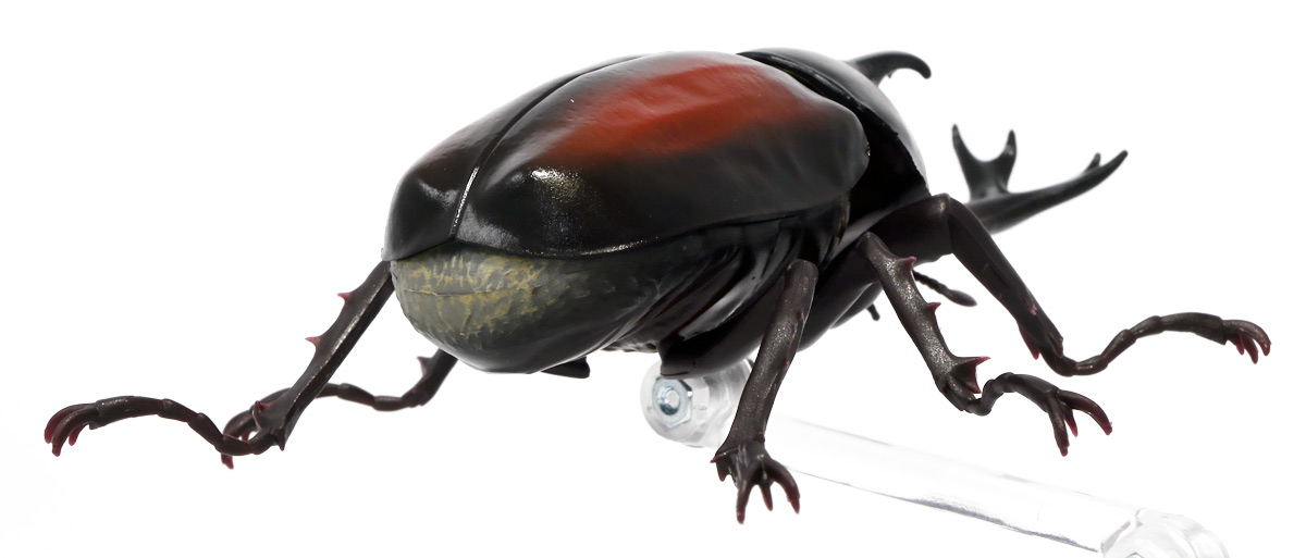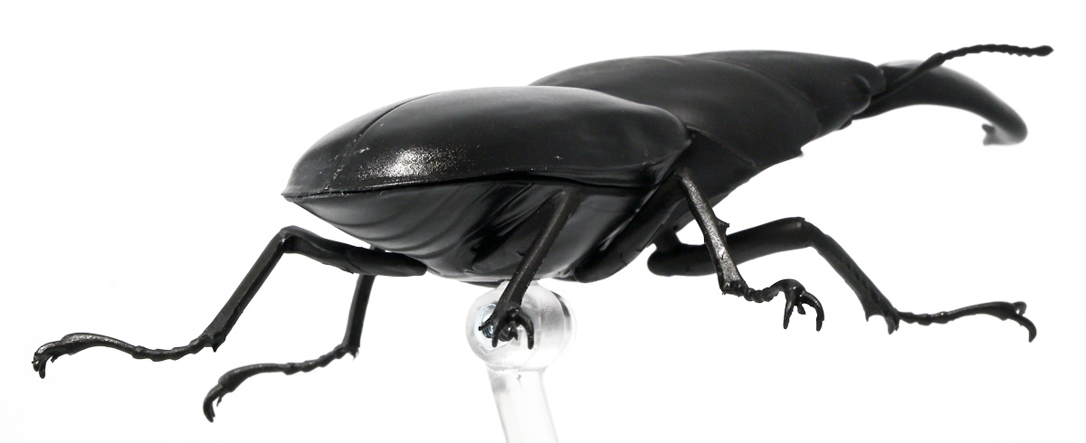 ■バンダイ いきもの大図鑑 かぶとむし09 パンカブト(ロング/ショート) ![]() バンダイより、2025年8月第4週登場の一回500円ガチャ、 この弾でわたくしが最も欲する狙い枠は無論の事、奇虫「カブトハナムグリ」であるぞよ! なにせ当選率15%枠はアソートに3個しか入っていないので狙うとかなり引きにくい。 一回500円ではお財布へのダメージも苦しいが・・・さて何が出た!! ![]() 「パンカブト(ロング)」・・・ッ!! 当選率20%、即ち筐体に4つ入っているハズレ枠ぞよーっ!! 同率では「ヘラクレス・オキシデンタリス」も4つ入っているが、 あちらは彩色が極めて凝っており、また体格も立派で格好良くハズレ感がないが、 こっちは彩色も目立たず黒一色の名実ともにハズレ枠となっております。 とほほぞよーっ!! ![]() 気を取り直してみてゆこう! 南米で広く見られるパンカブトは1属1種しか知られていない珍しいカブトムシであるぞよ。 つまりこれもまた奇虫と言って良い種で、ハズレ枠と言ってもわたくし好みのなかなか通な選出! 特に玩具にラインナップされる事は珍しく、 CTスキャン原型の標本再現と考えれば全く損した気分に実はならないのだ! 食傷気味のヘラクレスより余程価値があると言えるだろう!! ![]() 学名からエネマパン、あるいはパンサイカブトなどとも呼ばれるパンカブト、 サイカブトとつくようにパンカブトも広くはサイカブト族に分類されるが、 サイカブトはサイカブト属なのでパンカブト属のパンカブトとはよく似た同じグループの親戚と言ったところ。 パンカブト最大の特徴はご覧の通り立派な頭角と胸角で、すっと伸びるものと二股が現れるものとがいる。 本商品は頭角の先が二股になっているぞよね! パンカブトやサイカブトの面白いのは、なんとメスも小さな頭角を持っている事ぞよ。 ご存知カブトムシはオスは立派な角を持ち、メスでは持たないのが普通なので、これはとても珍しい特徴だ。 ![]() またパンカブトの特徴には足が貧弱で短い事も上げられる。 どうやら樹上性でなく地面で活動するカブトムシのようだが何せ珍しい虫なのでほんとのトコはよく判らんぞよ。 飼育下ではフセツがポロっと取れてしまう事もしばしばあるみたい。 本商品は恐らく前脚は専用造形で繊細さが再現されているが、 中・後脚は普通のカブトムシの流用でちょっと逞しすぎるように見える。 サイカブト族では過去に「かぶとむし06 オオツノメンガタカブト(2024年4月)」も登場している。 これは脚も繊細な専用造形が使われており、本商品に使いまわせなかったんか?とも思うが、 パンカブトの方が本体サイズが大きく、同弾ヤマトカブト級なので通常カブトの足を流用しなくてはならなかったのだろう。 ![]() パンカブトは頭の際やお尻、腹側などに結構毛が生えているのだが、 本商品では特にディテール・彩色表現されておらずつるんとしているぞよ。 ここがちょっとコストカット枠感あって寂しい感じ。 ![]() トップ。 胸や前翅は彩色されていないが、ざらざらつぶつぶのディテールが入っていて光沢で魅せる造形。 ![]() お腹側はほんのり茶色く彩色されており、全くの無塗装と言う訳ではないぞよ。 本弾も勿論お腹にはジョイント穴が開いており、汎用スタンドで展示する事が出来る。 ![]() オンライン限定の樹皮台座にも乗せる事が出来るぞよ! ま〜パンカブトは木登りは不得手のようですが、全く登らないと言う事もあるまい! ![]() パンカブトは実物だと9センチくらいと言われているが、本商品は全長10.5センチあって夢の超特大サイズ。 こちらも可動箇所は10ポイントとなり、簡易可動で表情付けが可能ぞよ。 ![]() こい・・・カブトハナムグリ・・・ッ!! って事で泣きのもう一回・・・ッ! ぐえ〜っ!! 色が黒い・・・こりゃハズレか・・・と思いきや、ロングパンカブトと袋の色が違う。 これは・・・!? ![]() なんと「パンカブト(ショート)」ではないか〜! パンカブトコンプしちゃったぞよーっ!! こちらは当選率15%でアソートに3つしか入っていないが、 ロングが4つ入っているので筐体の中身は合計7個がパンカブト・・・。 20個アソートだから回すと大体パンカブトかヘラクレスが出てくるのだ! ![]() ロングバージョンは頭角が二股、胸角がすっと弧を描いて伸びていたが、 こちらのショートバージョンは頭角がアーチ状、胸角が二股になっていて個体差を表現している。 頭角が短いのでこっちのショートは全長9センチとなっているが、脚や体はロングと共通パーツで出来ているぞよ。 ![]() 本弾共通の使用として、頭角、胸角は株式会社JMCの手によるCTスキャンから原型が起こされている。 今更なんだけど〜・・・多分実物標本をCTスキャンしてもそのままフィギュア原型には使えないだろう。 恐らくそれを元にデザイナーがCG原型を一から起こしていると思われるぞよ。 つまり正確なのはシルエットや各部の比率であると考えられる。 ま〜何れにしても実物標本の再現玩具である事には違いあるまい! 彩色