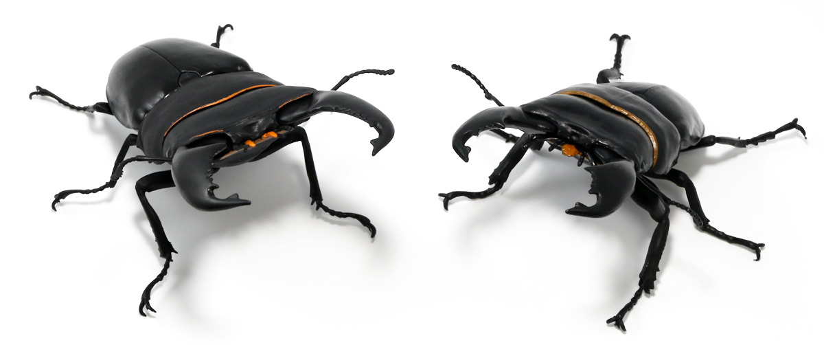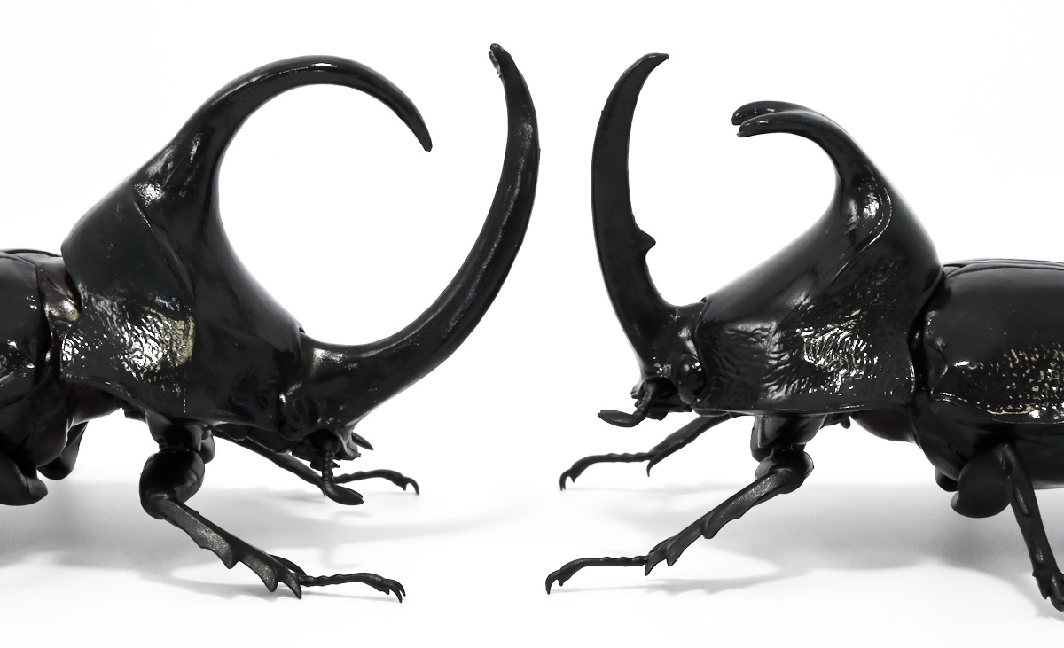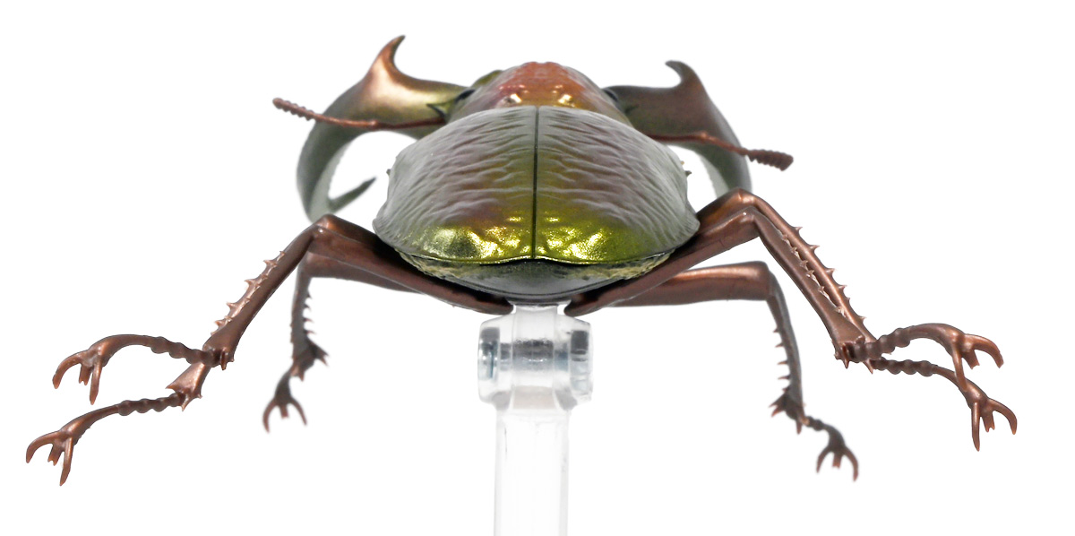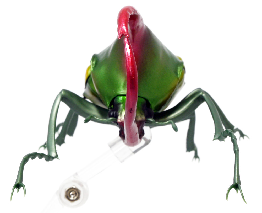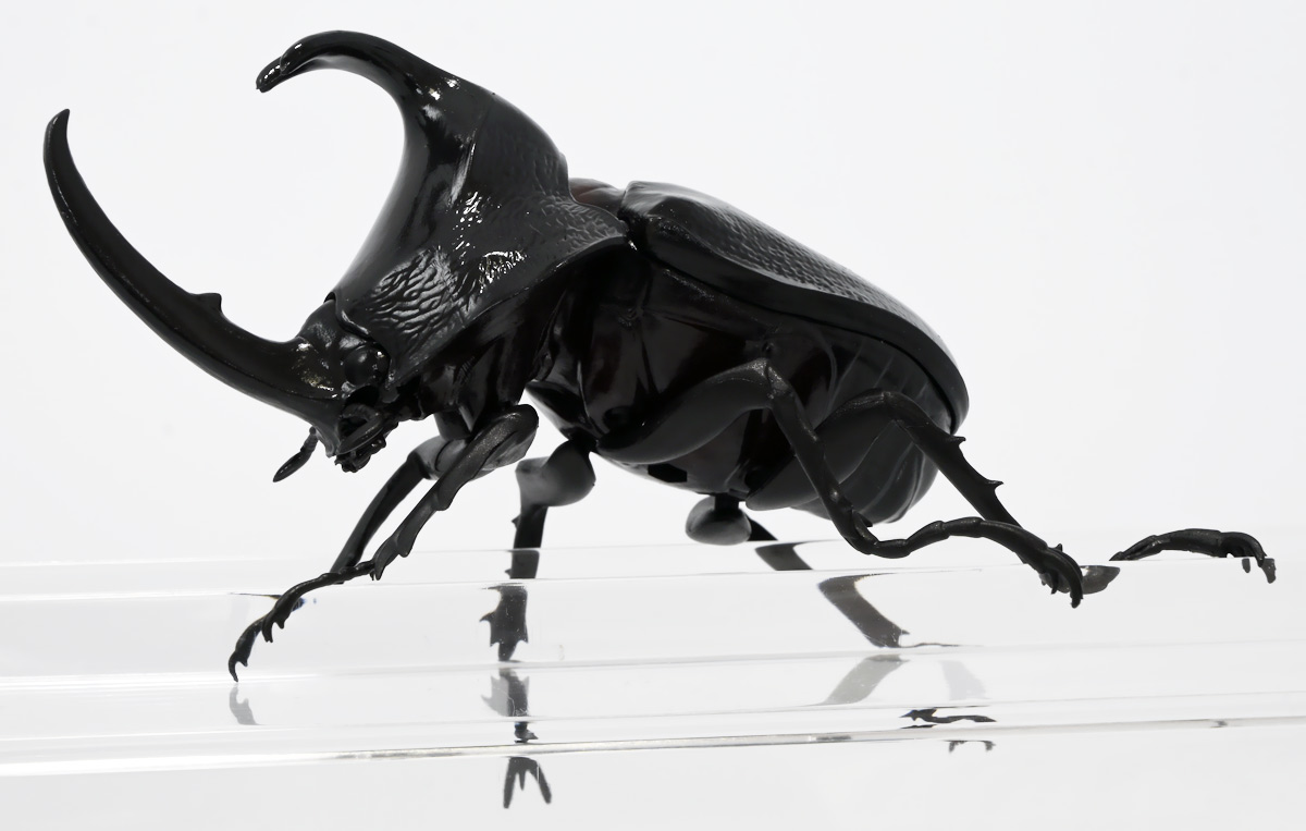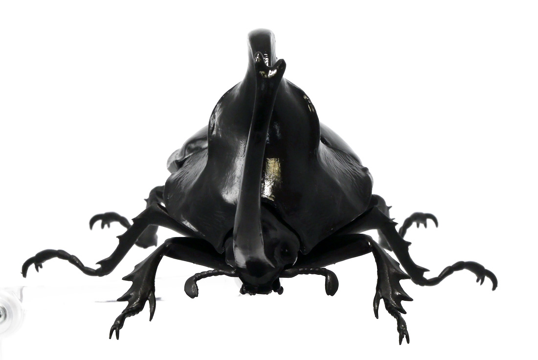 ■バンダイ いきもの大図鑑 かぶとむし09 パンカブト(ロング/ショート) ![]() バンダイより、2025年8月第4週登場の一回500円ガチャ、 この弾でわたくしが最も欲する狙い枠は無論の事、奇虫「カブトハナムグリ」であるぞよ! なにせ当選率15%枠はアソートに3個しか入っていないので狙うとかなり引きにくい。 一回500円ではお財布へのダメージも苦しいが・・・さて何が出た!! ![]() 「パンカブト(ロング)」・・・ッ!! 当選率20%、即ち筐体に4つ入っているハズレ枠ぞよーっ!! 同率では「ヘラクレス・オキシデンタリス」も4つ入っているが、 あちらは彩色が極めて凝っており、また体格も立派で格好良くハズレ感がないが、 こっちは彩色も目立たず黒一色の名実ともにハズレ枠となっております。 とほほぞよーっ!! ![]() 気を取り直してみてゆこう! 南米で広く見られるパンカブトは1属1種しか知られていない珍しいカブトムシであるぞよ。 つまりこれもまた奇虫と言って良い種で、ハズレ枠と言ってもわたくし好みのなかなか通な選出! 特に玩具にラインナップされる事は珍しく、 CTスキャン原型の標本再現と考えれば全く損した気分に実はならないのだ! 食傷気味のヘラクレスより余程価値があると言えるだろう!! ![]() 学名からエネマパン、あるいはパンサイカブトなどとも呼ばれるパンカブト、 サイカブトとつくようにパンカブトも広くはサイカブト族に分類されるが、 サイカブトはサイカブト属なのでパンカブト属のパンカブトとはよく似た同じグループの親戚と言ったところ。 パンカブト最大の特徴はご覧の通り立派な頭角と胸角で、すっと伸びるものと二股が現れるものとがいる。 本商品は頭角の先が二股になっているぞよね! パンカブトやサイカブトの面白いのは、なんとメスも小さな頭角を持っている事ぞよ。 ご存知カブトムシはオスは立派な角を持ち、メスでは持たないのが普通なので、これはとても珍しい特徴だ。 ![]() またパンカブトの特徴には足が貧弱で短い事も上げられる。 どうやら樹上性でなく地面で活動するカブトムシのようだが何せ珍しい虫なのでほんとのトコはよく判らんぞよ。 飼育下ではフセツがポロっと取れてしまう事もしばしばあるみたい。 本商品は恐らく前脚は専用造形で繊細さが再現されているが、 中・後脚は普通のカブトムシの流用でちょっと逞しすぎるように見える。 サイカブト族では過去に「かぶとむし06 オオツノメンガタカブト(2024年4月)」も登場している。 これは脚も繊細な専用造形が使われており、本商品に使いまわせなかったんか?とも思うが、 パンカブトの方が本体サイズが大きく、同弾ヤマトカブト級なので通常カブトの足を流用しなくてはならなかったのだろう。 ![]() パンカブトは頭の際やお尻、腹側などに結構毛が生えているのだが、 本商品では特にディテール・彩色表現されておらずつるんとしているぞよ。 ここがちょっとコストカット枠感あって寂しい感じ。 ![]() トップ。 胸や前翅は彩色されていないが、ざらざらつぶつぶのディテールが入っていて光沢で魅せる造形。 ![]() お腹側はほんのり茶色く彩色されており、全くの無塗装と言う訳ではないぞよ。 本弾も勿論お腹にはジョイント穴が開いており、汎用スタンドで展示する事が出来る。 ![]() オンライン限定の樹皮台座にも乗せる事が出来るぞよ! ま〜パンカブトは木登りは不得手のようですが、全く登らないと言う事もあるまい! ![]() パンカブトは実物だと9センチくらいと言われているが、本商品は全長10.5センチあって夢の超特大サイズ。 こちらも可動箇所は10ポイントとなり、簡易可動で表情付けが可能ぞよ。 ![]() こい・・・カブトハナムグリ・・・ッ!! って事で泣きのもう一回・・・ッ! ぐえ〜っ!! 色が黒い・・・こりゃハズレか・・・と思いきや、ロングパンカブトと袋の色が違う。 これは・・・!? ![]() なんと「パンカブト(ショート)」ではないか〜! パンカブトコンプしちゃったぞよーっ!! こちらは当選率15%でアソートに3つしか入っていないが、 ロングが4つ入っているので筐体の中身は合計7個がパンカブト・・・。 20個アソートだから回すと大体パンカブトかヘラクレスが出てくるのだ! ![]() ロングバージョンは頭角が二股、胸角がすっと弧を描いて伸びていたが、 こちらのショートバージョンは頭角がアーチ状、胸角が二股になっていて個体差を表現している。 頭角が短いのでこっちのショートは全長9センチとなっているが、脚や体はロングと共通パーツで出来ているぞよ。 ![]() 本弾共通の使用として、頭角、胸角は株式会社JMCの手によるCTスキャンから原型が起こされている。 今更なんだけど〜・・・多分実物標本をCTスキャンしてもそのままフィギュア原型には使えないだろう。 恐らくそれを元にデザイナーがCG原型を一から起こしていると思われるぞよ。 つまり正確なのはシルエットや各部の比率であると考えられる。 ま〜何れにしても実物標本の再現玩具である事には違いあるまい! 彩色