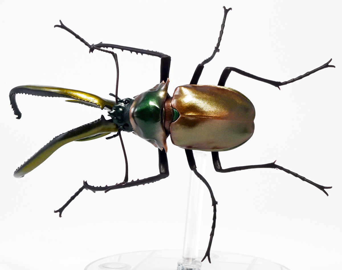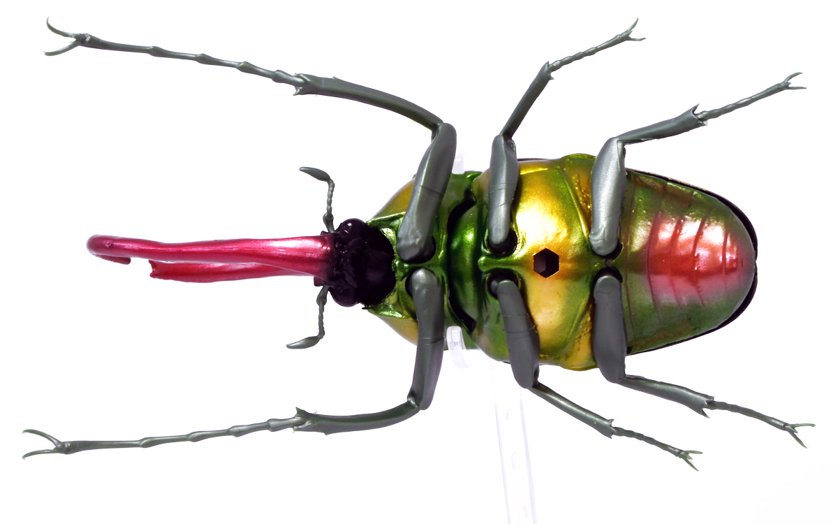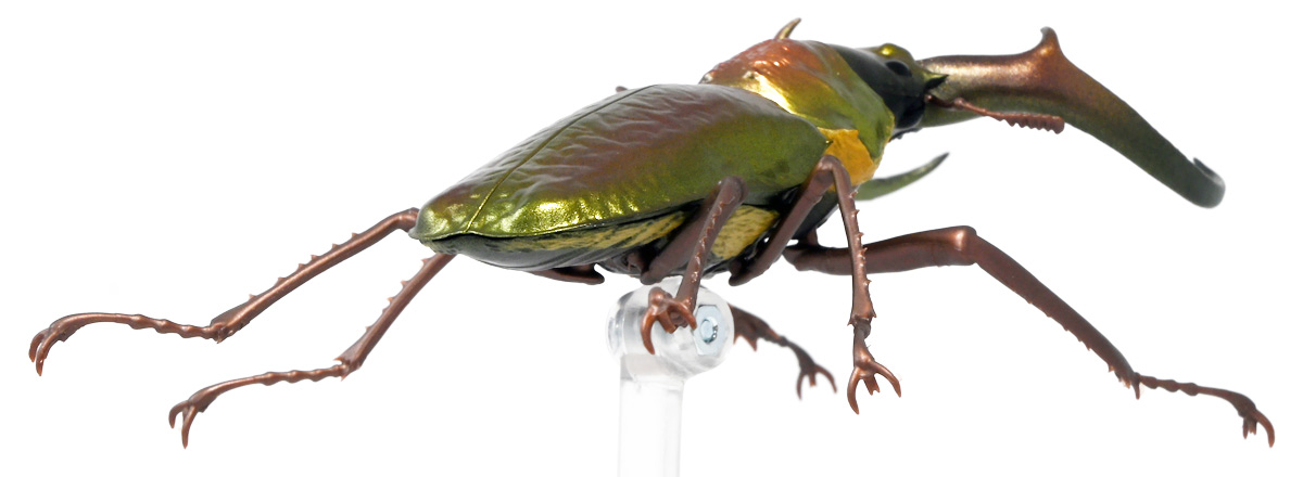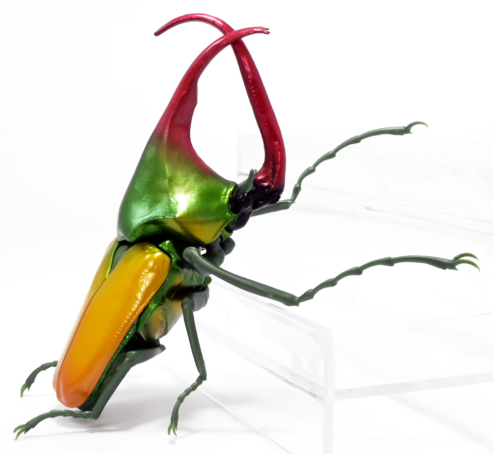 ■バンダイ いきもの大図鑑 かぶとむし09 カブトハナムグリ(イエロー) ![]() バンダイより、2025年8月第4週登場の一回500円ガチャ。 「かぶとむし09」真打登場・・・ッ!! この色鮮やかな袋の中身は・・・!? ![]() わたくしの大本命「カブトハナムグリ(イエロー)」ぞよーっ!! このカブトハナムグリのみ、筐体版は「イエロー」、ガシャポンオンライン版は「グリーン」カラーで前翅の色が異なっているぞよ。 当選確率は15%、つまり20個アソート中3個封入。 したがって本弾はヘラクレス7個(2色)、パンカブト7個(2造形)、 ヤマトカブト、カブトハナムグリがそれぞれ3個封入、 かつ筐体版を回す人は自然と自販機限定のカブトハナムグリ狙いとなる為、本商品が最も人気が高くレアと言う事になるぞよ! ![]() カブトハナムグリ属(Theodosia)のラテン語名に基づき「テオドシア(属)」とも呼ばれるこの甲虫は、 ご覧の通りカブトムシのような角を備え、カナブンのような金属光沢を纏った合体昆虫の如き美しい虫であるが、 その正体はハナムグリ亜科のハナムグリであるぞよ! 本商品はボルネオ東北部、サバ州の山岳地帯に生息する 「テオドシア・ヴィリディアウラタ(Theodosia viridiaurata)」をモチーフとしているようだ。 これは安定した採集も無く、標本であっても非常に珍しい奇虫であるぞよ! ![]() ハナムグリにしてカブトムシに匹敵する角を備えたテオドシア。 世界に2600種以上も知られるハナムグリ亜科の中でもここまで立派な角を持つのはこの属のみであるぞよ。 性的二型が進んでおり、やはりメスには角が無い。 昼行性で山岳地帯の上昇気流を利用しては活発に飛翔し、高い枝先の花から吸蜜すると言う。 この長い脚は枝先を進む為に発達したものであると言う事だ。 幼虫は朽木に住むとされるが、現地でも珍しいようで未解明の部分が多そうである。 ![]() 本種の金属光沢はなんと言っても美麗な事で知られる。 しかし昆虫の構造色は玩具彩色の仕組みで再現できるものではない。 本商品ではメタリック彩色にグラデーション塗装でなんとかその一瞬のきらめきを表現しようとしているが、 本物には遠く及ばないものとなっているぞよ。 色数も多くかなり凝っているのでフィギュアとしては良い感じ、 500円と思うとかなり凄い仕上がりだがこりゃ仕方がない! なんかカブトハナムグリのピカピカってラメラメ感あると言うか、ざらざらしてるように見えるぞよね。 以前に「くわがた09」で生物的なテクスチャ表現が用いられた事があったけど、 あれをこいつに施してやればラメラメの輝きに見えたんじゃないだろうか? おろかなにんげんどもはどう思うぞよ!? ![]() カブトハナムグリは基本的に緑の構造色を纏う。 それが時にこのように黄色に発色したり、また赤みを帯びて赤銅に輝く者も現れるぞよ。 本商品は前翅が黄色くなったバリエーションぞよね! また、脚も金属光沢を帯びて黄色や赤みが浮かぶが、本商品ではメタリック成型色で雰囲気を再現している。 ![]() 最大全長は5センチ程だと言う本種、本商品は全長10.7センチに及び拡大模型となっている。 原型は株式会社JMCの手による実物標本のCTスキャンから起こされており正確な比率。 彩色はこちらも三浦二郎氏が担当されているぞよ。 ![]() お腹側もかなり凝った彩色が施されており見所があるぞよ! 各部位に生えた毛は表現されていない。 ![]() 本商品も可動箇所は10ポイントで500円弾の簡易可動仕様に倣う。 頭や胸は勿論、触覚や脚を動かしてポーズを決めよう!! ![]() 伝説の奇虫・カブトハナムグリ見参!! つぶらなおめめが可愛いぞよね!! ![]() まるでヘラクレスのような大角! これは勿論競合相手との闘争に使うのだろうが、カブトハナムグリは脚も長いので、 前脚を大きく広げて相手を牽制するような事もするみたいぞよ。 小さいながらになかなかパワフルな奴なのだ!! ![]() カブトムシ弾に時々混じっているカナブンやハナムグリシリーズ。 だんだん増えて賑やかになってきたぞよね! アドバンスハナムグリ弾もやって欲しいですよ〜。 おろかなにんげんどももそろそろゴライアス、また見たくなったんじゃないぞよか〜? バンダイ・・・頼むぞよっ!! ![]() 「ぞよちゃんねる」のタマムシ特集もよろしくぞよ! :このリンクを踏んで何かポチるとわたくしにささやかな報酬が入りサイトの運営費となるのでよろしくぞ! ・「学研の科学 恐竜化石発掘キット: 世界とつながるほんもの体験キット」 ・「学研 ティラノサウルス1/35骨格模型キット&本物の大きさ特大ポスター」 ▲TOP |