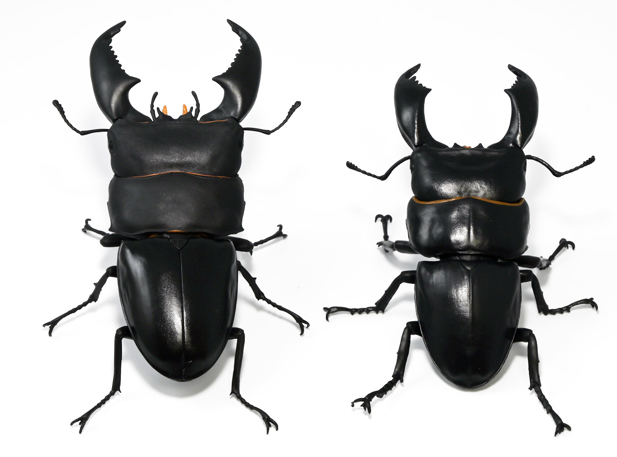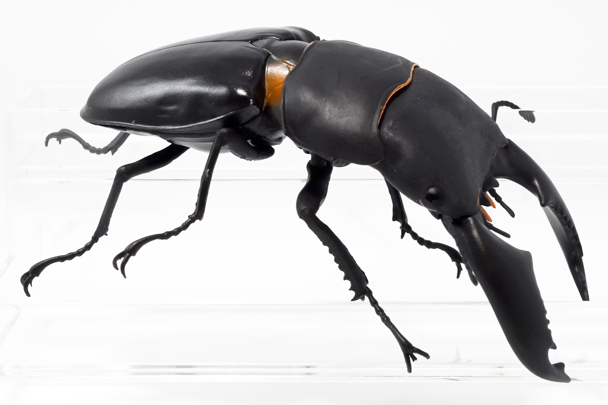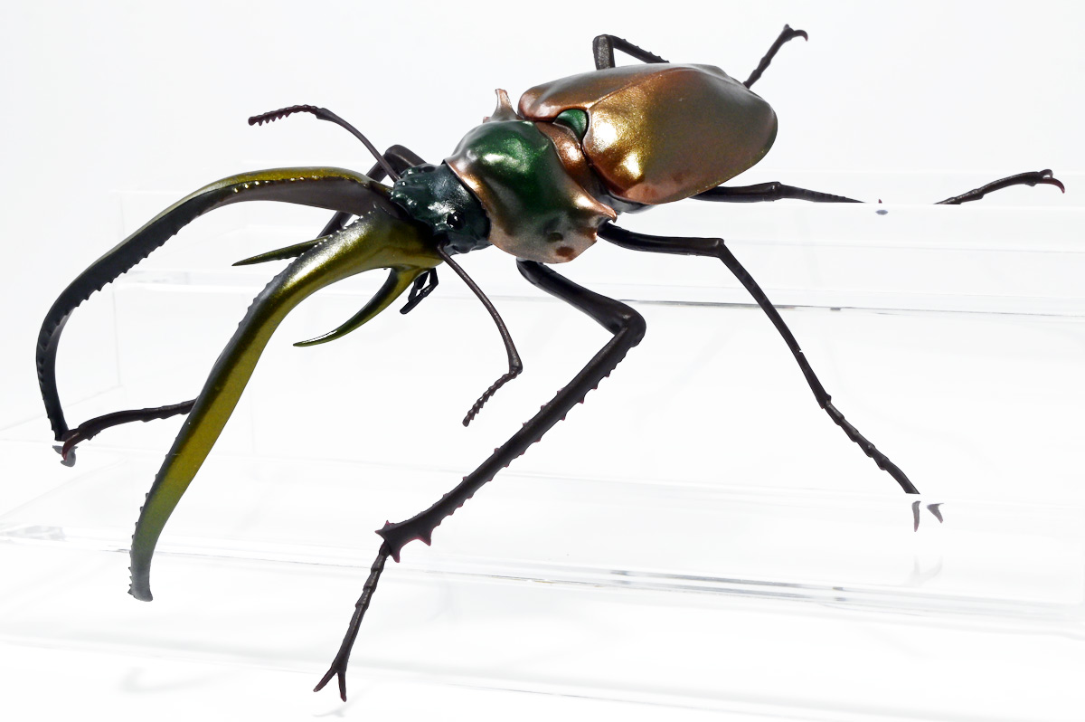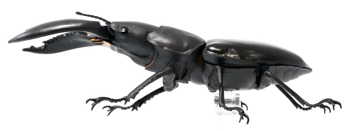 ■バンダイ いきもの大図鑑 くわがた08 チリクワガタ ![]() バンダイより2024年7月第3週発売の一回500円ガチャ。 「くわがた08」は以前に「アラガールホソアカクワガタ」も紹介しているので、 仕様の詳細はそちらも参照のことぞ。 ![]() じゃん! と言う事で発売から1年過ぎてますが追いくわがた08、チリクワガタぞよ! この摩訶不思議に奇怪なフォルム・・・やっぱりいきもの大図鑑は奇虫に限るぞよなぁ〜! ![]() チリとアルゼンチンに生息するチリクワガタはこんな見た目だが正真正銘、 チリクワガタ属のクワガタムシであるぞよ! 体長はオスで3.3〜9センチ、メスで2.5センチ〜3.7センチとなる南米最大のクワガタムシだ! 頭の小さい姿から、コガシラクワガタの名前で聞き覚えるのあるおろかなにんげんどもも多い事だろう! ![]() なんと言っても最大の特徴はオスの大顎。 大型個体では体長の半分を占める程長く発達し、下向きに歪曲していかにも邪魔そうぞよ! 小さな頭部には筋肉も少なく、せっかくの大顎だが挟む力は全然強くない! チャールズ・ダーウィンは1831年12月のビーグル号二度目の航海に乗船し、 チリでこのクワガタと出会い、 あんまり不思議な大顎にびっくりして試しに先っちょの方に指を挟ませてみると、 これがちっとも痛くなくてかえって驚いた! このように、本来の使用目的にもはや適さないのではないかと思われるほど極度に進化したものを 過剰適応と言うが、まさにチリクワガタの大顎はその一例と言えるだろう。 ダーウィンのエピソードを元に、チリクワガタは「ダーウィン・ビートル」とも呼ばれているぞよ。 この航海の経験は後の「種の起源」執筆へも繋がってゆく。 ちなみにチリクワガタのパワーが貧弱なのは大顎の先っちょの方だけで、 根元の牙部分は結構強力な武器であり、樹皮を傷つけ樹液を出す時にも便利。 そしてなかなかに好戦的なのでうっかり根元で挟まれると出血する事もあるから要注意なのだ! ![]() ダーウィンはこの大顎の本当の役割に気づく事が出来なかったが、 後の世では恐らくこう言う事だろうと気付いた者があった。 つまり、オスの大顎は交尾相手となるメスを確保する時に用いられるのだ! 競争相手となる敵のオスを長い大顎で威嚇しつつ、メスを見つけたら上から抱き込んで捕まえてしまう。 細長く発達し、歪曲した奇妙な大顎にもきちんと役割があったのである! チリクワガタ、なかなか強かな奴ぞよね!! ![]() 現地では結構普通に見かけると言うチリクワガタ。 かつて日本に入ってきた事もあると言うが、現在では輸出が禁止されている。 そしてチリクワガタは標高の高い寒冷な場所に生えているブナの朽ち木を好み、 幼虫は4〜5年かけて育ち、やがて成虫になると3週間くらいでお亡くなりになると言うから儚いぞよ。 飼育下での管理は極めて難しく、誰も累代に成功しなかった為、国内で生体を入手する事は叶わなくなってしまった。 ![]() チリクワガタは鈍く輝く金属光沢も特徴であるぞよ! 本商品は原型を株式会社JMCの手によるCTスキャンから起こしており、 彩色はCount blueの三浦二郎氏が担当、毎度お馴染みぞよね! 赤褐色から虹色めいて輝く様を豪華なメタリック彩色で再現している。 ![]() なんか500円弾なのに滅茶苦茶彩色豪華じゃないぞよか!? お腹側もグラデ彩色されています。 ちなみに実際のチリクワガタはお腹にふさふさの毛が生えている。 クリーム色のグラデ彩色はこの表現だろう。 そして脚にも金属光沢があるが、本商品は茶色の成型色だ。 ![]() チリクワガタの奇妙な特徴には目もあるぞよ。 なんとこいつ、よく見ると目が4つもある! ぐえ〜、不気味ぞよ〜っ!! クワガタの中には複眼の一部が眼縁突起で覆われているものがあるが、 チリクワガタの場合は完全に区切られちゃって上下に分離しているのだ。 う〜む、見れば見る程不思議なヤツぞよね〜。 ![]() 500円弾だけど全身12箇所可動で遊べるフィギュアとなっている。 ちなみに全長は14センチもあり、 実物の最大サイズ9.16センチと比べてもかなり大きい拡大模型に仕上がっているぞよ。 ![]() 勿論大顎の開閉遊びも出来ますよ! 日本ではもう生きた個体を見る事は叶わなくなったチリクワガタ。 その奇怪なアクションポーズを弄り放題とは太っ腹なアイテムぞよ! ![]() 円らなおめめも四つもあってプリチーぞよ。 こりゃ何のために分離しているのか良く判らんが、上と下が同時に見えて便利なんだろう。 ミズスマシと同じ仕組みぞよ。 ![]() お腹には汎用スタンド穴が開いており便利なのです。 だんだん数が増えて置く場所も無くなってきたので標本箱にでも入れて飾ってみたい気もするが、 こいつら拡大模型だからすぐに箱がむぎゅむぎゅになってしまいそうで悩ましいぞよよ〜。 ![]() 500円弾とは思えない豪華彩色で登場の奇虫・チリクワガタでした! こういうヘンテコなヤツがラインナップされているのがいきもの大図鑑の見所ぞよね! 続いて最新弾も見ていこう! と言う事で↓へ続く。 :