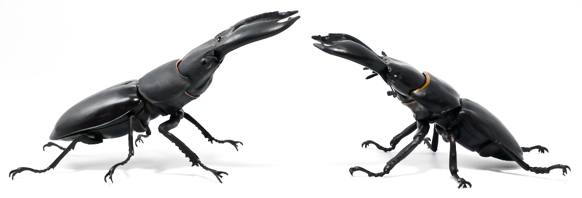■バンダイ いきもの大図鑑 くわがた10 スマトラオオヒラタクワガタ(内歯下がり) ![]() バンダイより、2025年6月第4週登場の一回500円ガチャ。 大人気「くわがた」シリーズの記念すべき第10弾となっているぞよ! こちらはその辺の自販機で売ってる筐体版。 ![]() ラインナップは「ニジイロクワガタ(ノーマル)」15%、「ニジイロクワガタ(レッド)」10%、 「スマトラオオヒラタクワガタ(内歯下がり)」20%、「スマトラオオヒラタクワガタ(内歯上がり)」15%、 「フェイスタメルシワバネクワガタ(メタリックグリーン)」15%、 「フェイスタメルシワバネクワガタ(メタリックパープル」15%、 「オオクワガタ(蛹)」10%の全7種となっているぞよ。 アドバンス弾から降格のニジイロクワガタが新規造形再登場していたり、 レアで蛹が入っていたり面白弾となっている。 ![]() ぱかっと開封! おっと〜、こちらは「スマトラオオヒラタクワガタ」の内歯下がりぞよ! 当選率20%で最も確率が高く、彩色箇所も少ないので要はハズレだが・・・ 一番でっかく一番人気の種が一番出やすいってのは親切と言えるだろう! ![]() 全部で25亜種も知られるヒラタクワガタの亜種の中でも、 スマトラ島で見られるのがこのスマトラオオヒラタクワガタであるぞよ! 全長はオスで最大10センチ越え! 全亜種の中でもパラワンオオヒラタクワガタに続いて二番目に大きくなり、 最も恰幅が広く厚みがあり大顎も逞しくなると言う! ![]() 産地によって内歯の位置に違いが見られ、 代表的なものではアチェ産の内歯下がり、ベンクール産は内歯上がりが多く出る事で知られているぞよ。 つまり本商品はアチェ産の標本に基づいた造形と考えられる。 どちらかと言うとアチェ産の方が飼育が盛んで大きくなる傾向にあるので人気がある。 この内歯下がりバージョンはアタリぞよ! ![]() チリクワガタを見た後だとずんぐり丸みを帯びて可愛い感じではないか〜。 彩色箇所は少ないが造形で魅せる一体となっているぞよ。 ![]() こちらもやはり造形は株式会社JMCの手による実物標本のスキャンから起こされている。 彩色も三浦二郎氏によって設計されておりお馴染みの布陣ぞよ。 ![]() 学名はDorcus titanus yasuokaiとなっており、研究者・安岡博人氏にちなんだ名前が入っている。 クワガタ研究は日本で特に盛んなので、日本人の名前が入っている事がしばしばあるぞよ。 ![]() 黒光りのお尻。 ![]() 本商品は全長約12センチ、可動12か所の簡易アクションフィギュア仕様! 自慢の大顎は勿論開閉する他、 ![]() 各部も柔軟に動かす事が出来ます。 実物の全長は最大でも10センチ程なので、本商品は拡大模型。 夢の超絶ビッグサイズとなっているぞよ! ![]() スマトラオオヒラタは2024年6月に決定版的玩具が発売されている! 写真右はスタジオソータの「アニマリエコレクション 1/1オオヒラタクワガタ」のうち、 「スマトラオオヒラタ(内歯上がり)」であるぞよ! タイトルからお判りの通り、このスマトラオオヒラタは1/1スケールの実物サイズなのだ! 今回は内歯下がりが出て被らなかったのは嬉しい引きぞ。 ![]() アニマリエコレクションのオオヒラタクワガタは国内の昆虫標本の第一人者として知られる 福井敬貴氏が監修を勤めるばかりか、原型まで手掛けられており超本格的な立体物。 専門家が作っているのだからこれ程立派で格好良いオオヒラタクワガタは他にないと思われる! ![]() ・・・がっ! いきもの大図鑑・・・オーバースケールではあるが並べてみてもなかなかイイ感じではないか〜っ! 特にいきもの大図鑑は胸部までと前翅の艶感の違いが表現されておりそれっぽい。 ただアチェ産は全体的に艶っぽい気もするのでどちらがリアルともつかないぞよ。 ![]() 不思議なのはいきもの大図鑑のくわがたって毎回拡大模型なんだよな〜。 特に大きなオオヒラタクワガタは別に1/1でも作れるはずだが奇妙な仕様であるぞよ。 ひょっとしたら1/1でバージョンアップの二週目と言う事もバンダイの場合全然あり得るから戦々恐々である。 ![]() どっこいしょーっ! 1/1固定ポーズのアニマリエコレクションに対し、いきもの大図鑑はあそべる可動仕様がウリ! アクションフィギュアとしてわちゃわちゃ遊んじゃいましょう! 続いて同弾ガシャポンオンラインバージョンも見ていく。 ↓レビューへ続くぞよ! :このリンクを踏んで何かポチるとわたくしにささやかな報酬が入りサイトの運営費となるのでよろしくぞ! ・「ザ・アクセス ロボット フィギュア 変身ロボット ギラファ ムシバトロン」 ・「マテル ジュラシックワールド(JURASSIC WORLD) バトルアクション モササウルス」 ▲TOP |