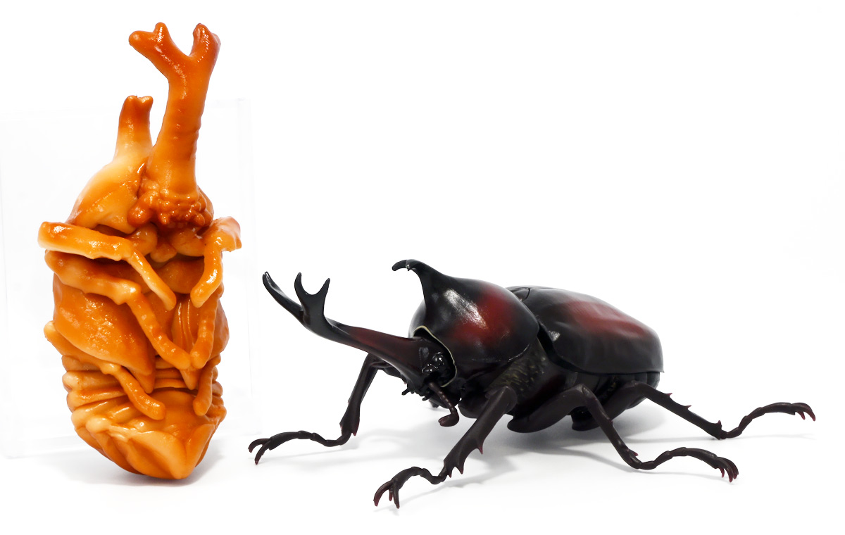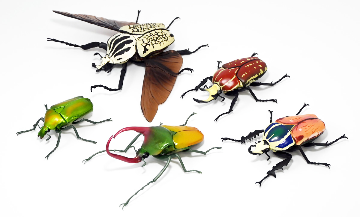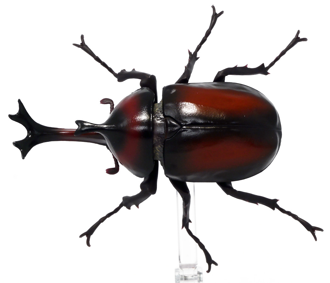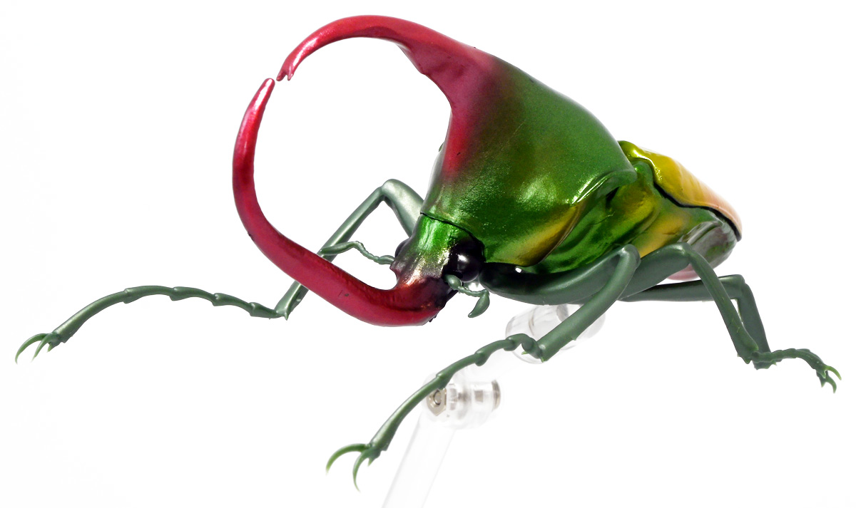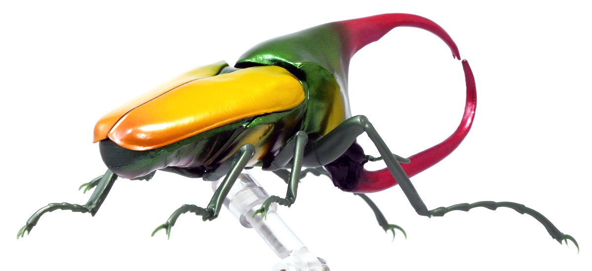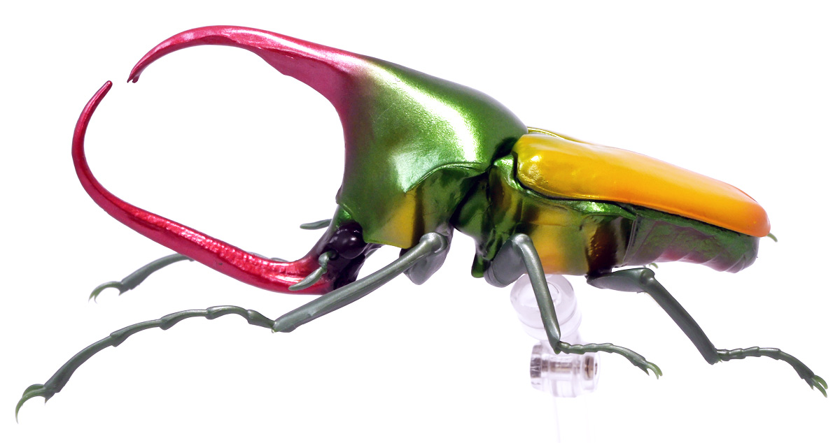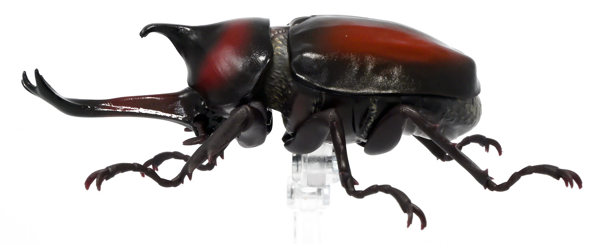 ■バンダイ いきもの大図鑑 かぶとむし09 ヤマトカブトムシ ![]() バンダイより、2025年8月第4週登場の一回500円ガチャ、 大人気「いきもの大図鑑」かぶとむしシリーズの第9弾ぞよ!! ![]() ラインナップは「ヤマトカブトムシ(赤褐色・新色)(15%)」、「ヘラクレス・リッキー(オレンジ・新色)(15%)」、 「パンカブト(ショート)(15%)」、「カブトハナムグリ(イエロー)(15%)」、 「ヘラクレス・オキシデンタリス(20%)」、「パンカブト(ロング)(20%)」となっており、 20個アソート中、当選確率15%設定が3個、20%が4個みたいぞよね。 また、ガシャポンオンライン版は一部仕様が異なり ・ヘラクレスの胸角が分割されていない ・カブトハナムグリは「グリーン」カラーで収録 ・全ラインナップに「樹皮台座(小)」が付属 ・販売価格は650円 となっているぞよ。 今回紹介するのは全国のガシャポン自販機で販売されている一般販売の筐体版だ。 ![]() それではパカっと開封! お〜っ! カブトムシの中のカブトムシ、ヤマトカブトムシではないか〜っ!! 何気にいきもの大図鑑の普通のカブトムシ持っていなかったので嬉しいぞよ! こちらは当選確率15%で筐体には3個しか入っていないので狙おうとするとなかなかレアであるぞよ。 ![]() 鞘翅目に分類される甲虫達の中でも、国内で最も格好良く人気があるのがこのヤマトカブトムシ! コガネムシ科カブトムシ亜科カブトムシ族カブトムシ属に分類される所謂普通のカブトムシであるぞよ! 日本ではカブトムシといえばこのヤマトカブトムシを指すが、 学名は「Trypoxylus dichotomus septentrionalis(トリュポクシルス・ディコトムス・セプテントリオナリス)」、 即ち「木に穴を穿つ二股の角を持つ者」の意であるぞよ。 カッコいいぞよね! そんなヤマトカブトムシ、昔は「Allomyrina dichotomus(アロミリナ・ディコトムス)」と言う学名だったぞよ。 古くはヤマトカブトムシはサビカブトムシ属(Allomyrina)に分類されていたが、 1998年に三宅義一氏が日本鞘翅学会でTrypoxylusの使用を提唱し、以後はこれに定着したと言う事である。 ところが、動物の属を変更すると言う重大なこの論文、全文が日本語で書かれていたから大混乱が生じた。 日本国内では定説となったが、海外では反対意見も根強く、 カブトムシを語る上では留意せねばならない問題となっているのだ。 ![]() 日本では本州・四国・九州などに広く分布。 クヌギやコナラなど、樹液を出す樹木の多い低地から低山地の里山的環境に多く生息するが、 実は幼虫は畑や田圃の脇にもっこり積まれた有機堆肥の中に潜んでいるぞよ! カブトムシの幼虫は木が腐った後に残る腐葉土の中で生れ、育つのだが、 現代ではそのような自然環境が減少し、なかなか都合の良い土地が見られなくなってきた。 そこでカブトムシが目を付けたのはおろかなにんげんどもが作る堆肥であるぞよ。 これが実にカブトムシの幼虫の発育に都合がよかったと言う訳ぞよね! つまり、カブトムシは実は自然の動物でなく、おろかなにんげんどもが森林を利用・維持し、 また近くで農業を始めた事に便乗して日本で分布を広げてきた動物という事だ! このように昆虫の中にはおろかなにんげんどもの社会活動を切っ掛けに、 一緒に生息域を広げてきたものが多くいるぞよ。 特に身近な昆虫達などこの例に当てはまるものが多い。 ![]() ヤマトカブトは基本的には夜行性と言われ、普段は土中や落ち葉の下に潜み、夜になると樹液を舐めに現れるぞよ。 しかし実はそうではないのではないか?と言う説も唱えられている。 カブトムシは昼間も活動しているが、餌場にオオスズメバチなどの天敵がやってくる為に、 これと競合する事を避けて夜行性を強いられていると言うのだ。 安全で都合の良い餌場があれば、カブトムシは昼間でも活動する姿が見られる。 カブトムシにしてみればともかく栄養が得られればいい訳だから、昼も夜も関係ないってワケぞよね! ![]() そんなヤマトカブト、「いきもの大図鑑」シリーズにおいては度々登場しており、 初出は「かぶとむし(2021年7月)」の事であるぞよ。 この時は「黒」と「赤褐色」がラインナップされている。 続く「かぶとむし02(2021年12月)」では「レッドカラーVer」がレアアソートとして、 「かぶとむし04(2023年1月)」では「ヤマトカブトムシ(改)」として、 「かぶとむし05(2023年7月)」では「赤褐色」として、 幾度も改良を重ねながら再登場してきたが、 本商品「かぶとむし09」に収録されたバージョンは「赤褐色・新色」としてより赤みを強めたカラーとなり、 また500円弾の新仕様に基づいて翅の可動がオミットされ、飛行形態に変形できないバリエーションでの再登場であるぞよ。 ![]() という事で「05」の飛行形態に変形できる赤褐色と比べるとグレードダウンしているかにも思えるのだが、 頭角と胸角は例によって株式会社JMCの手によるCTスキャンから原型が起こされており、 正確な比率であり造形的見所は健在。 彩色はシリーズではお馴染み、「Count blue」の