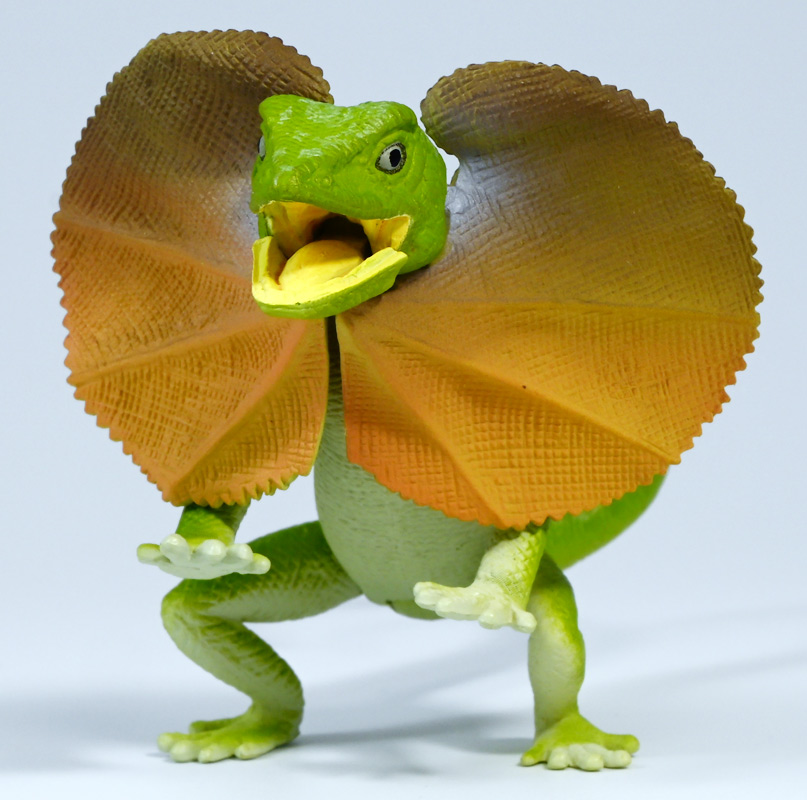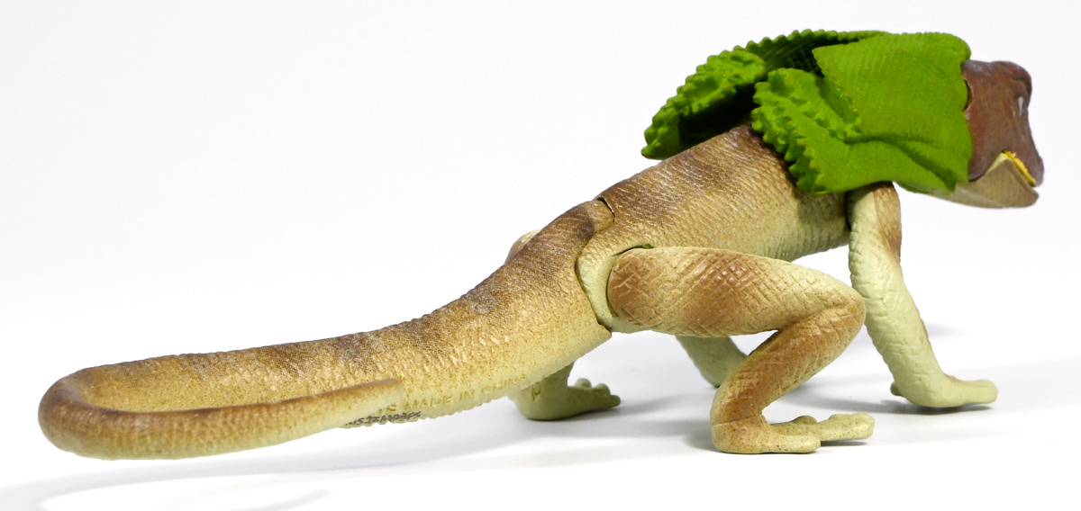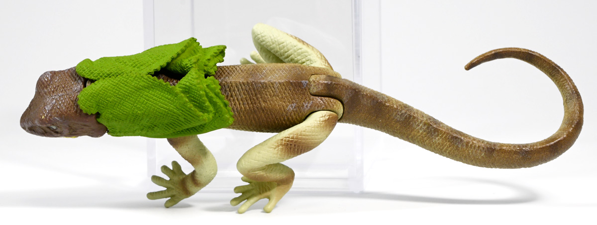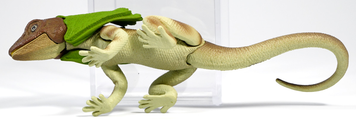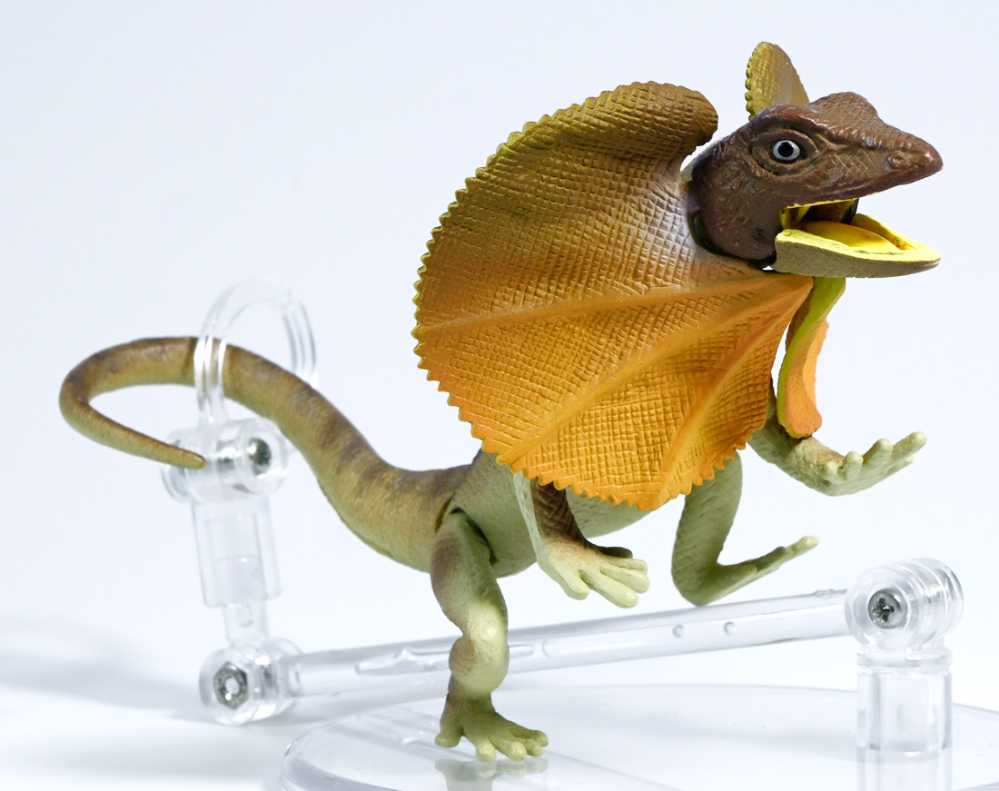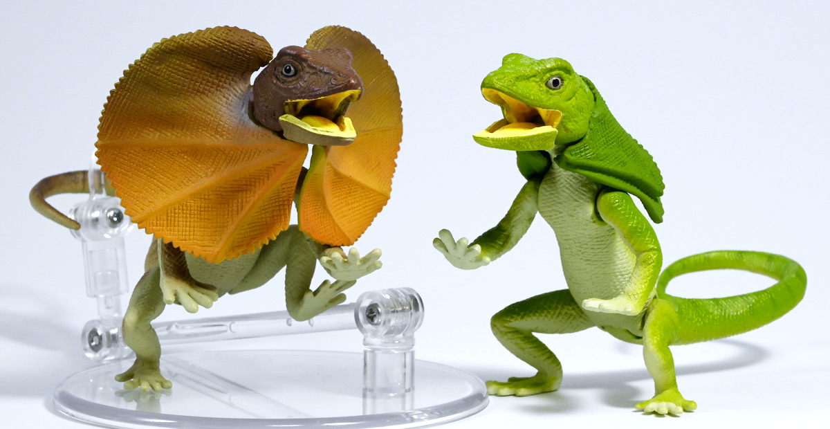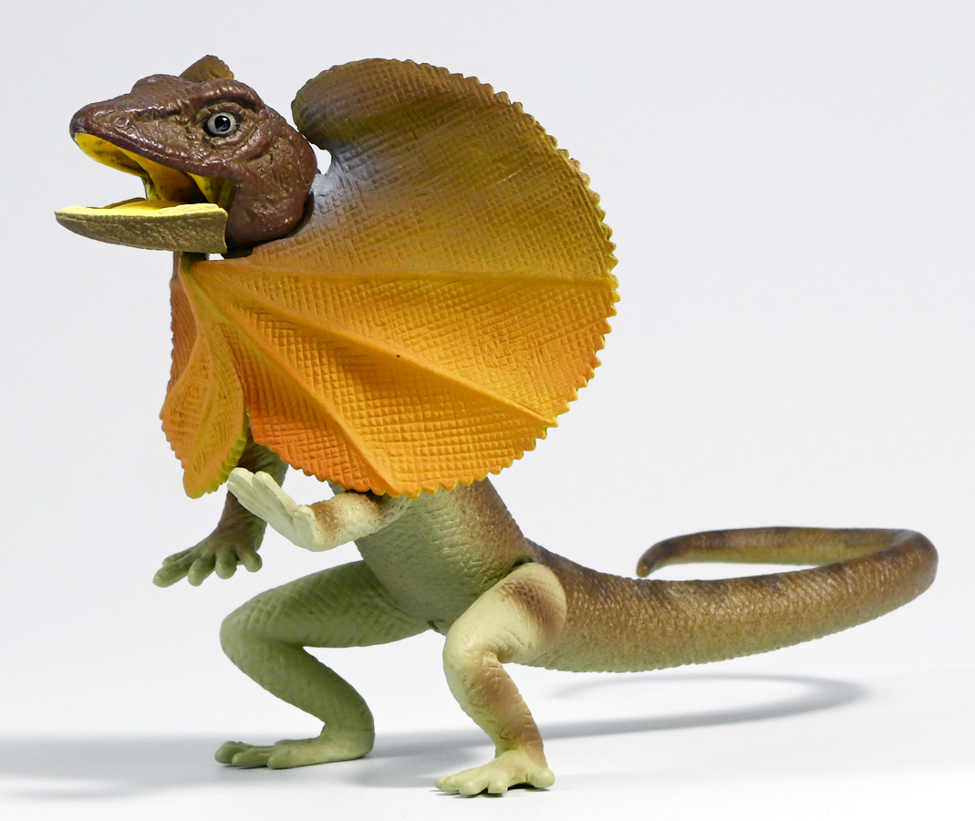 ■タカラトミーアーツ あそべる生物フィギュアシリーズ トカゲキングダム エリマキトカゲがやってきた!! エリマキトカゲ ![]() タカラトミーアーツより2025年9月22日週発売の一回300円ガチャ! 通な動物を可動ラインナップする「あそべる生物フィギュアシリーズ」より、 大人気「トカゲキングダム」の第四弾が登場! ラインナップは新規造形の「エリマキトカゲA」、「エリマキトカゲB」に加えて、 「フトアゴヒゲトカゲ」と「カメレオン」が過去弾より再集録。 フトアゴヒゲトカゲは恐らく2023年7月の第一弾「トカゲキングダム」に入っていた「A」カラーとほぼ変わらない再録カラー。 カメレオンも同弾「A」に似ているがちょこっとグラデ彩色が簡略化されているように見えるぞよ。 何れにしても今回はどれもきちんと彩色・模様プリントされており全種豪華な仕上がりだ! ![]() カプセルの中身は袋入りでごちゃっと入っています。 この雑に入ってるパッケージ、なんかわくわくしてわたくしは結構好きぞよ。 丁寧梱包のフィギュアもありがたいが、 「あそべる生物」は300円なので許せちゃうのだ! ![]() 早速組み立て、こちらは「エリマキトカゲA」ぞよ! フル彩色の豪華な仕上がり、今回初登場の新規造形フィギュアとなる! ![]() エリマキトカゲはアガマ科(キノボリトカゲ科)エリマキトカゲ属に分類されるトカゲであるぞよ! オーストラリア北部とニューギニア島南部にのみ見られ、一属一種しか知られていない珍しいヤツだ! 全長は60〜90センチにもなり、なんと言っても最大の特徴は首元に備わった特徴的なフリルであるぞよ! これが襟巻に見える事から「エリマキトカゲ」と和名がついたワケで、そのまんまぞよね! ちなみに学名の「Chlamydosaurus」とは「マントトカゲ」の意であるぞよ。 ![]() この襟巻の正体はなんなのかと言えば、舌骨が上皮に入り込んで出来た皮膚の傘であるぞよ。 下顎と軟骨の動きが舌骨に伝わる事で、つまりは口を開くと同時にフリルが展開する仕組みで、 円盤状に展開された状態では胴幅の四倍以上、約30センチにも広がると言う。 襟巻の構造としては舌骨から伸びた3本の骨組みで支えられており、 上から第1対角、第3対角が軟骨、第2対角が硬骨となっている。 本商品のフリルを見てみると・・・ちゃんとフリルの骨組みが3本あるぞよね!? という事でツボを押さえた造形と言えるだろう! ![]() エリマキトカゲは地域性で主に2つの亜種に分けられ、オーストラリア亜種は乾燥した森林に住まい、 体が大きく90センチ級。 ニューギニア亜種は小柄の70センチクラスで、熱帯雨林に近い温暖な気候を好むと言う。 昼行性の樹上性で、一日の大半を木の上で暮らしているが、 雨期になると地面に近い場所に下りてきてより活発に活動を始めるぞよ。 主に昆虫などを食し、特にシロアリは乾季でも見つかる重要な栄養源である。 環境や湿度、感情によって体色を変化させる事があり、 興奮状態では襟巻がオレンジや赤に変わって、猛禽類や他のトカゲやヘビに対して威嚇すると言うぞよ。 そう、この襟巻は自分を大きく見せて相手を驚かせるために発達したものなのだ! ![]() 性的二型が発達しており、オスの方が大きく、頭や顎も立派で、襟巻も大型化する傾向にある。 襟巻は周囲の音を察知する時にも有効であるとされ、大きく広げた状態では眼前の音を収音して聞く事が出来ると言う。 一方で多方向からの音を聞く妨げになる点も指摘されており、 眼前の危険に集中する為の機能とも考えられるぞよ。 ![]() トップ。 今回彩色が非常に美しいぞよね! 襟巻も体もグラデ彩色されているし、背中側はほんのりと縞模様も入っていて見栄えがするぞよ! ![]() 鱗の造形も細かく雰囲気出ていますよ! 300円で全長13センチ級のフル彩色フィギュアがゲットできるとは嬉しい事ですぞよ〜っ! ![]() 「あそべる生物」は一部簡易可動の正に「あそべる」フィギュア! エリマキトカゲはこんな風に後ろ足の角度を変える事で二足歩行形態にも変形可能となっている! 後ろ脚は左右と尾が軸で接続されており、尾を持ち上げると足も同時に変形する仕様。 前脚もスイング可動し表情付けが出来るぞよ! ![]() 勿論口も開閉します。 前述の通り襟巻は口の動きと連動しているので、口を開いた方がより自然な姿であるぞよ。 ポイントを押さえてエリマキトカゲのユニークな威嚇ポーズを再現しよう!! 襟巻の展開は他にも求愛行動や日光浴で熱を効率的に受ける際に重宝され、 色々便利な機能を備えているようだ! ![]() 続いてこちらは「B」カラー。 おや・・・? 何やらパーツがAと異なる様子だが・・・!? ![]() な、な、なんと・・・! こっちのエリマキトカゲはフリルを閉じた状態で造形が違うではないかーっ!! ![]() 「あそべる生物」では同弾に同じ動物が複数ラインナップされる事があり、 多くの場合はAカラーの方が重塗装のアタリ枠だったりするが・・・ 今回はどちらも重塗装の上、襟巻の造形が異なる別物となっているのだ! これ