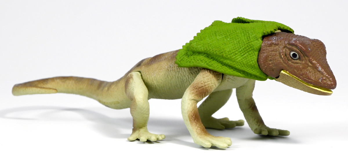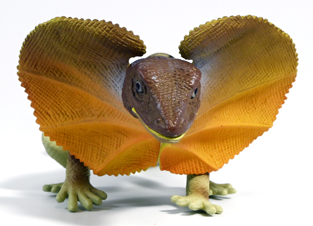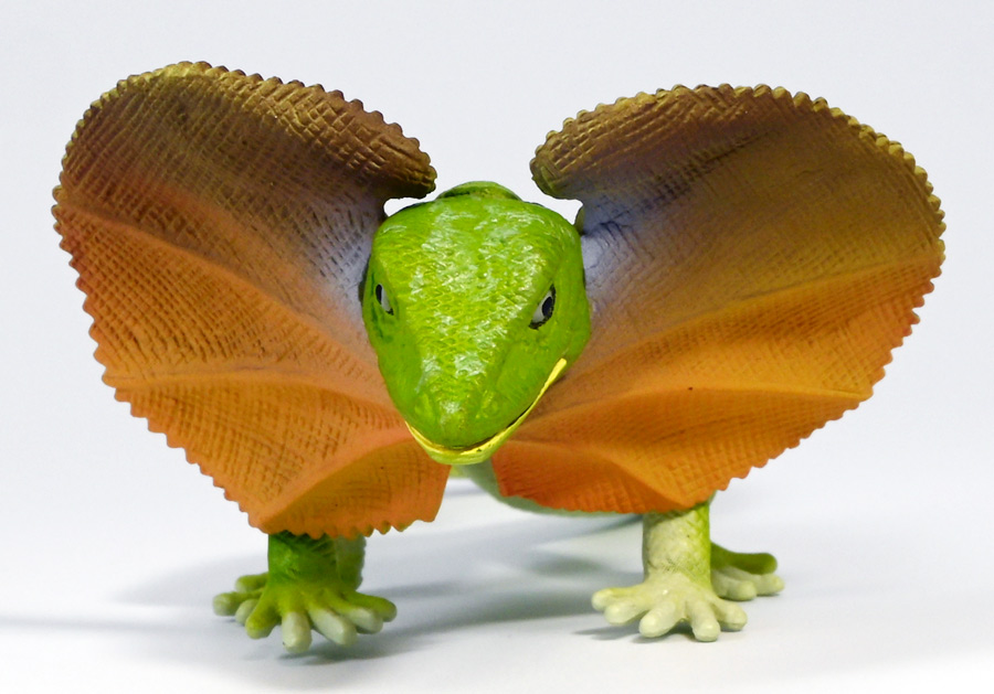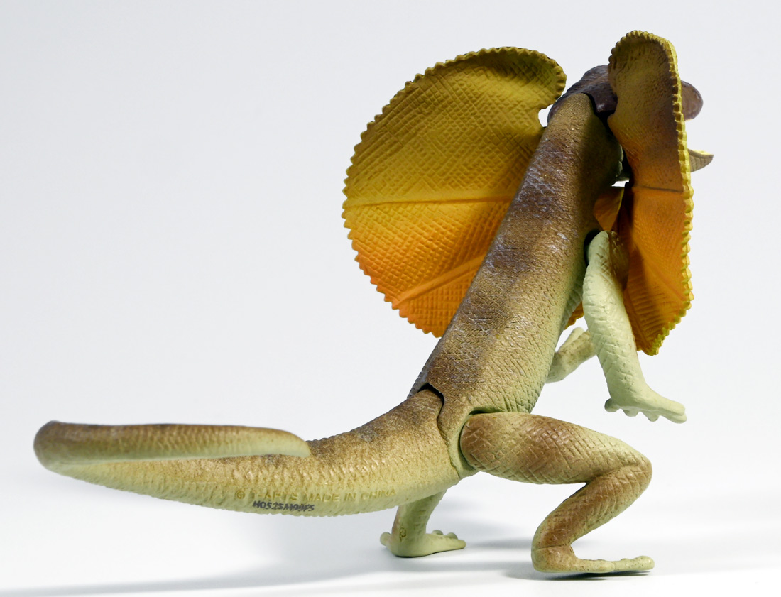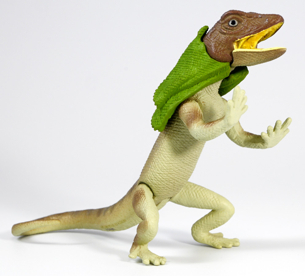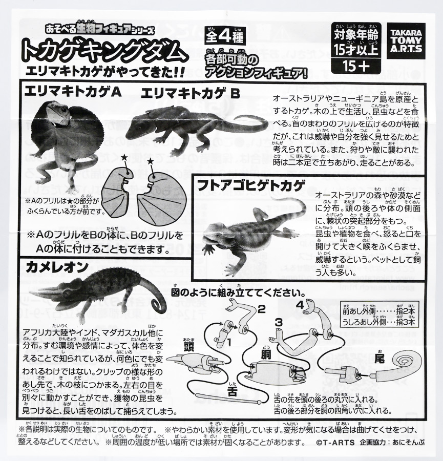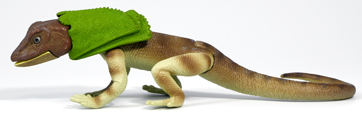 ■タカラトミーアーツ あそべる生物フィギュアシリーズ トカゲキングダム エリマキトカゲがやってきた!! エリマキトカゲ ![]() タカラトミーアーツより2025年9月22日週発売の一回300円ガチャ! 通な動物を可動ラインナップする「あそべる生物フィギュアシリーズ」より、 大人気「トカゲキングダム」の第四弾が登場! ラインナップは新規造形の「エリマキトカゲA」、「エリマキトカゲB」に加えて、 「フトアゴヒゲトカゲ」と「カメレオン」が過去弾より再集録。 フトアゴヒゲトカゲは恐らく2023年7月の第一弾「トカゲキングダム」に入っていた「A」カラーとほぼ変わらない再録カラー。 カメレオンも同弾「A」に似ているがちょこっとグラデ彩色が簡略化されているように見えるぞよ。 何れにしても今回はどれもきちんと彩色・模様プリントされており全種豪華な仕上がりだ! ![]() カプセルの中身は袋入りでごちゃっと入っています。 この雑に入ってるパッケージ、なんかわくわくしてわたくしは結構好きぞよ。 丁寧梱包のフィギュアもありがたいが、 「あそべる生物」は300円なので許せちゃうのだ! ![]() 早速組み立て、こちらは「エリマキトカゲA」ぞよ! フル彩色の豪華な仕上がり、今回初登場の新規造形フィギュアとなる! ![]() エリマキトカゲはアガマ科(キノボリトカゲ科)エリマキトカゲ属に分類されるトカゲであるぞよ! オーストラリア北部とニューギニア島南部にのみ見られ、一属一種しか知られていない珍しいヤツだ! 全長は60〜90センチにもなり、なんと言っても最大の特徴は首元に備わった特徴的なフリルであるぞよ! これが襟巻に見える事から「エリマキトカゲ」と和名がついたワケで、そのまんまぞよね! ちなみに学名の「Chlamydosaurus」とは「マントトカゲ」の意であるぞよ。 ![]() この襟巻の正体はなんなのかと言えば、舌骨が上皮に入り込んで出来た皮膚の傘であるぞよ。 下顎と軟骨の動きが舌骨に伝わる事で、つまりは口を開くと同時にフリルが展開する仕組みで、 円盤状に展開された状態では胴幅の四倍以上、約30センチにも広がると言う。 襟巻の構造としては舌骨から伸びた3本の骨組みで支えられており、 上から第1対角、第3対角が軟骨、第2対角が硬骨となっている。 本商品のフリルを見てみると・・・ちゃんとフリルの骨組みが3本あるぞよね!? という事でツボを押さえた造形と言えるだろう! ![]() エリマキトカゲは地域性で主に2つの亜種に分けられ、オーストラリア亜種は乾燥した森林に住まい、 体が大きく90センチ級。 ニューギニア亜種は小柄の70センチクラスで、熱帯雨林に近い温暖な気候を好むと言う。 昼行性の樹上性で、一日の大半を木の上で暮らしているが、 雨期になると地面に近い場所に下りてきてより活発に活動を始めるぞよ。 主に昆虫などを食し、特にシロアリは乾季でも見つかる重要な栄養源である。 環境や湿度、感情によって体色を変化させる事があり、 興奮状態では襟巻がオレンジや赤に変わって、猛禽類や他のトカゲやヘビに対して威嚇すると言うぞよ。 そう、この襟巻は自分を大きく見せて相手を驚かせるために発達したものなのだ! ![]() 性的二型が発達しており、オスの方が大きく、頭や顎も立派で、襟巻も大型化する傾向にある。 襟巻は周囲の音を察知する時にも有効であるとされ、大きく広げた状態では眼前の音を収音して聞く事が出来ると言う。 一方で多方向からの音を聞く妨げになる点も指摘されており、 眼前の危険に集中する為の機能とも考えられるぞよ。 ![]() トップ。 今回彩色が非常に美しいぞよね! 襟巻も体もグラデ彩色されているし、背中側はほんのりと縞模様も入っていて見栄えがするぞよ! ![]() 鱗の造形も細かく雰囲気出ていますよ! 300円で全長13センチ級のフル彩色フィギュアがゲットできるとは嬉しい事ですぞよ〜っ! ![]() 「あそべる生物」は一部簡易可動の正に「あそべる」フィギュア! エリマキトカゲはこんな風に後ろ足の角度を変える事で二足歩行形態にも変形可能となっている! 後ろ脚は左右と尾が軸で接続されており、尾を持ち上げると足も同時に変形する仕様。 前脚もスイング可動し表情付けが出来るぞよ! ![]() 勿論口も開閉します。 前述の通り襟巻は口の動きと連動しているので、口を開いた方がより自然な姿であるぞよ。 ポイントを押さえてエリマキトカゲのユニークな威嚇ポーズを再現しよう!! 襟巻の展開は他にも求愛行動や日光浴で熱を効率的に受ける際に重宝され、 色々便利な機能を備えているようだ! ![]() 続いてこちらは「B」カラー。 おや・・・? 何やらパーツがAと異なる様子だが・・・!? ![]() な、な、なんと・・・! こっちのエリマキトカゲはフリルを閉じた状態で造形が違うではないかーっ!! ![]() 「あそべる生物」では同弾に同じ動物が複数ラインナップされる事があり、 多くの場合はAカラーの方が重塗装のアタリ枠だったりするが・・・ 今回はどちらも重塗装の上、襟巻の造形が異なる別物となっているのだ! これ