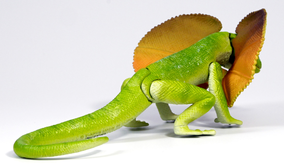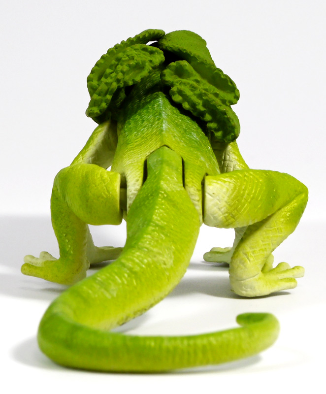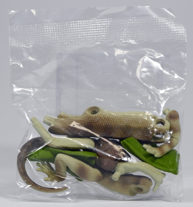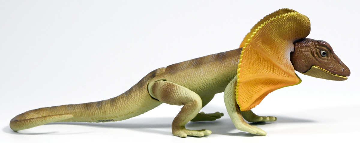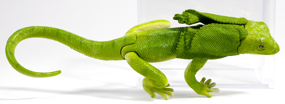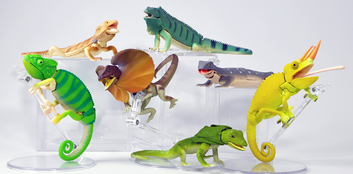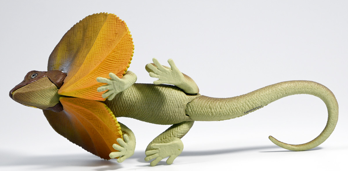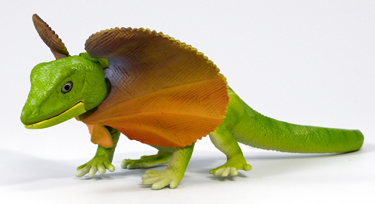 ■タカラトミーアーツ あそべる生物フィギュアシリーズ トカゲキングダム エリマキトカゲがやってきた!! エリマキトカゲ ![]() タカラトミーアーツより2025年9月22日週発売の一回300円ガチャ! 通な動物を可動ラインナップする「あそべる生物フィギュアシリーズ」より、 大人気「トカゲキングダム」の第四弾が登場! ラインナップは新規造形の「エリマキトカゲA」、「エリマキトカゲB」に加えて、 「フトアゴヒゲトカゲ」と「カメレオン」が過去弾より再集録。 フトアゴヒゲトカゲは恐らく2023年7月の第一弾「トカゲキングダム」に入っていた「A」カラーとほぼ変わらない再録カラー。 カメレオンも同弾「A」に似ているがちょこっとグラデ彩色が簡略化されているように見えるぞよ。 何れにしても今回はどれもきちんと彩色・模様プリントされており全種豪華な仕上がりだ! ![]() カプセルの中身は袋入りでごちゃっと入っています。 この雑に入ってるパッケージ、なんかわくわくしてわたくしは結構好きぞよ。 丁寧梱包のフィギュアもありがたいが、 「あそべる生物」は300円なので許せちゃうのだ! ![]() 早速組み立て、こちらは「エリマキトカゲA」ぞよ! フル彩色の豪華な仕上がり、今回初登場の新規造形フィギュアとなる! ![]() エリマキトカゲはアガマ科(キノボリトカゲ科)エリマキトカゲ属に分類されるトカゲであるぞよ! オーストラリア北部とニューギニア島南部にのみ見られ、一属一種しか知られていない珍しいヤツだ! 全長は60〜90センチにもなり、なんと言っても最大の特徴は首元に備わった特徴的なフリルであるぞよ! これが襟巻に見える事から「エリマキトカゲ」と和名がついたワケで、そのまんまぞよね! ちなみに学名の「Chlamydosaurus」とは「マントトカゲ」の意であるぞよ。 ![]() この襟巻の正体はなんなのかと言えば、舌骨が上皮に入り込んで出来た皮膚の傘であるぞよ。 下顎と軟骨の動きが舌骨に伝わる事で、つまりは口を開くと同時にフリルが展開する仕組みで、 円盤状に展開された状態では胴幅の四倍以上、約30センチにも広がると言う。 襟巻の構造としては舌骨から伸びた3本の骨組みで支えられており、 上から第1対角、第3対角が軟骨、第2対角が硬骨となっている。 本商品のフリルを見てみると・・・ちゃんとフリルの骨組みが3本あるぞよね!? という事でツボを押さえた造形と言えるだろう! ![]() エリマキトカゲは地域性で主に2つの亜種に分けられ、オーストラリア亜種は乾燥した森林に住まい、 体が大きく90センチ級。 ニューギニア亜種は小柄の70センチクラスで、熱帯雨林に近い温暖な気候を好むと言う。 昼行性の樹上性で、一日の大半を木の上で暮らしているが、 雨期になると地面に近い場所に下りてきてより活発に活動を始めるぞよ。 主に昆虫などを食し、特にシロアリは乾季でも見つかる重要な栄養源である。 環境や湿度、感情によって体色を変化させる事があり、 興奮状態では襟巻がオレンジや赤に変わって、猛禽類や他のトカゲやヘビに対して威嚇すると言うぞよ。 そう、この襟巻は自分を大きく見せて相手を驚かせるために発達したものなのだ! ![]() 性的二型が発達しており、オスの方が大きく、頭や顎も立派で、襟巻も大型化する傾向にある。 襟巻は周囲の音を察知する時にも有効であるとされ、大きく広げた状態では眼前の音を収音して聞く事が出来ると言う。 一方で多方向からの音を聞く妨げになる点も指摘されており、 眼前の危険に集中する為の機能とも考えられるぞよ。 ![]() トップ。 今回彩色が非常に美しいぞよね! 襟巻も体もグラデ彩色されているし、背中側はほんのりと縞模様も入っていて見栄えがするぞよ! ![]() 鱗の造形も細かく雰囲気出ていますよ! 300円で全長13センチ級のフル彩色フィギュアがゲットできるとは嬉しい事ですぞよ〜っ! ![]() 「あそべる生物」は一部簡易可動の正に「あそべる」フィギュア! エリマキトカゲはこんな風に後ろ足の角度を変える事で二足歩行形態にも変形可能となっている! 後ろ脚は左右と尾が軸で接続されており、尾を持ち上げると足も同時に変形する仕様。 前脚もスイング可動し表情付けが出来るぞよ! ![]() 勿論口も開閉します。 前述の通り襟巻は口の動きと連動しているので、口を開いた方がより自然な姿であるぞよ。 ポイントを押さえてエリマキトカゲのユニークな威嚇ポーズを再現しよう!! 襟巻の展開は他にも求愛行動や日光浴で熱を効率的に受ける際に重宝され、 色々便利な機能を備えているようだ! ![]() 続いてこちらは「B」カラー。 おや・・・? 何やらパーツがAと異なる様子だが・・・!? ![]() な、な、なんと・・・! こっちのエリマキトカゲはフリルを閉じた状態で造形が違うではないかーっ!! ![]() 「あそべる生物」では同弾に同じ動物が複数ラインナップされる事があり、 多くの場合はAカラーの方が重塗装のアタリ枠だったりするが・・・ 今回はどちらも重塗装の上、襟巻の造形が異なる別物となっているのだ! これ