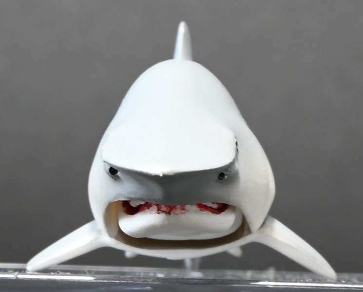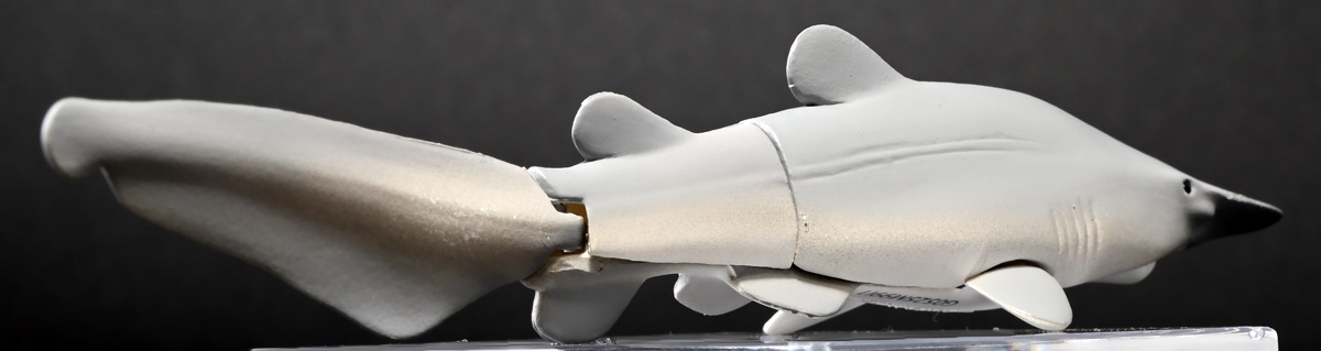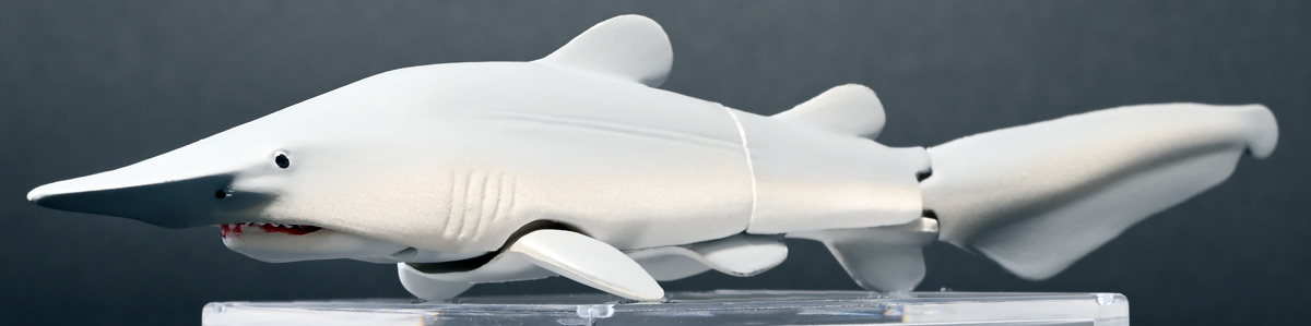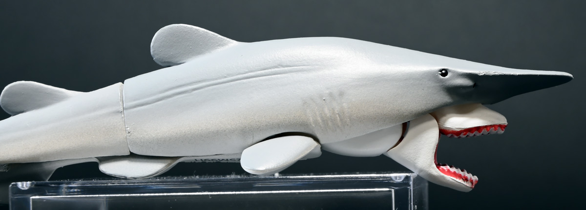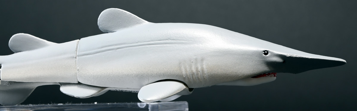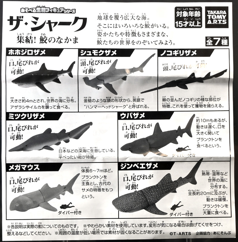 ■タカラトミーアーツ あそべる生物フィギュアシリーズ ザ・シャーク 集結!鮫のなかま ミツクリザメ ![]() タカラトミーアーツより、2025年8月25日週発売の一回300円ガチャ! 超大人気「ザ・シャーク」シリーズが過去最大の特集弾となって今年も登場! 今回は過去ラインナップより 「ホホジロザメ」、「シュモクザメ」、「ノコギリザメ」、「ミツクリザメ」、 「ウバザメ」、「メガマウス」、「ジンベエザメ」らの七種類がラインナップされた総集編となっているぞよ! ![]() こんな感じで組み立て式。 「ザ・シャーク」は2021年8月に「青き海の世界ザ・シャーク」として始まり、 2022年11月の「青き海の世界ザ・シャーク2」、 2023年8月の「青き海の世界 ザ・シャーク シロワニあらわる」、 2024年7月の「ザ・シャーク ジンベエザメ発見!」と弾を重ねてきたぞよ。 本弾は過去弾収録の広義のサメ達を再録した総集編で新規造形はなしとなっているが、 取りこぼしていたサメを回収するのに丁度良い総集編弾となっているぞよ! ![]() という事でこの「ミツクリザメ」をわたくしは過去弾で入手しそびれていたので喜んで回収させて頂いたぞよ! ミツクリザメは2022年弾で初登場して以来の再登場! 元々は茶色系の彩色でしたが、今回はグレーの新カラバリとなっている! ![]() ミツクリザメはネズミザメ目ミツクリザメ科のサメで、 この科はミツクリザメ属の一属一種しか知られていないレアなヤツぞよ! 水深300〜1000メートルの深海に棲息すると思われるが、なにぶん深い海は人類未踏の領域を広く含む為、 観察も容易でなくその生態は謎に包まれているぞよよよよ・・・。 元々は相模湾、駿河湾、伊豆半島近海で春に見られるとされていたが、 後にポルトガルの沖でも採集され、世界のあちこちで散発的に発見があるみたいぞよ。 特に台湾では100尾を超える大漁となった事もあるらしい。 なんでもインド洋の深海1400メートルに敷かれた海底ケーブルにミツクリザメの噛み跡らしきものが見つかった事があるので、 ひょっとしたら季節によって世界を回遊しているのかもしれない。 ![]() ミツクリザメは体が全体に白っぽく、鼻先が天狗の鼻の様に突き出た奇怪な姿をする。 この容姿から英語で「ゴブリンシャーク」と呼ばれ、直訳すると妖怪ザメとなる・・・とものの本には書いてあるが、 もともと日本で見つかったサメなので、こりゃ因果が逆で、 日本で「テングザメ」と呼んだものを英語に翻訳した時に「Goblin shark」と書かれ、 こう呼ばれるようになったものみたいぞよ。 ![]() そも学名「Mitsukurina owstoni」のミツクリってなんぞや?って話であるが、 これは東京大学の動物学教授であった箕作佳吉先生らへの献名であるぞよ! 最初の標本は有名な採集家、アラン・オーストン氏によって1880年代の終わりに発見され、 これが箕作佳吉先生の元に渡った。 この標本をアメリカの魚類学者であるデイビッド・スター・ジョーダン博士が見た所、極めて珍しい種である事が判明。 驚き喜んだ博士は箕作先生とオーストン氏の名前両方を取り、 「Mitsukurina owstoni」と名付けたと言うワケです! ![]() 最大全長は5〜6メートルにもなり、かなり大型であるぞよ! 白っぽい体はほんのり透明で、生きている時は血色でピンクに色付いて見えるが、 これが死後は褐色からグレーに変色してゆくと言う。 「あそべる生物」で初めに登場した茶色系、 そして今回のグレーバージョンは死後の姿に基づくカラーリングと考えられるぞよね。 ![]() 天狗と称される長く伸びた吻は軟らかく、微弱な電流を感知するロレンチーニ器官を多数備える。 これが海底の餌を探す時に役立つぞよ。 しかし、こんなに吻が長いのでは餌を食い難いんじゃないか? ![]() と思ったらがばーっ! っと口が展開して恐ろしい形相になるのです! この機能は沖縄美ら島財団総合研究センターとNHKの共同研究で明らかになっているぞよ。 なんでも2008年と2011年に撮影されたミツクリザメ世界初の捕食映像を解析したところ、 ミツクリザメはごく短時間で顎を前方に射出し、獲物を捕らえると言うのだ。 この突出速度は秒速3メートルで魚類の中では最速である。 さらに突出距離は全長の9パーセントにも及び、サメ類の中で最大級を誇る。 ミツクリザメは遊泳速度が極めて遅い為、顎を最速で撃ちだす事で深海で確実に獲物を捕らえる事が出来るよう進化したのだ。 ![]() 「あそべる生物」はその名の通り弄って遊べる生物フィギュア! ミツクリザメは最大の特徴である顎の展開ギミックが再現されており、 捕食モードへ変形できる他、尾も左右に可動し表情付けが可能ぞよ! ![]() 捕食モードに変形できるミツクリザメフィギュアとはかなり珍しく、 世界初なんじゃないぞよかな!? かなり見所のあるサメフィギュアぞよ!! ![]() そんな「あそべる生物」ではシリーズを跨いで様々な広義のサメ類がラインナップされているぞよ。 古代の巨大ザメ「メガロドン」や、そもそもサメと近縁でない硬骨魚類の