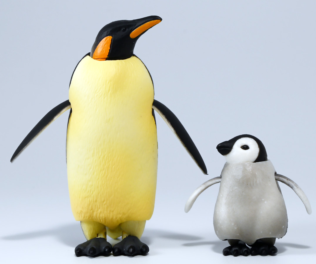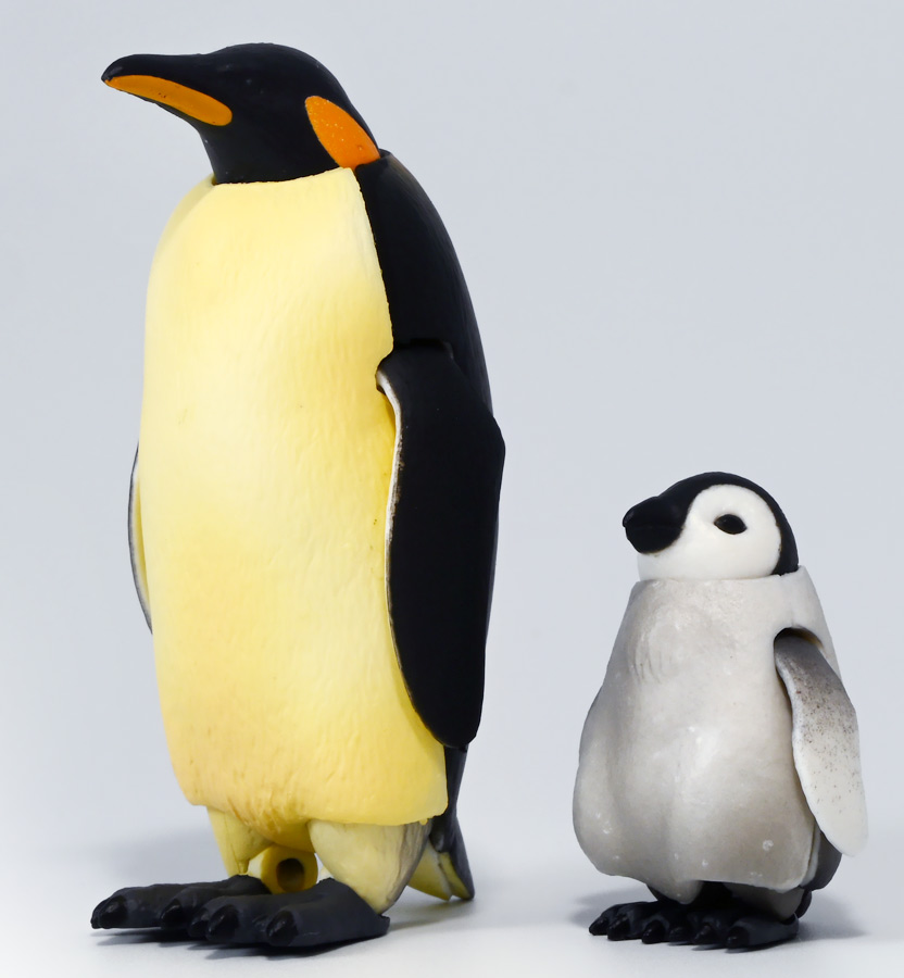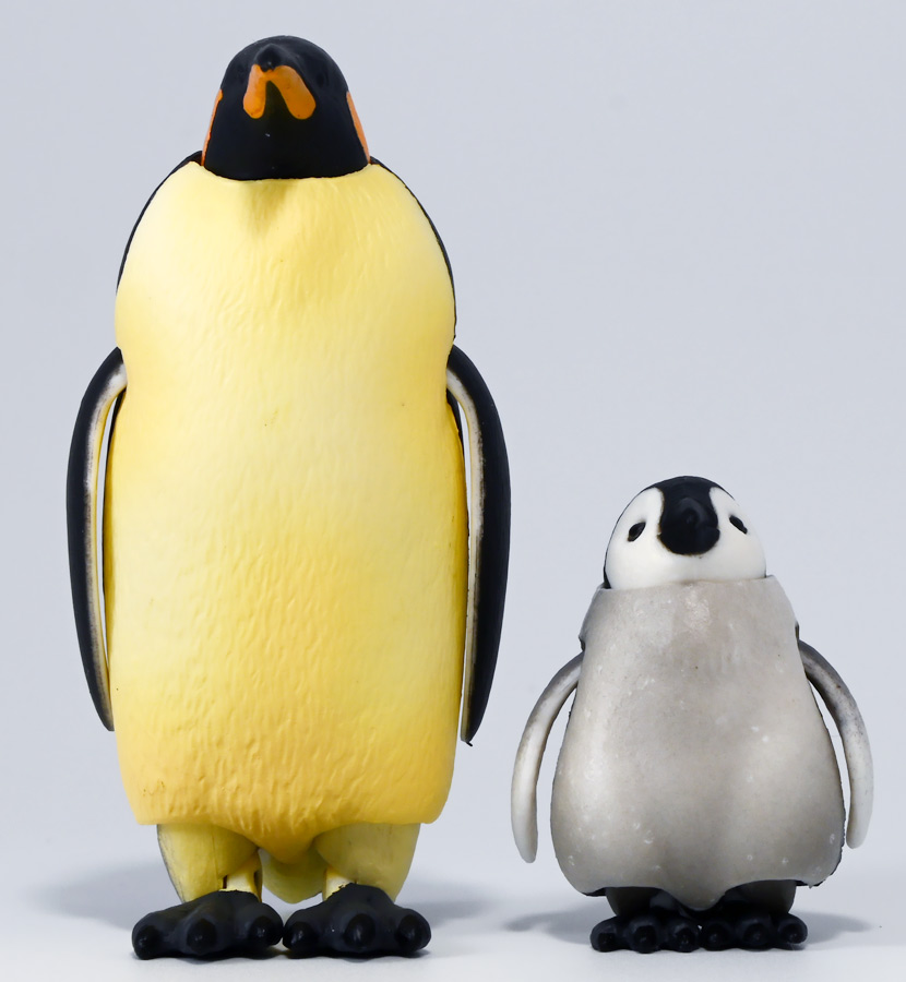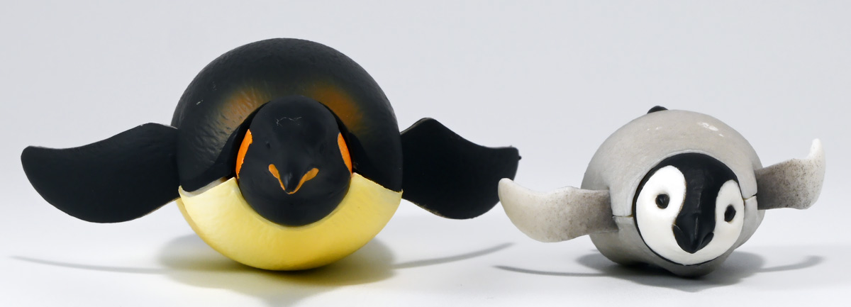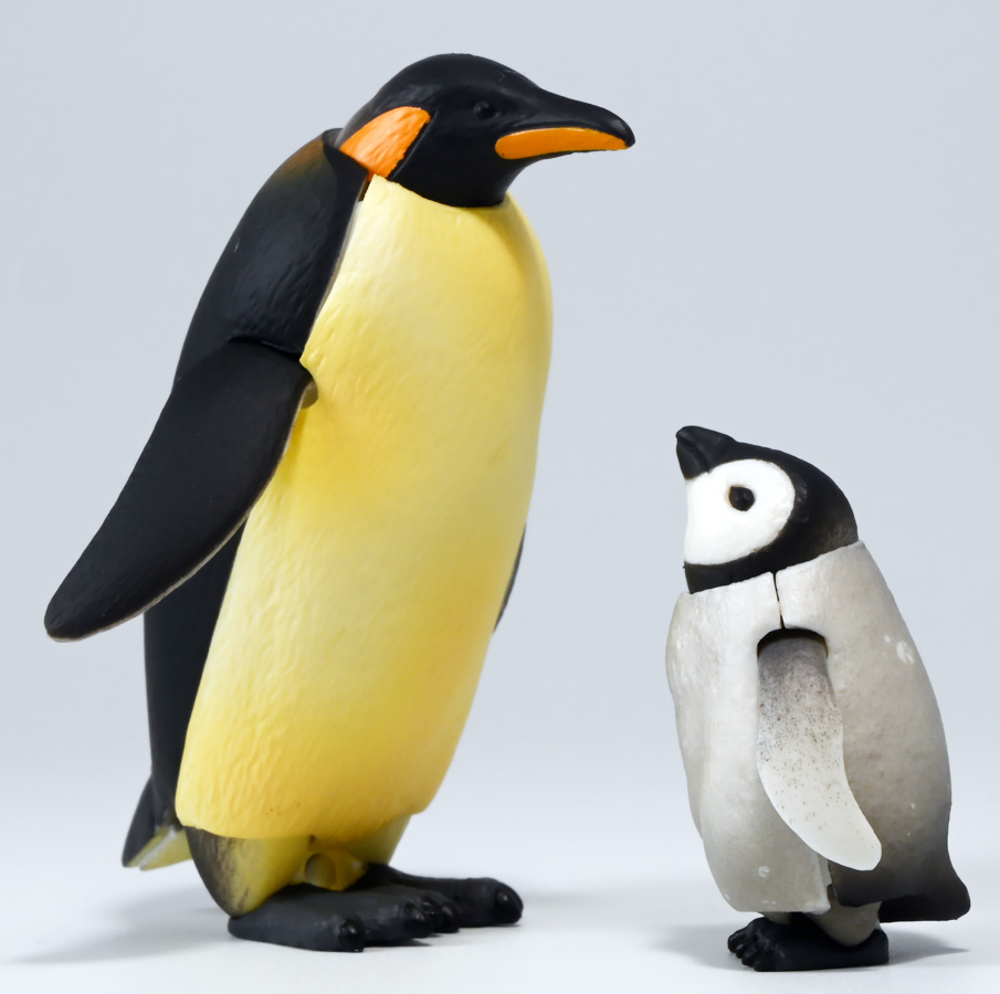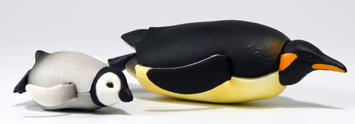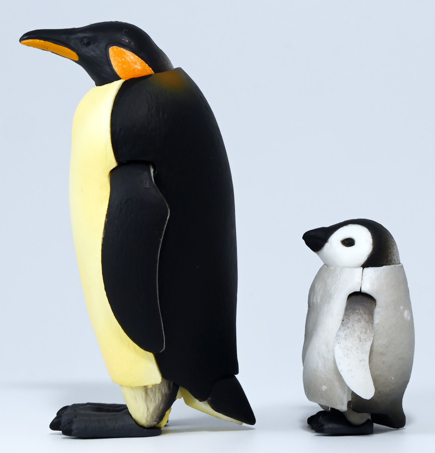 ■タカラトミーアーツ あそべる生物フィギュアシリーズ コウテイペンギン 親ペンギンB/子ペンギンA ![]() タカラトミーアーツより、2025年12月15日週発売の一回300円ガチャ。 300円の低価格にしてでっかい生き物フィギュアが出てくる「あそべる生物シリーズ」 2025年ラスト弾ぞよ!! ![]() 本弾は「コウテイペンギン」特集で、ラインナップは全てコウテイペンギン。 「親ペンギン」、「子ペンギン」共にAとBの二色収録されており、 どちらもそれぞれ雰囲気の異なる重塗装なのでハズレ無しとなっているぞよ! ![]() 中身はバラバラ死体の組み立て式です。 今回ギミックが多く構造がちょっと複雑なので説明書をよく読んで完成させよう! ![]() ちなみに袋は圧着されていないので、 売り場で開けてうっかりパーツを落っことさないように注意ぞよ! ![]() パーツを組みつけてゆくだけで完成! 中身は「親ペンギンB」と「子ペンギンA」でした!! ![]() ラインナップ中、親ペンギンはAがより白く、Bは黄色っぽいカラバリ。 子ペンギンはAが白く、Bが黒っぽいカラバリとなっている。 どちらも原型は共通なので、 余程こだわりが無ければどちらか片方引けば良いので良心的な設定ぞよ。 ![]() 南極周辺に分布する飛べない海鳥、ペンギンの中でも最大種がこのコウテイペンギンであるぞよ。 全長は115〜130センチ、体重は20〜45キロにも達し、 外見の良く似たオウサマペンギンより更に大型化する正にペンギンの皇帝ぞよね! 別名「エンペラーペンギン」と呼ばれる事もある。 飛翔性を失った一方泳ぎは大の得意で、最大で水深564メートルまで潜った記録がある他、 潜水は緊急時に最大で20分以上も続くとされているぞよ。 ペンギンは羽毛に空気を溜め、水中で体を包み込む事で水の抵抗を少なくしている。 これが為に弾丸のような凄まじい速度の水中行動を可能としているぞよ。 この為、ペンギンは水中でキラキラと小さな泡の尾を引きながら泳いで見えるのだ。 ![]() コウテイペンギンはペンギンの中でも南極大陸に主な繁殖地を持つ種であり、 その繁殖は過酷を極める。 3月〜4月になると群れは海岸から離れた氷の内陸部に集結し、 それぞれ番を得ると、5月上旬にメスは卵を一個だけ産む。 するとこの卵をオスに託し、メスはエサを取る為に海へ出かけてゆくぞよ。 抱卵はオスのみが行い、その期間は約65日。 そのうち卵が孵ると、オスは食道からミルク状の分泌液を吐いてヒナに与える。 その間2か月、ひょっとすると3・・・4か月経ってもメスはなかなか帰ってきません・・・。 勿論オスは赤ちゃんに付きっきりなので、なんも食うものが無い。 絶食であるぞよ! そのうちにメスはようやく戻ってくるが、胃に食べ物を貯蔵しており、 これを吐き出してヒナに与えるぞよ。 オスもようやく出かける事が叶い、やはり胃に食べ物を貯蔵して戻ってくる。 以後はお父さんとお母さんが交代でヒナの面倒を見るようになる。 やがてヒナが成長すると、赤ちゃん同士でクレイシと呼ばれる群れを作り、 集団生活を覚え手がかからなくなってくるぞよ。 夏を迎えるころに換羽し、ヒナは成鳥となって南極の過酷な海に独り立ちしてゆくのだ。 ![]() という事で非常に愛情深い、壮絶なまでの絆で結ばれたコウテイペンギン親子が「あそべる生物」に仲間入り。 実は過去にも同シリーズにラインナップされた事があり、 「極地のいきもの(2021年12月)」には300円で親子セットとして封入されていたぞよ。 今回は造形・ギミックを一新したパワーアップバージョンとして特集弾に昇格した形だ。 ![]() サイズは親ペンギンが7.5センチ、子ペンギンが3.7センチで、 300円にして大ボリューム! 当然親ペンギンがアタリ枠だが、子ペンギンも愛らしい造形でハズレ感が無いのが嬉しいぞよね! ![]() 鳥類の趾はその鳥がどんな環境に適応し、進化してきたのかを知る上で重要な形質であるぞよ。 ペンギンの場合は第一指が後ろを向き、二、三、四指が前を向いて、 指の間に水かきを張った「蹼足」である。 フィギュアでは接地やギミックの都合で三本指だが、 本物は足の内側に小さな第一指の名残がついているのだ。 氷上でよちよち歩き、水中で安定した推進力を得る為の進化と考えられるぞよ。 ![]() 300円にして本格可動がウリの「あそべる生物フィギュア」! コウテイペンギンは翼を左右に展開可能! ペンギンの翼は短く狭いほっそりとしたシルエットをする。 これは水中を飛ぶ為に、水の抵抗に負けない為の作りで、フリッパーと呼ばれるぞよ。 ![]() そして、本弾の目玉ギミックは変形にある・・・! なんと親子共に体を倒した遊泳ポーズにチェンジできるのだ!! ![]() 親ペンギンは首、尾、足を倒す事で寝そべりポーズにチェンジ! なんと首は左右を向けるばかりか、上下の可動域も広くすっかり前を向けるとは面白い構造だ! ![]() 赤ちゃんもほぼ同様のギミックで寝そべりポーズに変形できるぞよ! こちらは尾がボディと一体でやや簡略化されている。 ![]() ペンギ