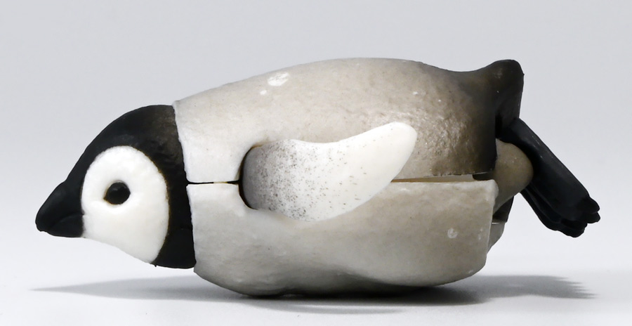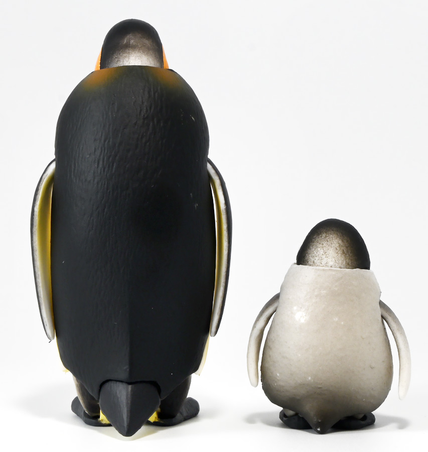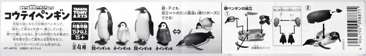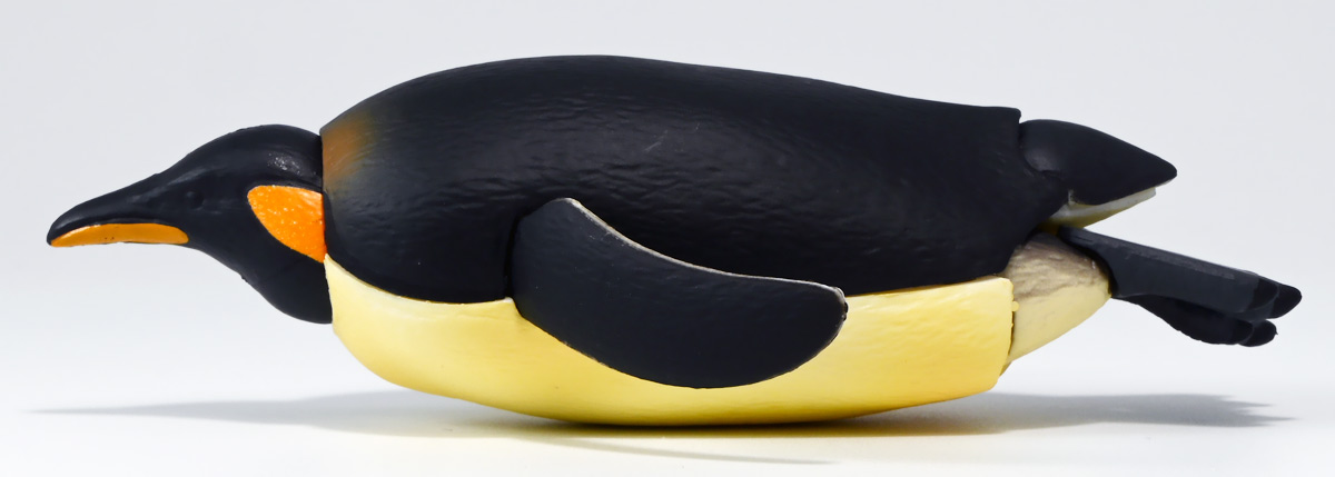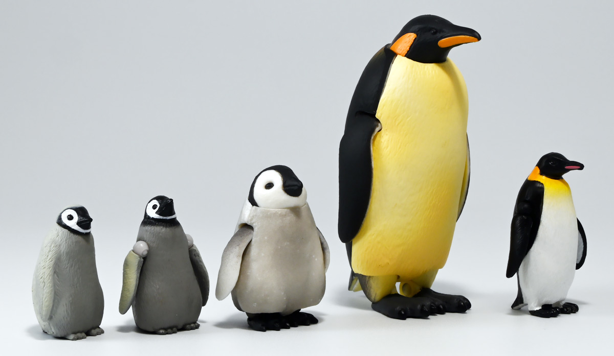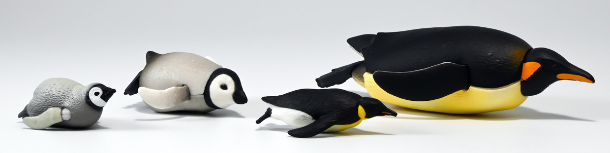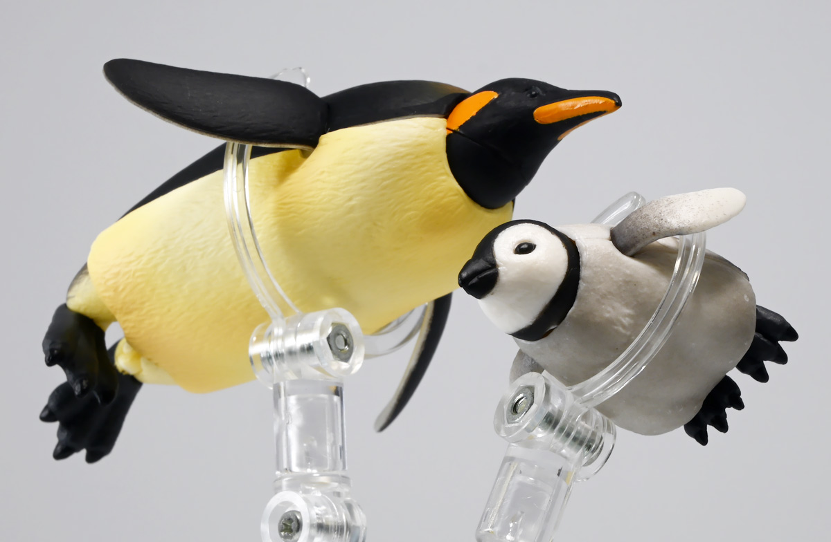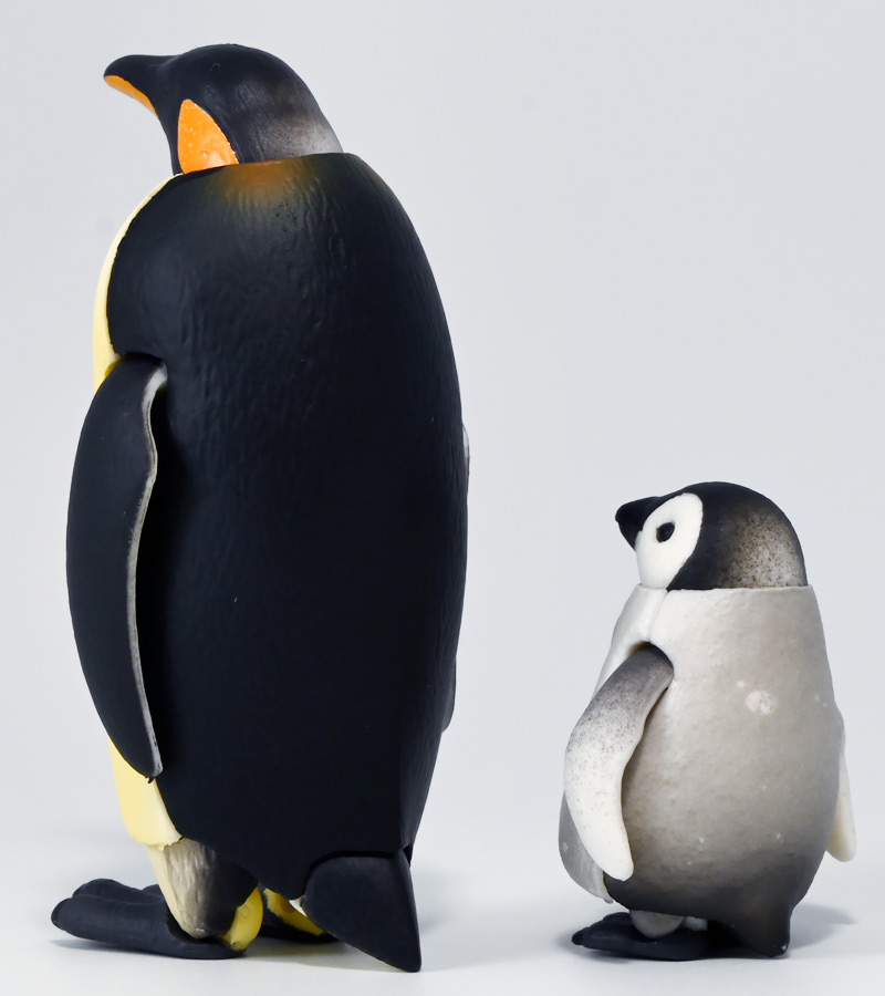 ■タカラトミーアーツ あそべる生物フィギュアシリーズ コウテイペンギン 親ペンギンB/子ペンギンA ![]() タカラトミーアーツより、2025年12月15日週発売の一回300円ガチャ。 300円の低価格にしてでっかい生き物フィギュアが出てくる「あそべる生物シリーズ」 2025年ラスト弾ぞよ!! ![]() 本弾は「コウテイペンギン」特集で、ラインナップは全てコウテイペンギン。 「親ペンギン」、「子ペンギン」共にAとBの二色収録されており、 どちらもそれぞれ雰囲気の異なる重塗装なのでハズレ無しとなっているぞよ! ![]() 中身はバラバラ死体の組み立て式です。 今回ギミックが多く構造がちょっと複雑なので説明書をよく読んで完成させよう! ![]() ちなみに袋は圧着されていないので、 売り場で開けてうっかりパーツを落っことさないように注意ぞよ! ![]() パーツを組みつけてゆくだけで完成! 中身は「親ペンギンB」と「子ペンギンA」でした!! ![]() ラインナップ中、親ペンギンはAがより白く、Bは黄色っぽいカラバリ。 子ペンギンはAが白く、Bが黒っぽいカラバリとなっている。 どちらも原型は共通なので、 余程こだわりが無ければどちらか片方引けば良いので良心的な設定ぞよ。 ![]() 南極周辺に分布する飛べない海鳥、ペンギンの中でも最大種がこのコウテイペンギンであるぞよ。 全長は115〜130センチ、体重は20〜45キロにも達し、 外見の良く似たオウサマペンギンより更に大型化する正にペンギンの皇帝ぞよね! 別名「エンペラーペンギン」と呼ばれる事もある。 飛翔性を失った一方泳ぎは大の得意で、最大で水深564メートルまで潜った記録がある他、 潜水は緊急時に最大で20分以上も続くとされているぞよ。 ペンギンは羽毛に空気を溜め、水中で体を包み込む事で水の抵抗を少なくしている。 これが為に弾丸のような凄まじい速度の水中行動を可能としているぞよ。 この為、ペンギンは水中でキラキラと小さな泡の尾を引きながら泳いで見えるのだ。 ![]() コウテイペンギンはペンギンの中でも南極大陸に主な繁殖地を持つ種であり、 その繁殖は過酷を極める。 3月〜4月になると群れは海岸から離れた氷の内陸部に集結し、 それぞれ番を得ると、5月上旬にメスは卵を一個だけ産む。 するとこの卵をオスに託し、メスはエサを取る為に海へ出かけてゆくぞよ。 抱卵はオスのみが行い、その期間は約65日。 そのうち卵が孵ると、オスは食道からミルク状の分泌液を吐いてヒナに与える。 その間2か月、ひょっとすると3・・・4か月経ってもメスはなかなか帰ってきません・・・。 勿論オスは赤ちゃんに付きっきりなので、なんも食うものが無い。 絶食であるぞよ! そのうちにメスはようやく戻ってくるが、胃に食べ物を貯蔵しており、 これを吐き出してヒナに与えるぞよ。 オスもようやく出かける事が叶い、やはり胃に食べ物を貯蔵して戻ってくる。 以後はお父さんとお母さんが交代でヒナの面倒を見るようになる。 やがてヒナが成長すると、赤ちゃん同士でクレイシと呼ばれる群れを作り、 集団生活を覚え手がかからなくなってくるぞよ。 夏を迎えるころに換羽し、ヒナは成鳥となって南極の過酷な海に独り立ちしてゆくのだ。 ![]() という事で非常に愛情深い、壮絶なまでの絆で結ばれたコウテイペンギン親子が「あそべる生物」に仲間入り。 実は過去にも同シリーズにラインナップされた事があり、 「極地のいきもの(2021年12月)」には300円で親子セットとして封入されていたぞよ。 今回は造形・ギミックを一新したパワーアップバージョンとして特集弾に昇格した形だ。 ![]() サイズは親ペンギンが7.5センチ、子ペンギンが3.7センチで、 300円にして大ボリューム! 当然親ペンギンがアタリ枠だが、子ペンギンも愛らしい造形でハズレ感が無いのが嬉しいぞよね! ![]() 鳥類の趾はその鳥がどんな環境に適応し、進化してきたのかを知る上で重要な形質であるぞよ。 ペンギンの場合は第一指が後ろを向き、二、三、四指が前を向いて、 指の間に水かきを張った「蹼足」である。 フィギュアでは接地やギミックの都合で三本指だが、 本物は足の内側に小さな第一指の名残がついているのだ。 氷上でよちよち歩き、水中で安定した推進力を得る為の進化と考えられるぞよ。 ![]() 300円にして本格可動がウリの「あそべる生物フィギュア」! コウテイペンギンは翼を左右に展開可能! ペンギンの翼は短く狭いほっそりとしたシルエットをする。 これは水中を飛ぶ為に、水の抵抗に負けない為の作りで、フリッパーと呼ばれるぞよ。 ![]() そして、本弾の目玉ギミックは変形にある・・・! なんと親子共に体を倒した遊泳ポーズにチェンジできるのだ!! ![]() 親ペンギンは首、尾、足を倒す事で寝そべりポーズにチェンジ! なんと首は左右を向けるばかりか、上下の可動域も広くすっかり前を向けるとは面白い構造だ! ![]() 赤ちゃんもほぼ同様のギミックで寝そべりポーズに変形できるぞよ! こちらは尾がボディと一体でやや簡略化されている。 ![]() ペンギ