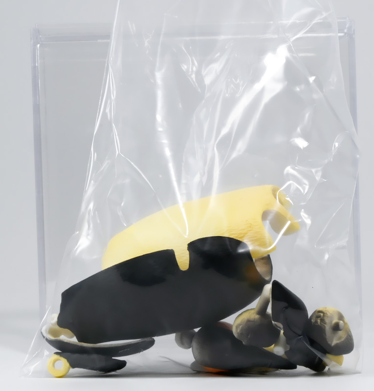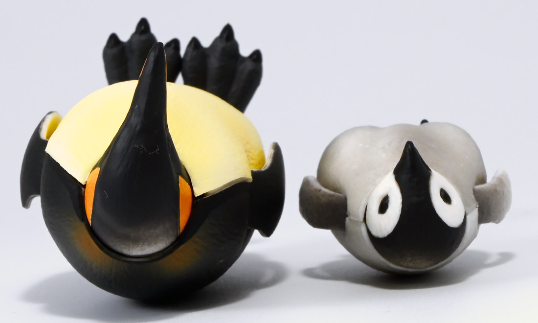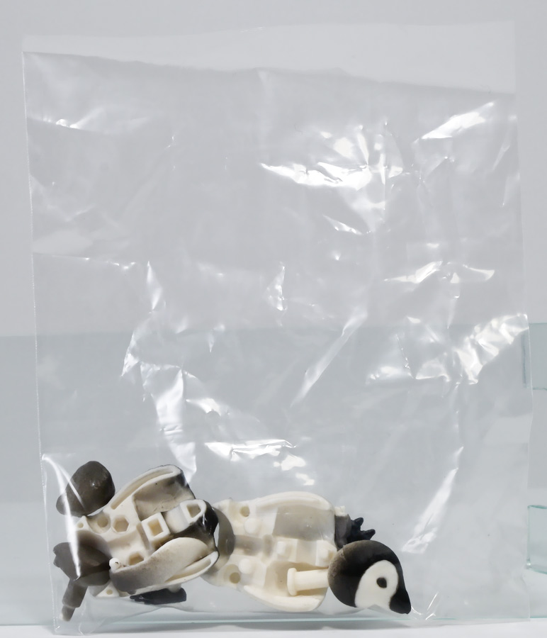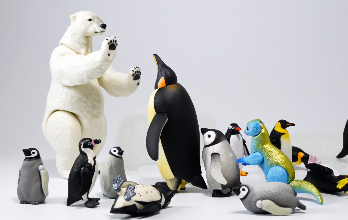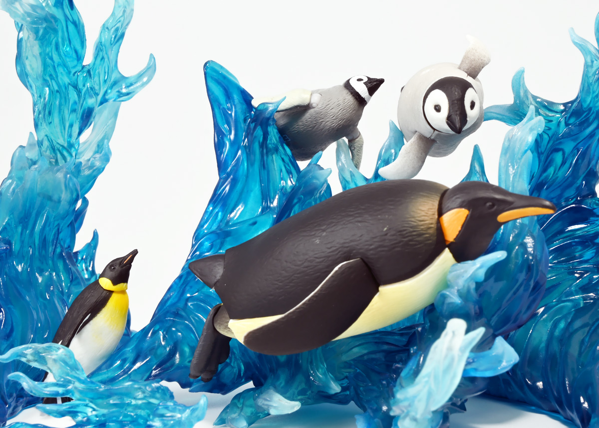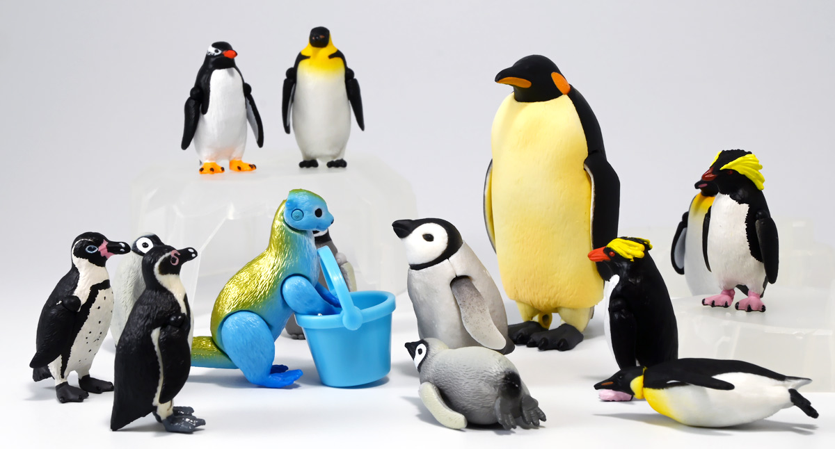 ■タカラトミーアーツ あそべる生物フィギュアシリーズ コウテイペンギン 親ペンギンB/子ペンギンA ![]() タカラトミーアーツより、2025年12月15日週発売の一回300円ガチャ。 300円の低価格にしてでっかい生き物フィギュアが出てくる「あそべる生物シリーズ」 2025年ラスト弾ぞよ!! ![]() 本弾は「コウテイペンギン」特集で、ラインナップは全てコウテイペンギン。 「親ペンギン」、「子ペンギン」共にAとBの二色収録されており、 どちらもそれぞれ雰囲気の異なる重塗装なのでハズレ無しとなっているぞよ! ![]() 中身はバラバラ死体の組み立て式です。 今回ギミックが多く構造がちょっと複雑なので説明書をよく読んで完成させよう! ![]() ちなみに袋は圧着されていないので、 売り場で開けてうっかりパーツを落っことさないように注意ぞよ! ![]() パーツを組みつけてゆくだけで完成! 中身は「親ペンギンB」と「子ペンギンA」でした!! ![]() ラインナップ中、親ペンギンはAがより白く、Bは黄色っぽいカラバリ。 子ペンギンはAが白く、Bが黒っぽいカラバリとなっている。 どちらも原型は共通なので、 余程こだわりが無ければどちらか片方引けば良いので良心的な設定ぞよ。 ![]() 南極周辺に分布する飛べない海鳥、ペンギンの中でも最大種がこのコウテイペンギンであるぞよ。 全長は115〜130センチ、体重は20〜45キロにも達し、 外見の良く似たオウサマペンギンより更に大型化する正にペンギンの皇帝ぞよね! 別名「エンペラーペンギン」と呼ばれる事もある。 飛翔性を失った一方泳ぎは大の得意で、最大で水深564メートルまで潜った記録がある他、 潜水は緊急時に最大で20分以上も続くとされているぞよ。 ペンギンは羽毛に空気を溜め、水中で体を包み込む事で水の抵抗を少なくしている。 これが為に弾丸のような凄まじい速度の水中行動を可能としているぞよ。 この為、ペンギンは水中でキラキラと小さな泡の尾を引きながら泳いで見えるのだ。 ![]() コウテイペンギンはペンギンの中でも南極大陸に主な繁殖地を持つ種であり、 その繁殖は過酷を極める。 3月〜4月になると群れは海岸から離れた氷の内陸部に集結し、 それぞれ番を得ると、5月上旬にメスは卵を一個だけ産む。 するとこの卵をオスに託し、メスはエサを取る為に海へ出かけてゆくぞよ。 抱卵はオスのみが行い、その期間は約65日。 そのうち卵が孵ると、オスは食道からミルク状の分泌液を吐いてヒナに与える。 その間2か月、ひょっとすると3・・・4か月経ってもメスはなかなか帰ってきません・・・。 勿論オスは赤ちゃんに付きっきりなので、なんも食うものが無い。 絶食であるぞよ! そのうちにメスはようやく戻ってくるが、胃に食べ物を貯蔵しており、 これを吐き出してヒナに与えるぞよ。 オスもようやく出かける事が叶い、やはり胃に食べ物を貯蔵して戻ってくる。 以後はお父さんとお母さんが交代でヒナの面倒を見るようになる。 やがてヒナが成長すると、赤ちゃん同士でクレイシと呼ばれる群れを作り、 集団生活を覚え手がかからなくなってくるぞよ。 夏を迎えるころに換羽し、ヒナは成鳥となって南極の過酷な海に独り立ちしてゆくのだ。 ![]() という事で非常に愛情深い、壮絶なまでの絆で結ばれたコウテイペンギン親子が「あそべる生物」に仲間入り。 実は過去にも同シリーズにラインナップされた事があり、 「極地のいきもの(2021年12月)」には300円で親子セットとして封入されていたぞよ。 今回は造形・ギミックを一新したパワーアップバージョンとして特集弾に昇格した形だ。 ![]() サイズは親ペンギンが7.5センチ、子ペンギンが3.7センチで、 300円にして大ボリューム! 当然親ペンギンがアタリ枠だが、子ペンギンも愛らしい造形でハズレ感が無いのが嬉しいぞよね! ![]() 鳥類の趾はその鳥がどんな環境に適応し、進化してきたのかを知る上で重要な形質であるぞよ。 ペンギンの場合は第一指が後ろを向き、二、三、四指が前を向いて、 指の間に水かきを張った「蹼足」である。 フィギュアでは接地やギミックの都合で三本指だが、 本物は足の内側に小さな第一指の名残がついているのだ。 氷上でよちよち歩き、水中で安定した推進力を得る為の進化と考えられるぞよ。 ![]() 300円にして本格可動がウリの「あそべる生物フィギュア」! コウテイペンギンは翼を左右に展開可能! ペンギンの翼は短く狭いほっそりとしたシルエットをする。 これは水中を飛ぶ為に、水の抵抗に負けない為の作りで、フリッパーと呼ばれるぞよ。 ![]() そして、本弾の目玉ギミックは変形にある・・・! なんと親子共に体を倒した遊泳ポーズにチェンジできるのだ!! ![]() 親ペンギンは首、尾、足を倒す事で寝そべりポーズにチェンジ! なんと首は左右を向けるばかりか、上下の可動域も広くすっかり前を向けるとは面白い構造だ! ![]() 赤ちゃんもほぼ同様のギミックで寝そべりポーズに変形できるぞよ! こちらは尾がボディと一体でやや簡略化されている。 ![]() ペンギ