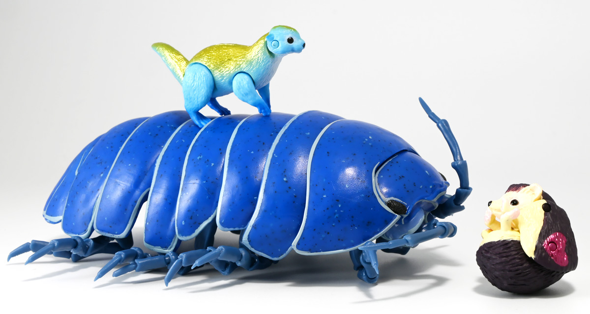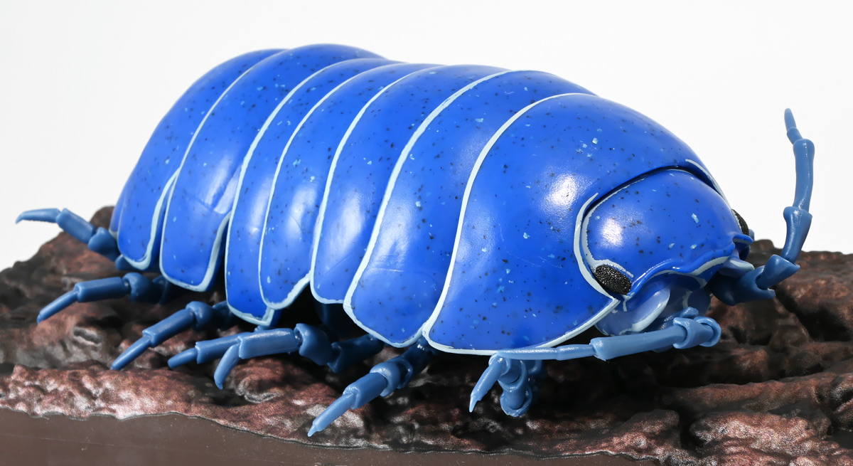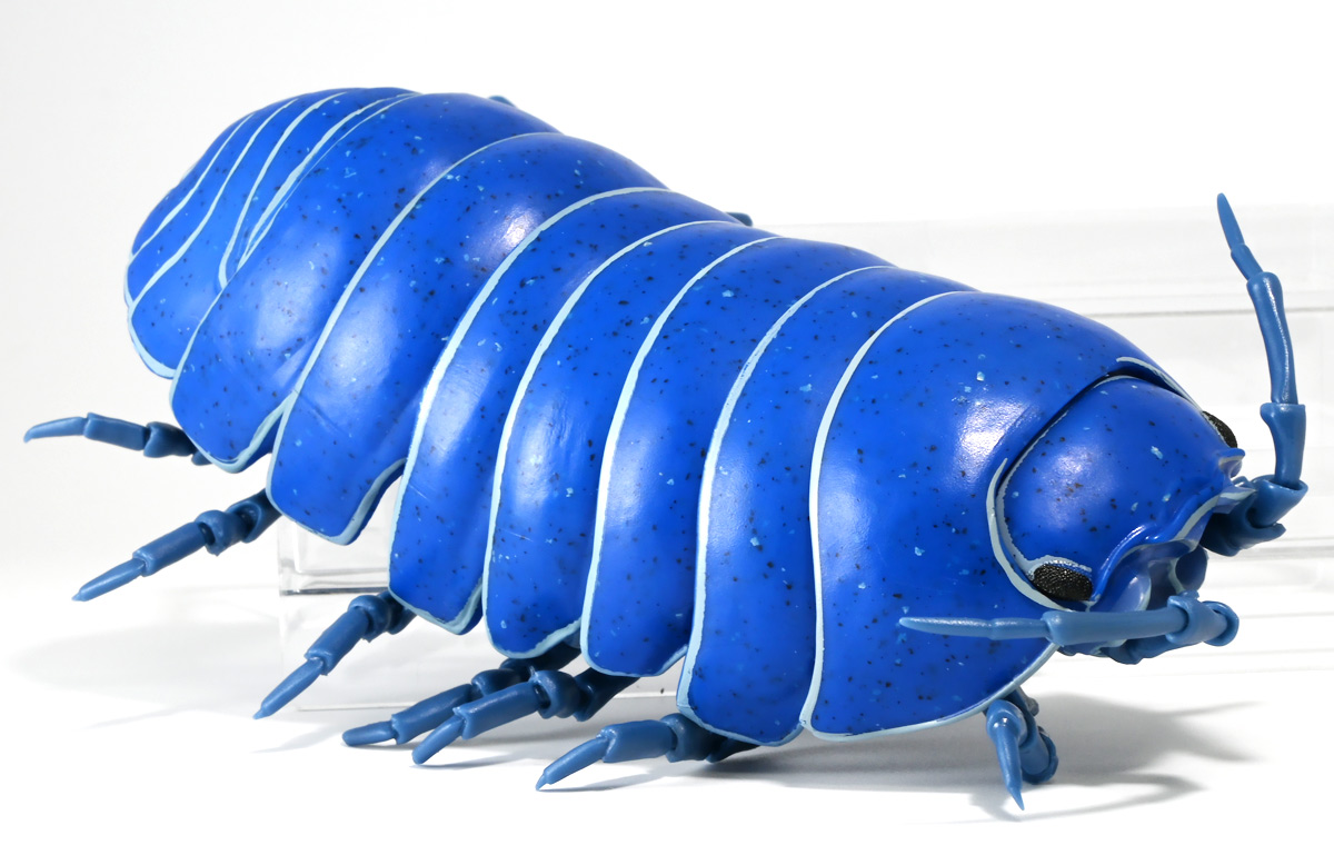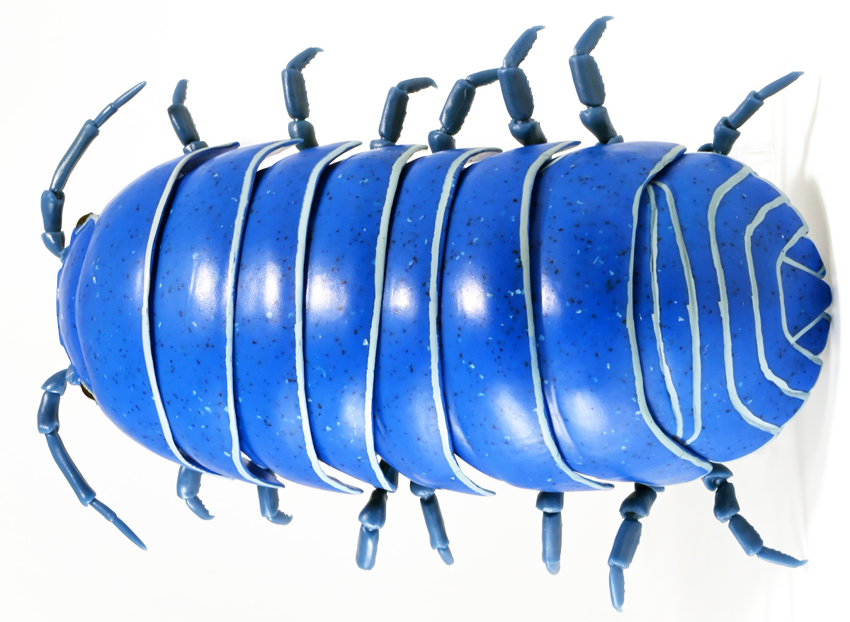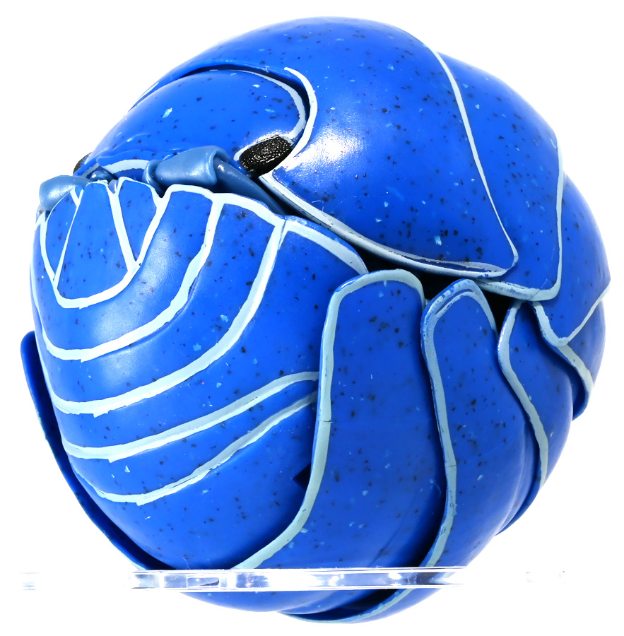 ■バンダイ いきもの大図鑑アドバンス ダンゴムシ イリドダンゴムシ ![]() バンダイより、2025年12月第4週発売の一回1500円ガチャ。 「いきもの大図鑑」の始祖「ダンゴムシ」が遂にアドバンスバージョンとなって降臨ッ! 全てがグレードアップしたフル可動ダンゴムシの決定版ぞよ! ![]() 自販機筐体版ではカプセルレスで丸まったダンゴムシがゴトンと落ちてきます! フィルムを剥がし、こんな風に広げると・・・、 ![]() 中には「だんごむし新聞」が挟まっている! そうそう、初期の「いきもの大図鑑」ってこういう新聞がリーフレット代わりに入っていたぞよね〜。 今回はダンゴムシ超絶パワーアップ復刻弾と言う事で初期の仕様を踏襲しているのだ。 ラインナップは「ダンゴムシ」、「イリドダンゴムシ」、「ゼブラダンゴムシ」の全3種。 このうちダンゴムシが当選率40%、残りが30%でプチレアとなっており、 ゼブラダンゴムシが自販機筐体限定のレアカラーと言う位置づけ。 ガシャポンオンラインでは「いきもの大図鑑アドバンス ダンゴムシ(重塗装版)」というタイトルで、 文字通り重塗装が施された豪華版として1800円で販売。 「ダンゴムシ」、「イリドダンゴムシ」に加えて、「アルビノダンゴムシ」がオンライン限定カラーとして封入されたぞよ。 ![]() という事で自販機筐体版のダンゴムシとイリドダンゴムシカラーは オンラインの重塗装版の完全なる下位互換と言う事になるのだが・・・ おっと・・・見ての通りわたくしが引いたのは真っ青のイリドダンゴムシ! は、ハズレぞよ〜っ! ![]() とは申せ、そこは流石のアドバンス1500円。 自販機筐体版も成型色にドットチップが混ぜ込んであり表面に柄がついてそこそこ見栄えがするぞよ。 オンライン版ではここが彩色仕上げになっているという訳ぞよね。 ![]() せっかくなのでまずは丸まった状態で見ていこう! ダンゴムシはムシ・・・とつくが、昆虫ではない。 ご覧の通り身体構造が全く異なっているぞよ。 その正体は等脚目に分類される陸上に進出した甲殻類で、 本商品のモチーフとなっているのは中でも最もポピュラーなオカダンゴムシ(Armadillidium vulgare)であるぞよ。 ![]() 多様な等脚類には水棲のものが多く、有名なダイオウグソクムシなどがその代表格。 その中にあってオカダンゴムシは世界中で見られる最もポピュラーな陸生等脚類であるぞよ。 元々はヨーロッパ全土を住処としていたが、おろかなにんげんどもの行動範囲が広がると共に、 それに便乗して分布を広げてきた種であるぞよ。 この日本には元々コシビロダンゴムシという、より丸まるのが上手な在来ダンゴムシが暮らしていたが、 これは乾燥に弱く、森林から出られないと言う弱点があった。 明治時代に船の積み荷に紛れ込んでオカダンゴムシが侵入してくると、 おろかなにんげんどもを利用して瞬く間に生息域を拡大。 オカダンゴムシは乾燥に強く、人家周辺で暮らす事が出来たのだ。 という事で、今でも日本の森には在来のダンゴムシが見られるが、 我々のより身近で普通に見られるダンゴムシは殆ど外来種である。 こう言う事が言えるぞよね! ![]() 従って国内ではオカダンゴムシ科、コシビロダンゴムシ科に加えて、 ハマダンゴムシ科と言う海岸に生息するダンゴムシを含む、3科5属が見られるぞよ。 最も、身近な存在である一方でまだまだ分類学上は謎の多い存在であり、 シノニムや未記載種と思われるものが多数報告されている為、正確な種数は不明とされている。 ![]() オカダンゴムシは石灰質の土壌を好み、主に腐敗した植物を食べて暮らしている。 時にはカルシウムを補給する為にコンクリートを舐める事もあるぞよ。 基本的には夜行性だが、極端に低い温度や高い温度が苦手で、気温が低い時は日光浴をしに現れ、 逆に高い時は日陰に隠れ、体温調節をする。 一方でエビやカニの仲間らしく、じめじめした環境を好み、雨が降ると活発に動き出すぞよ。 こうした習性から時にまとまった場所にうじゃっといておろかなにんげんどもに不気味がられるが、 その実全くの人畜無害。 それどころか、腐った落ち葉や動物の死骸などを食って分解してくれる土壌の掃除屋さんであるからして、 ありがたい存在なのだ! ![]() そんなダンゴムシ最大の特技が、この丸まった防御姿勢! 外から刺激を受ける事でピンチを察したダンゴムシは、身体を内側に丸め、 ほぼ完全な球形へと変形する事が出来るのだ! これこそが「ダンゴムシ」の名前の由来であるぞよ! ダンゴムシの場合、外皮表面の油分が多い為、昆虫類より蜘蛛の巣に引っかかりにくいという特性も見られる。 体を丸めた防御姿勢を取る広義のムシには多足類のタマヤスデや、 昆虫類ではヒメマルゴキブリなども知られている。 これらはキチン化した硬い外皮を持ち、上から見るとダンゴムシそっくりで、 まるまるギミックも共通しているが、全く別の分類群にある生き物であるぞよ。 みんなそれぞれ別のルートを辿りなが